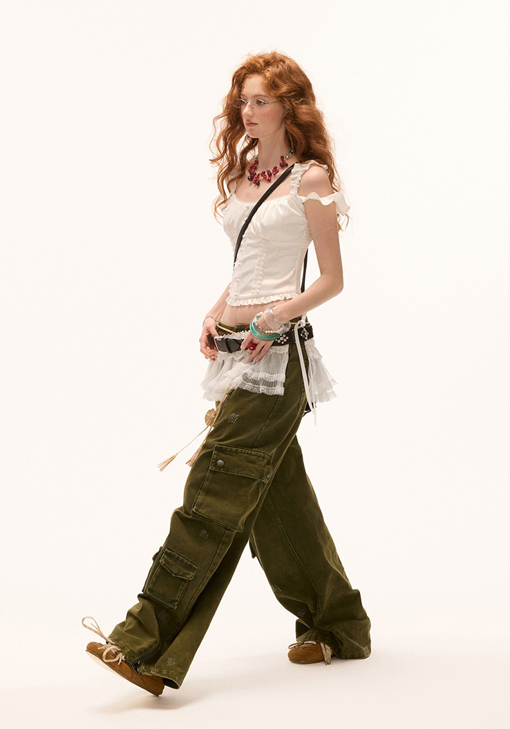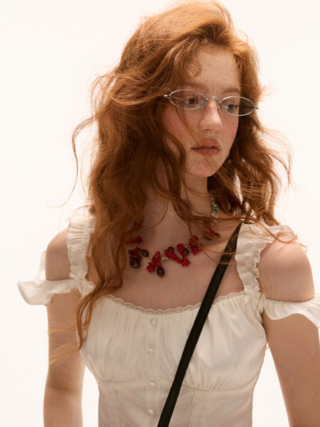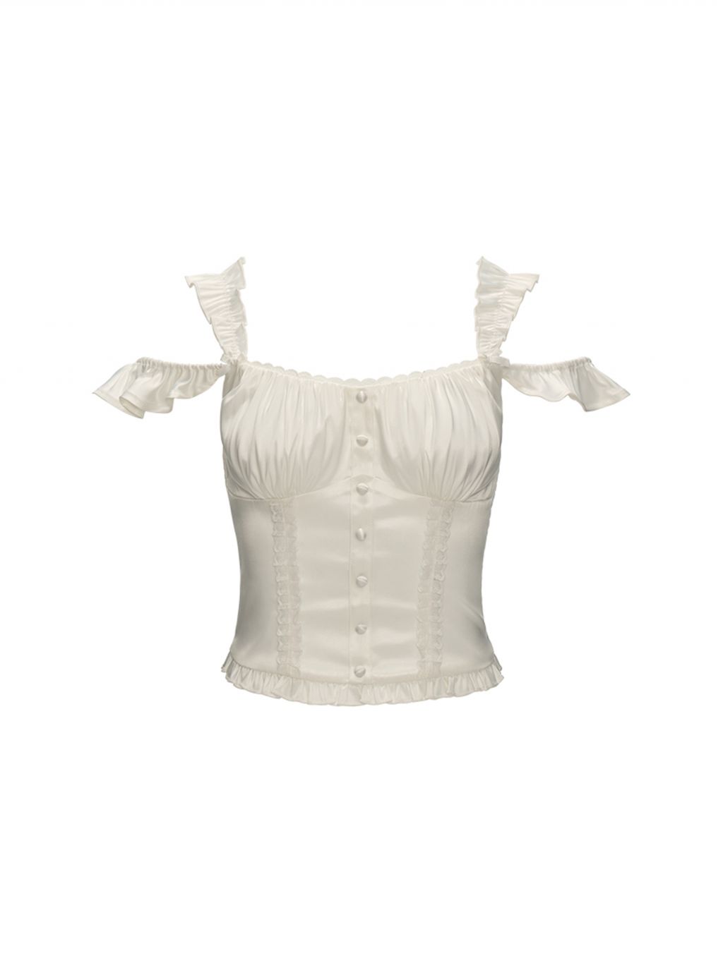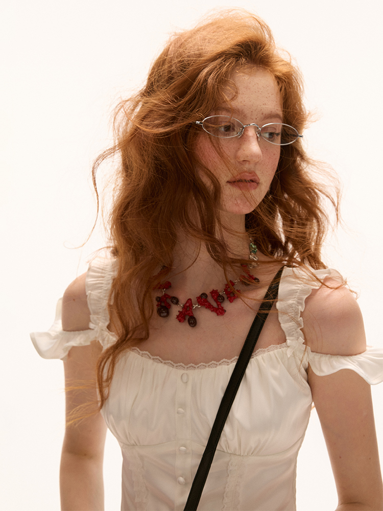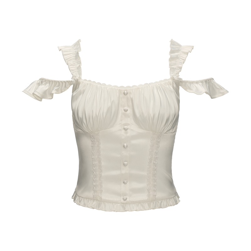 로맨틱 무드의 정수를 담은 오프숄더 프릴 탑으로 은은한 광택감의 새틴 원단과 입체적인 셔링 디테일이 몸에 부드럽게 감기며 어깨를 자연스럽게 드러내는 슬릿 스트랩이 사랑스러운 실루엣을 완성합니다.