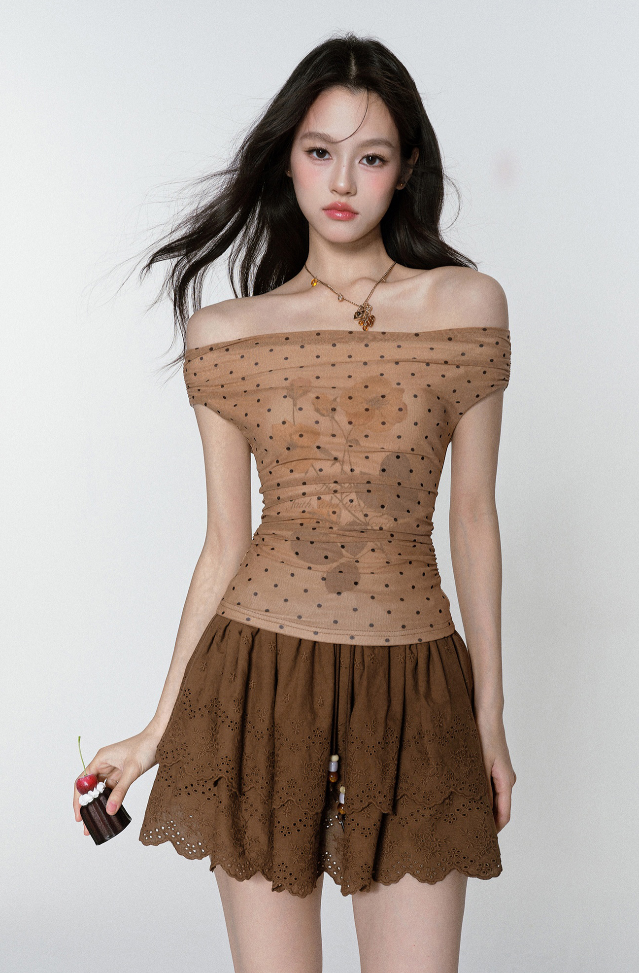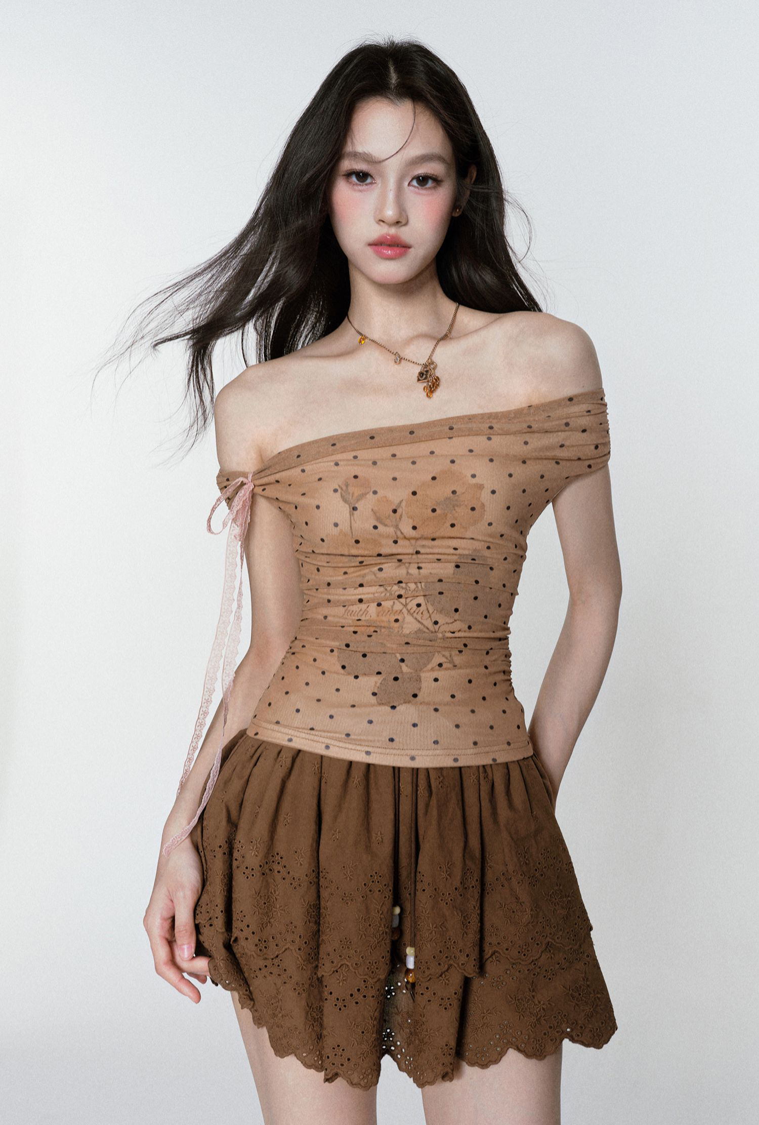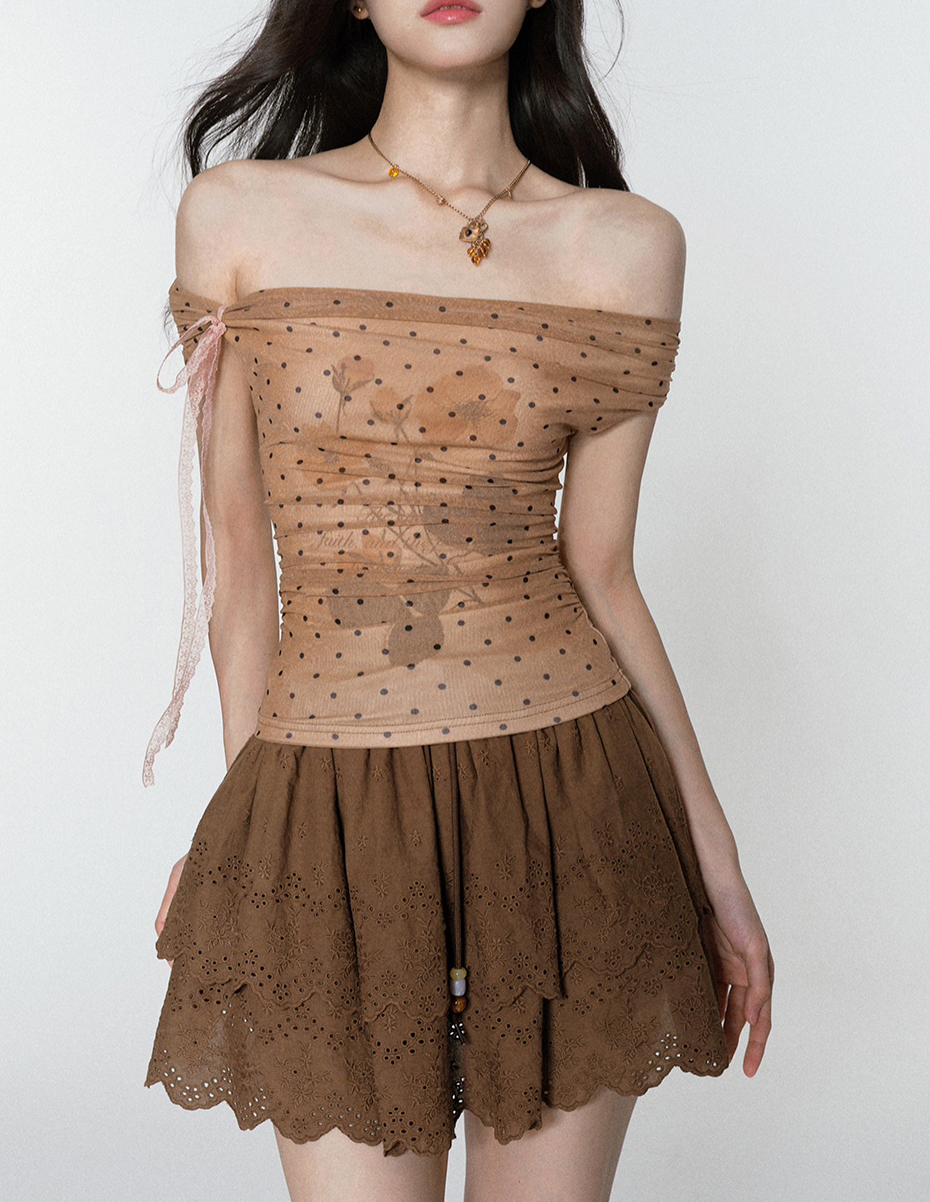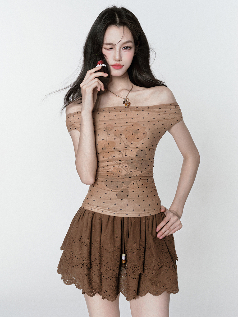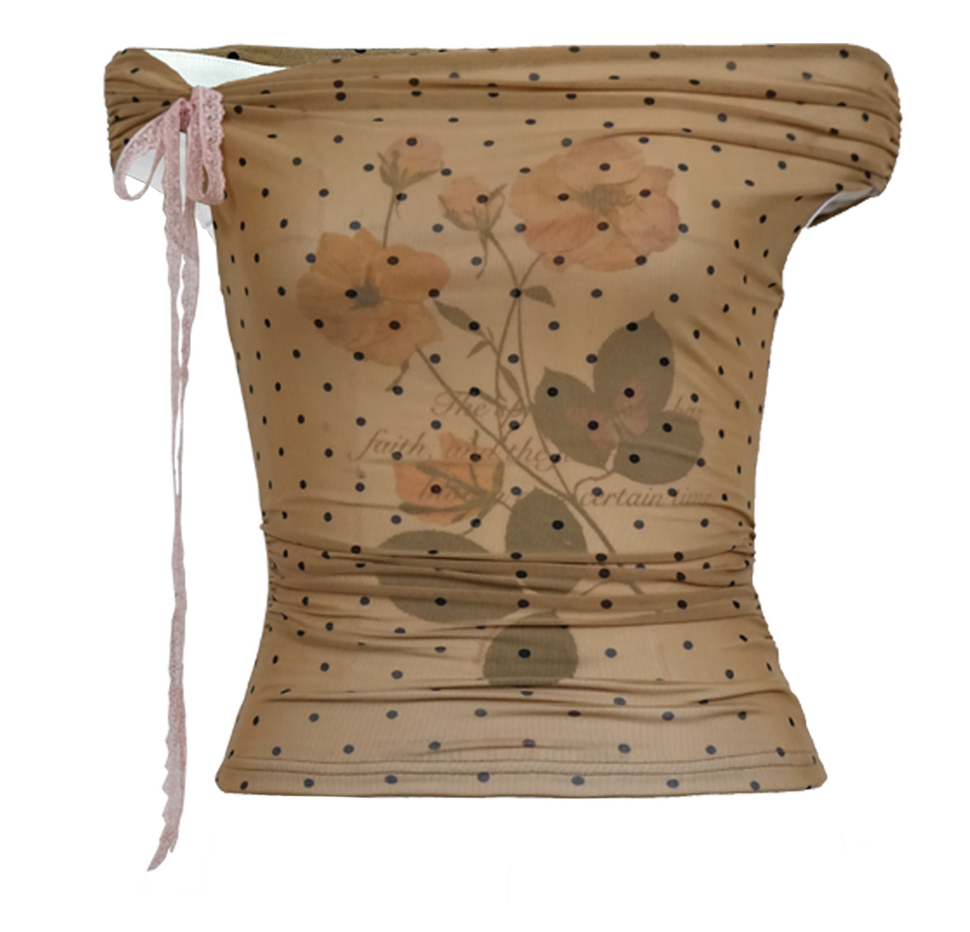 잔잔한 도트 패턴 위에 수채화처럼 퍼지는 장미 프린팅이 인상적인 시스루 메쉬 탑으로 자연스럽게 드레이프지는 셔링과 오프숄더 디자인이 여리한 무드를 연출해줍니다.