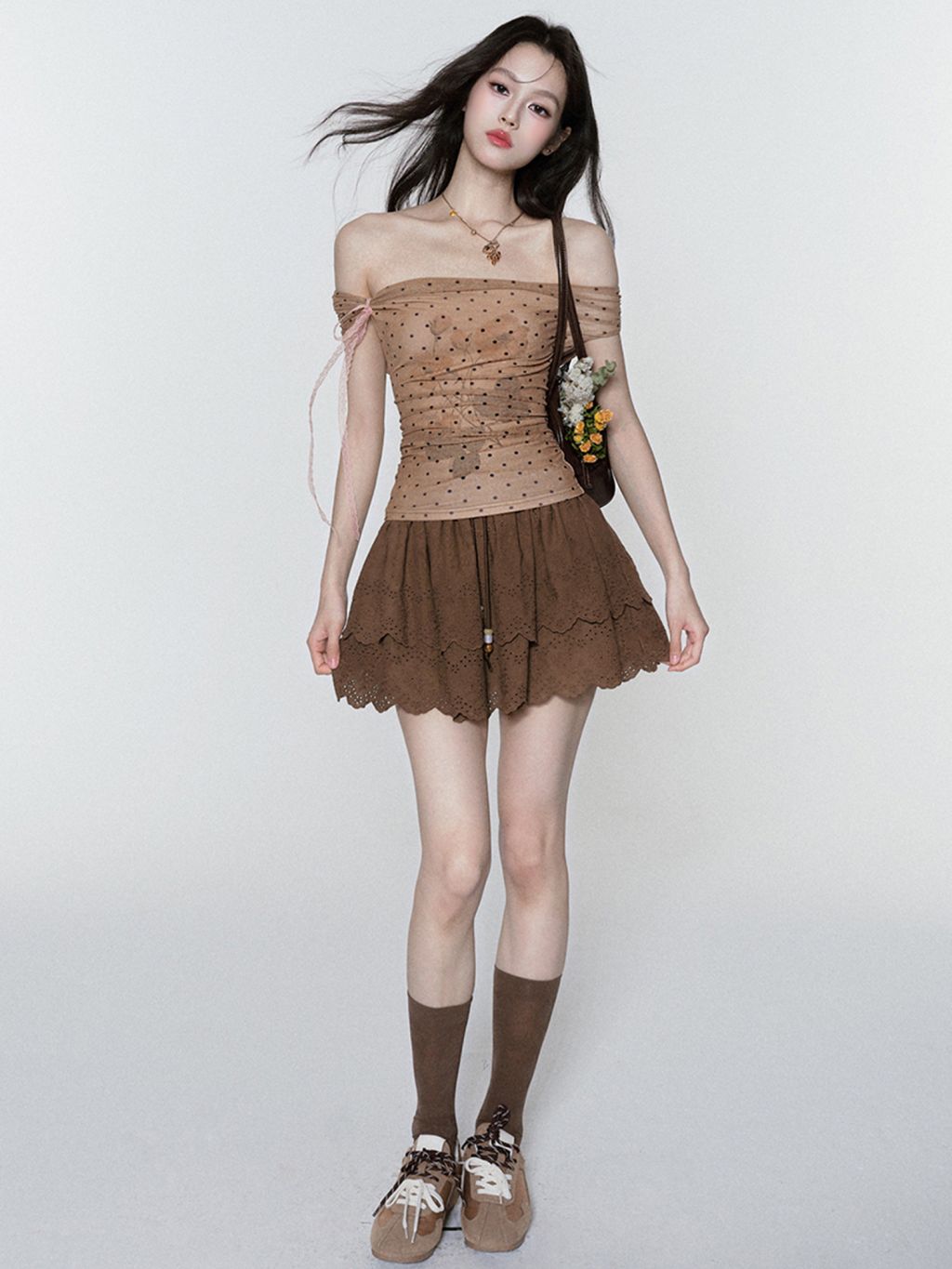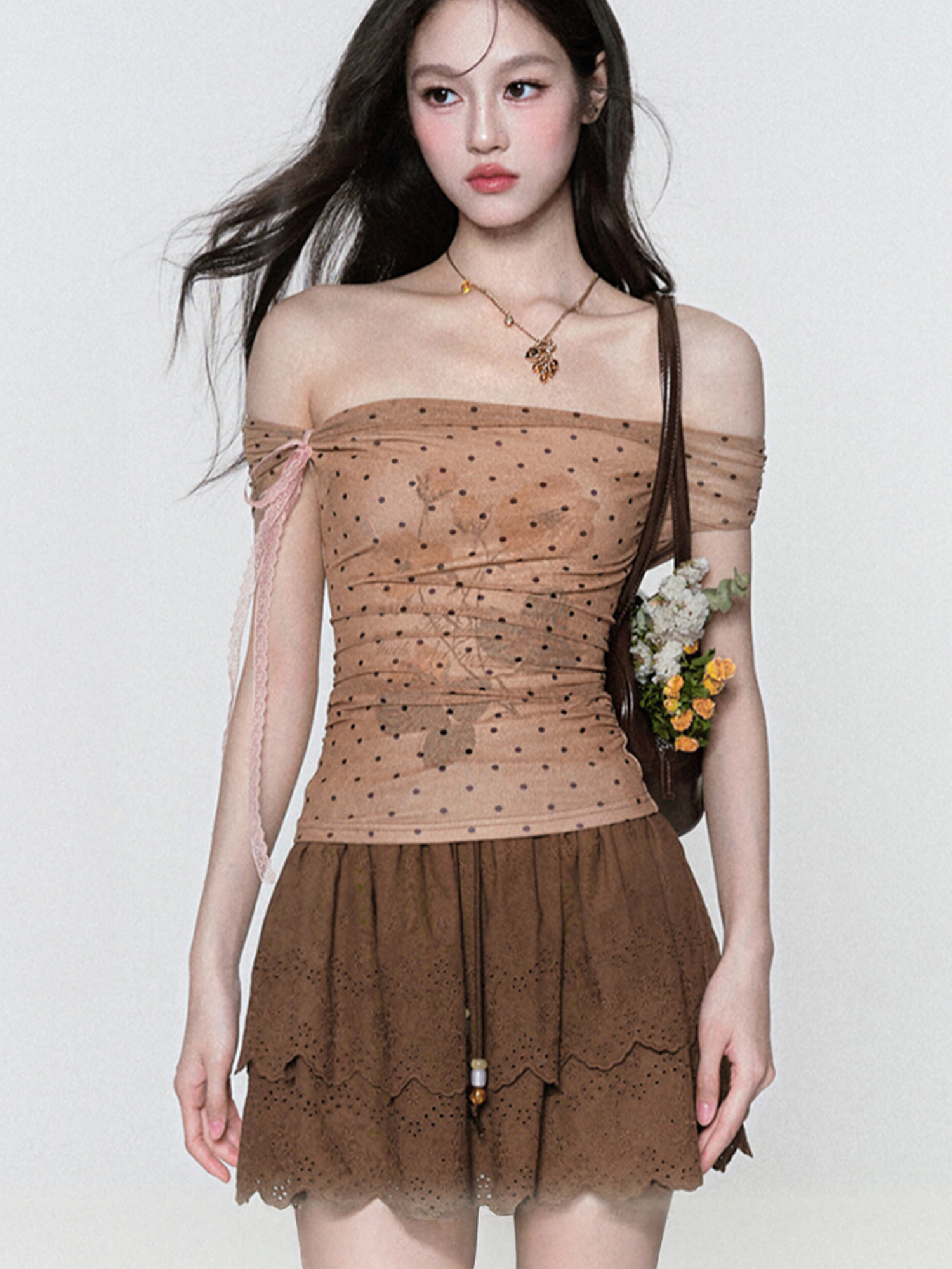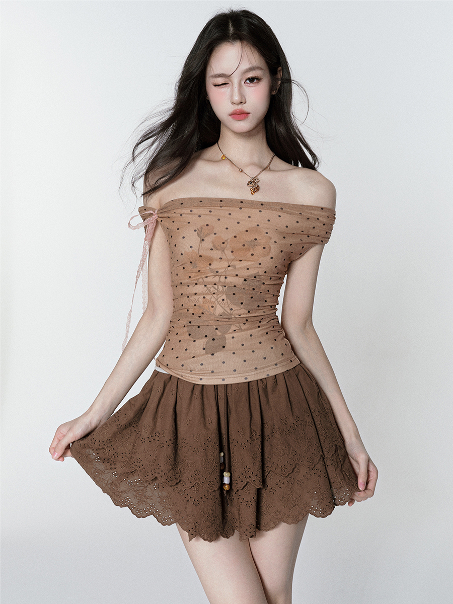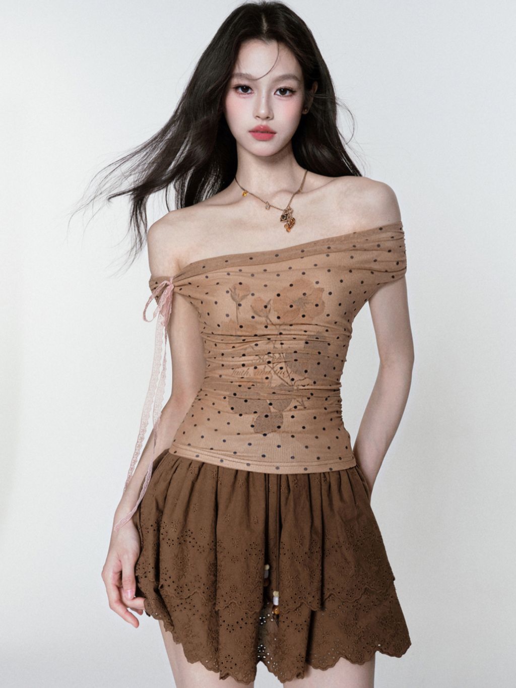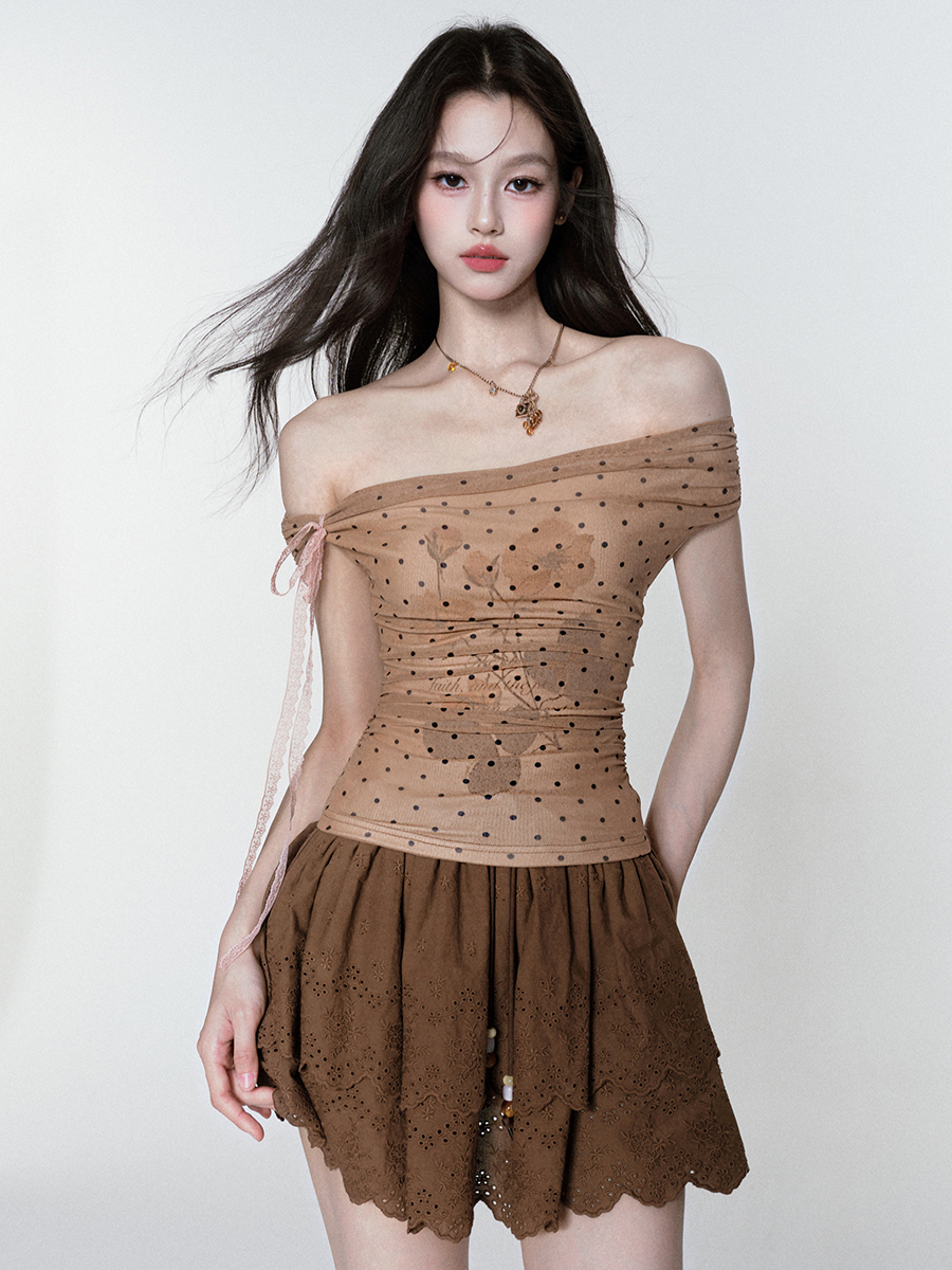 잔잔한 도트 패턴 위에 수채화처럼 퍼지는 장미 프린팅이 인상적인 시스루 메쉬 탑으로 자연스럽게 드레이프지는 셔링과 오프숄더 디자인이 여리한 무드를 연출해줍니다.