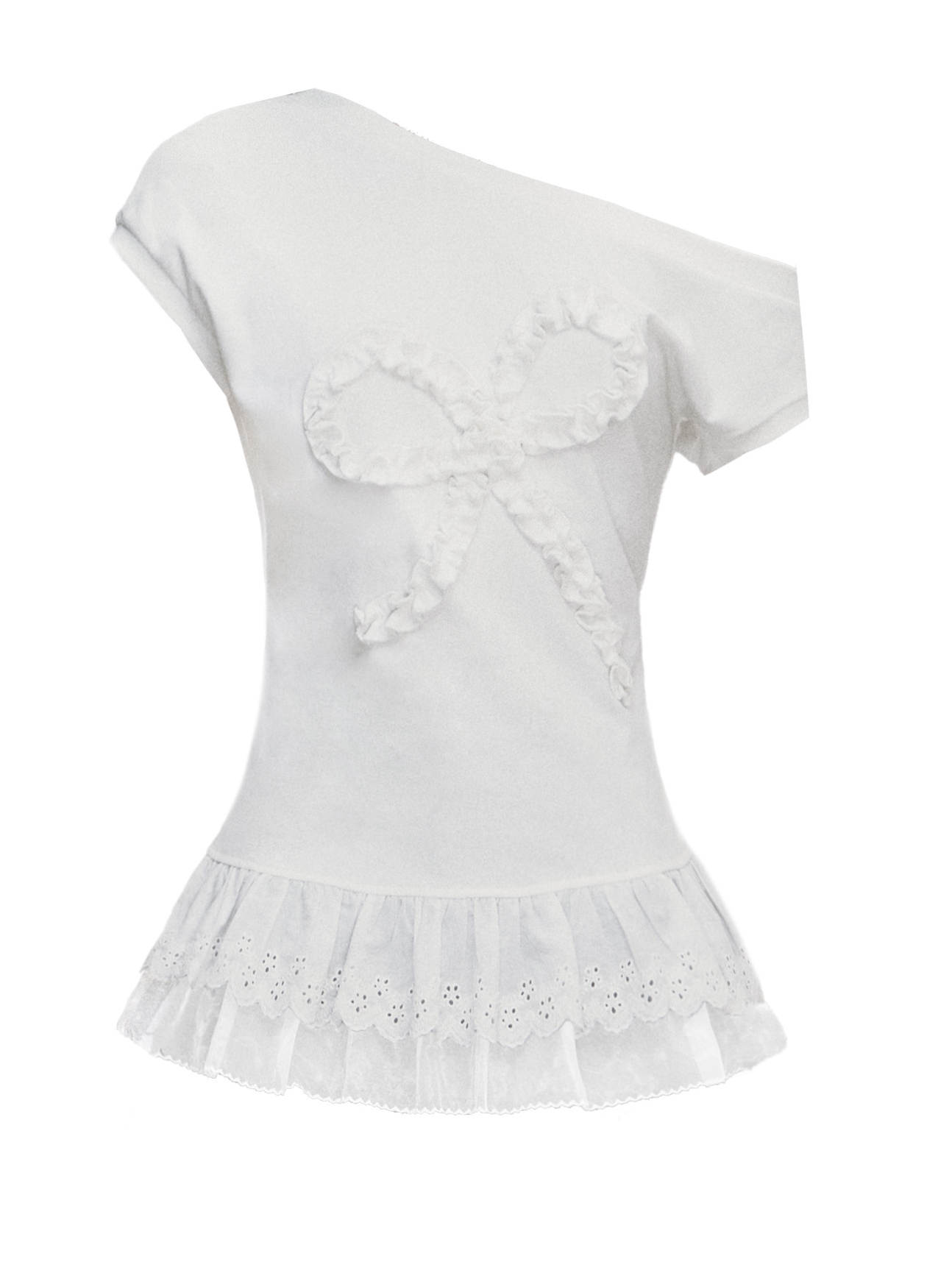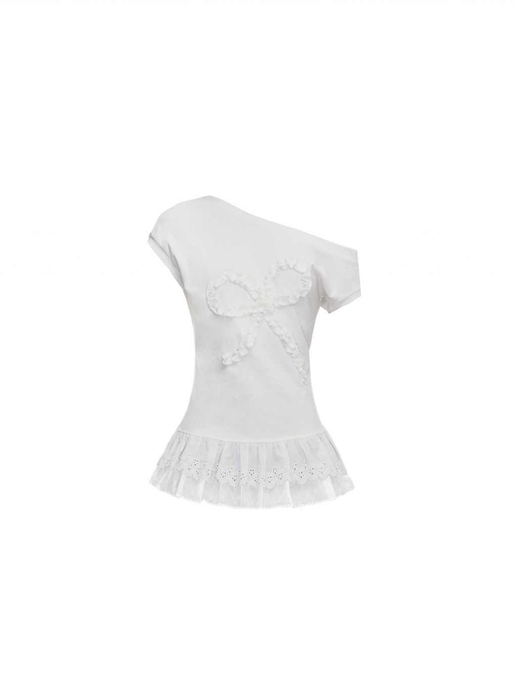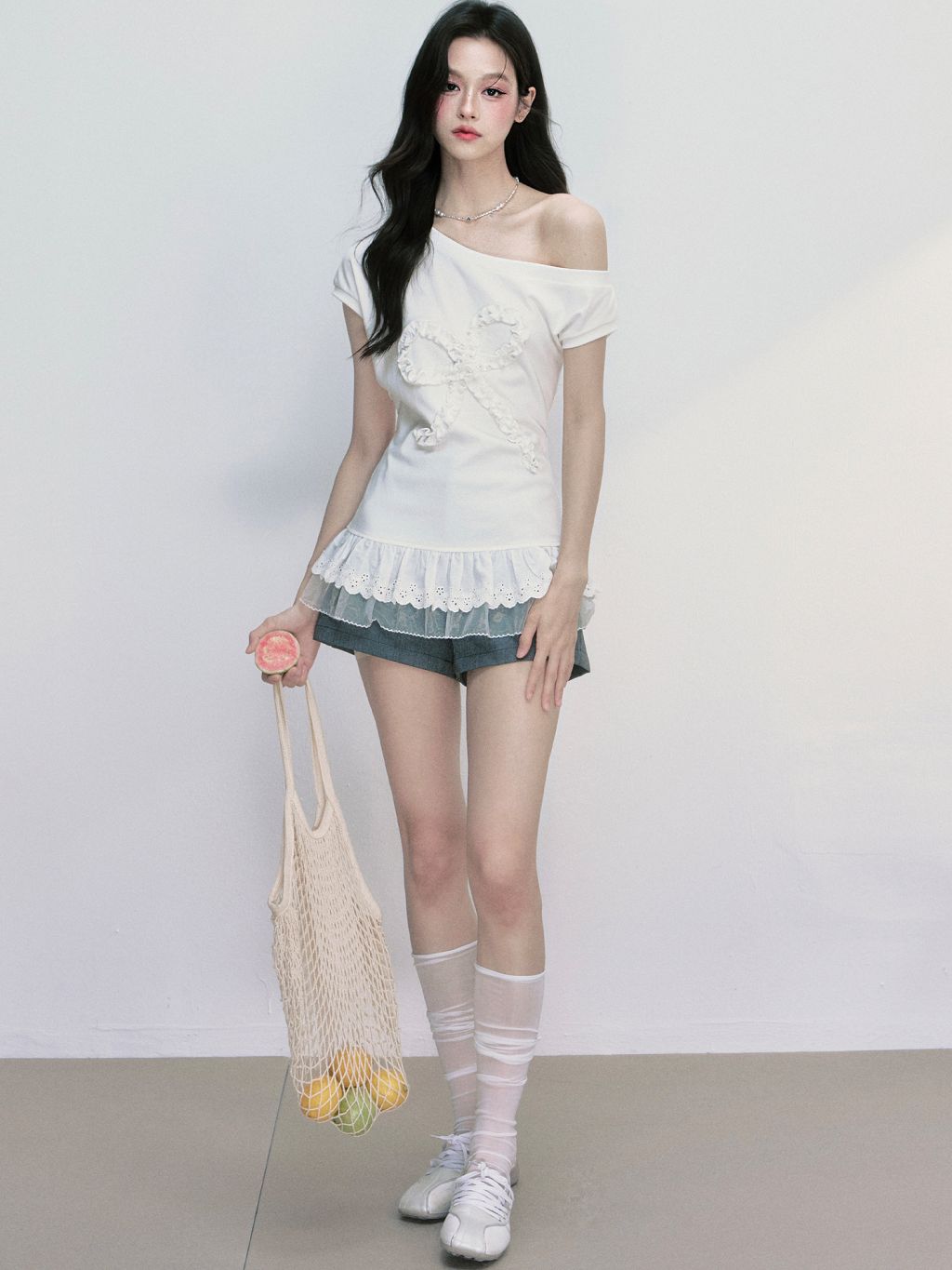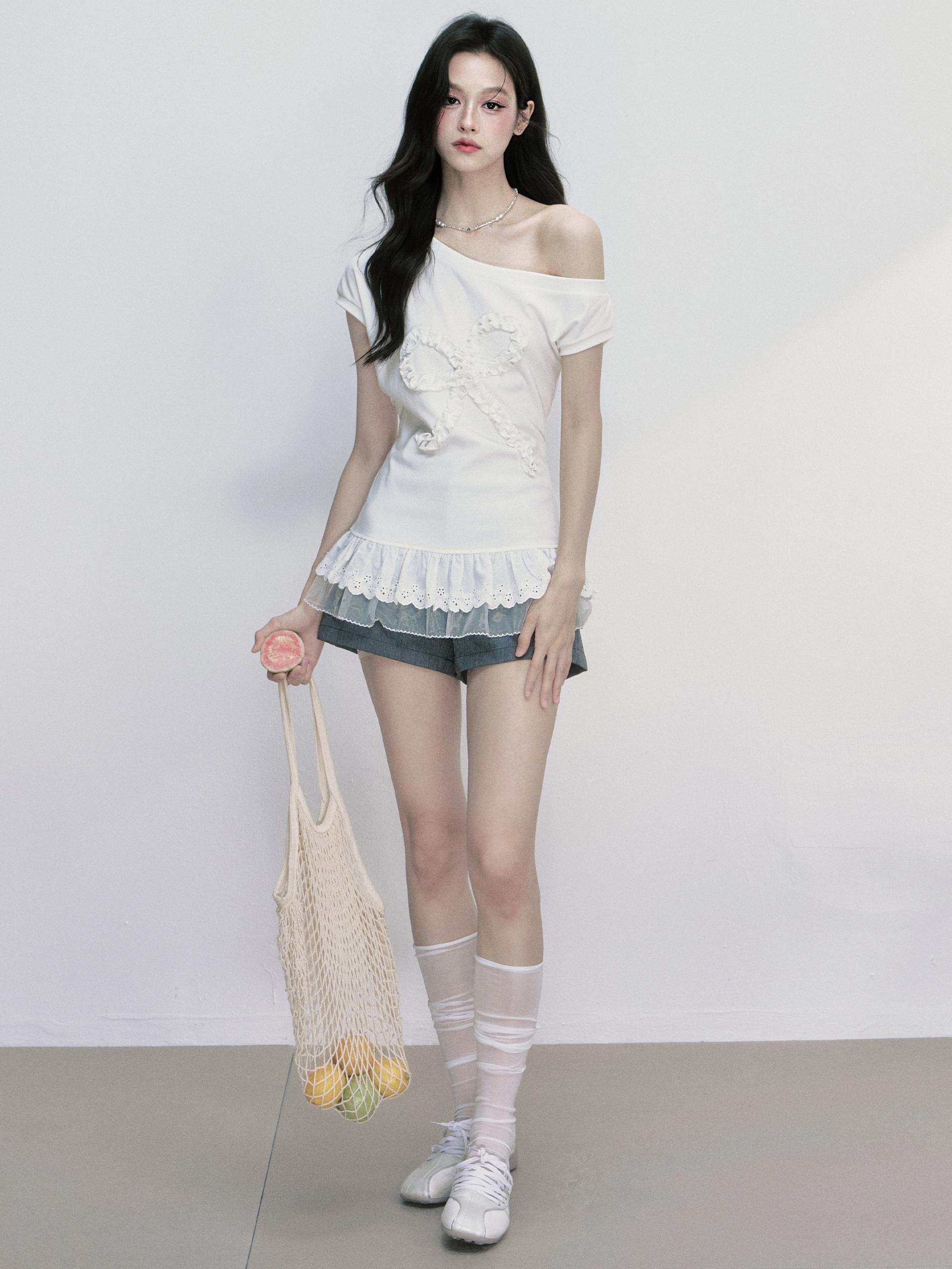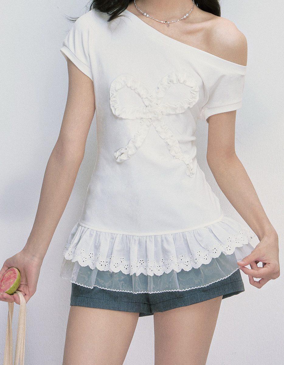 러플 디테일로 완성된 빅 리본 장식이 시선을 사로잡는 오프숄더 티셔츠로 레이스 프릴이 덧대어진 밑단은 러블리한 실루엣을 더해주며, 키치한 매력을 극대화합니다.