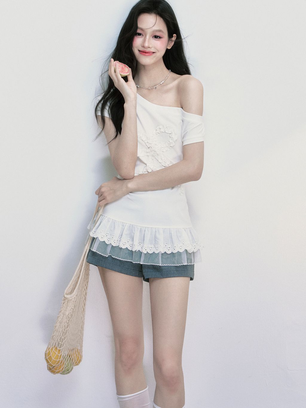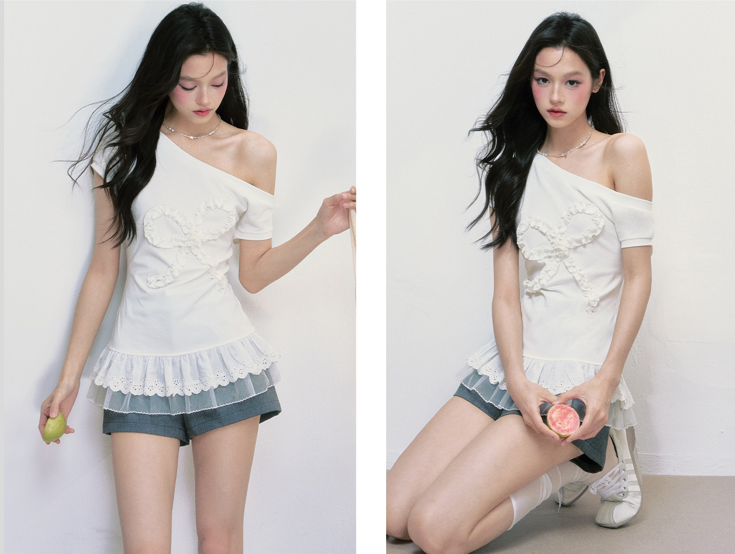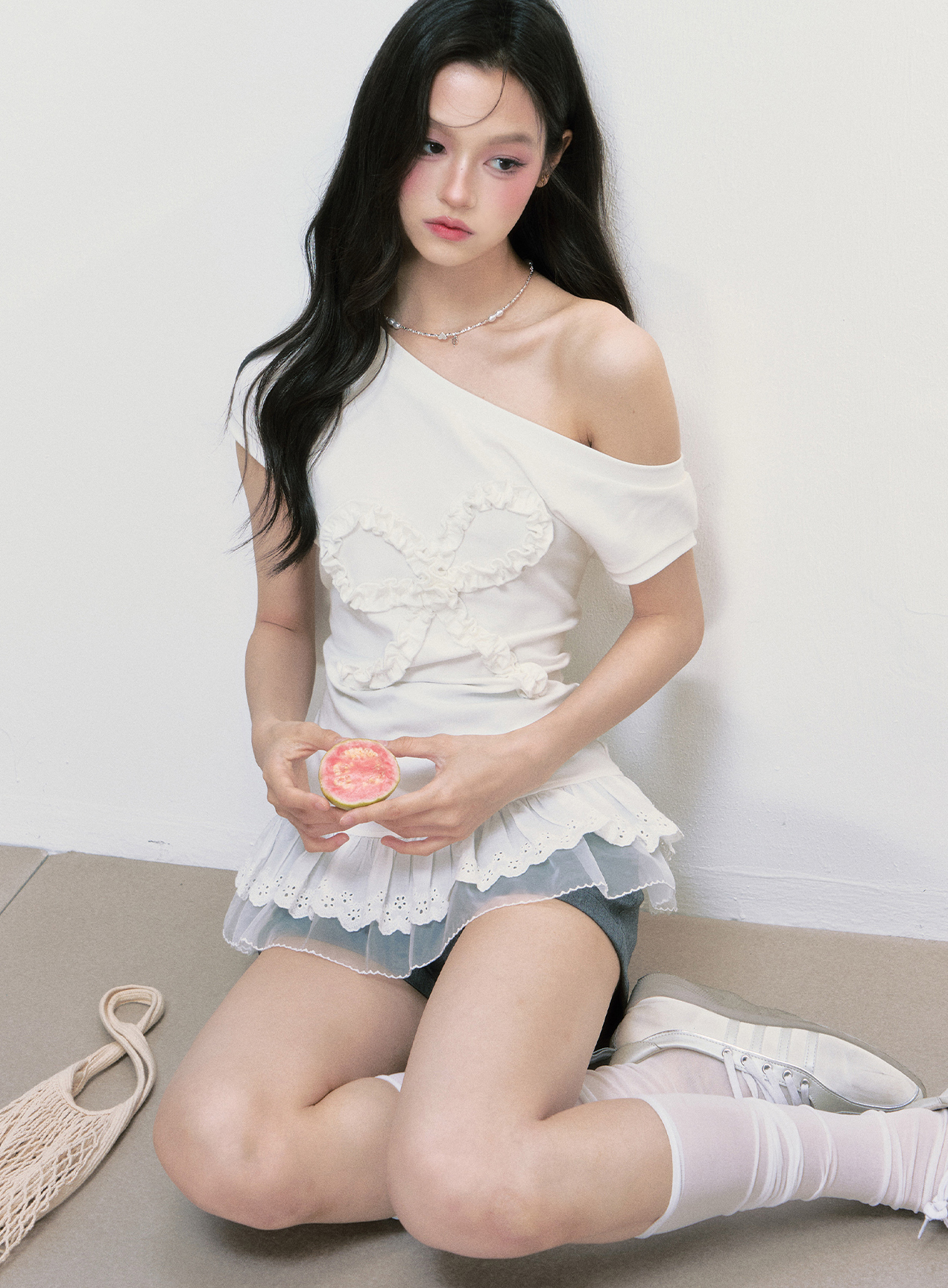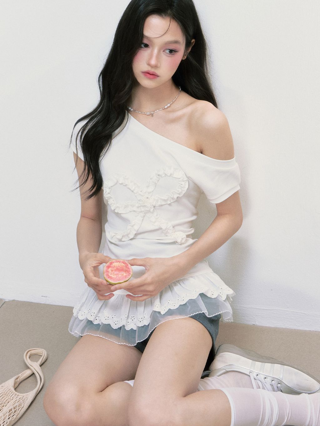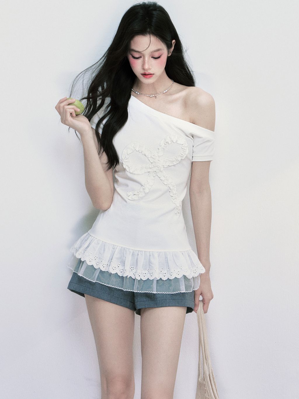러플 디테일로 완성된 빅 리본 장식이 시선을 사로잡는 오프숄더 티셔츠로 레이스 프릴이 덧대어진 밑단은 러블리한 실루엣을 더해주며, 키치한 매력을 극대화합니다.
