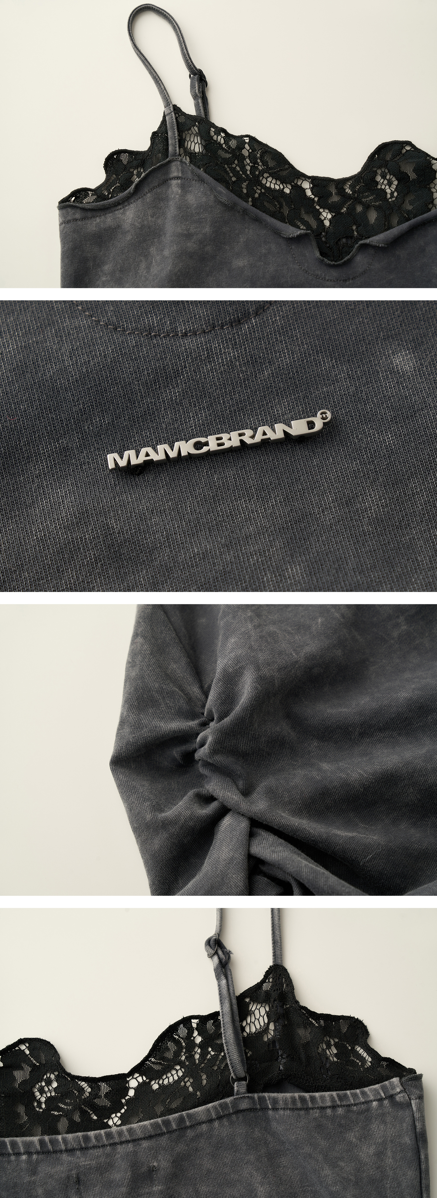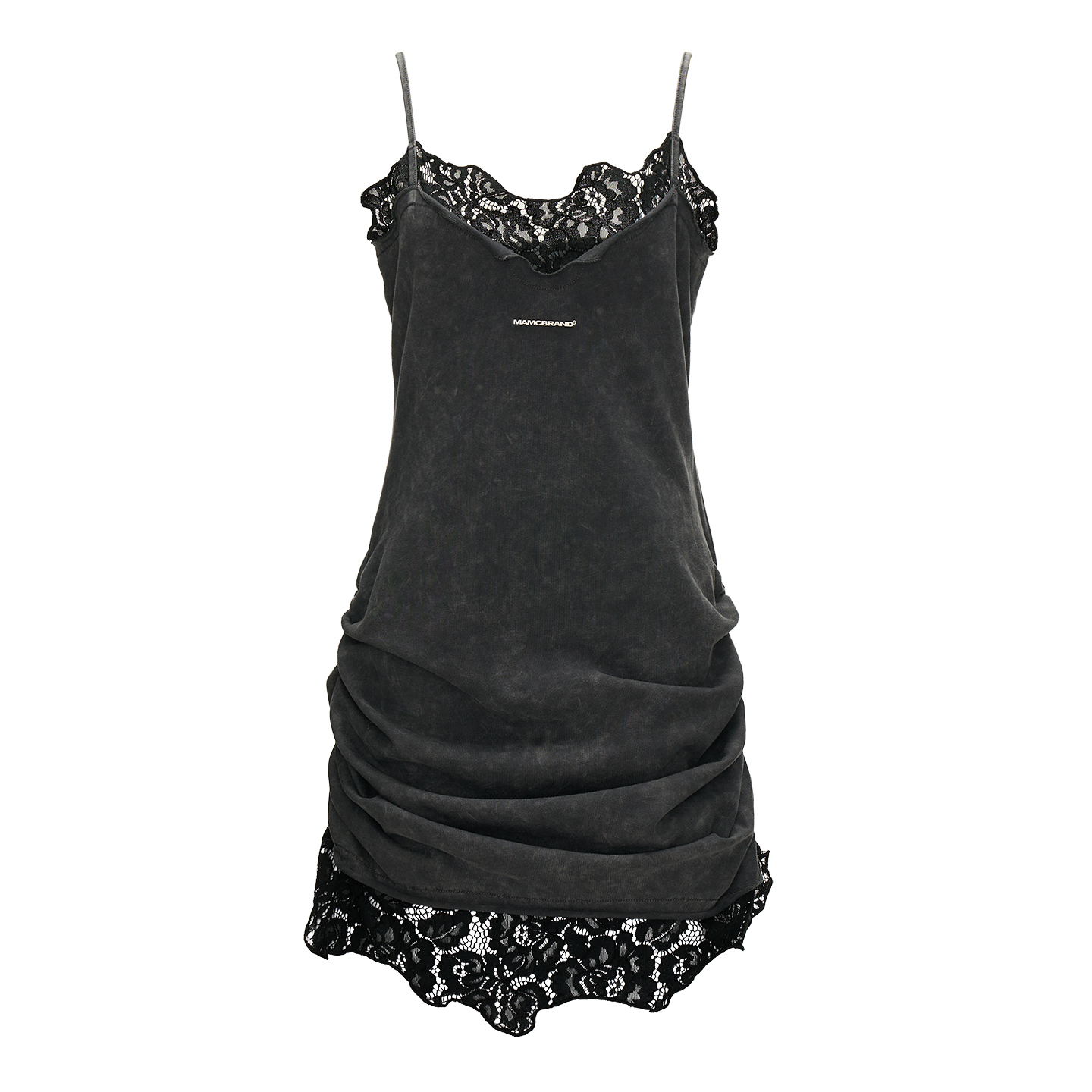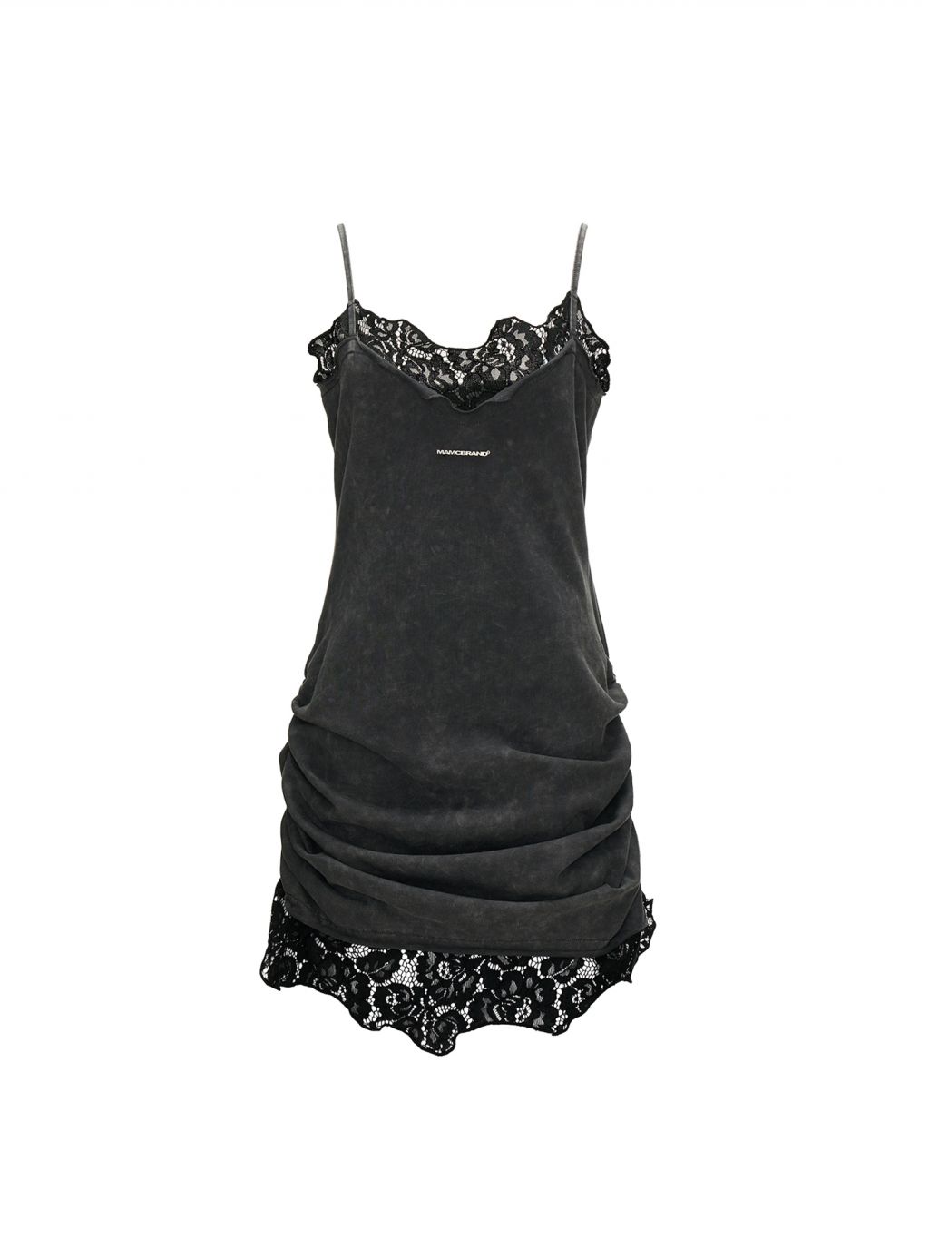 빈티지한 워싱 텍스처와 레이스 디테일이 어우러진 슬립 드레스로 차분한 그레이 컬러 위에 여성스러운 레이스 포인트가 매력을 더합니다.