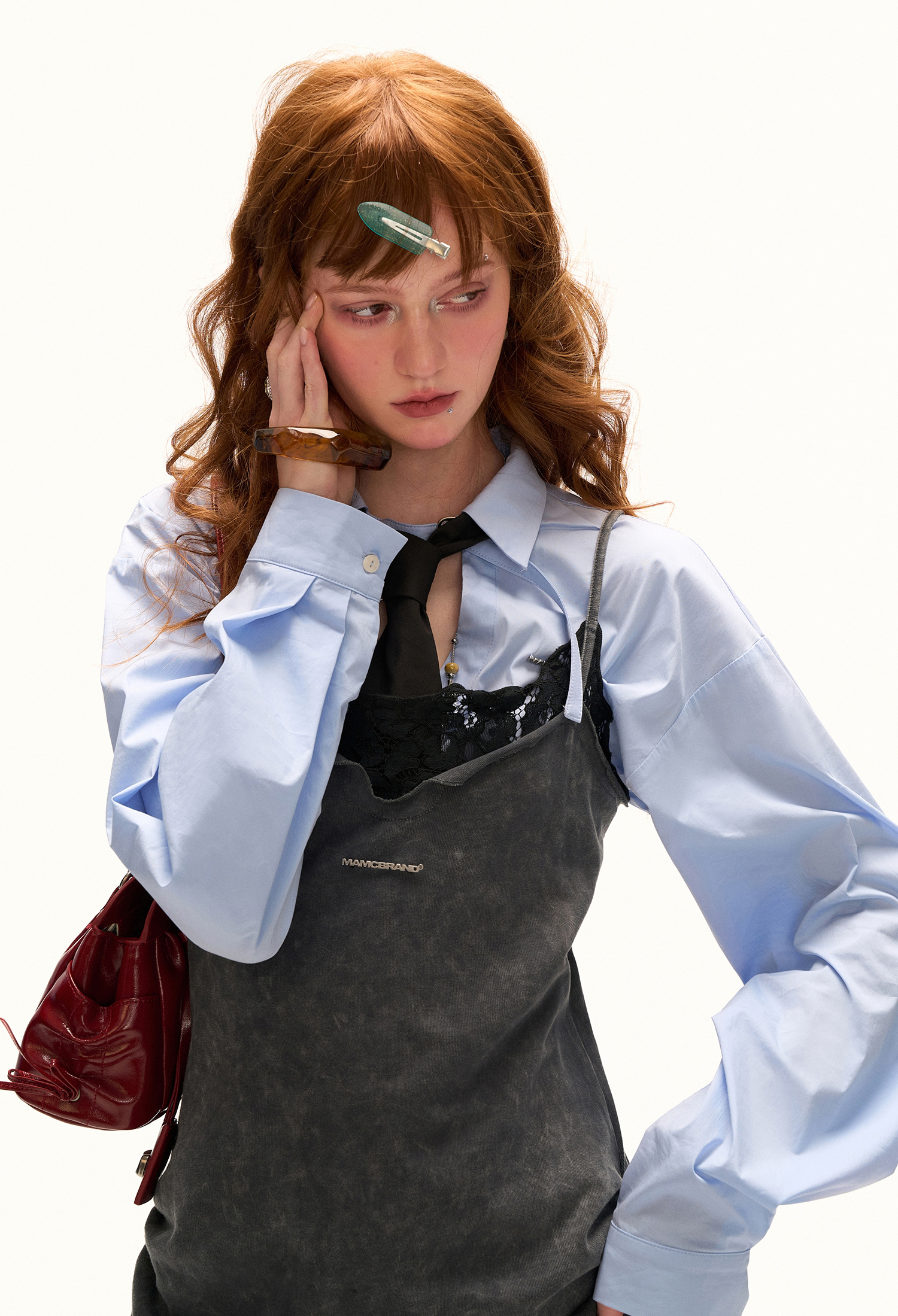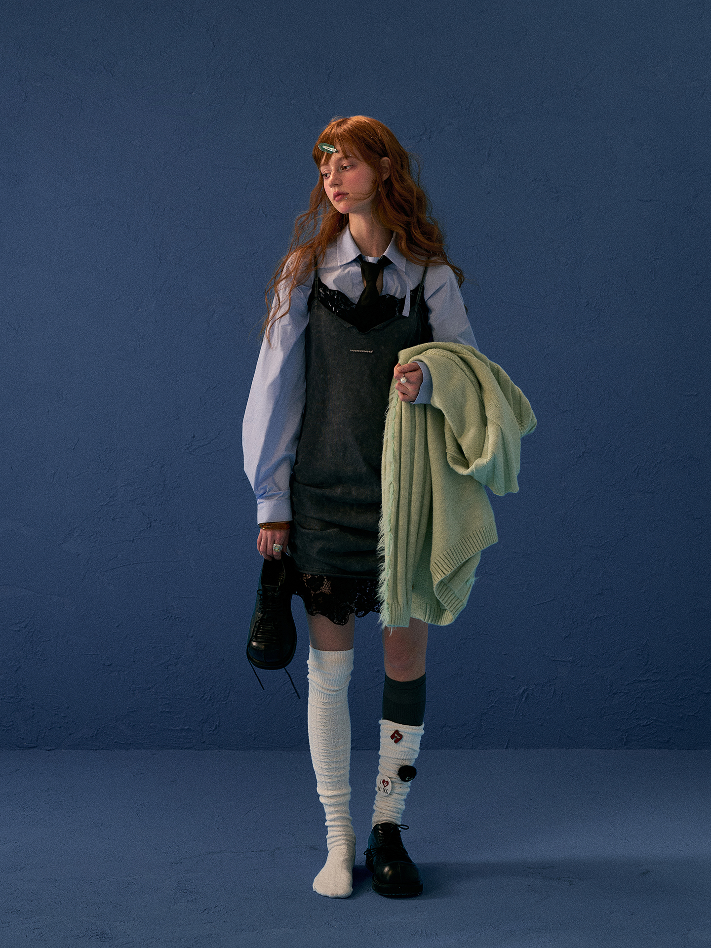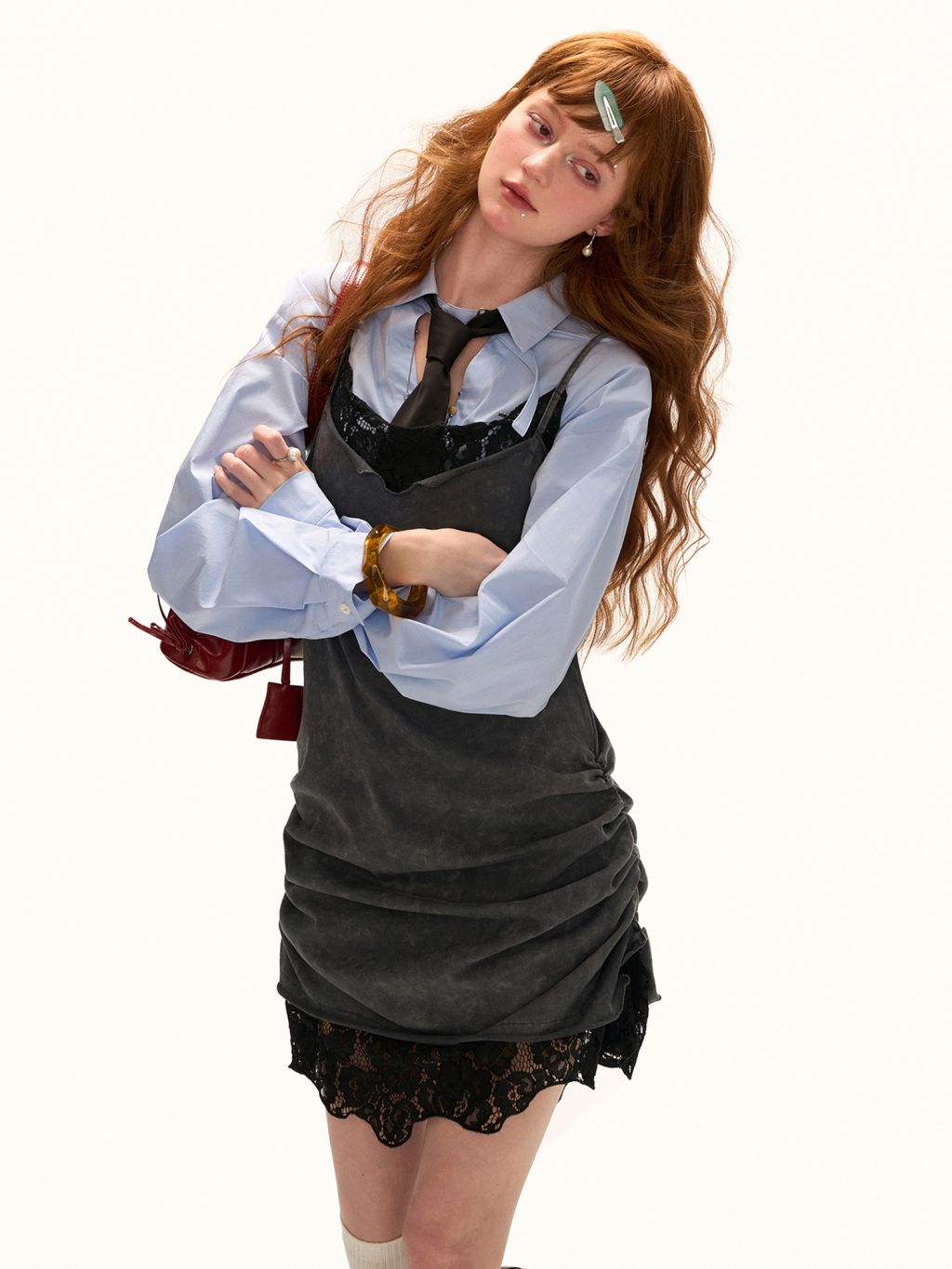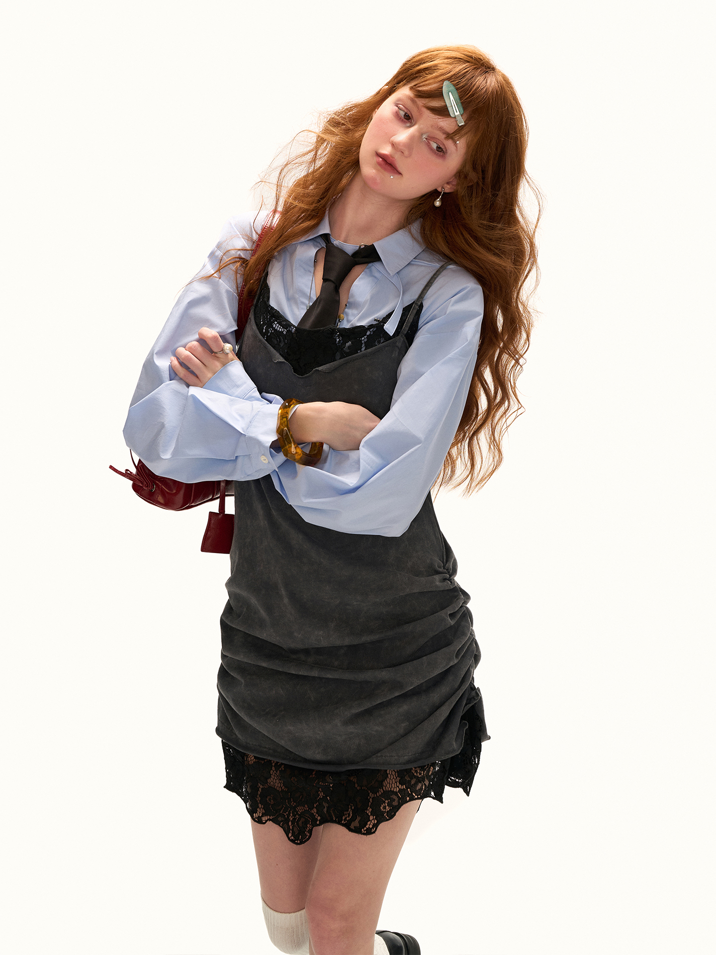 빈티지한 워싱 텍스처와 레이스 디테일이 어우러진 슬립 드레스로 차분한 그레이 컬러 위에 여성스러운 레이스 포인트가 매력을 더합니다.