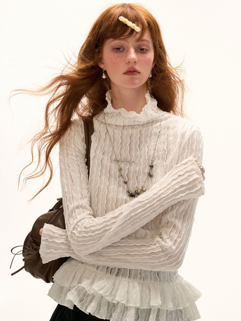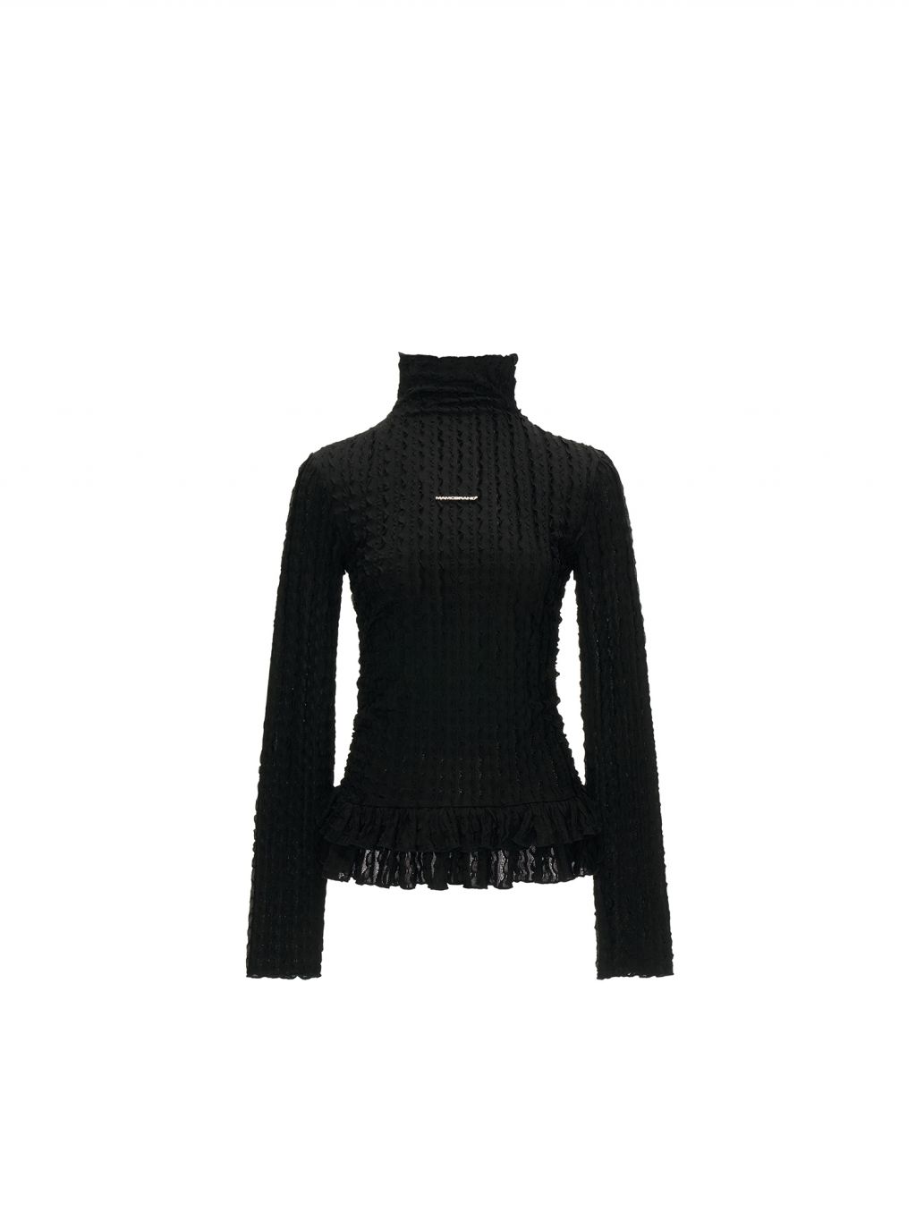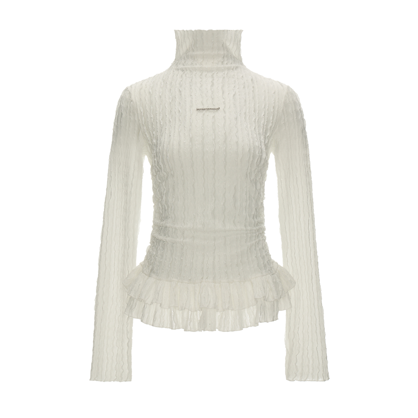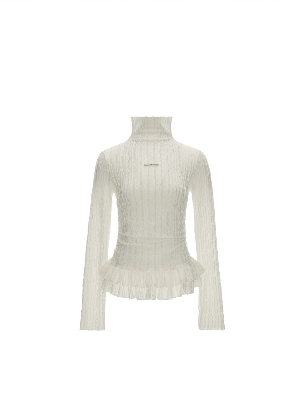 풍성한 프릴 디테일이 돋보이는 레이스 터틀넥 톱으로 은은한 시스루 텍스처와 웨이브 패턴이 어우러져 여성스러운 무드를 완성합니다. 단독으로 착용해도 포인트가 되며, 다양한 아우터와 레이어드하여 감각적인 스타일을 연출할 수 있습니다.