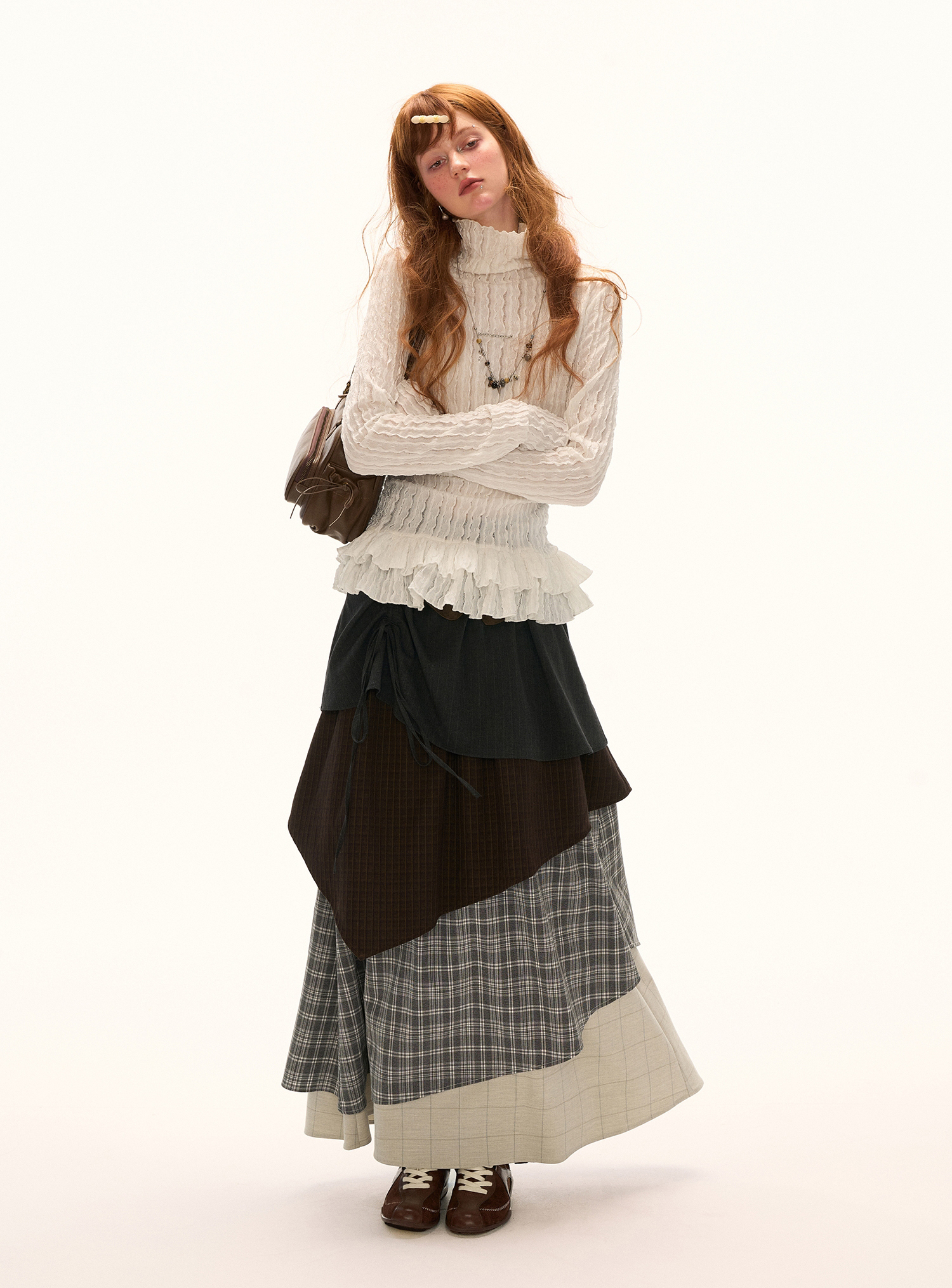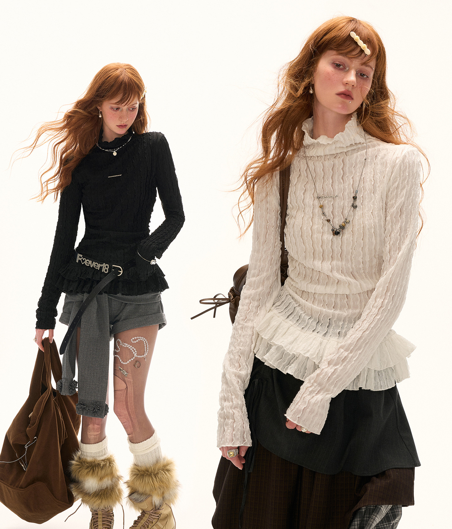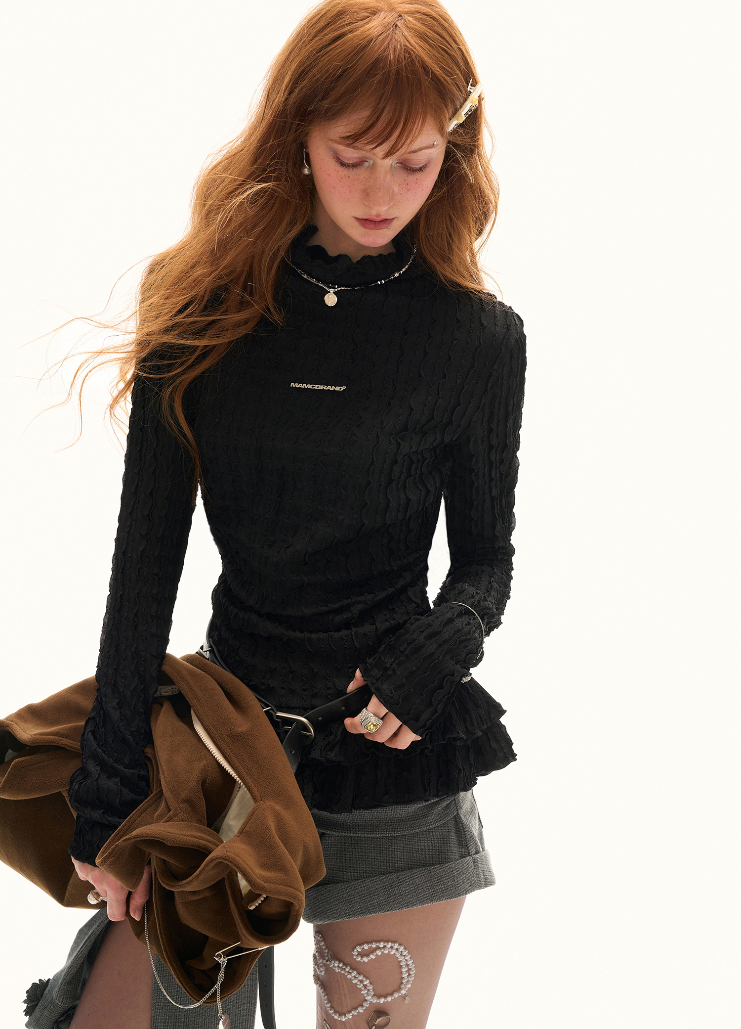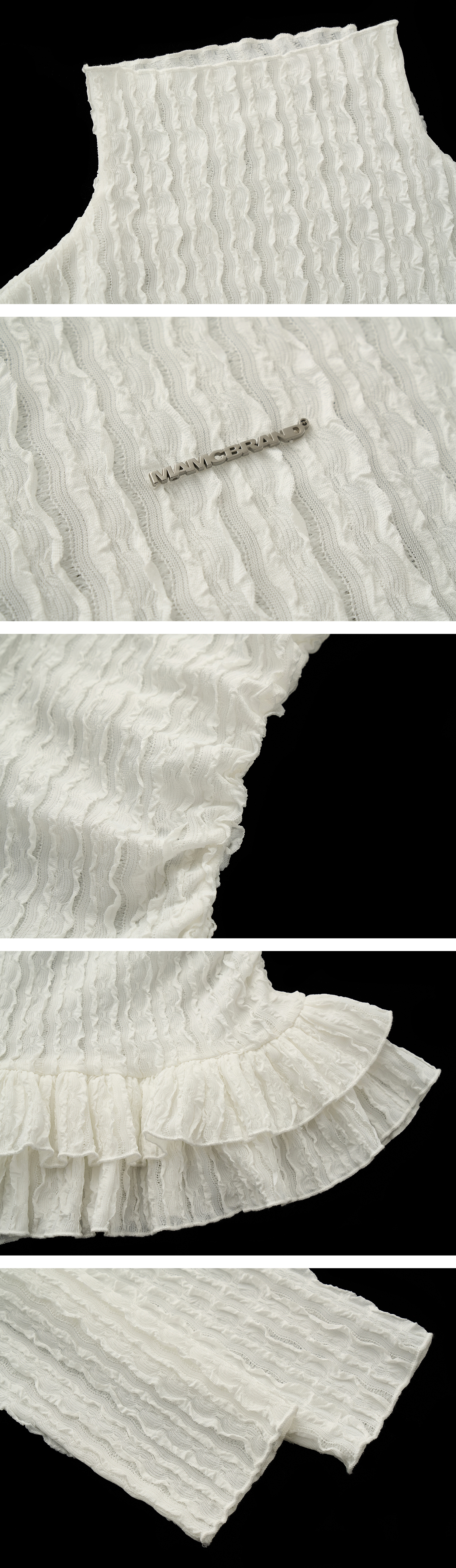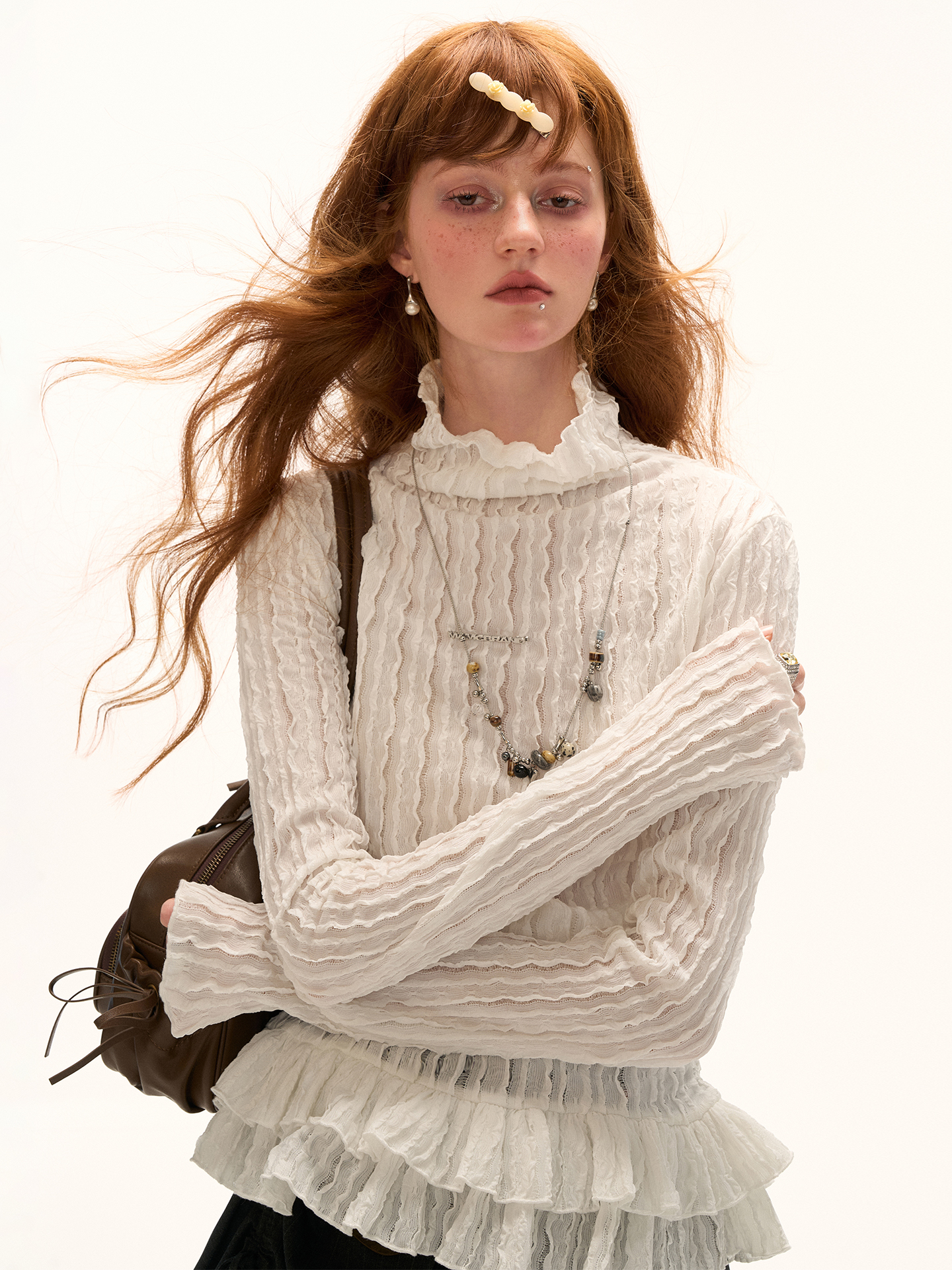 풍성한 프릴 디테일이 돋보이는 레이스 터틀넥 톱으로 은은한 시스루 텍스처와 웨이브 패턴이 어우러져 여성스러운 무드를 완성합니다. 단독으로 착용해도 포인트가 되며, 다양한 아우터와 레이어드하여 감각적인 스타일을 연출할 수 있습니다.