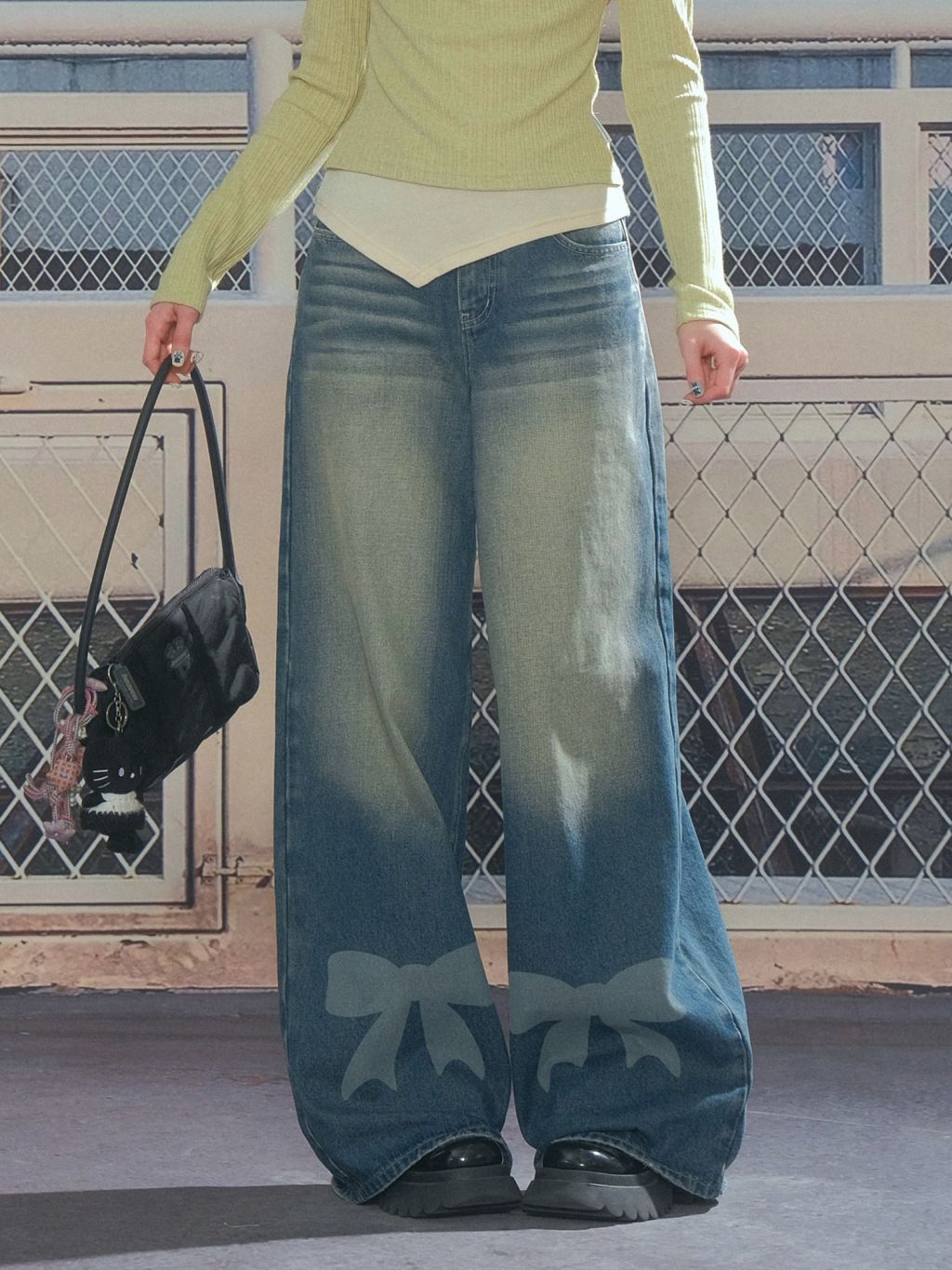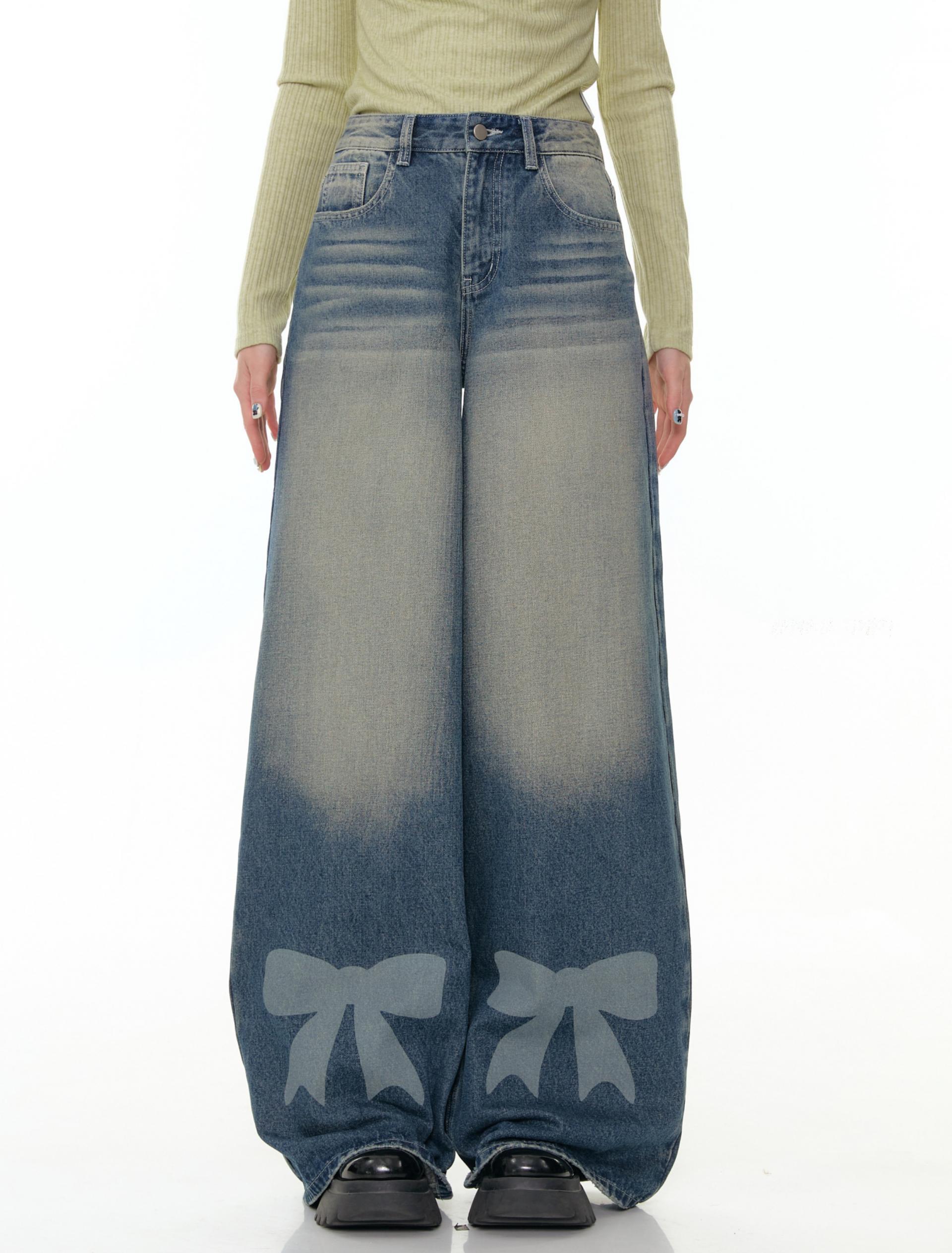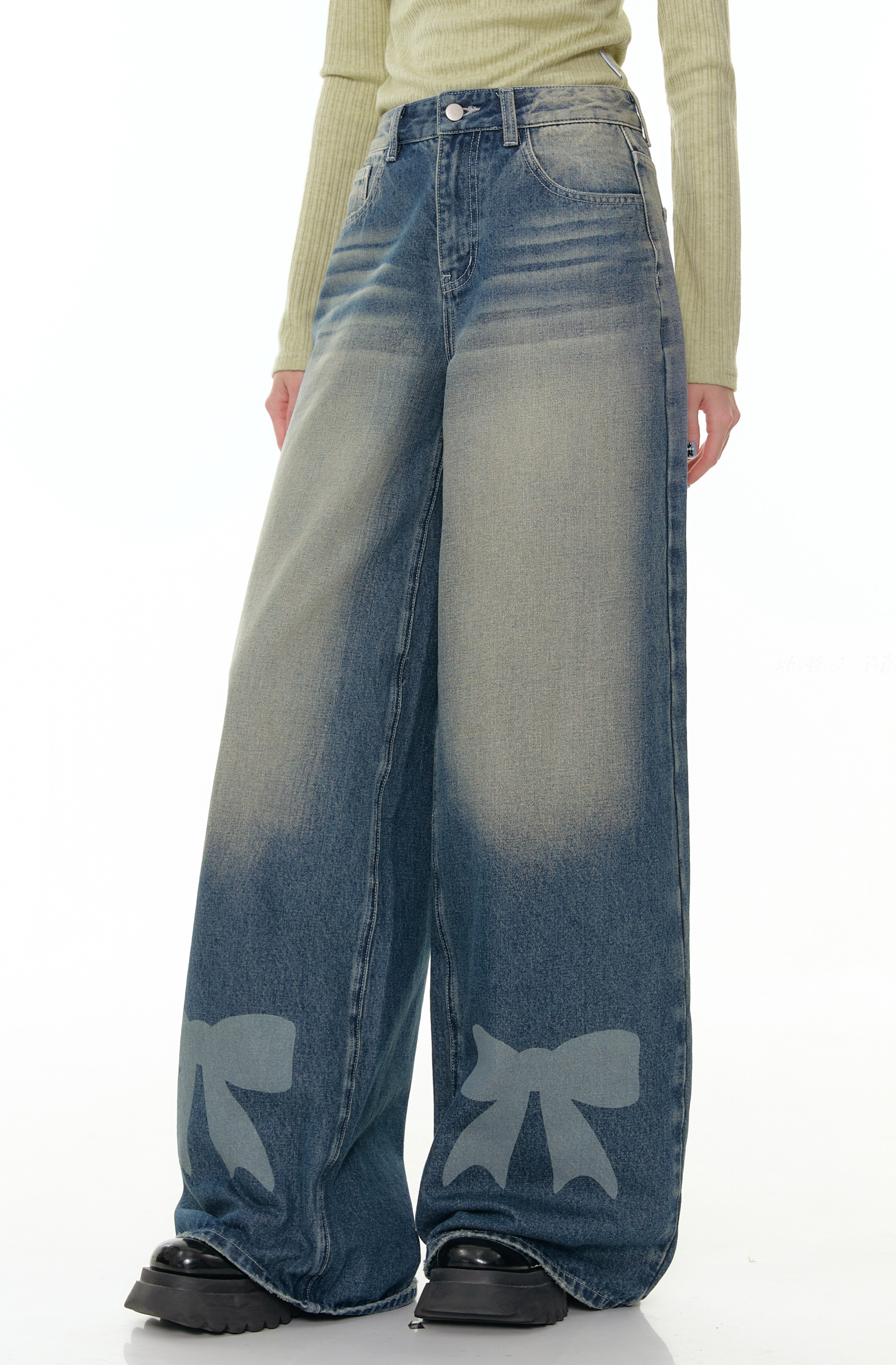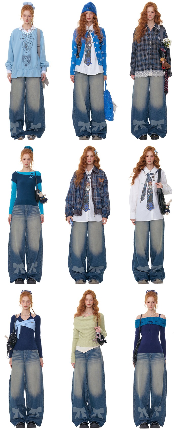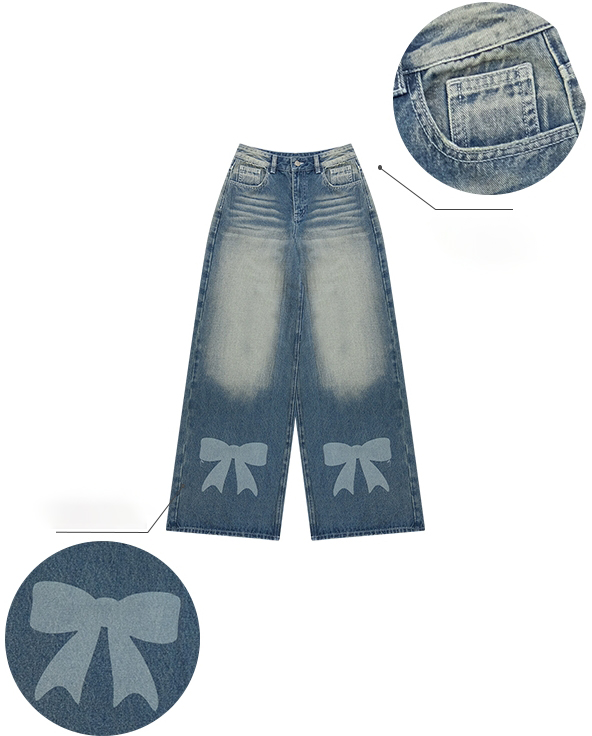 빈티지한 워싱감이 매력적인 와이드 핏 데님 팬츠로 밑단에 새겨진 리본 포인트가 러블리한 무드를 더해주며, 넉넉한 실루엣으로 편안한 착용감을 제공합니다. 스트리트 감성과 키치한 감각을 동시에 살릴 수 있는 스타일링 아이템으로 추천드립니다.