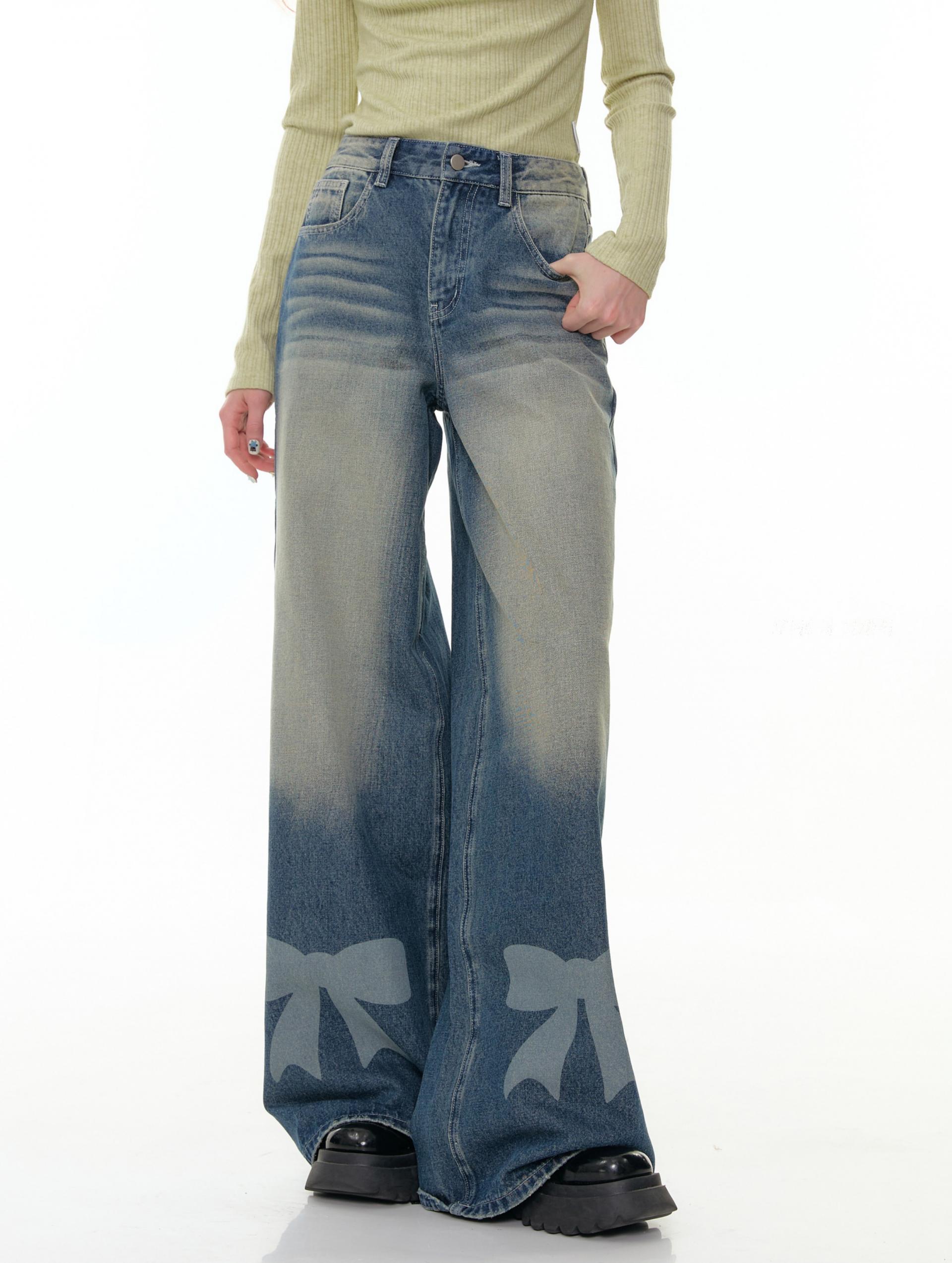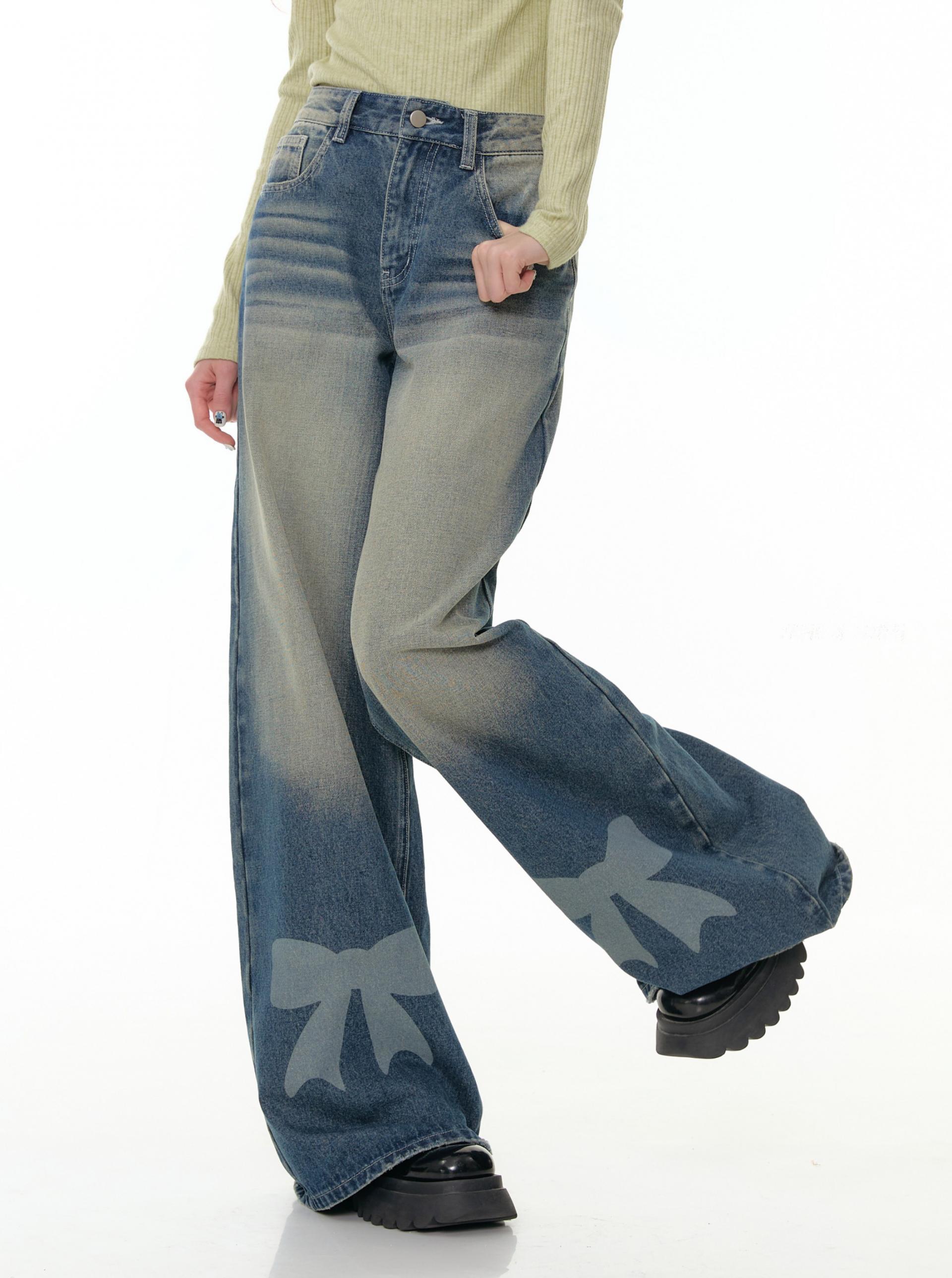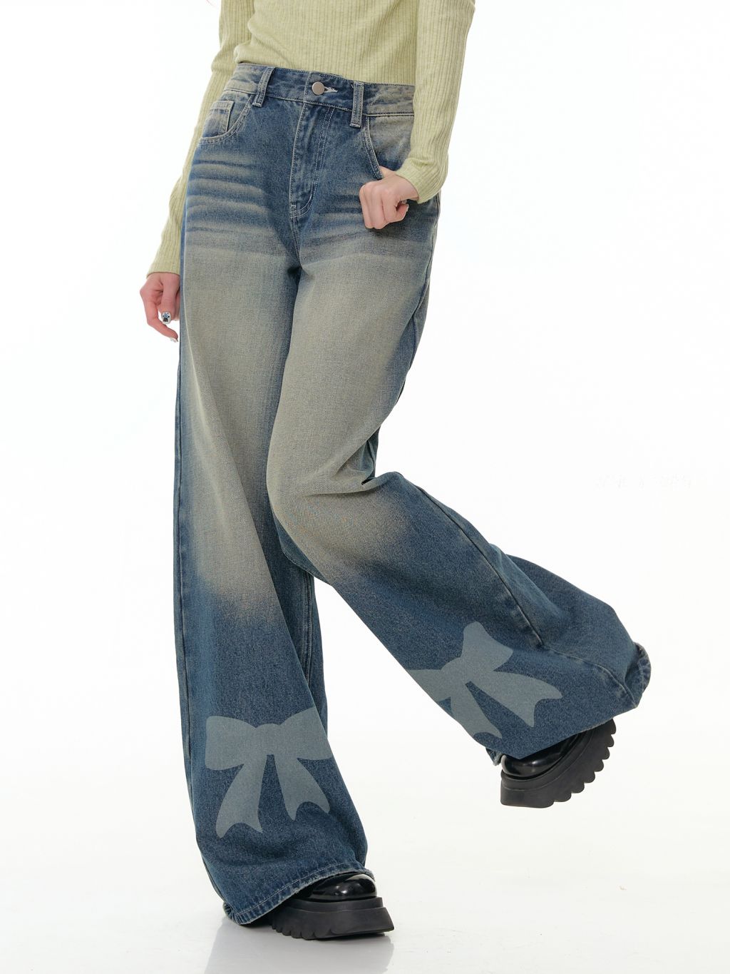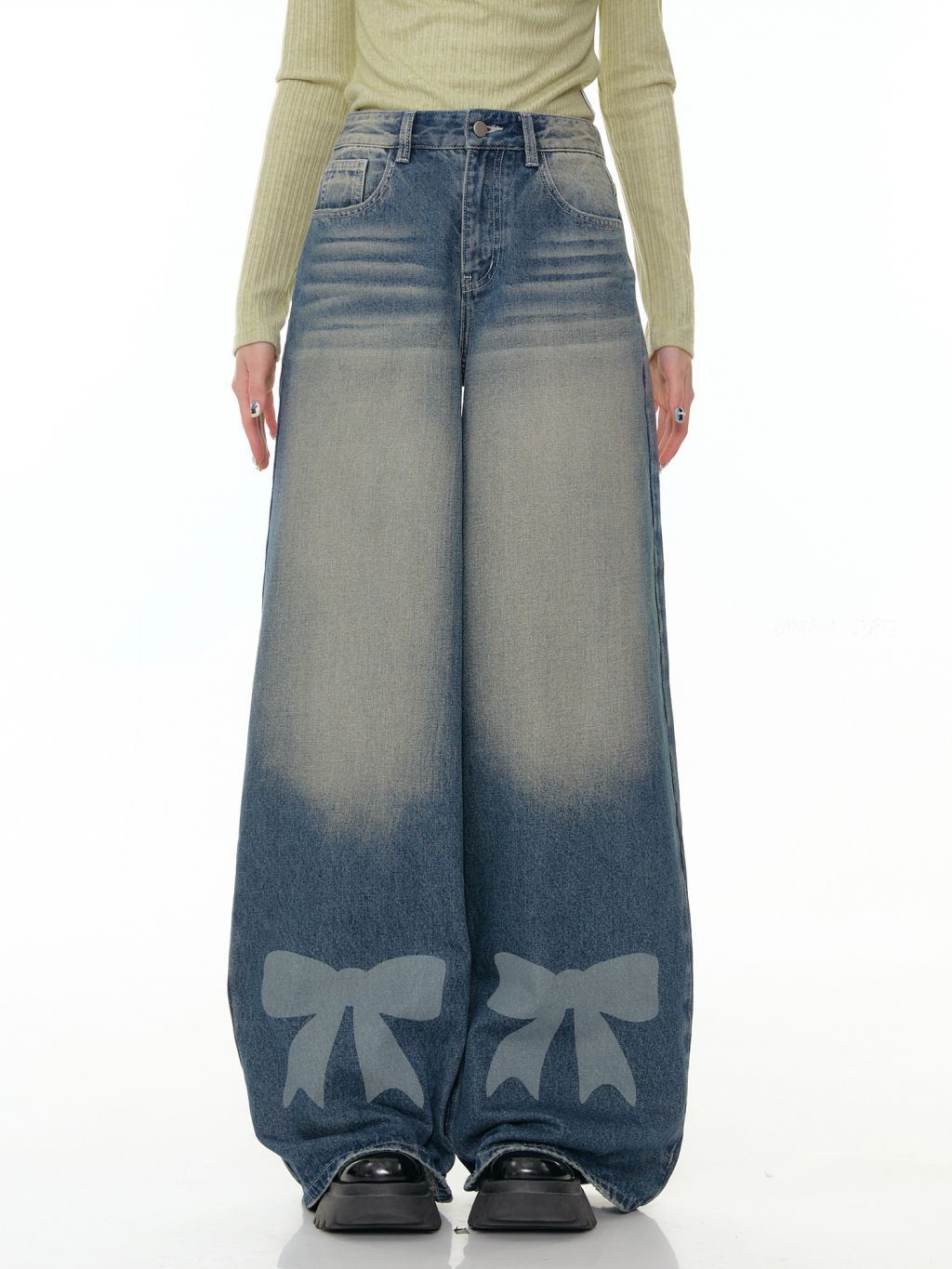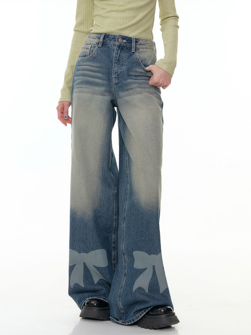 빈티지한 워싱감이 매력적인 와이드 핏 데님 팬츠로 밑단에 새겨진 리본 포인트가 러블리한 무드를 더해주며, 넉넉한 실루엣으로 편안한 착용감을 제공합니다. 스트리트 감성과 키치한 감각을 동시에 살릴 수 있는 스타일링 아이템으로 추천드립니다.