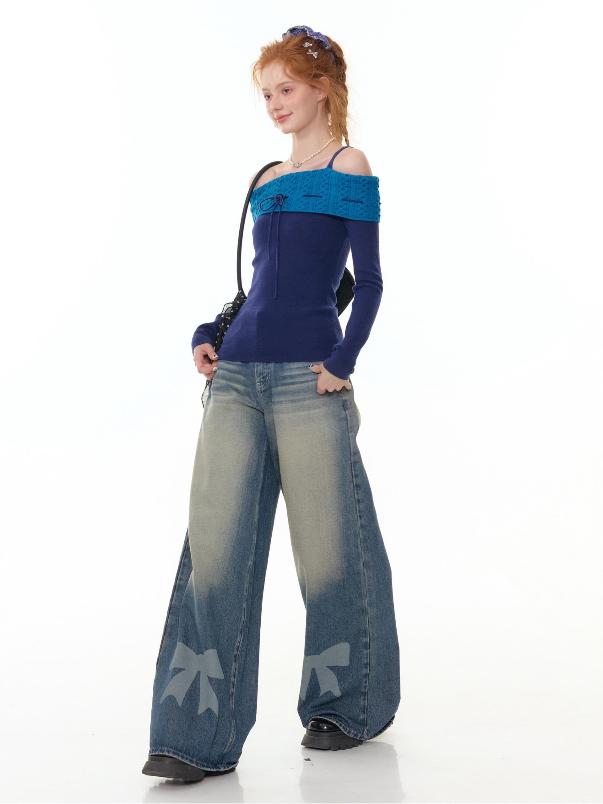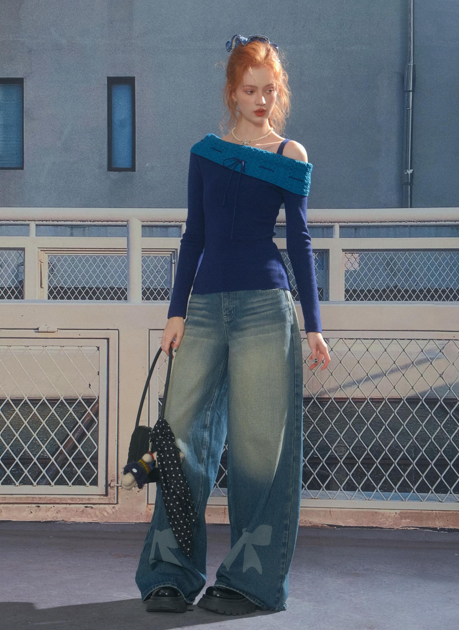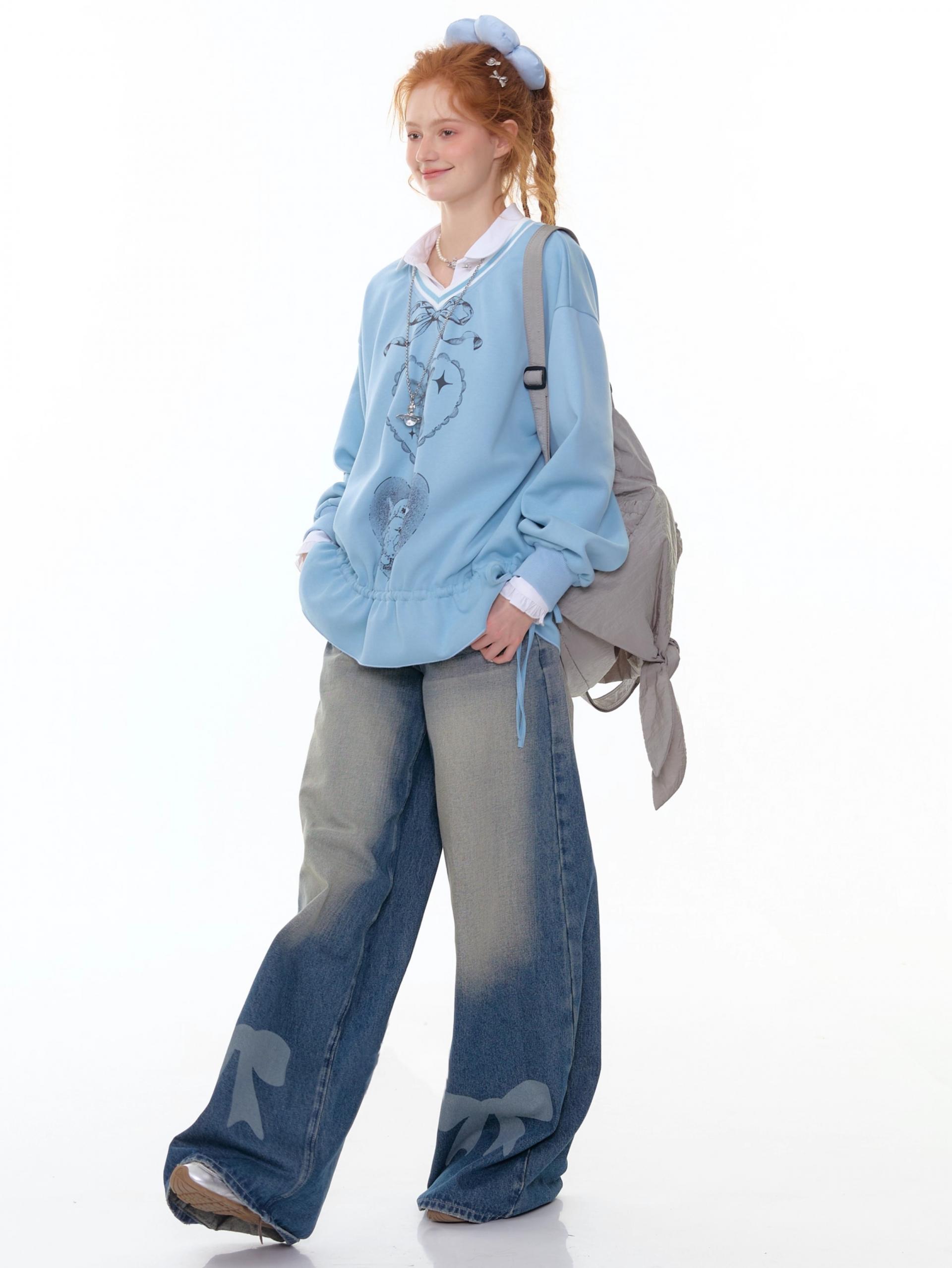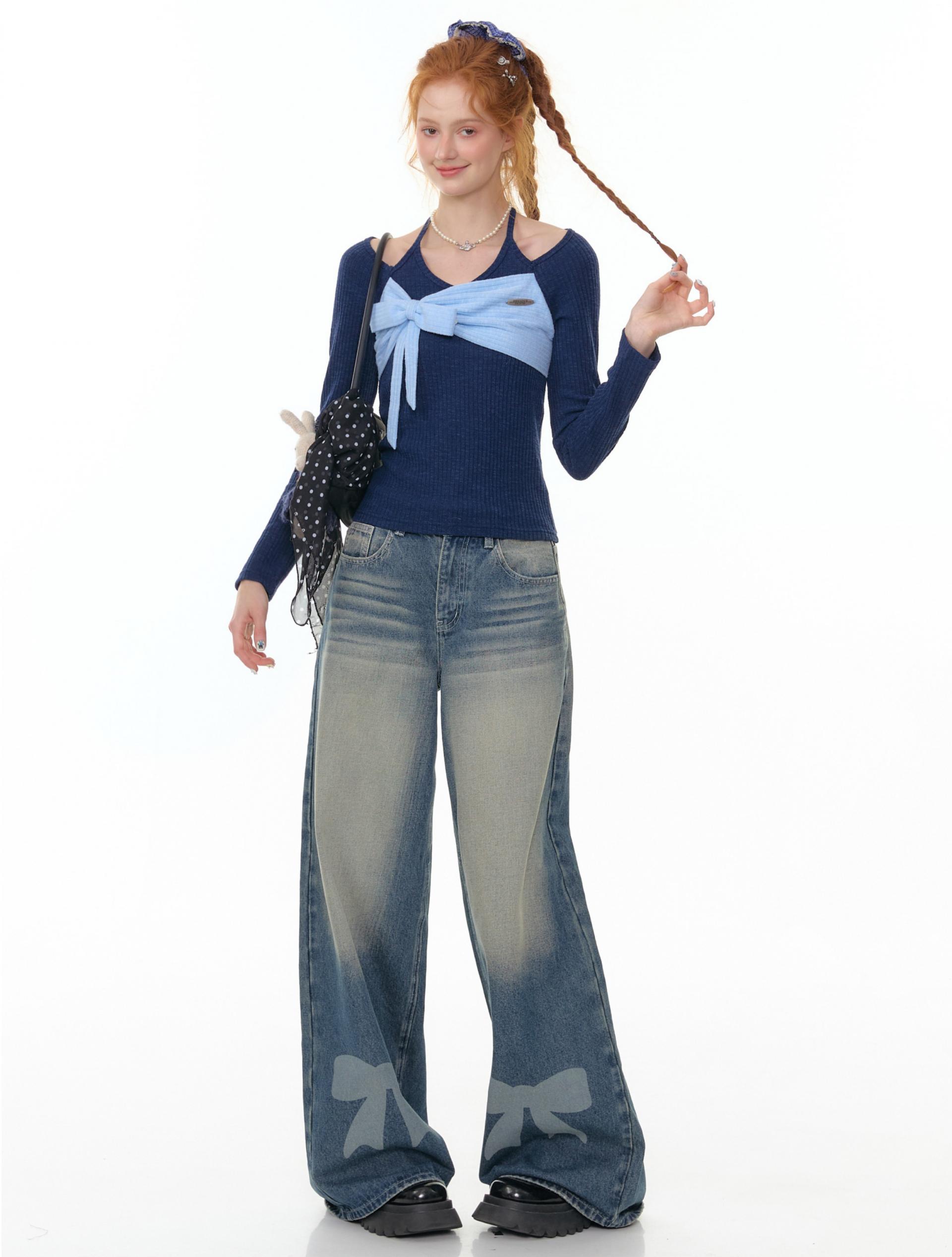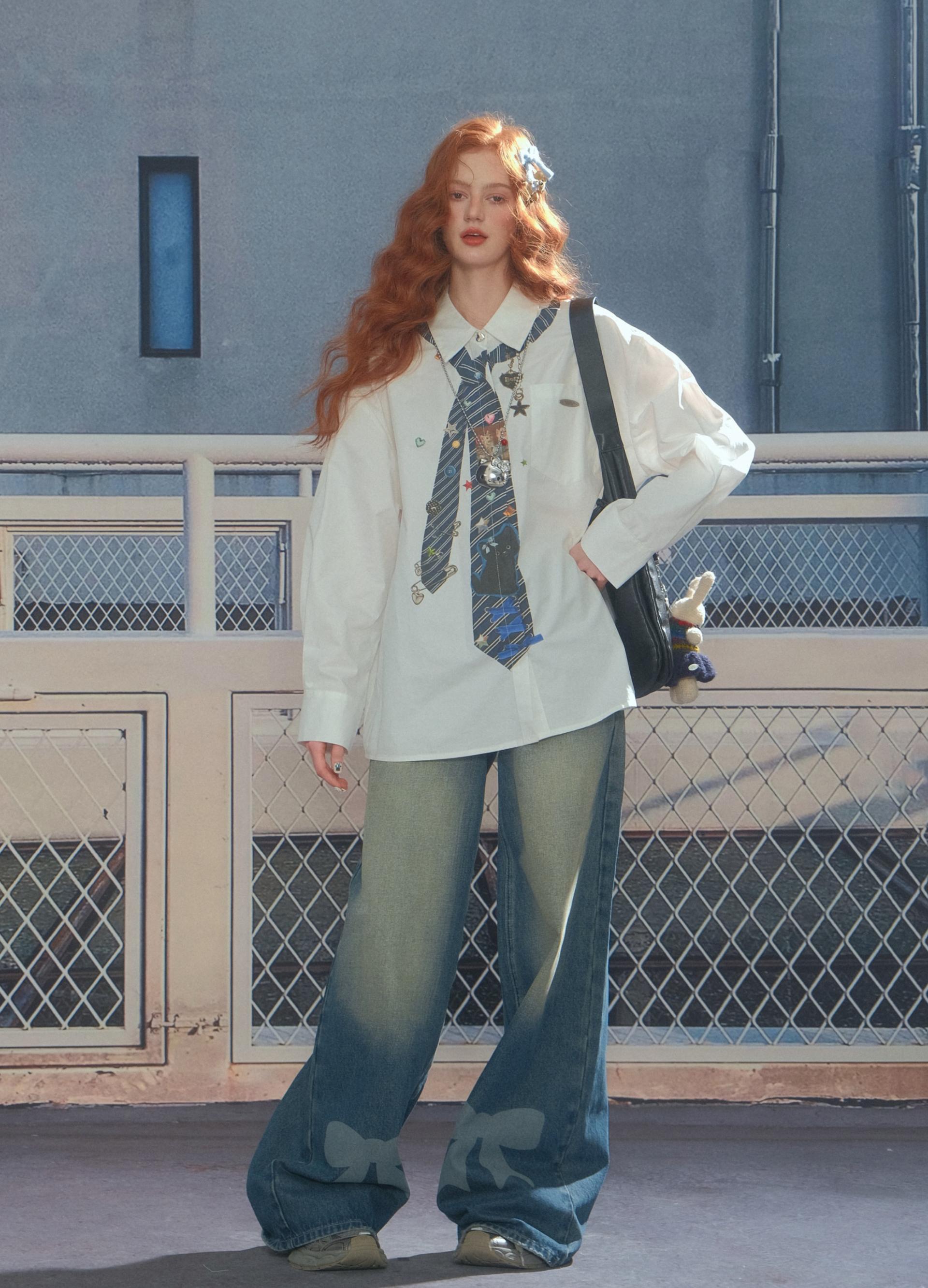 빈티지한 워싱감이 매력적인 와이드 핏 데님 팬츠로 밑단에 새겨진 리본 포인트가 러블리한 무드를 더해주며, 넉넉한 실루엣으로 편안한 착용감을 제공합니다. 스트리트 감성과 키치한 감각을 동시에 살릴 수 있는 스타일링 아이템으로 추천드립니다.