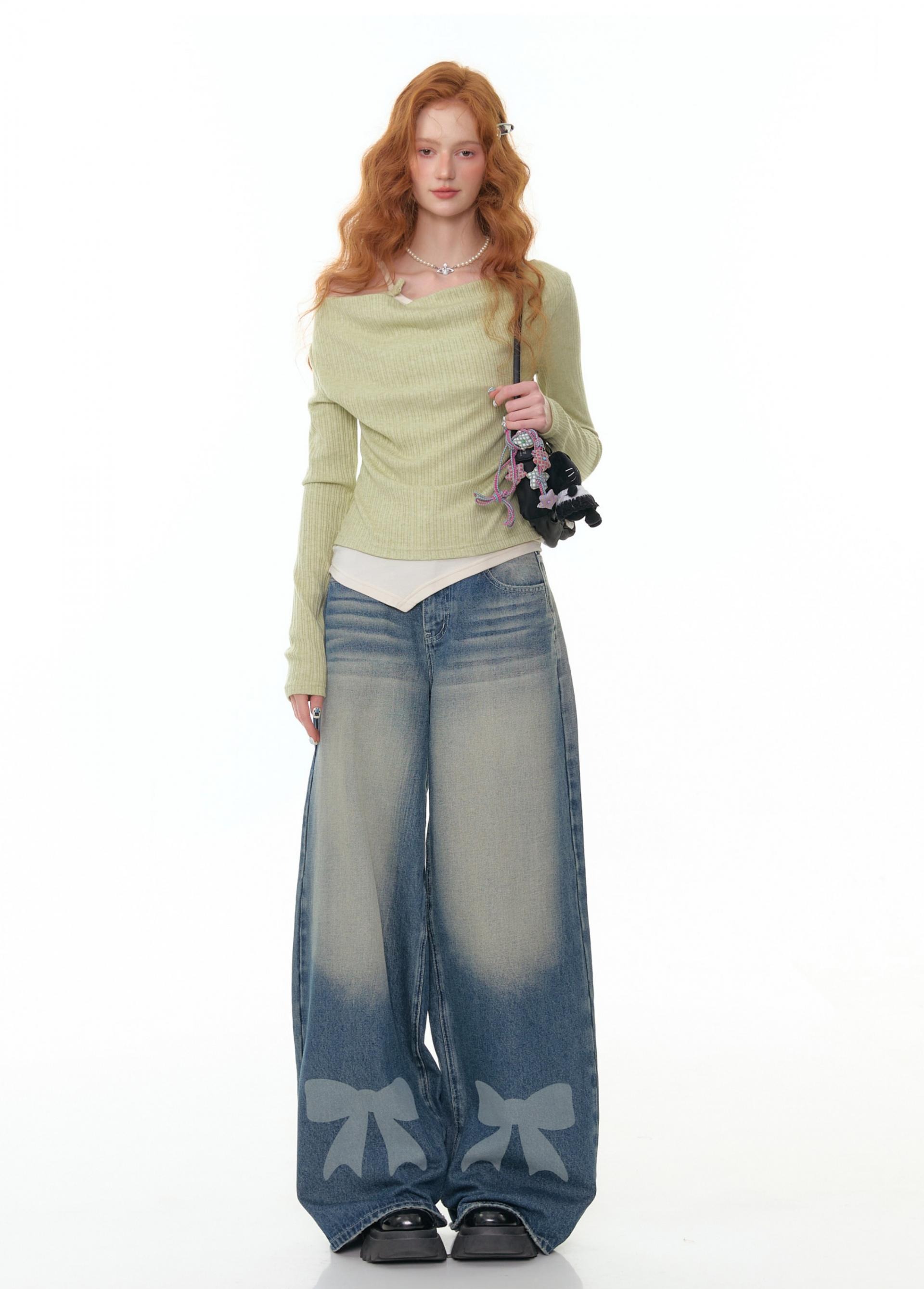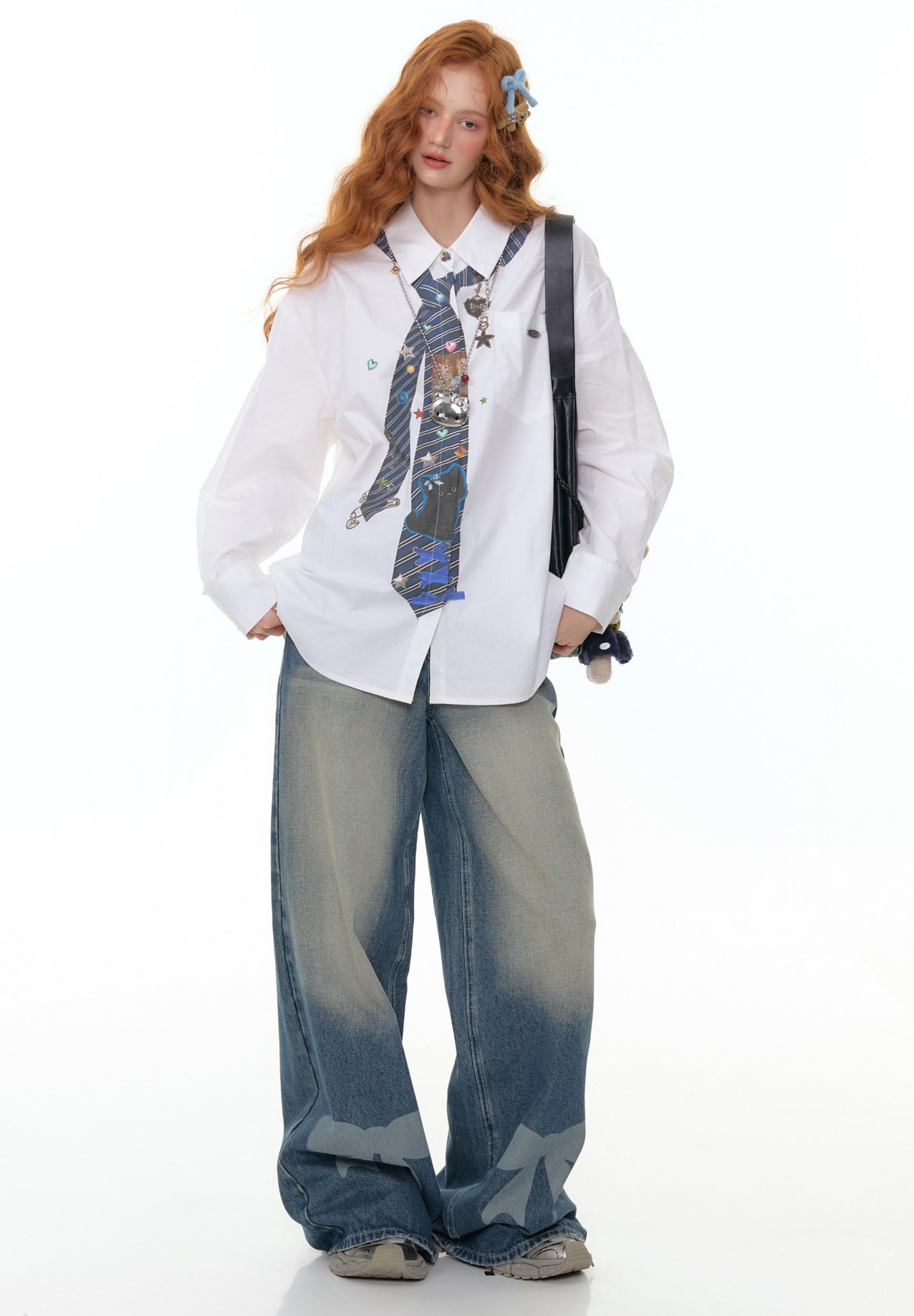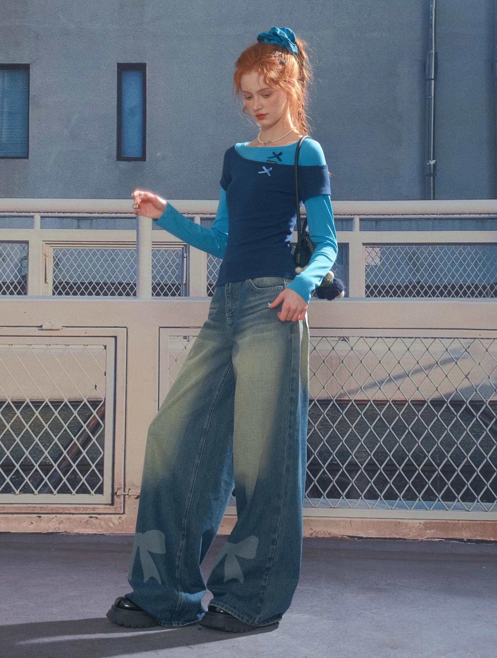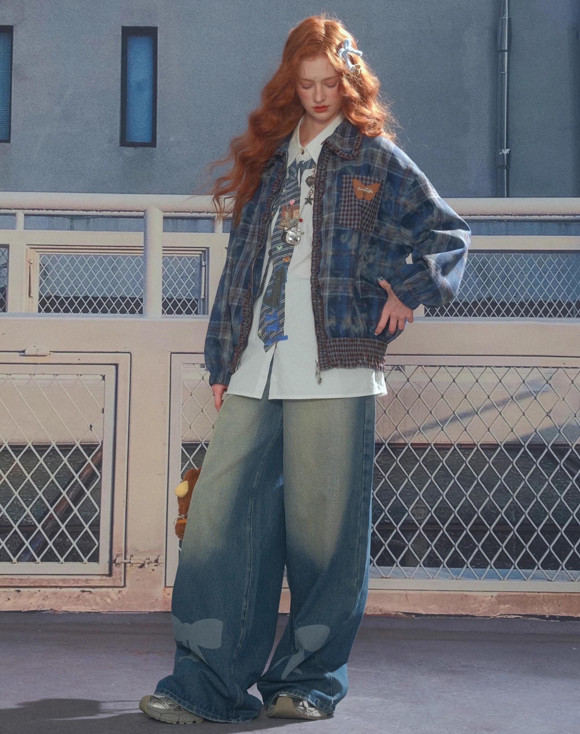 빈티지한 워싱감이 매력적인 와이드 핏 데님 팬츠로 밑단에 새겨진 리본 포인트가 러블리한 무드를 더해주며, 넉넉한 실루엣으로 편안한 착용감을 제공합니다. 스트리트 감성과 키치한 감각을 동시에 살릴 수 있는 스타일링 아이템으로 추천드립니다.