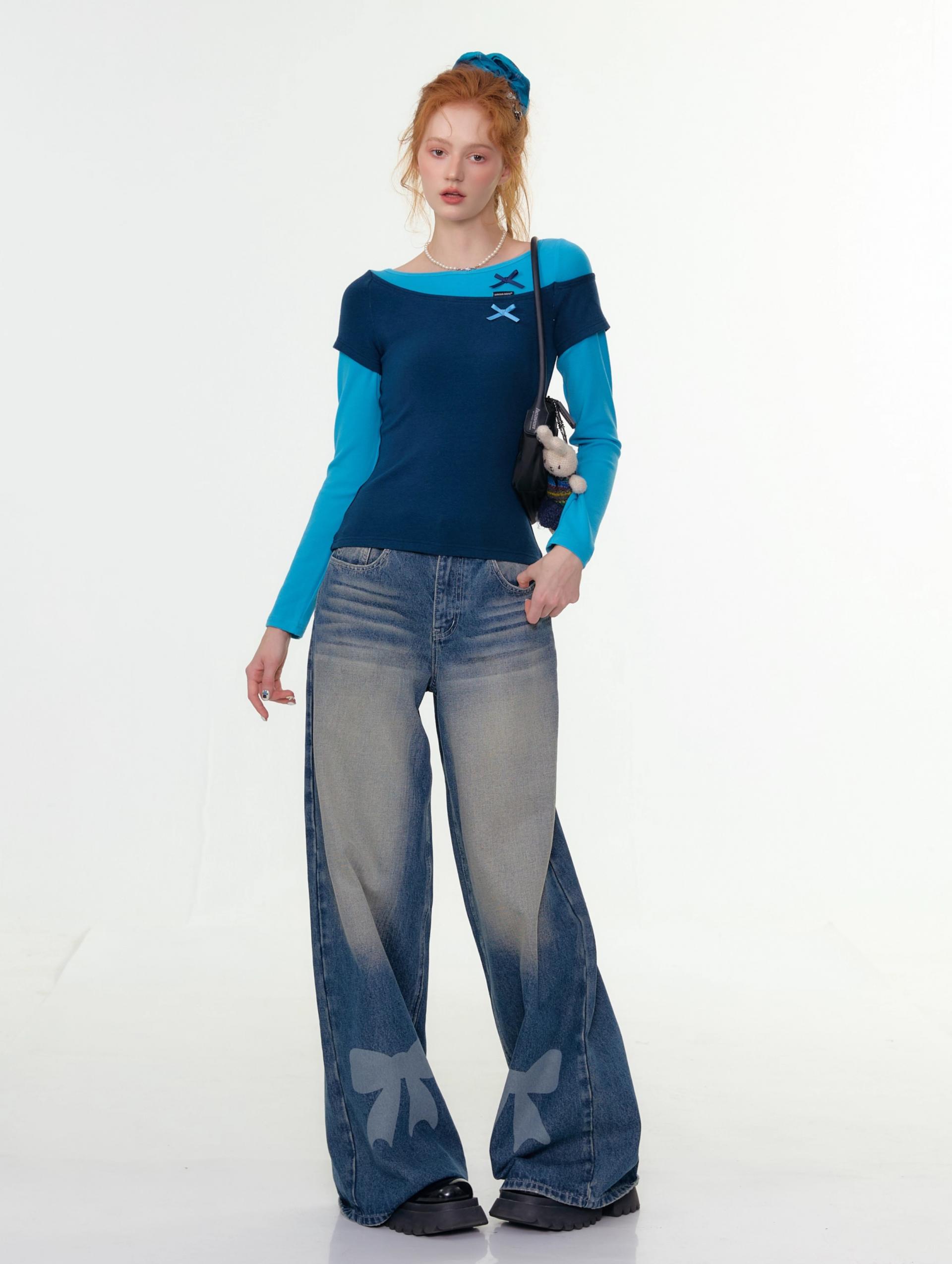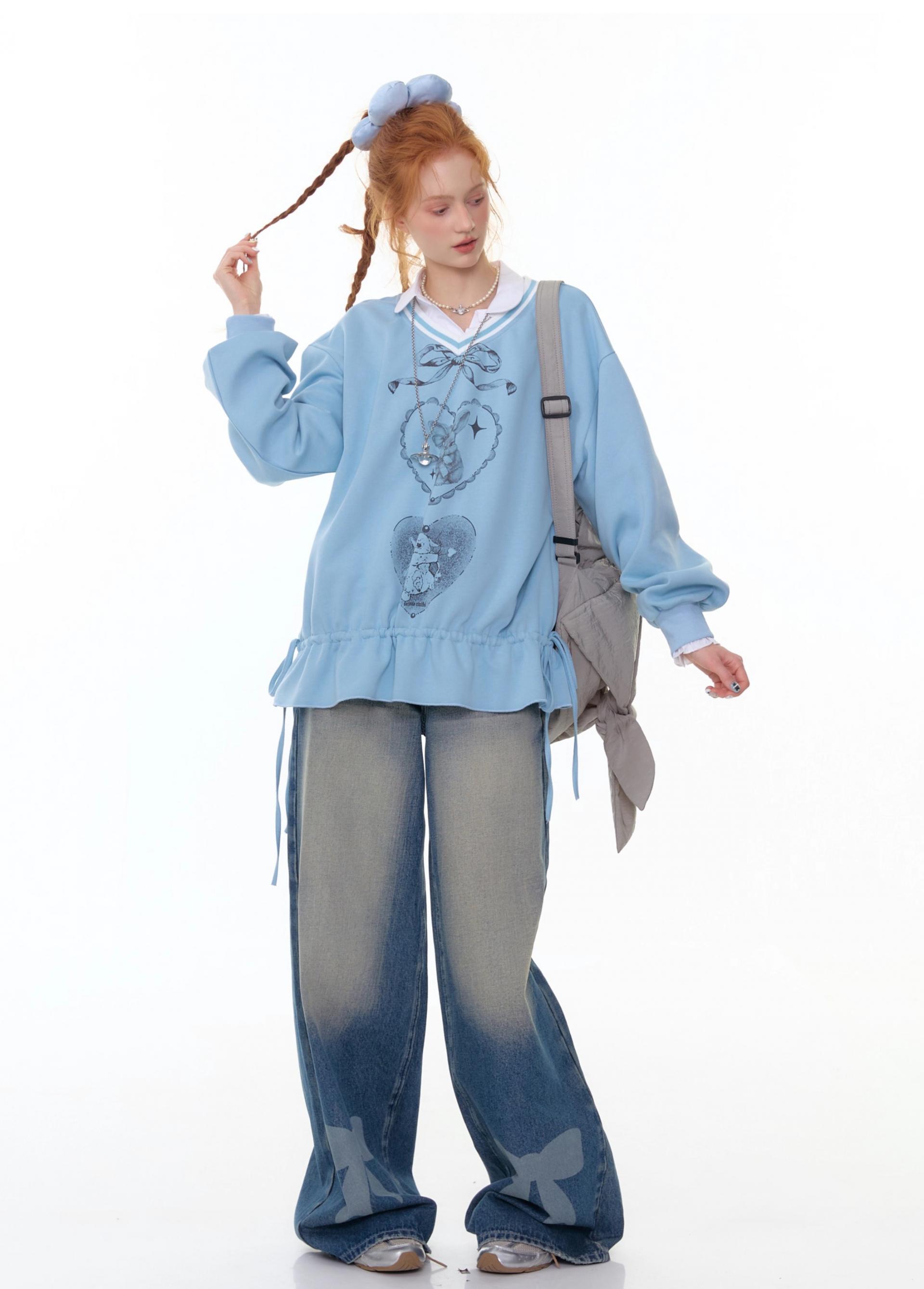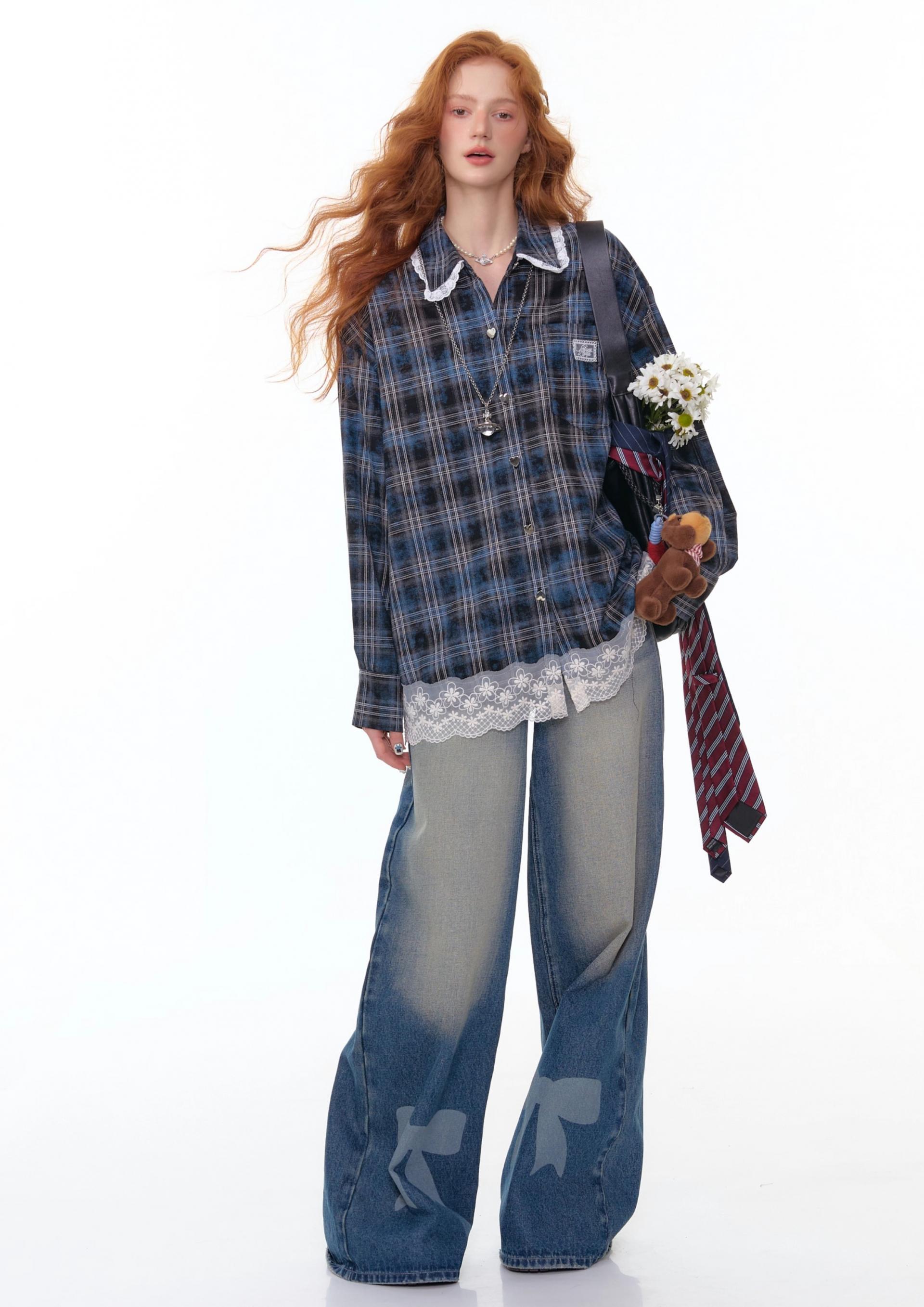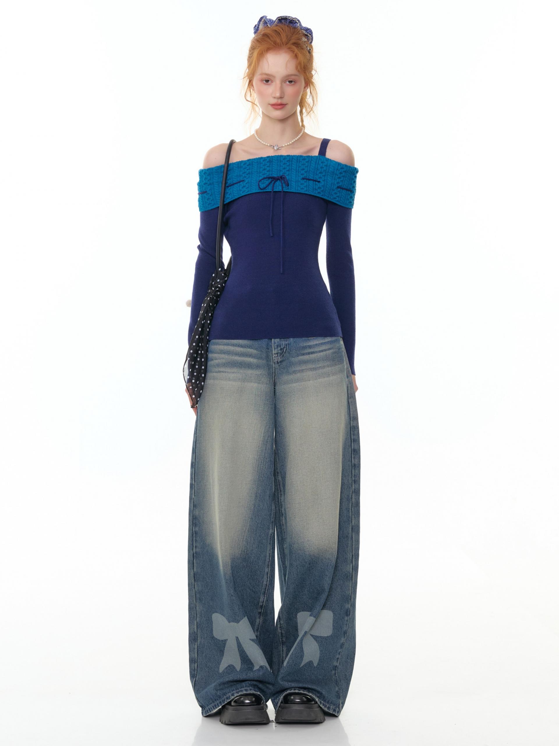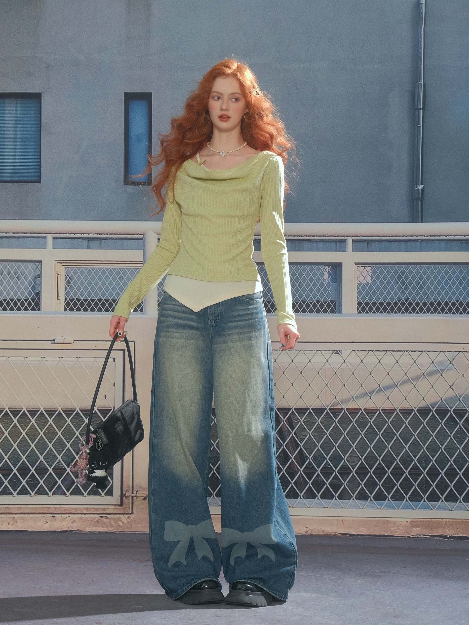 빈티지한 워싱감이 매력적인 와이드 핏 데님 팬츠로 밑단에 새겨진 리본 포인트가 러블리한 무드를 더해주며, 넉넉한 실루엣으로 편안한 착용감을 제공합니다. 스트리트 감성과 키치한 감각을 동시에 살릴 수 있는 스타일링 아이템으로 추천드립니다.