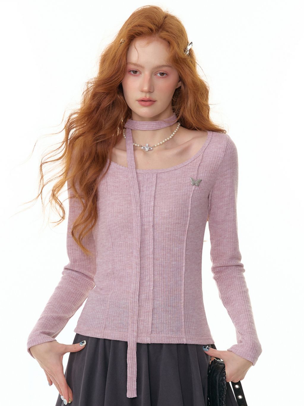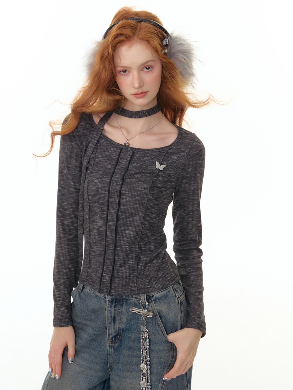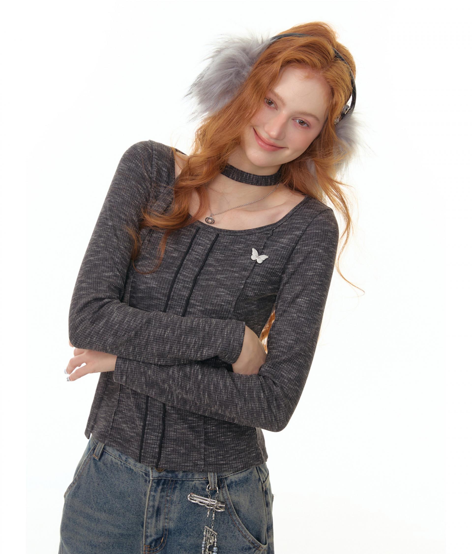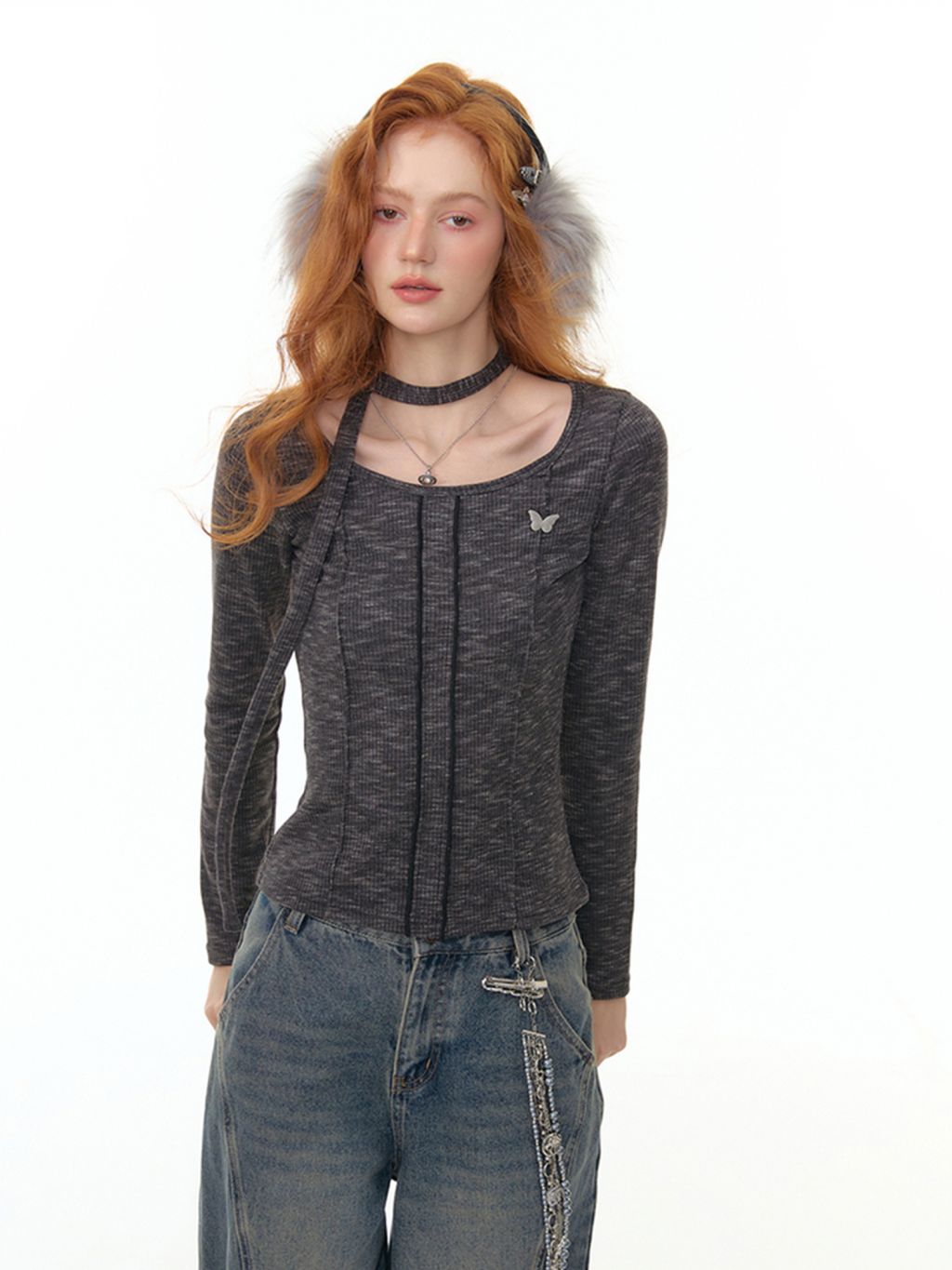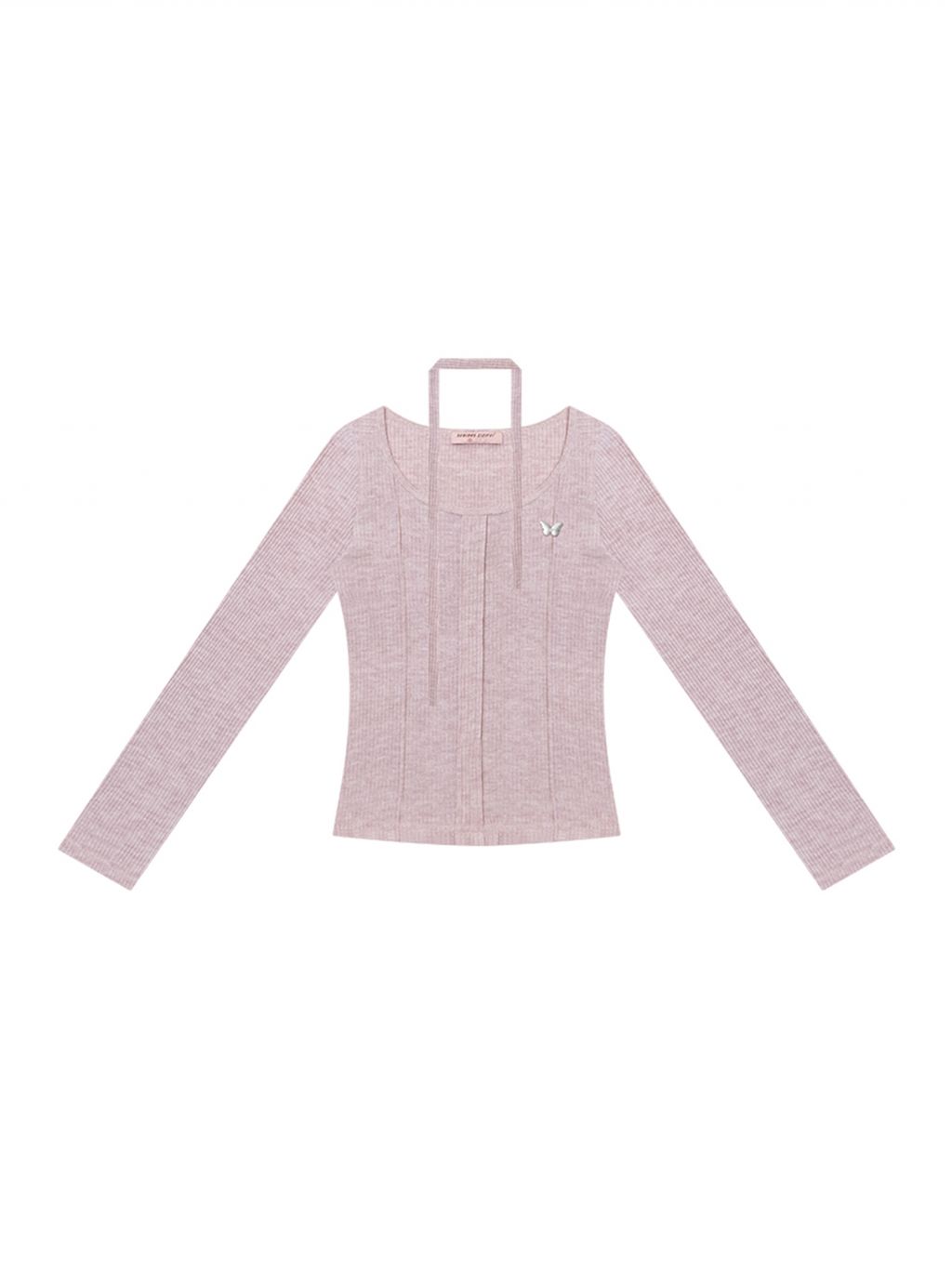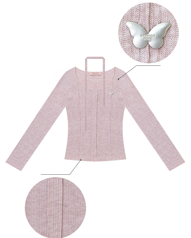 넥라인과 연결된 초커 스트랩 디테일이 포인트인 니트 톱입니다. 바디 라인을 따라 슬림하게 떨어지는 핏으로 여성스러운 실루엣을 강조하며 버터플라이 메탈 장식이 더해져 세련된 무드를 완성합니다.