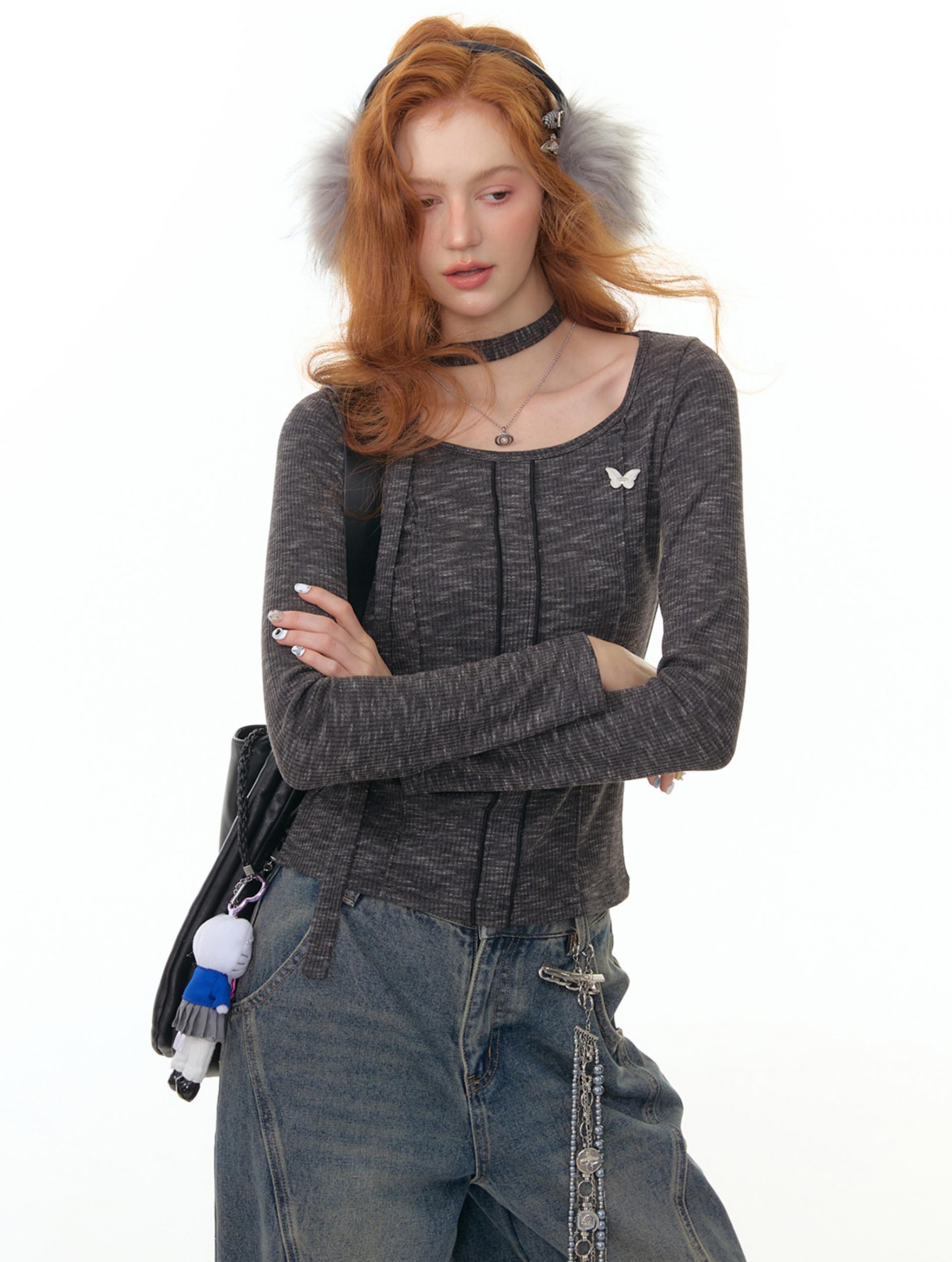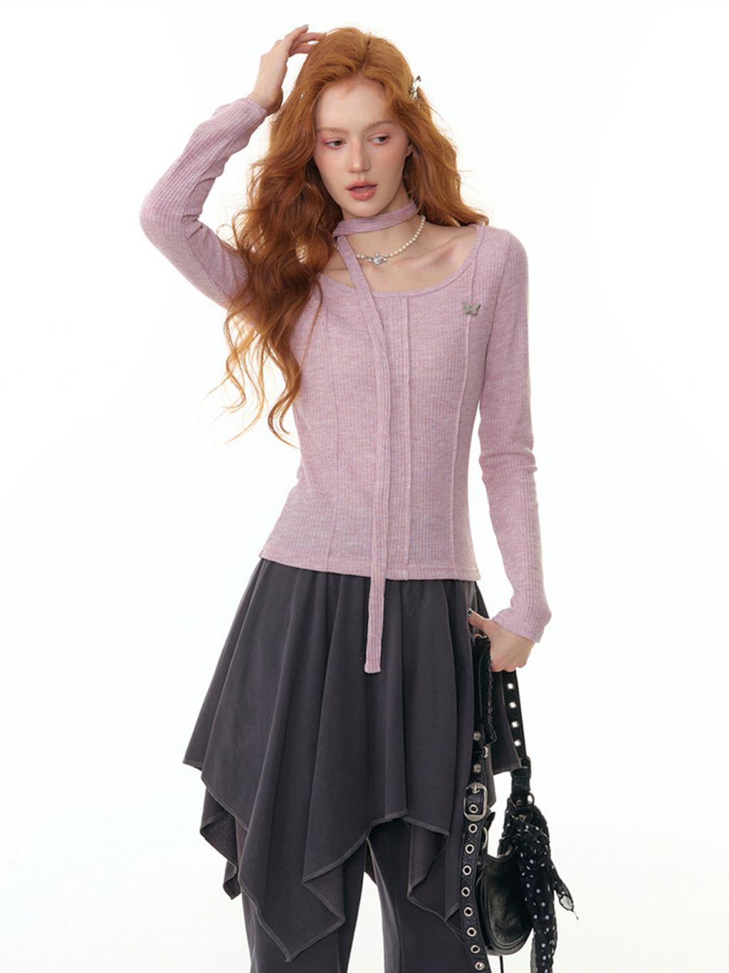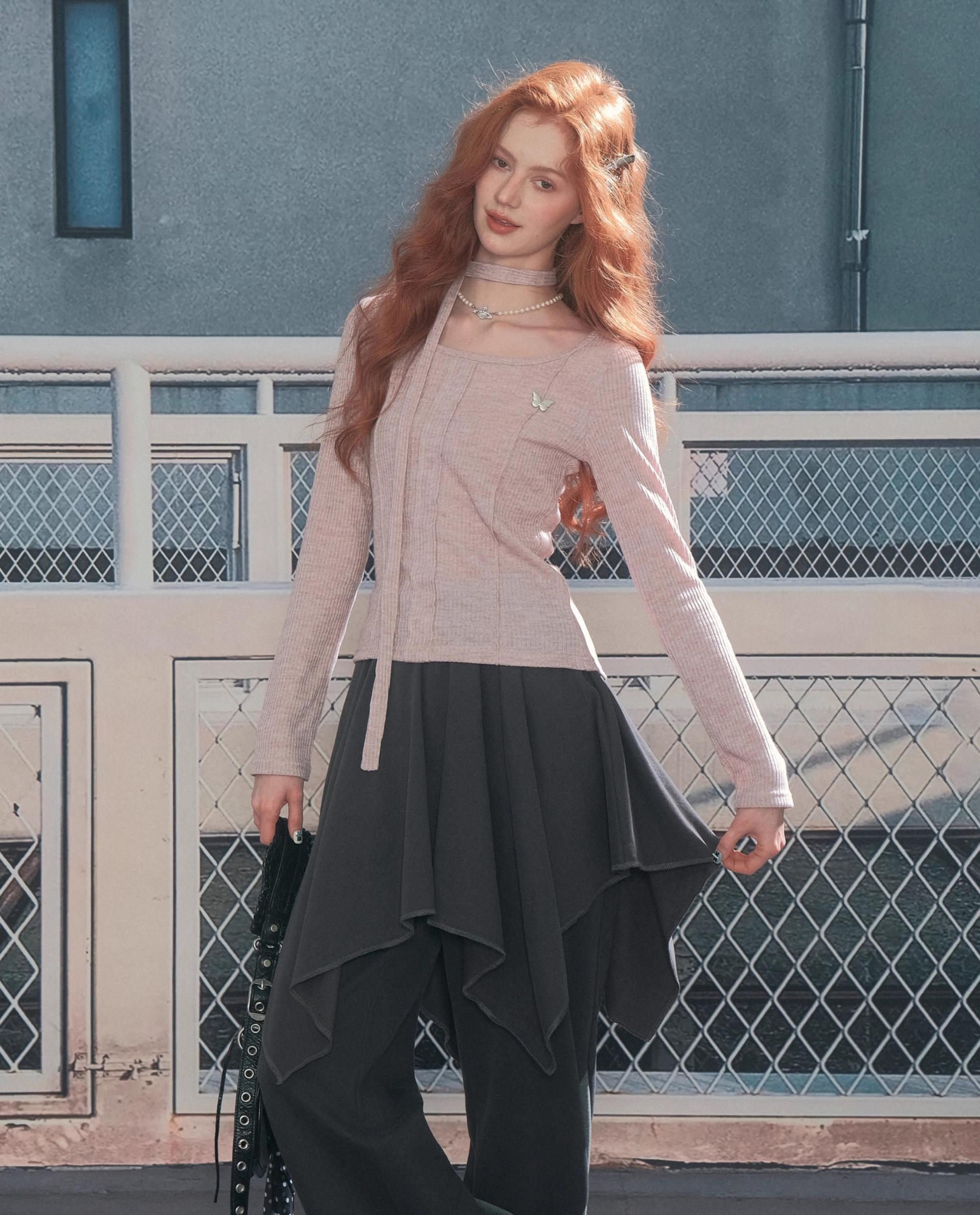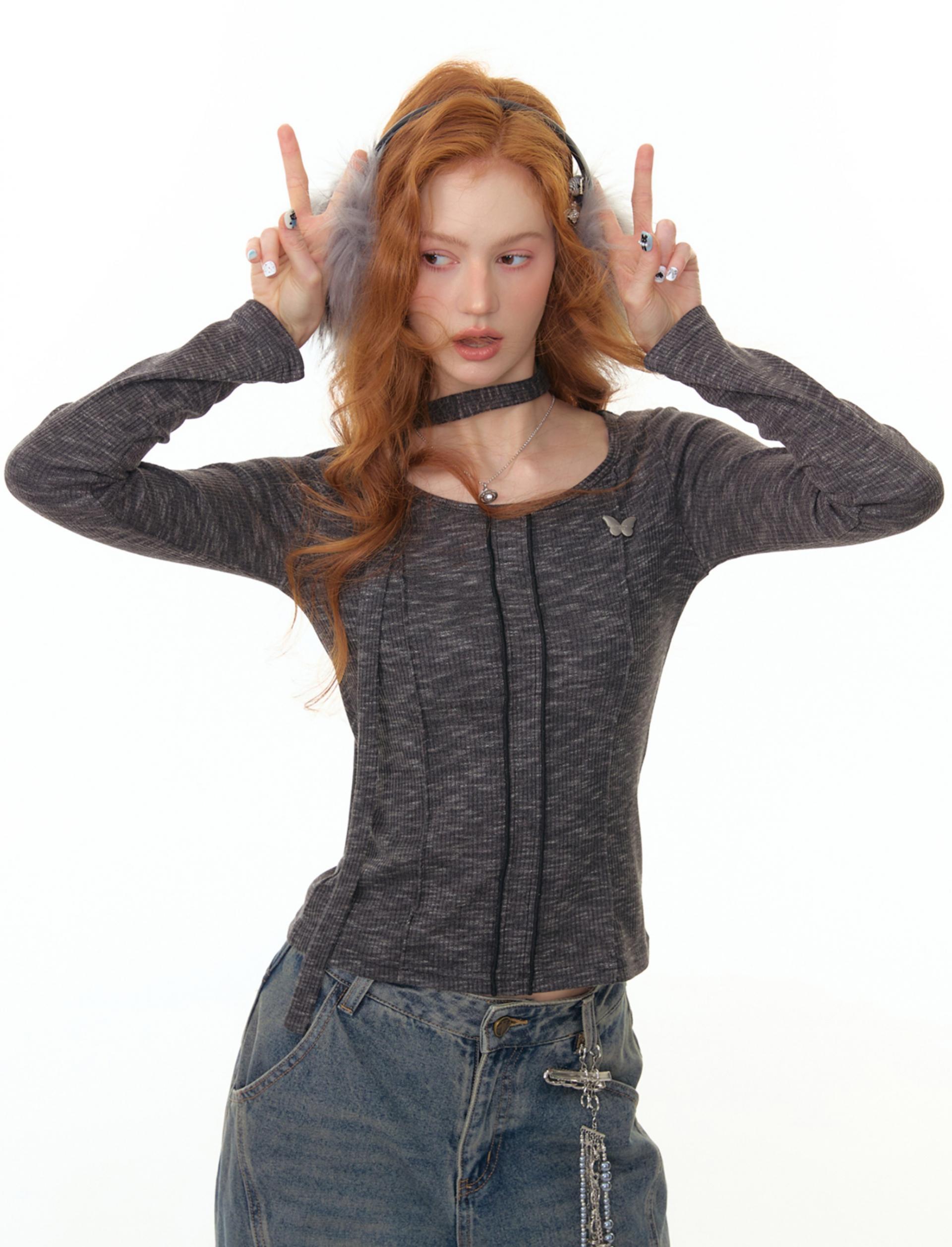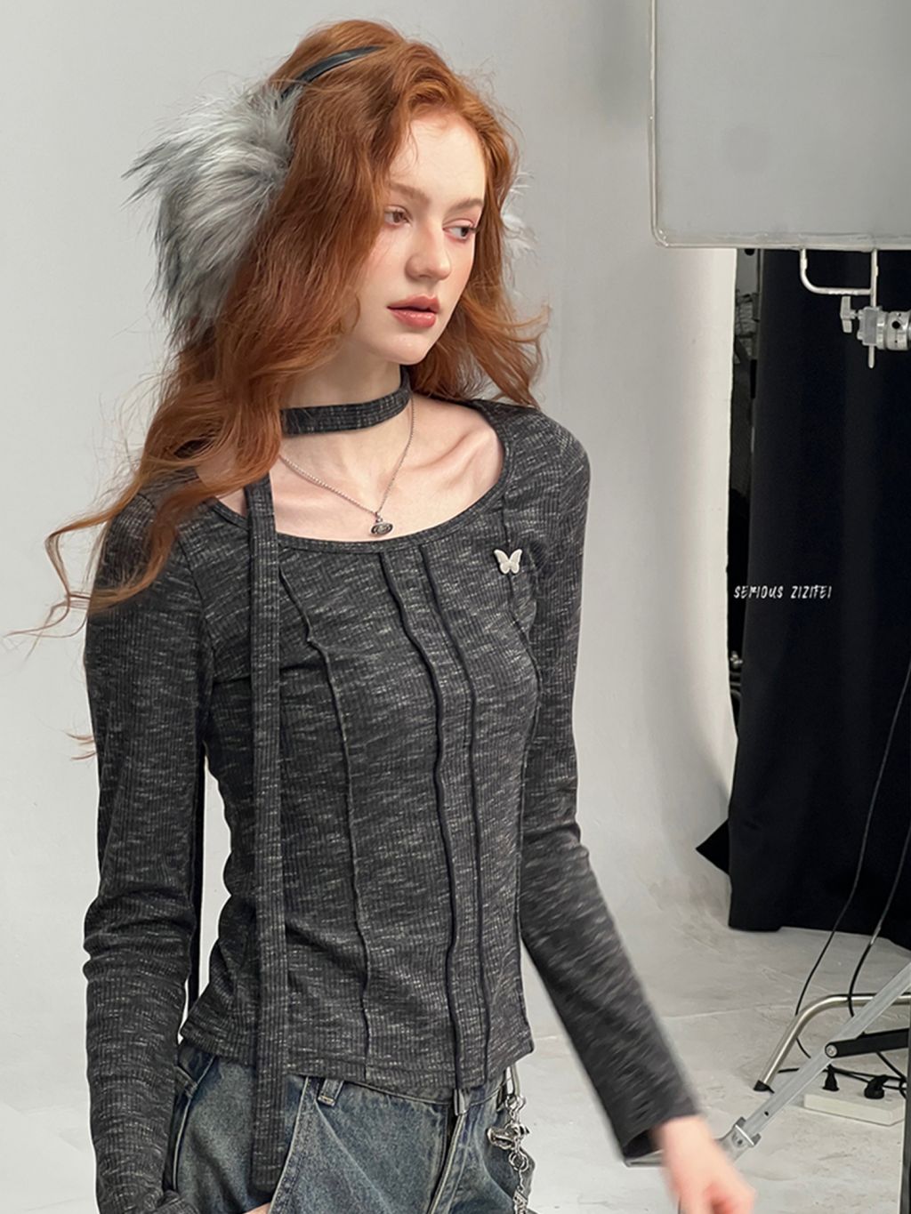 넥라인과 연결된 초커 스트랩 디테일이 포인트인 니트 톱입니다. 바디 라인을 따라 슬림하게 떨어지는 핏으로 여성스러운 실루엣을 강조하며 버터플라이 메탈 장식이 더해져 세련된 무드를 완성합니다.