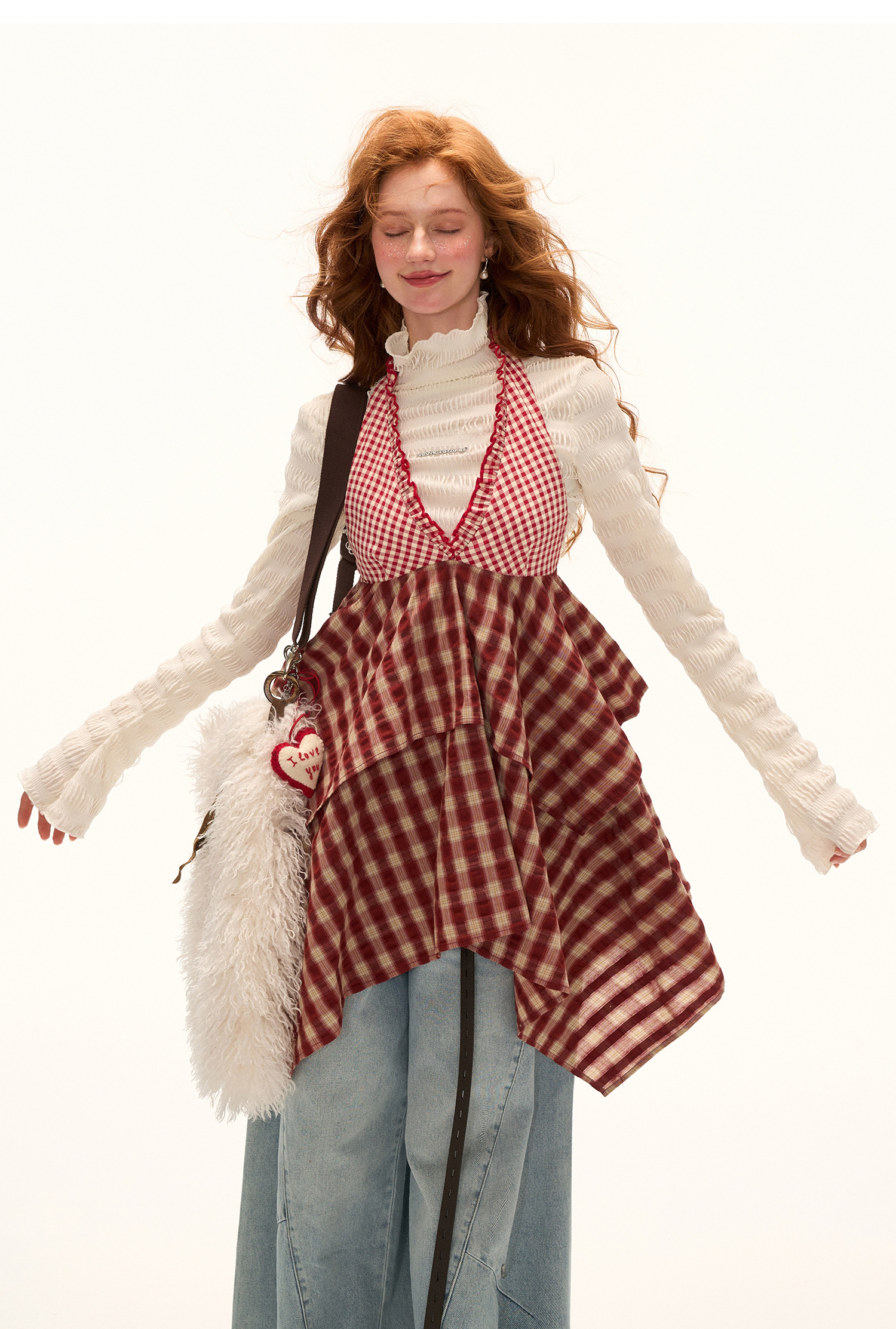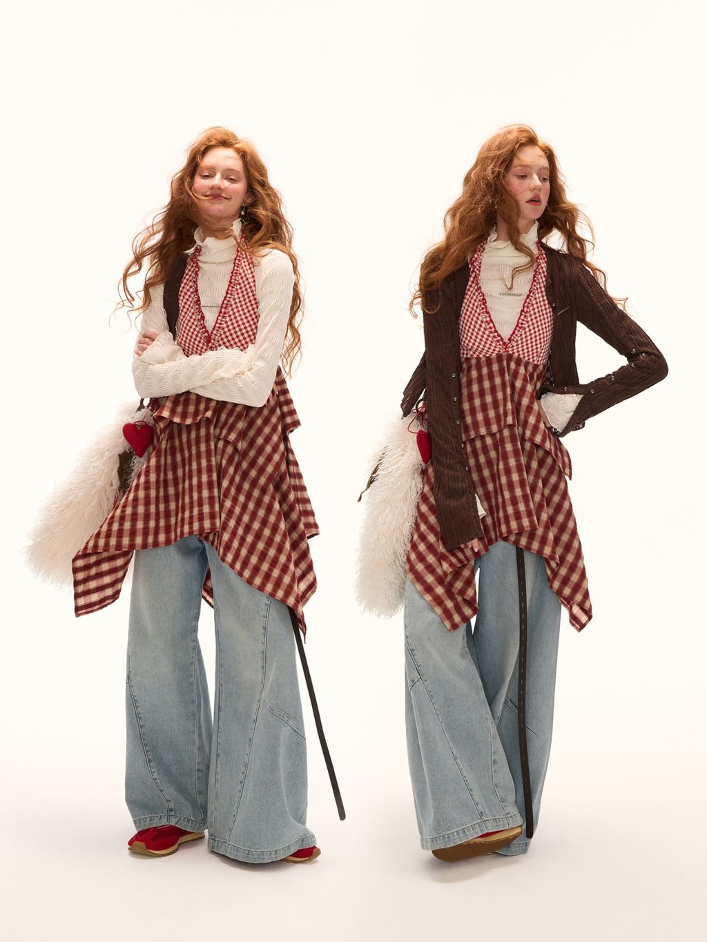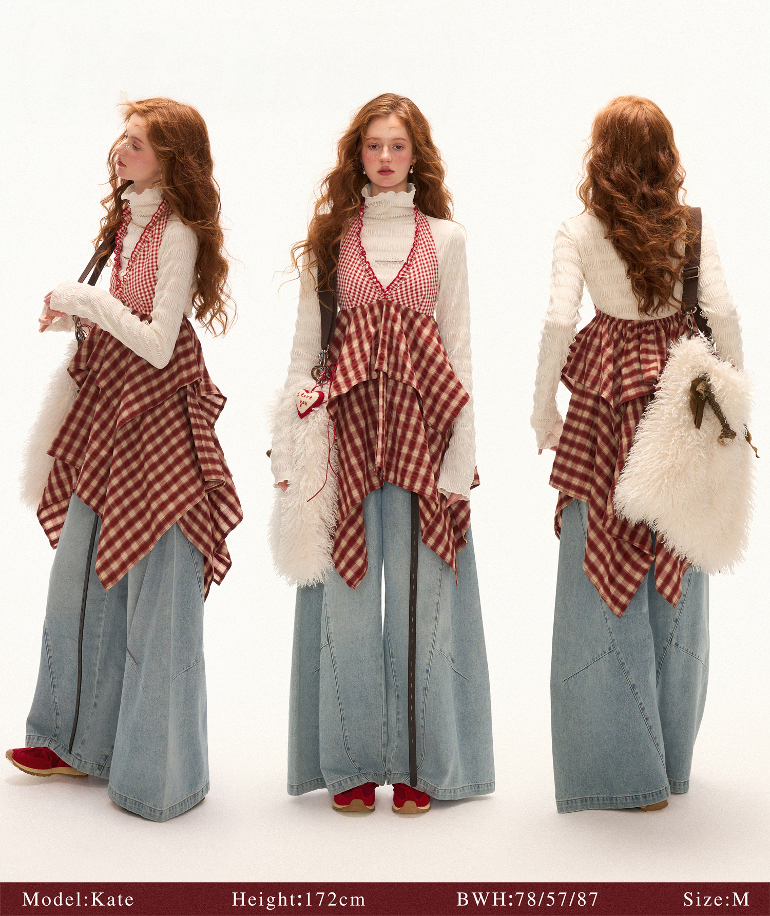 - 레드 톤 체크 패턴으로 빈티지하면서도 경쾌한 무드 연출