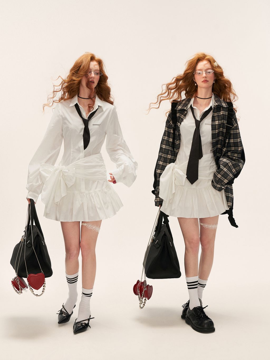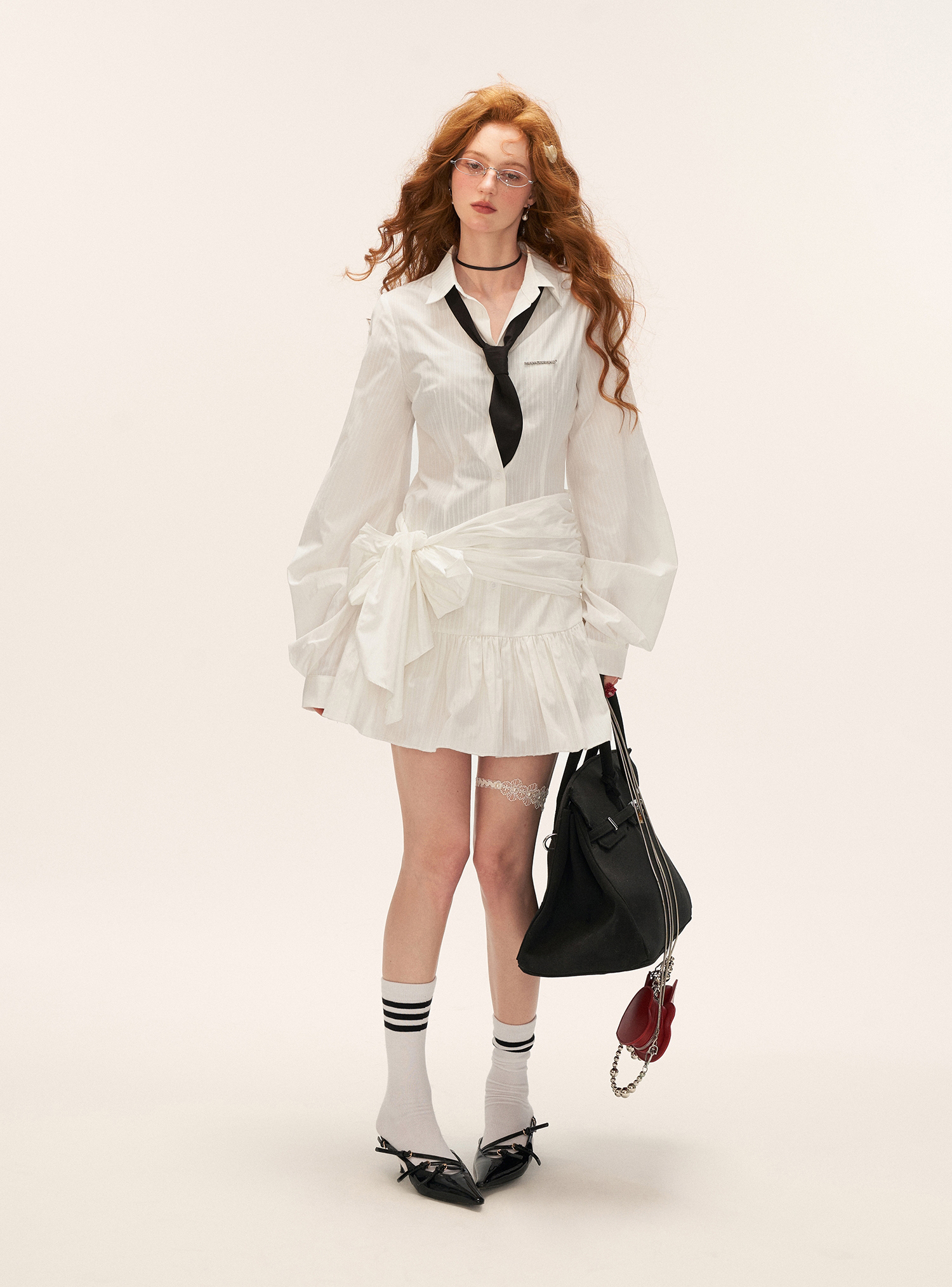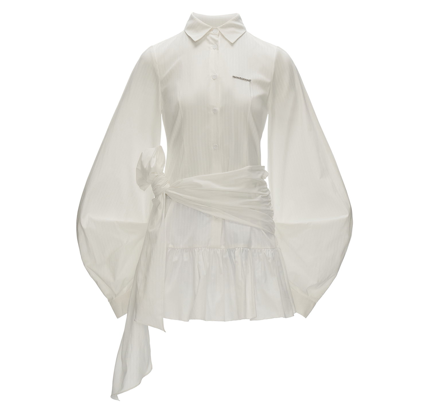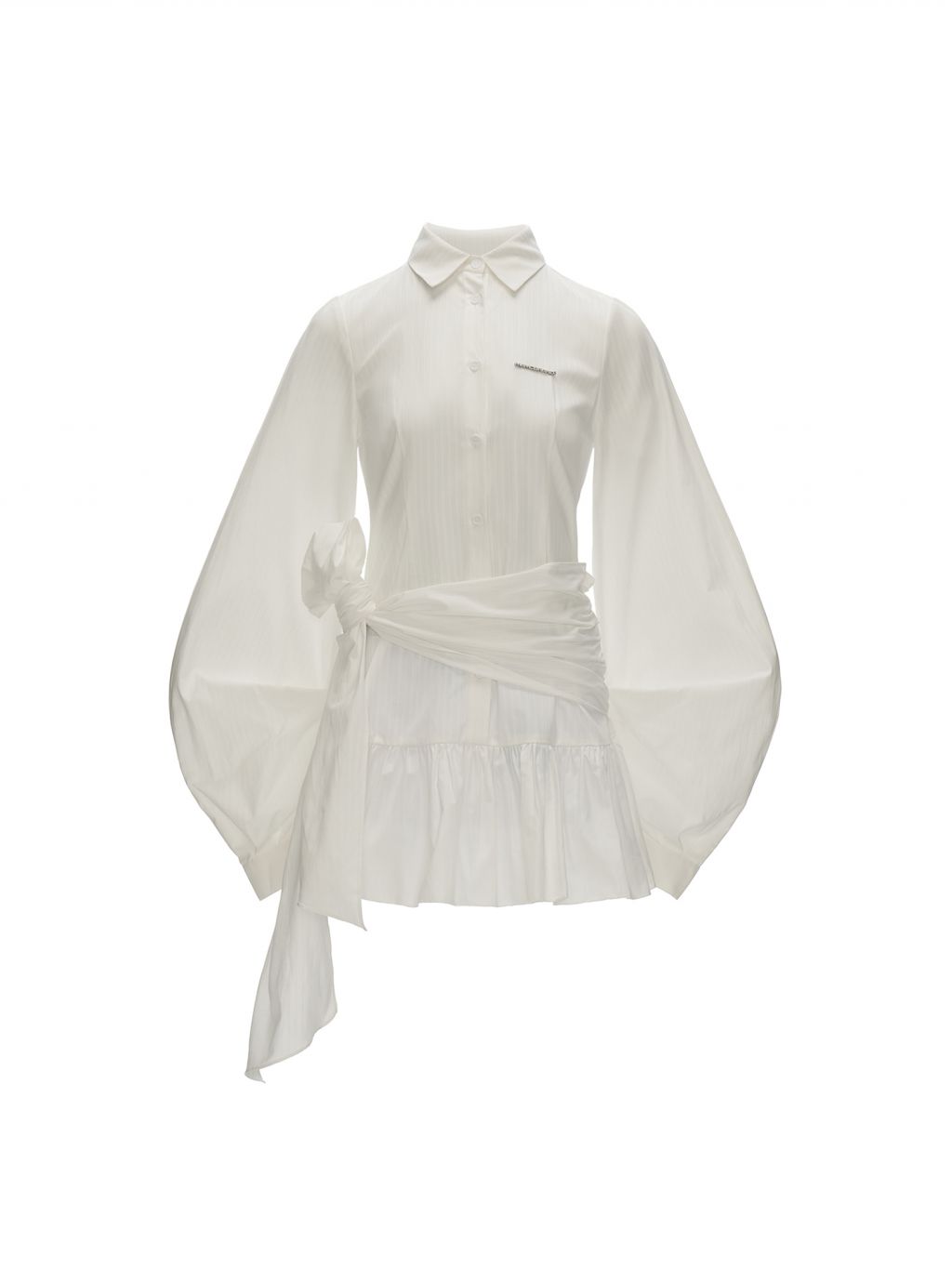 벌룬 소매와 허리의 트위스트 타이 디테일이 돋보이는 셔츠 드레스로 포멀함과 발랄한 무드를 동시에 담아낸 아이템입니다.