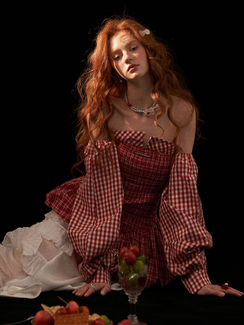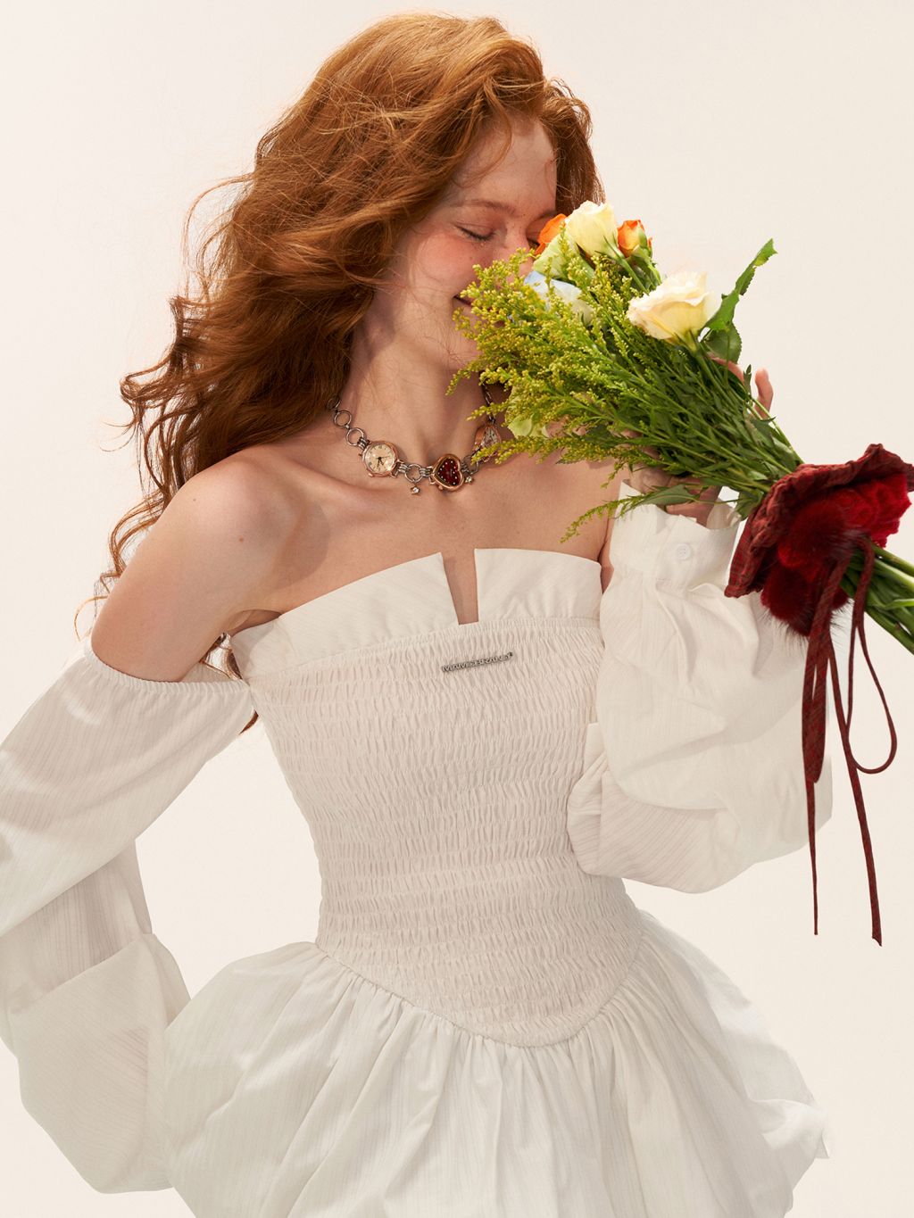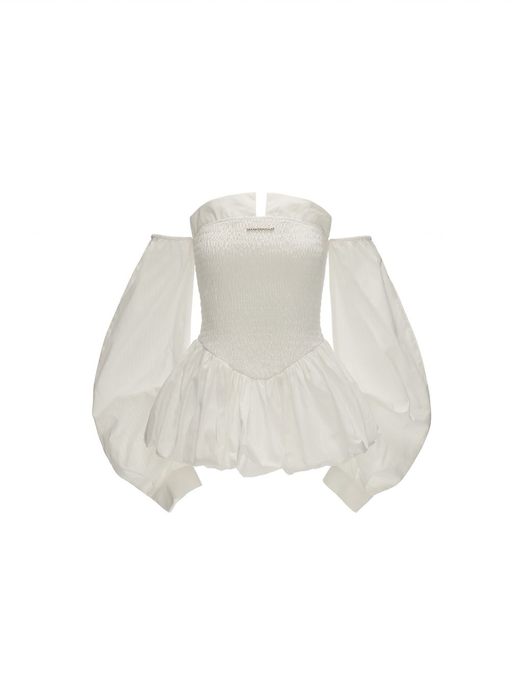 스모킹 디테일과 오프숄더 디자인이 돋보이는 블라우스로, 볼륨감 있는 슬리브와 페플럼 실루엣이 여성스럽고 개성 있는 무드를 완성합니다.