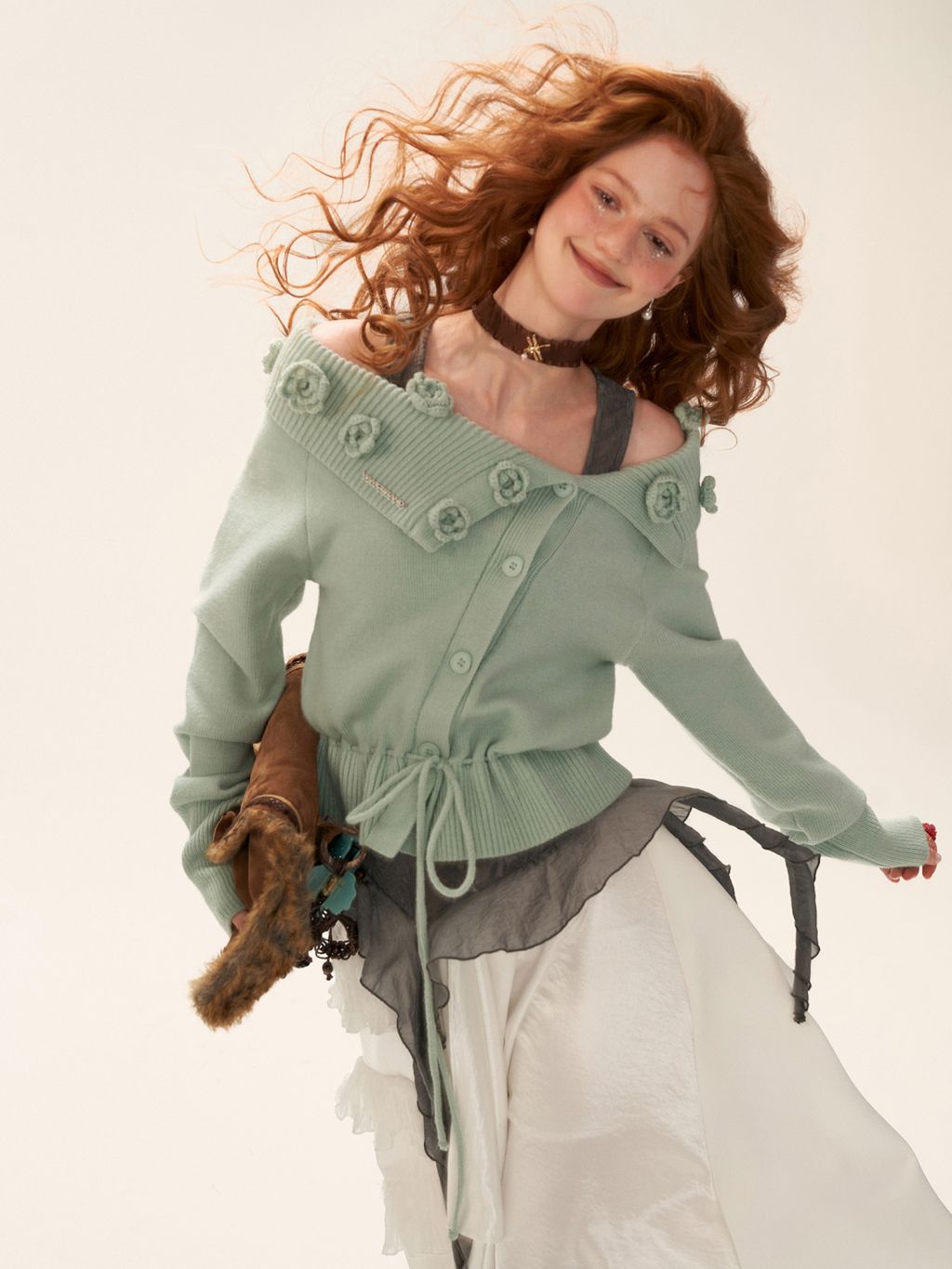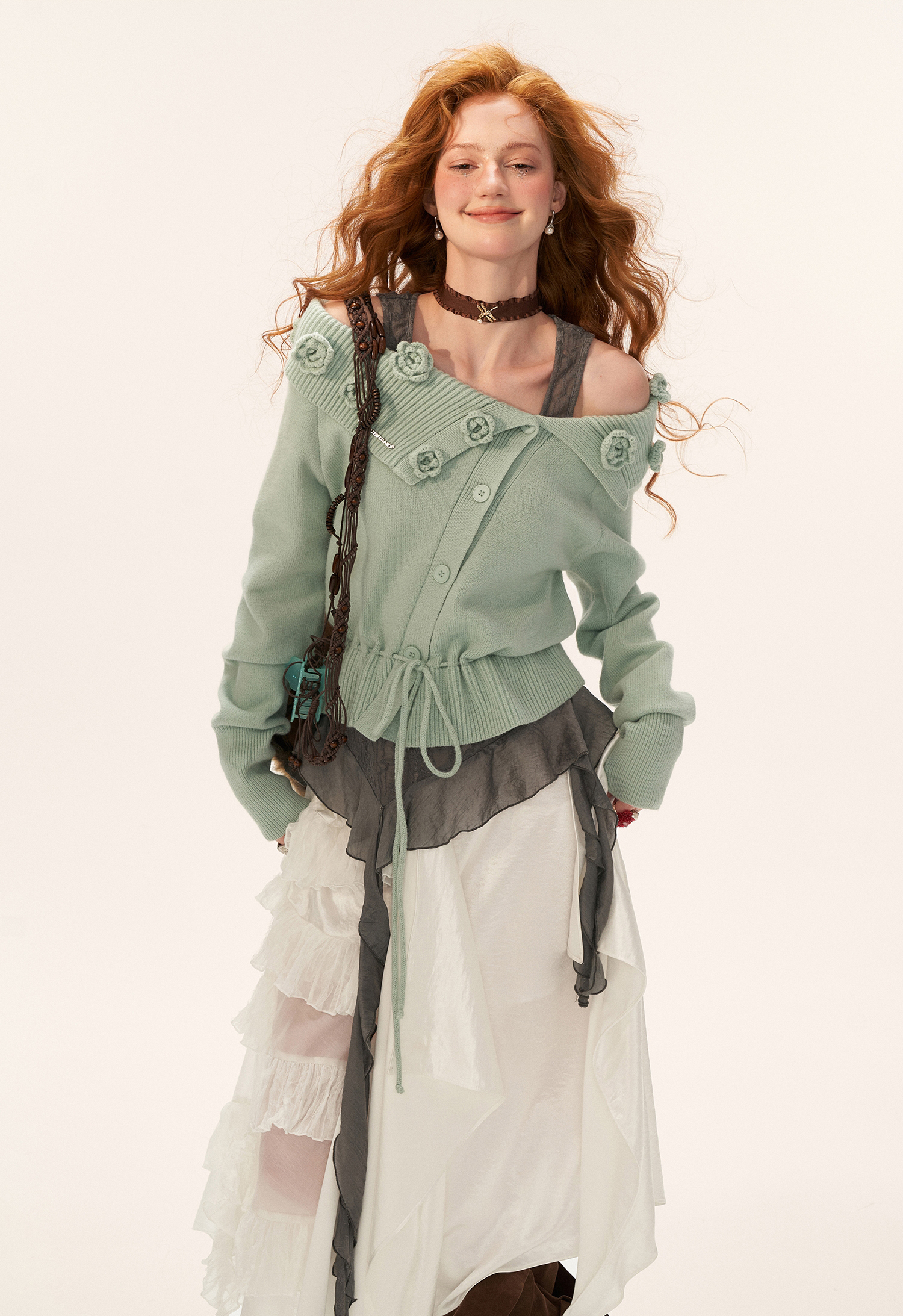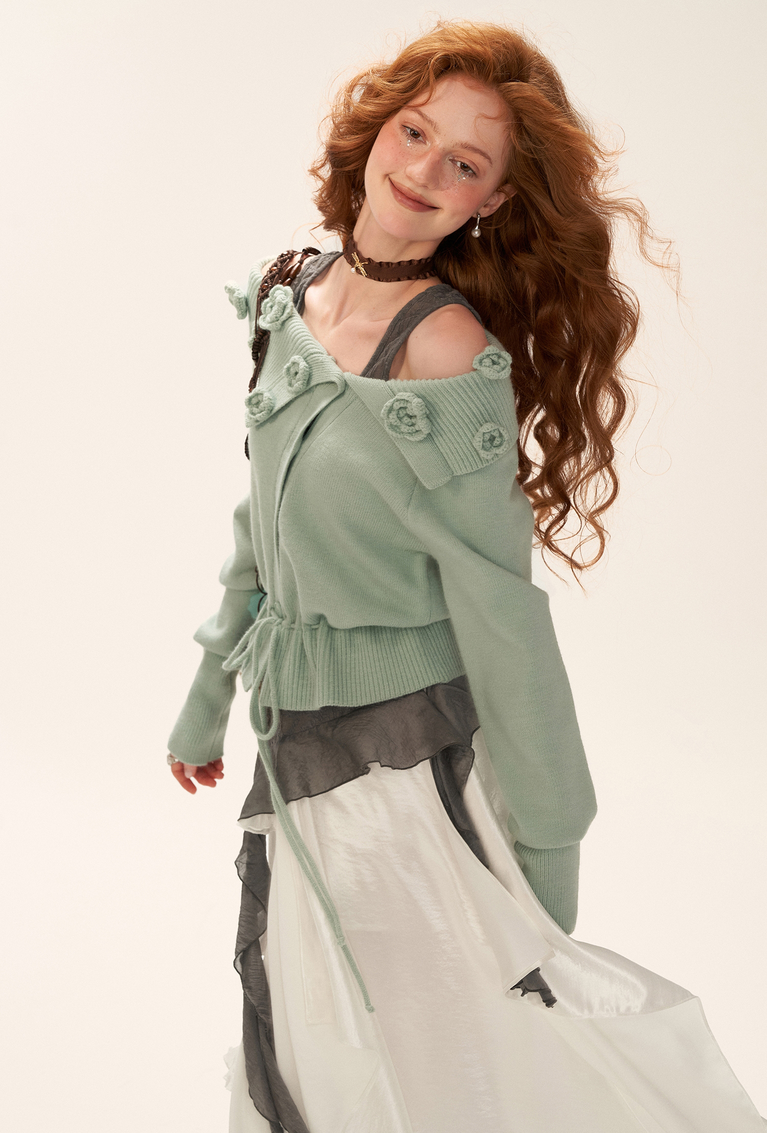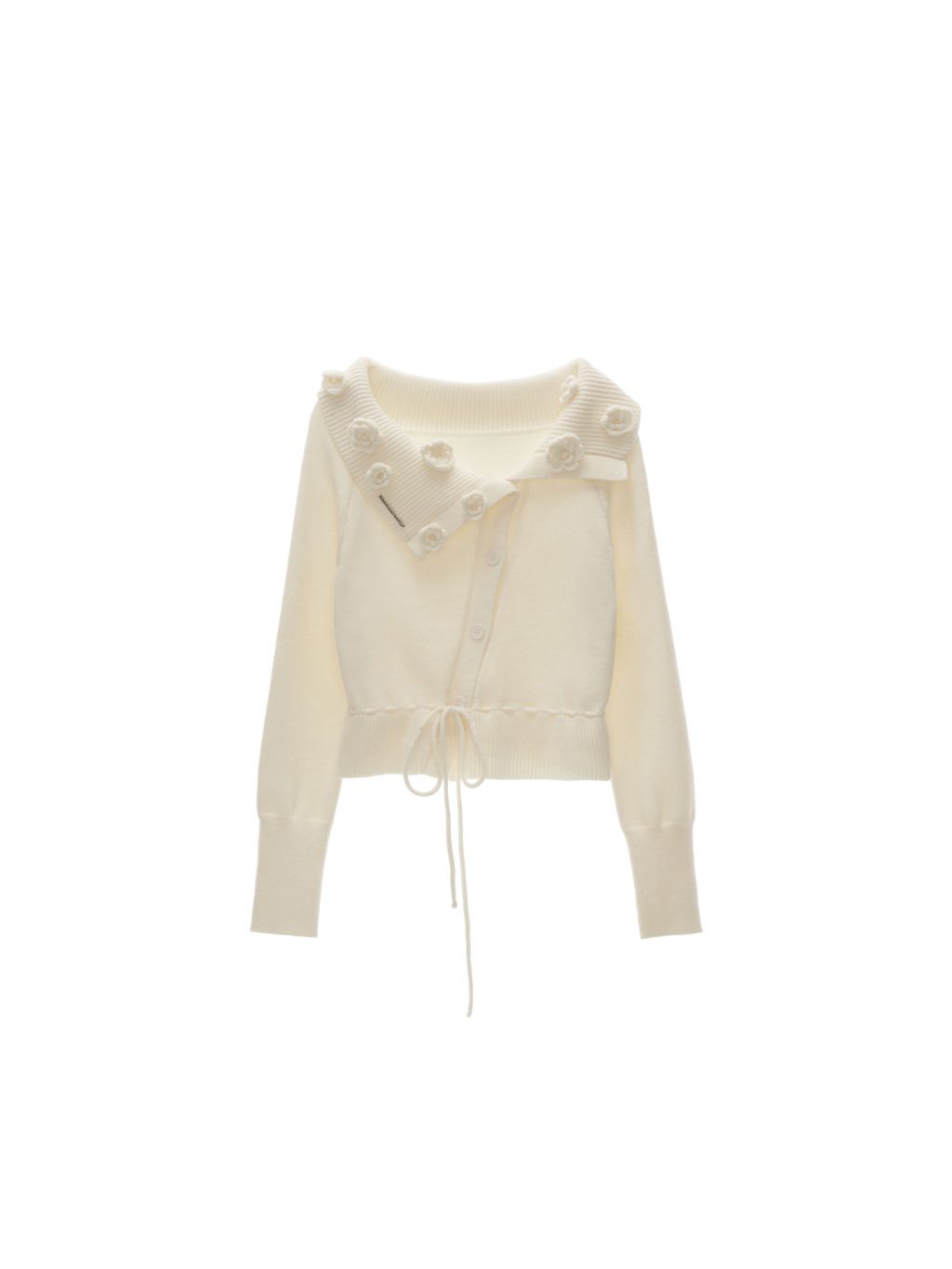 꽃잎처럼 흩어진 로즈 니팅 디테일로 포인트를 준, 로맨틱한 무드의 드로스트링 가디건입니다.