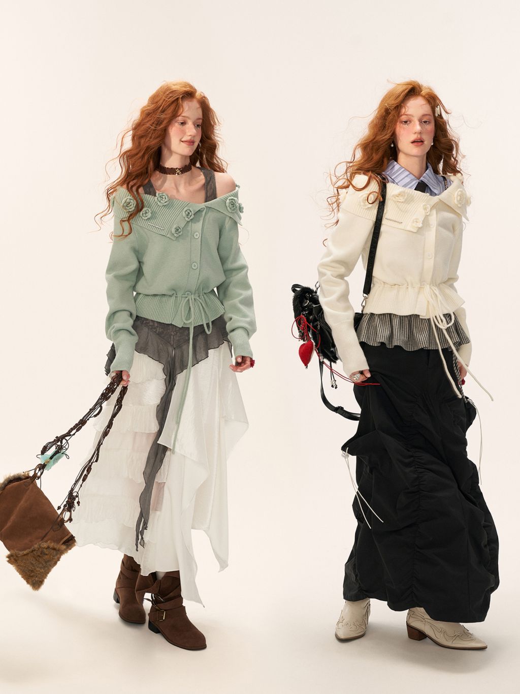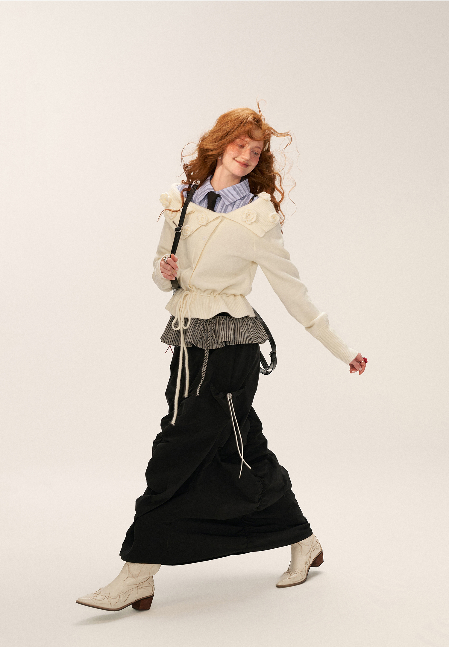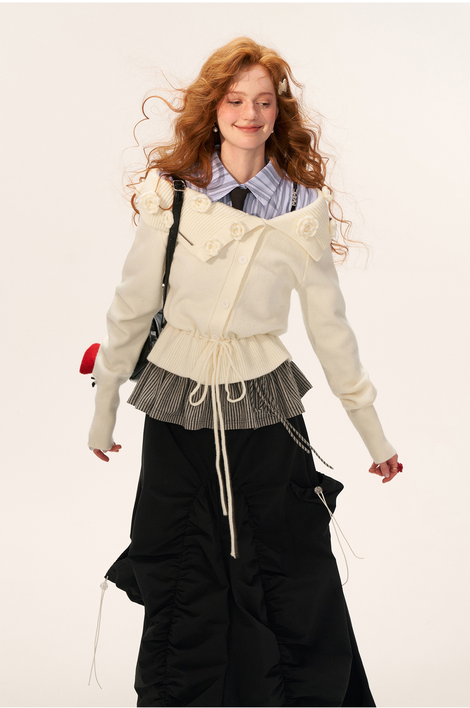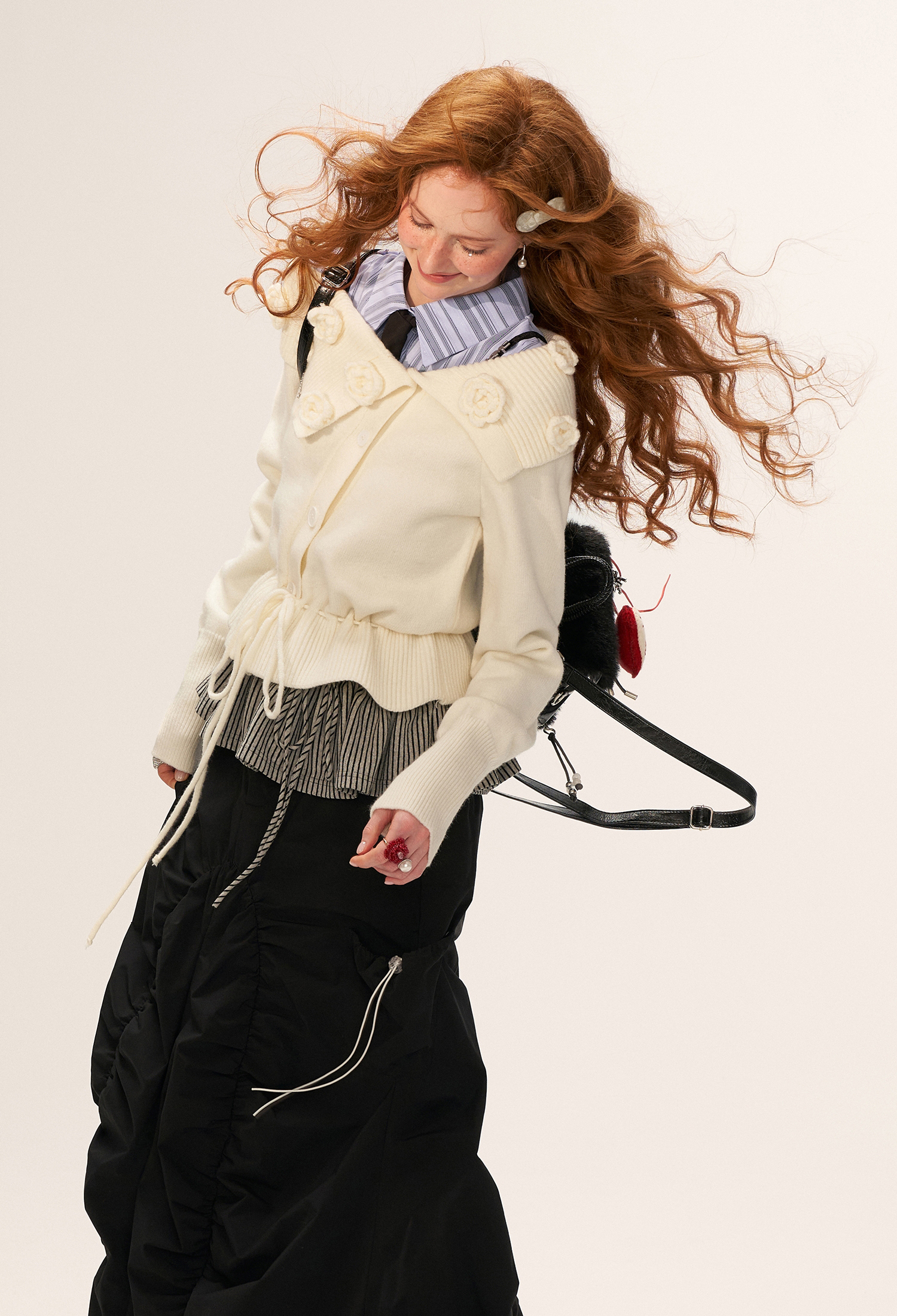 꽃잎처럼 흩어진 로즈 니팅 디테일로 포인트를 준, 로맨틱한 무드의 드로스트링 가디건입니다.