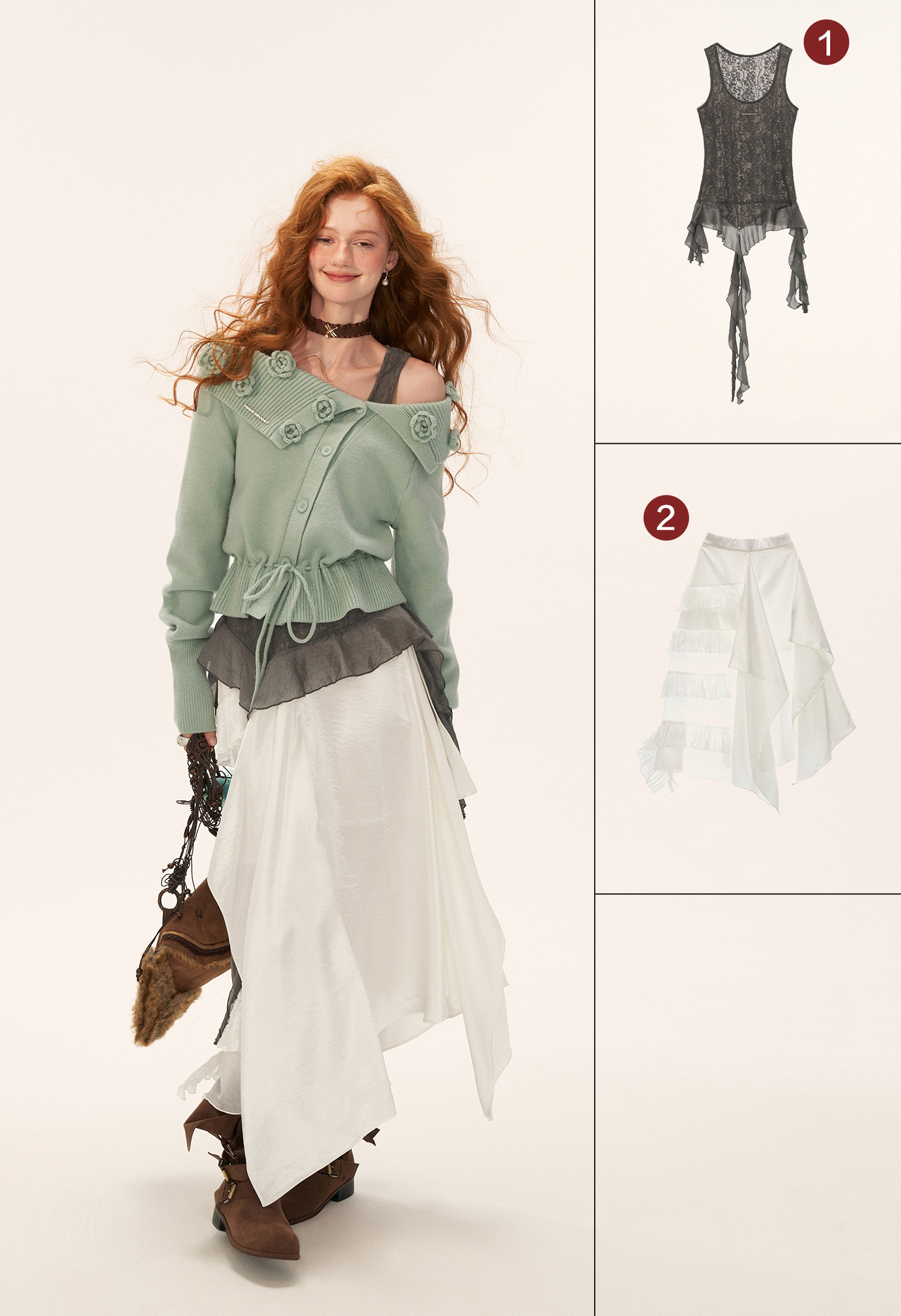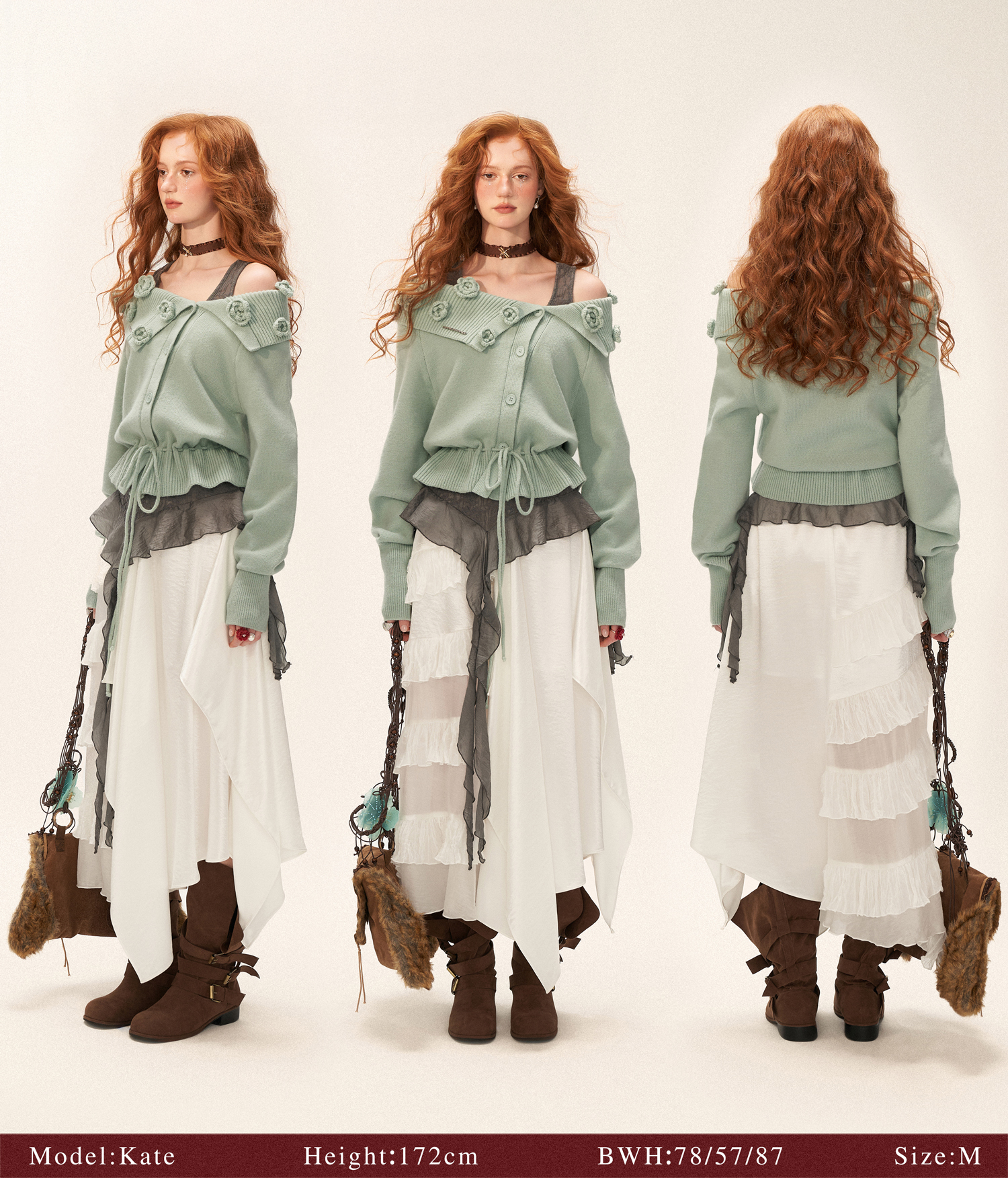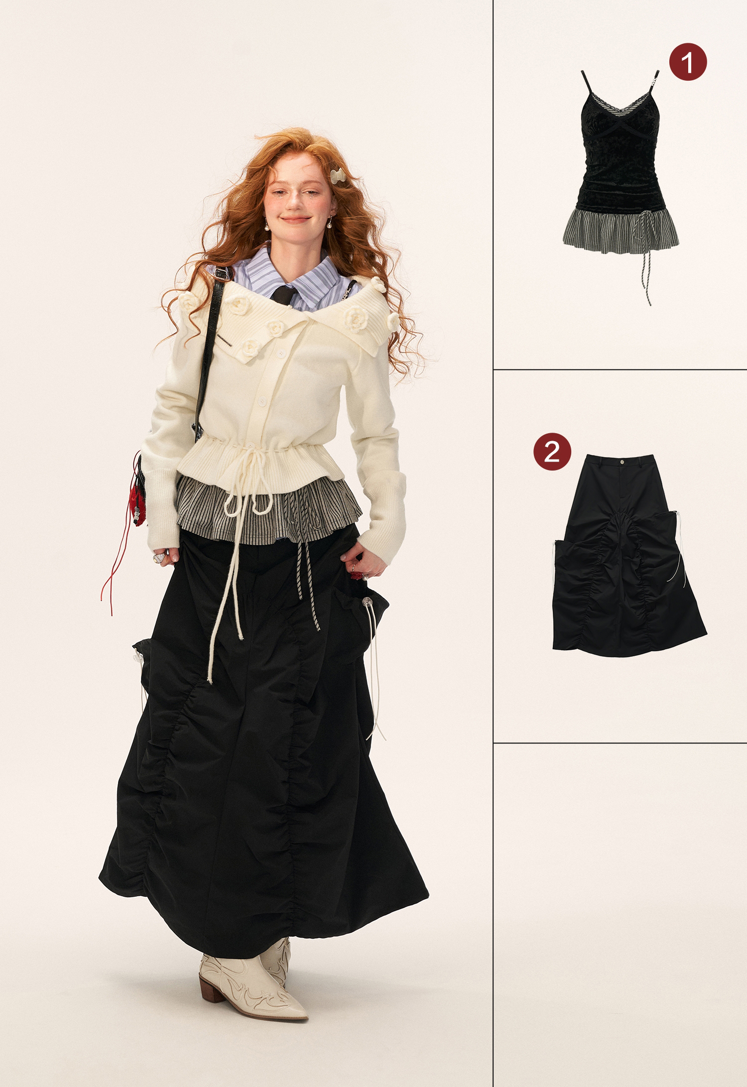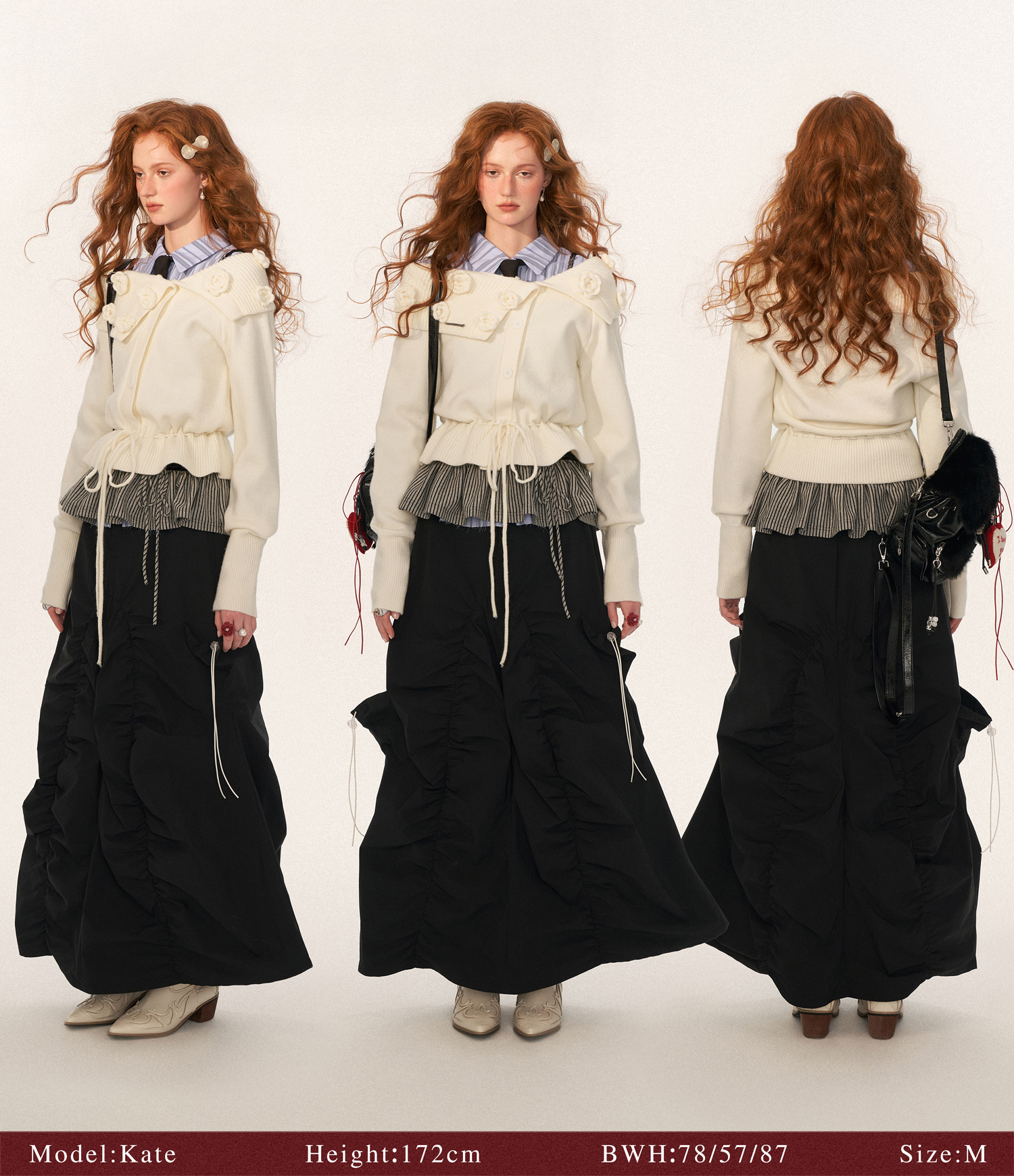 꽃잎처럼 흩어진 로즈 니팅 디테일로 포인트를 준, 로맨틱한 무드의 드로스트링 가디건입니다.