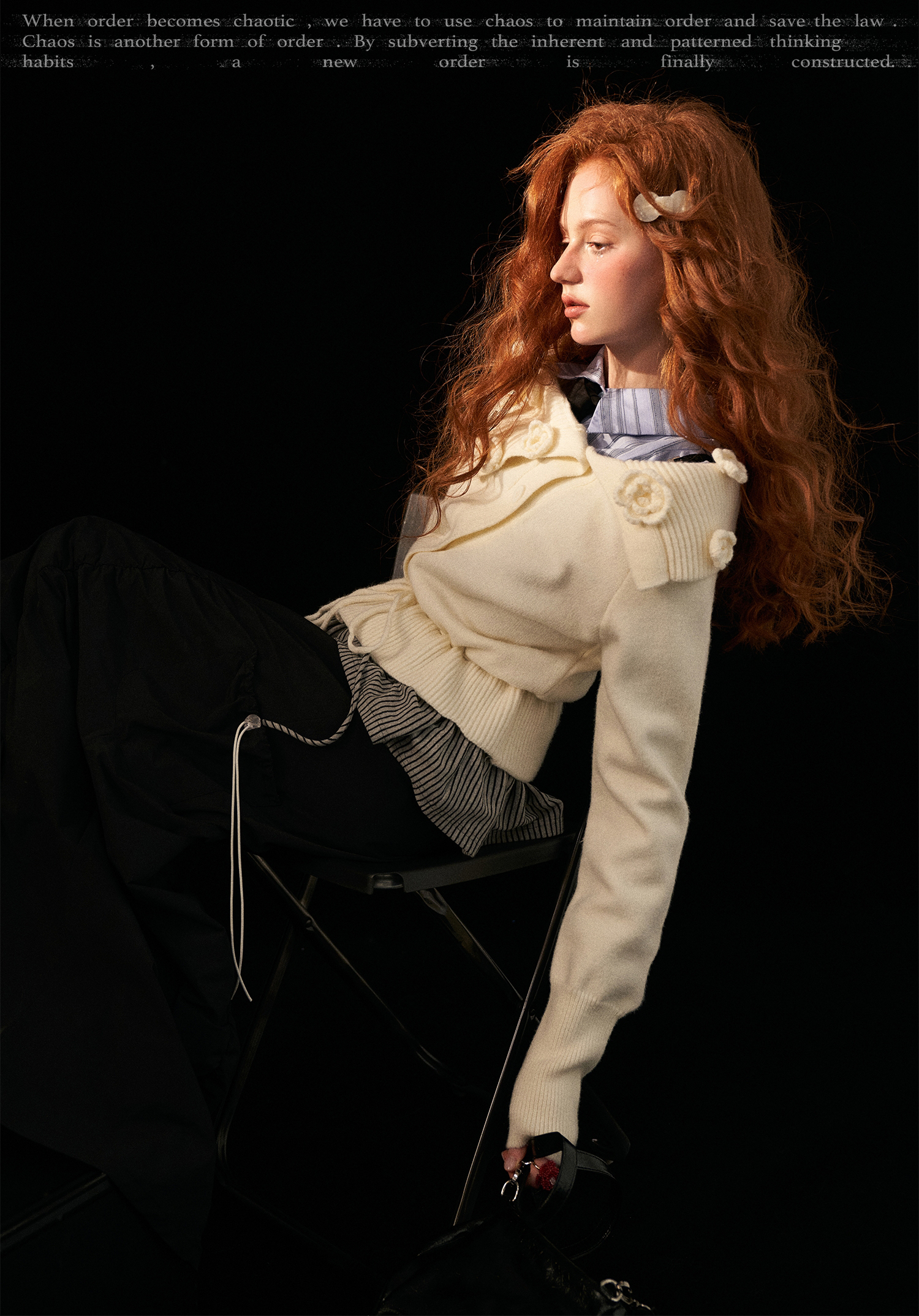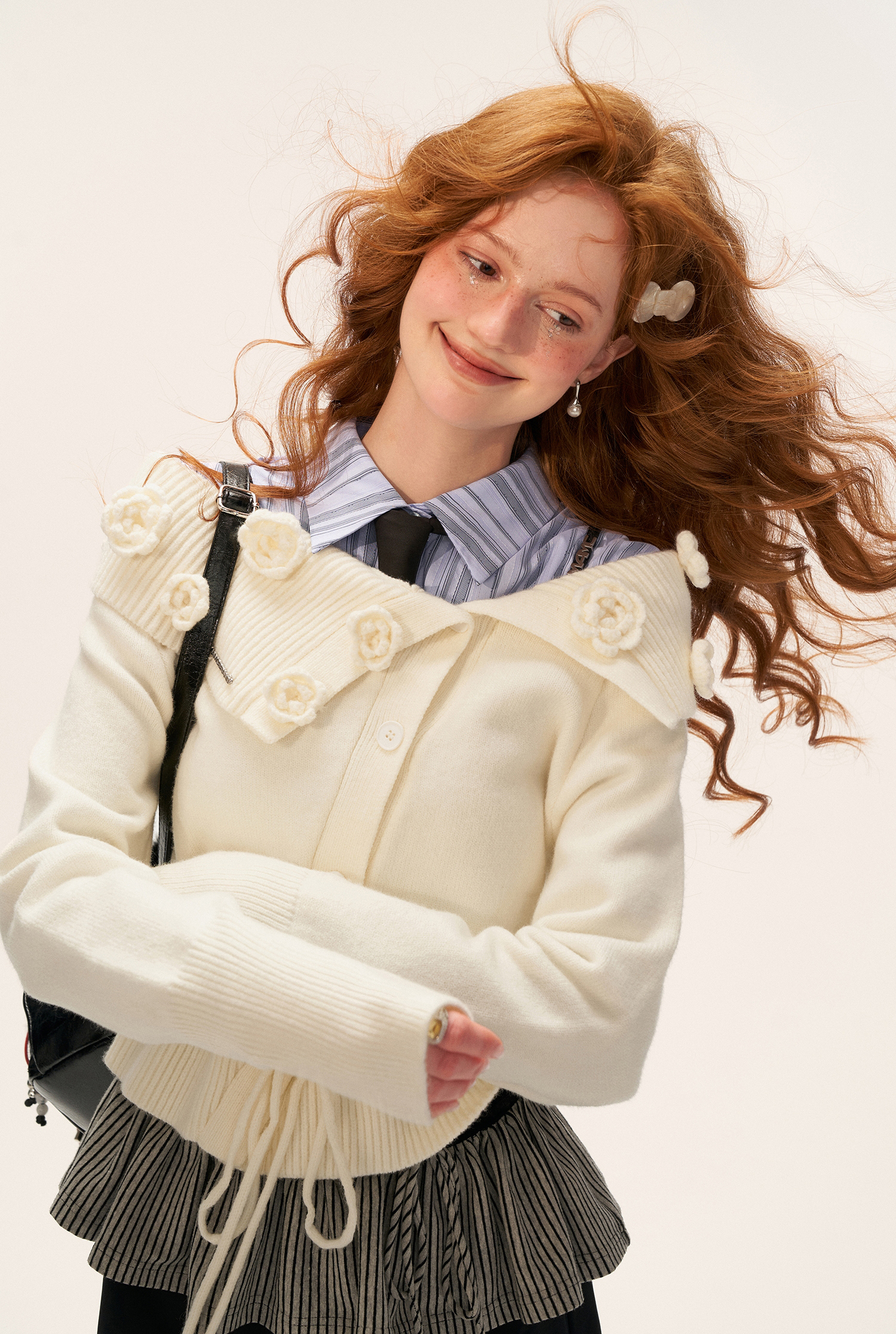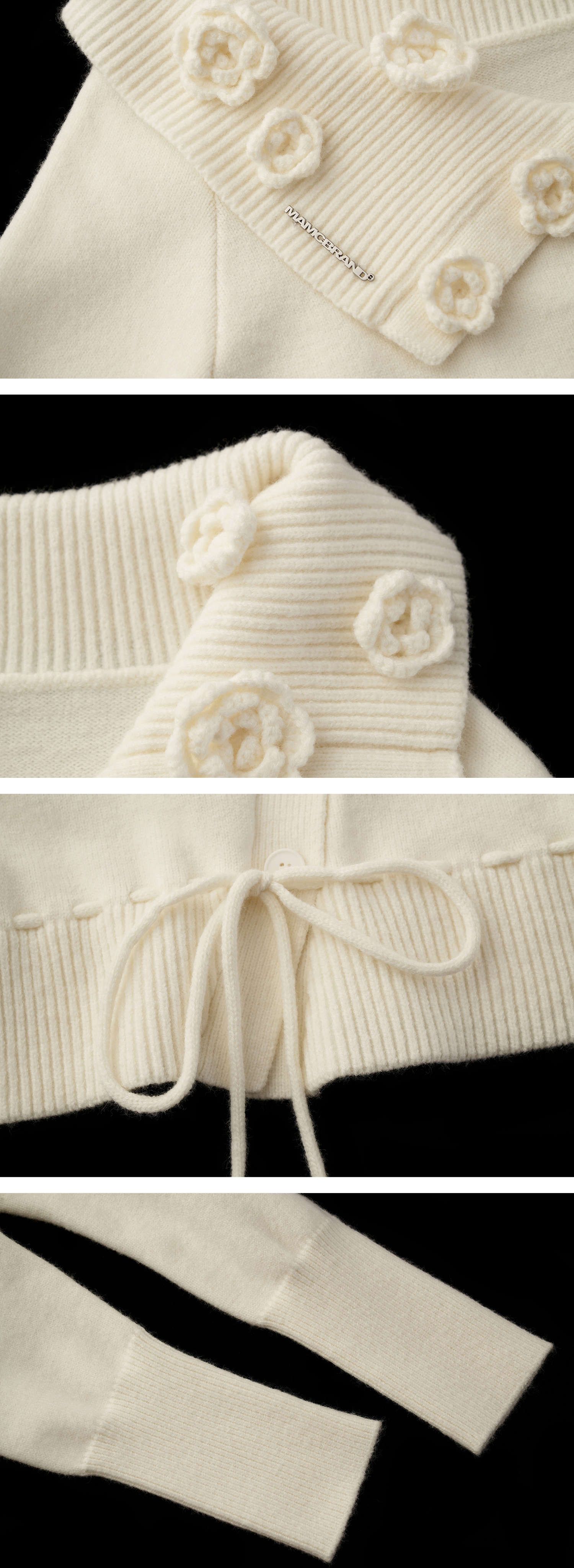- 리브드 칼라 위로 더해진 입체적인 로즈 니팅 장식이 포인트
