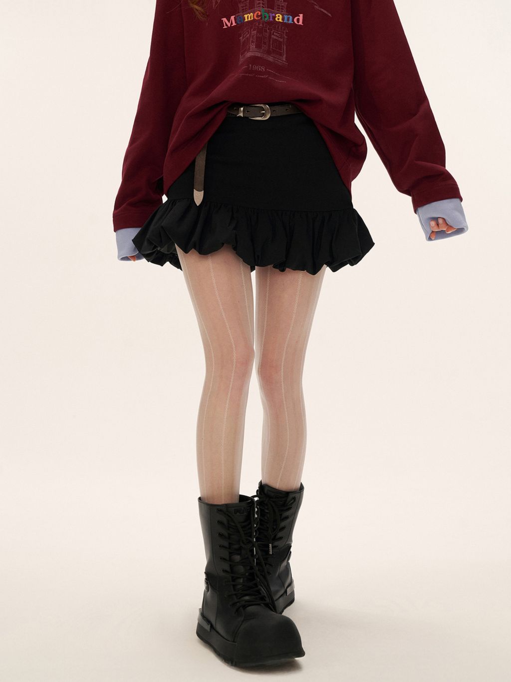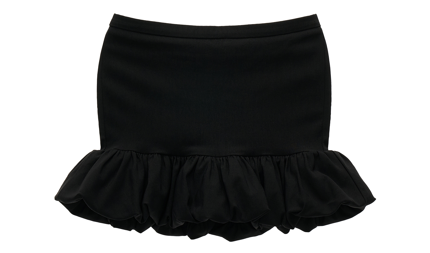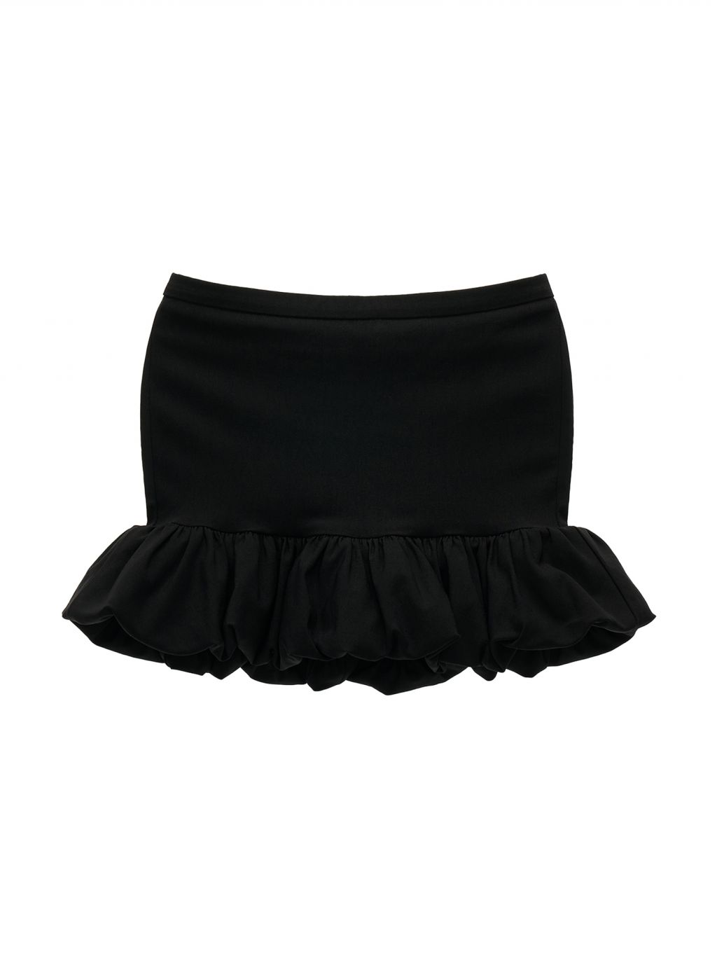 러플 헴라인이 만들어내는 입체적인 볼륨감으로, 베이직한 룩에도 포인트가 되어주는 블랙 미니스커트입니다.