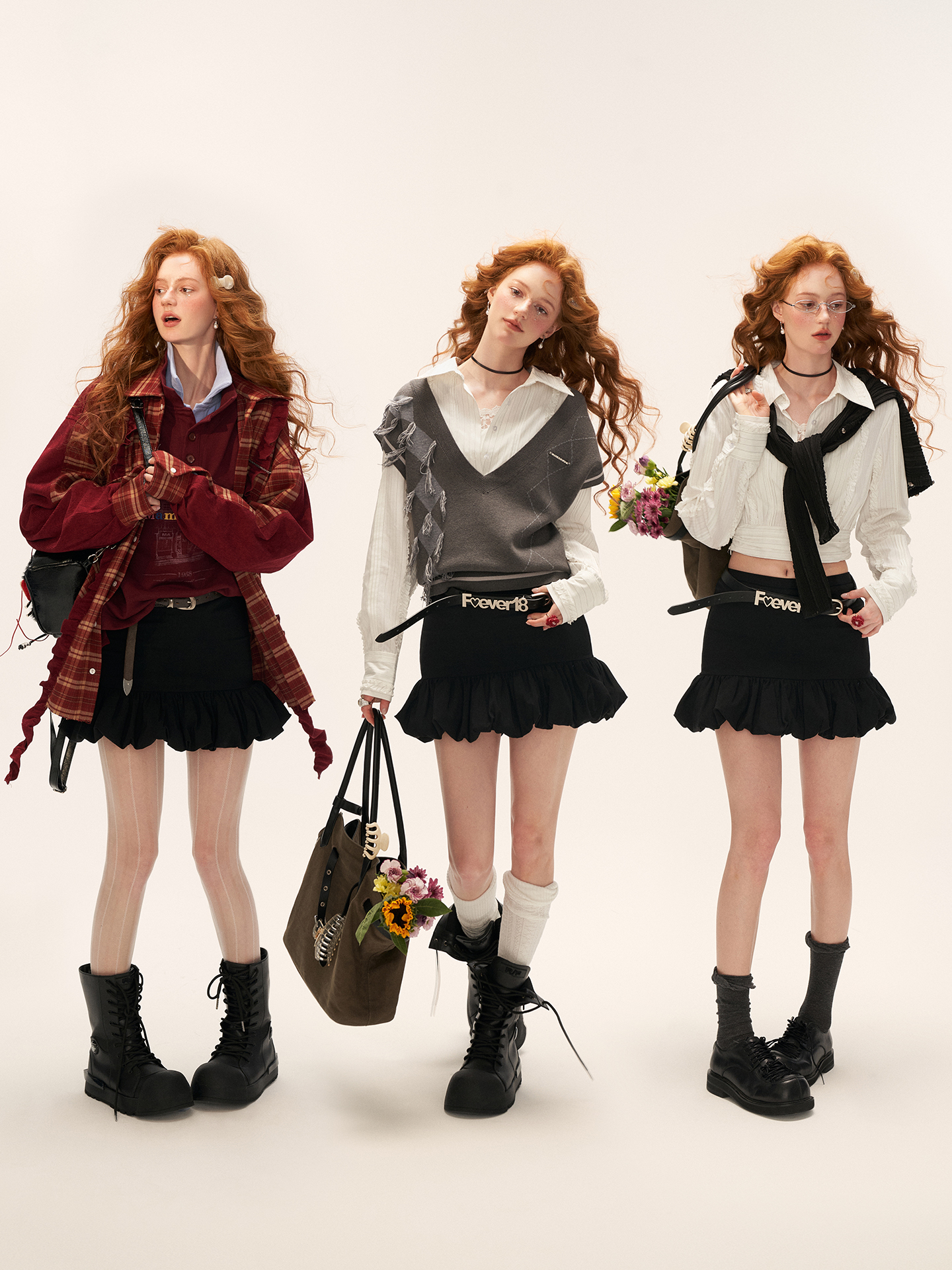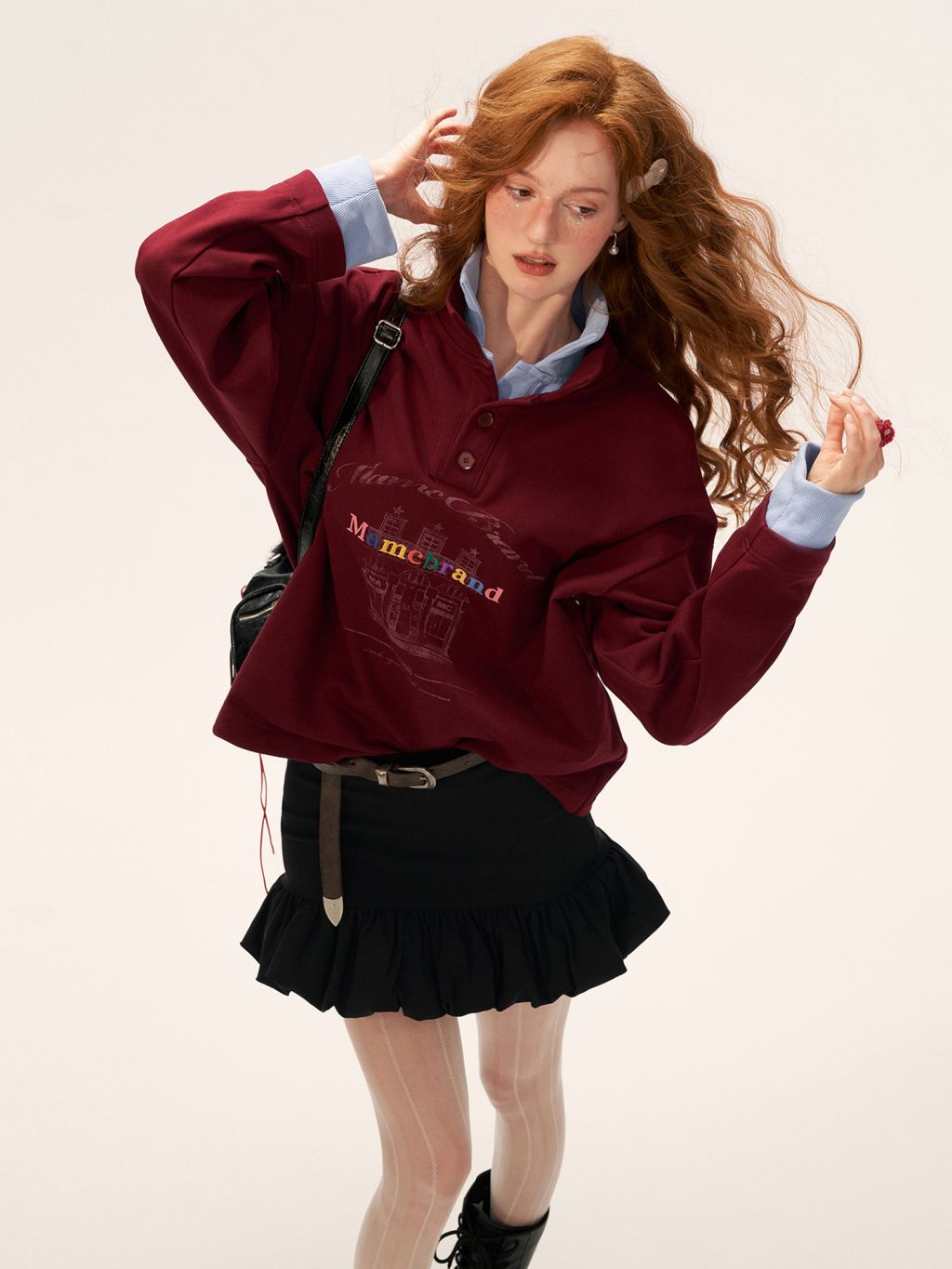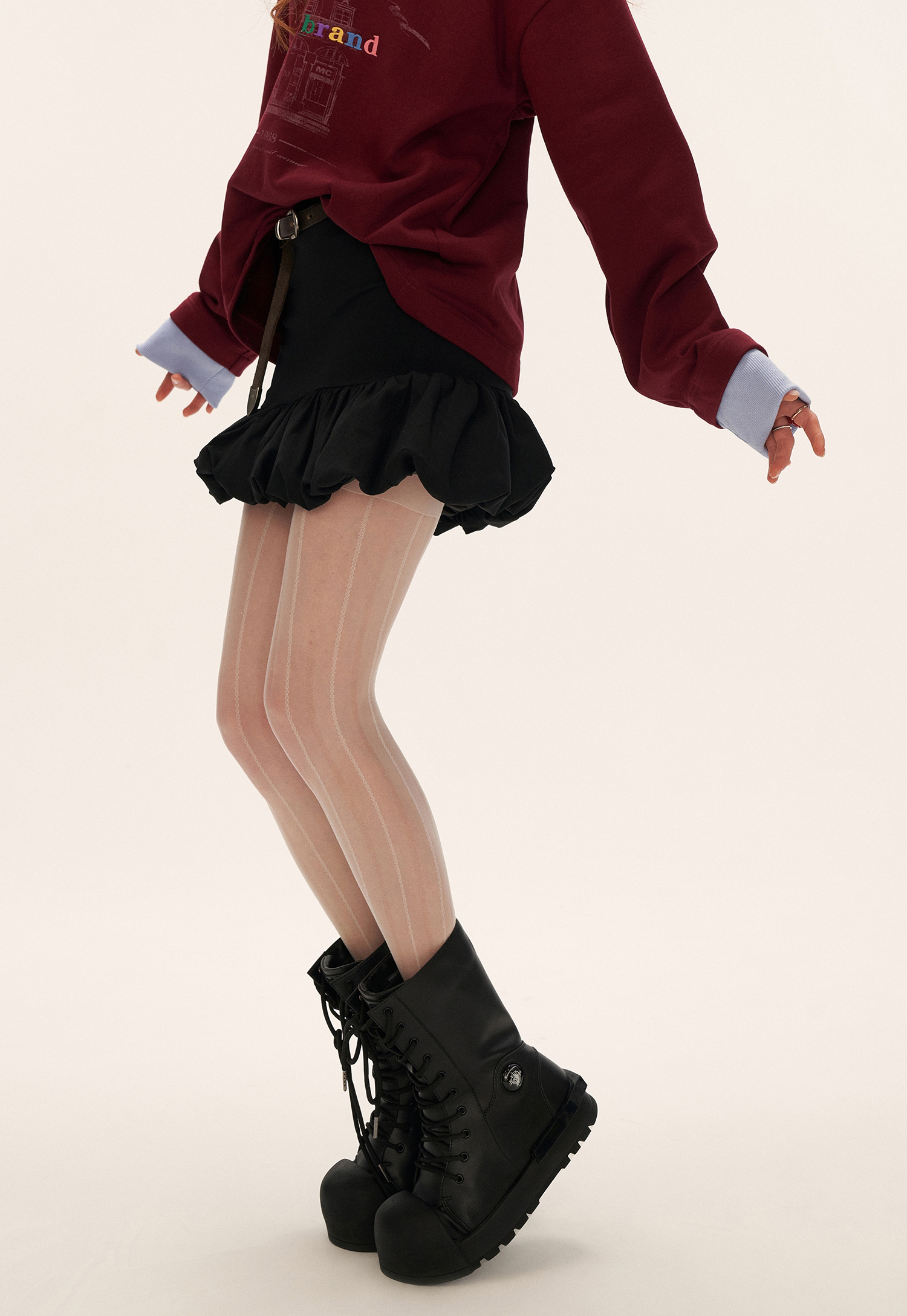 러플 헴라인이 만들어내는 입체적인 볼륨감으로, 베이직한 룩에도 포인트가 되어주는 블랙 미니스커트입니다.