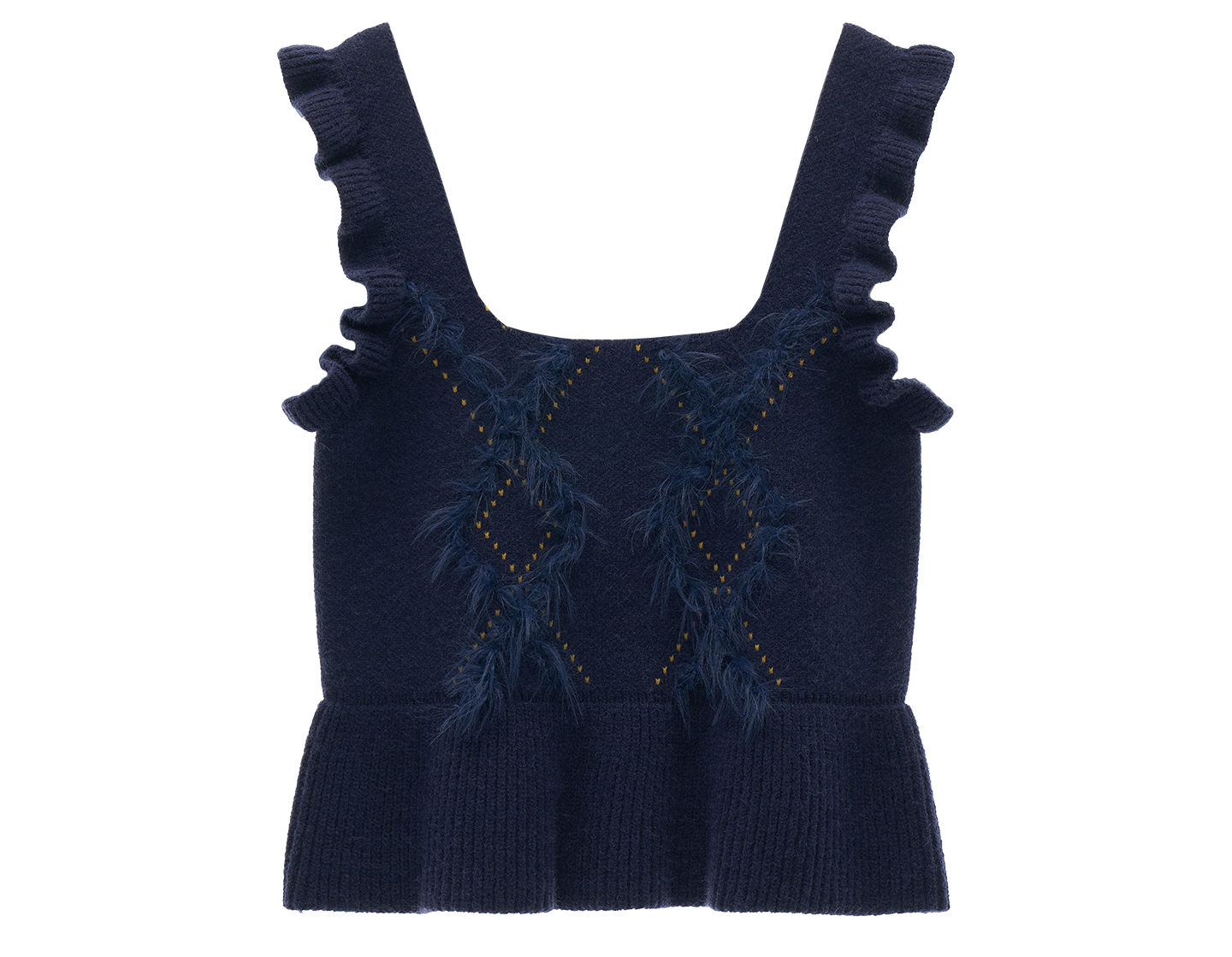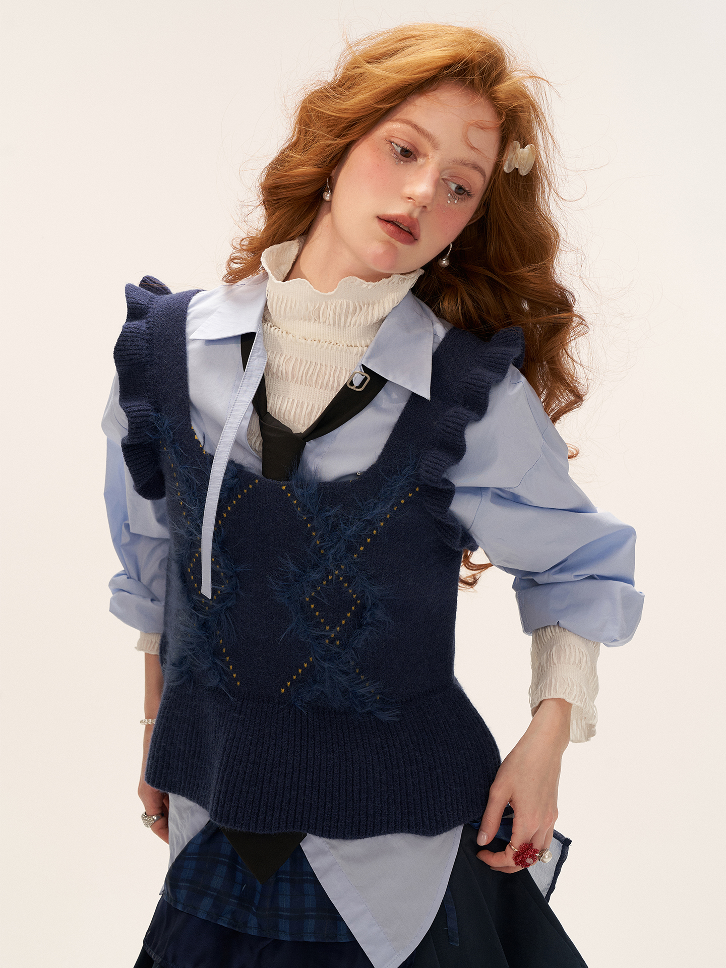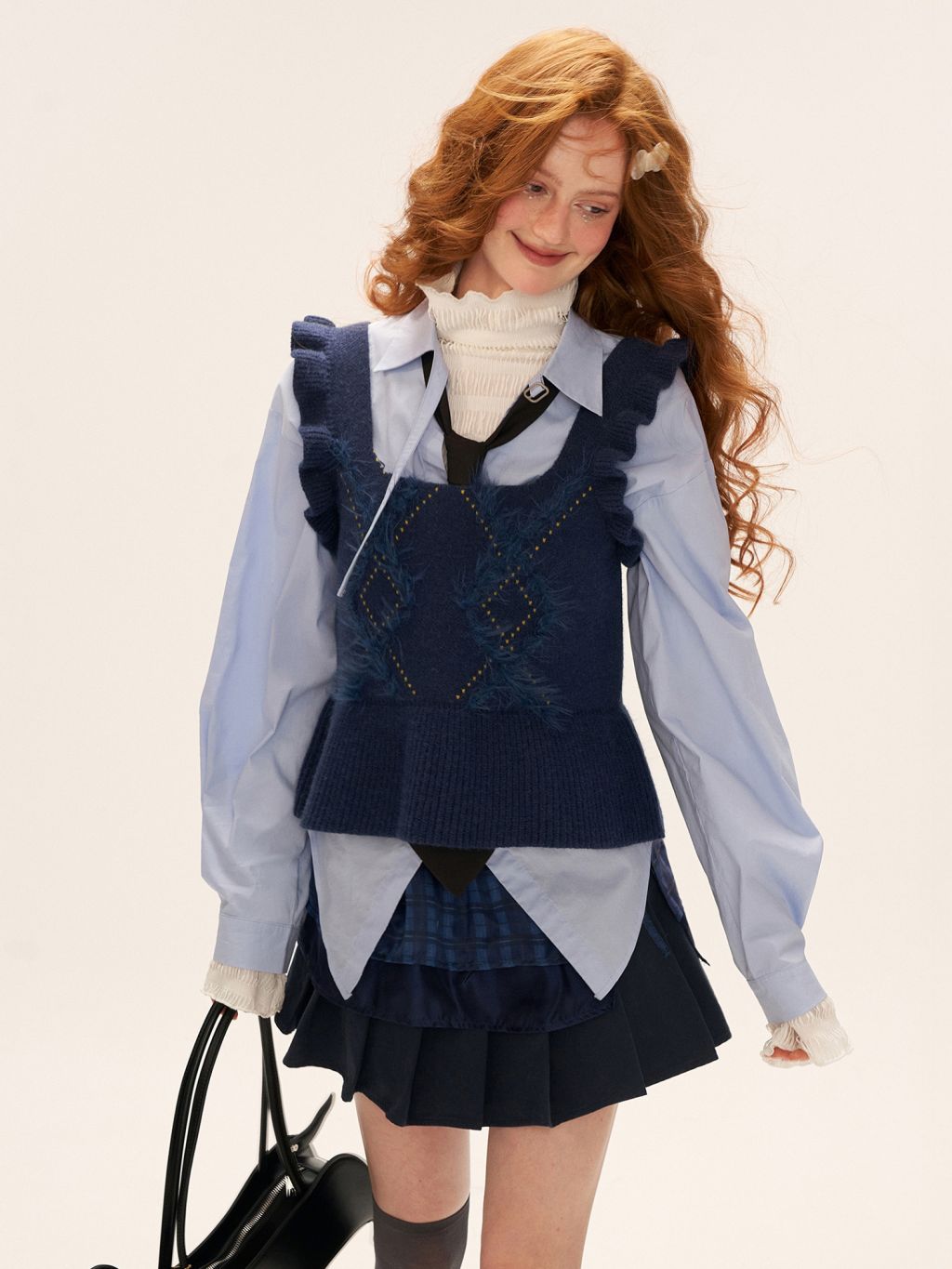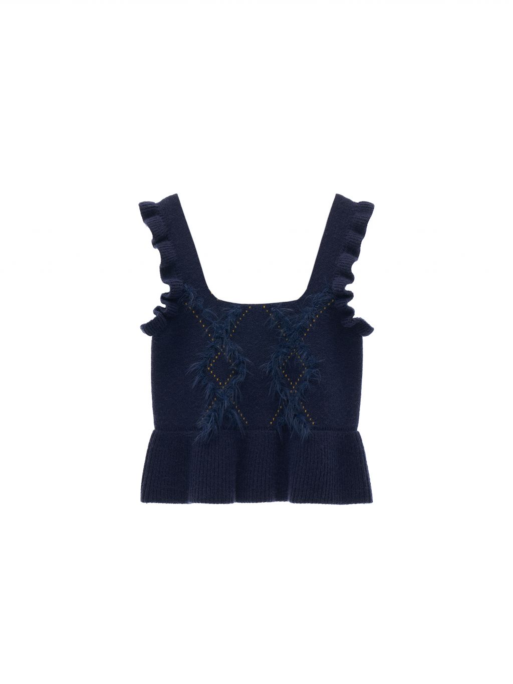 아가일 패턴과 부드러운 프린지로 감각적인 텍스처를 더한, 클래식 무드의 러플 니트 베스트입니다.