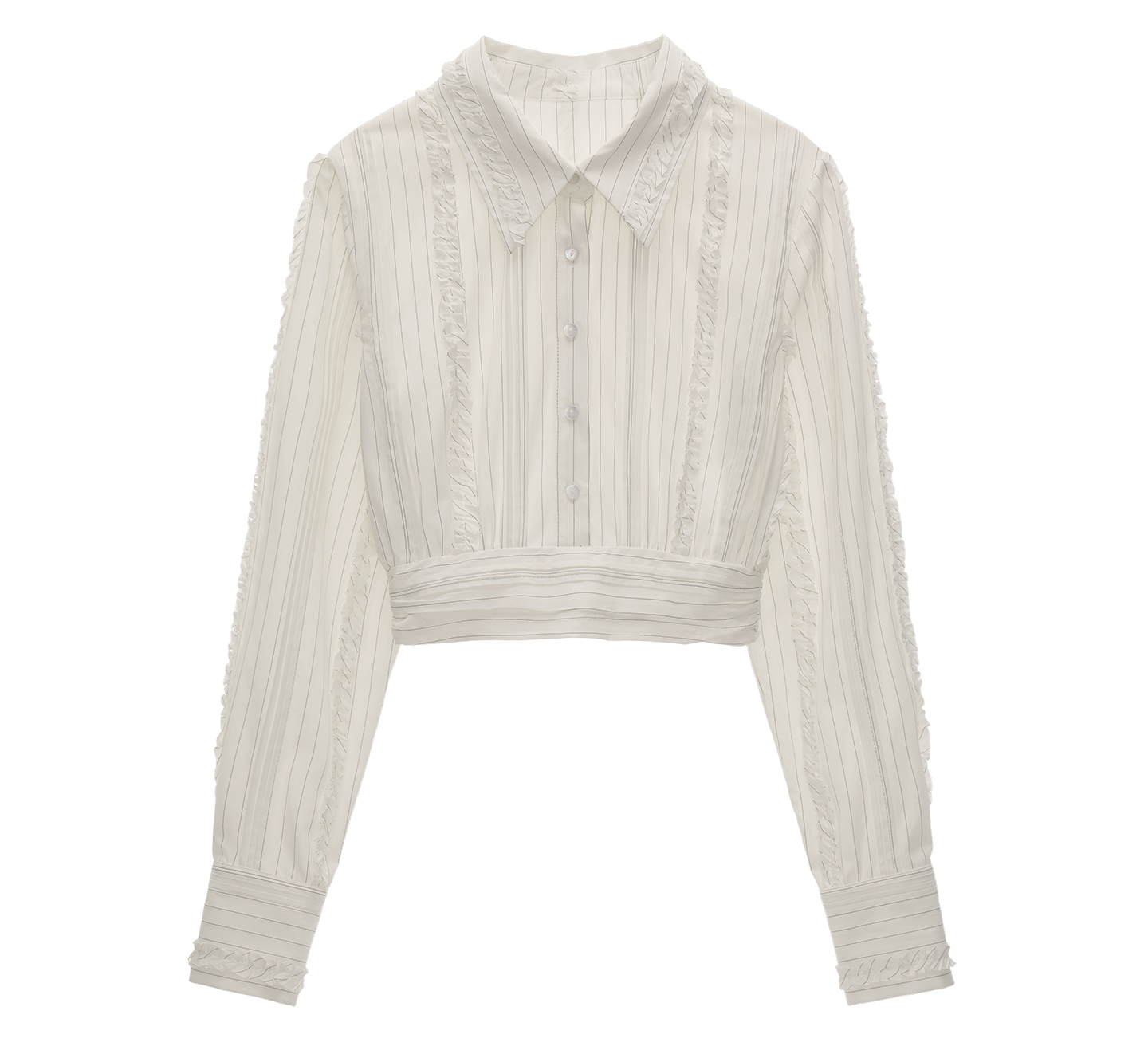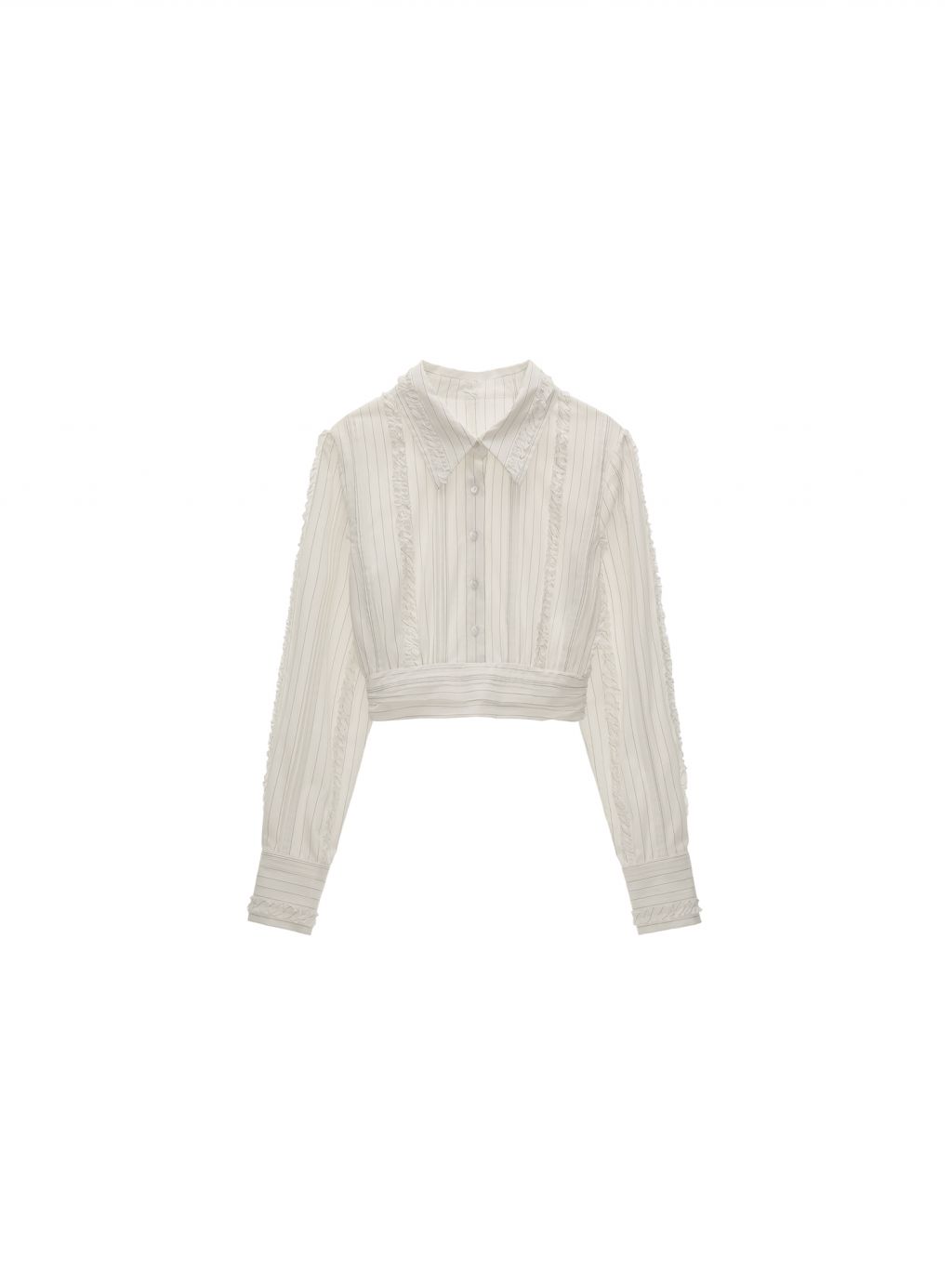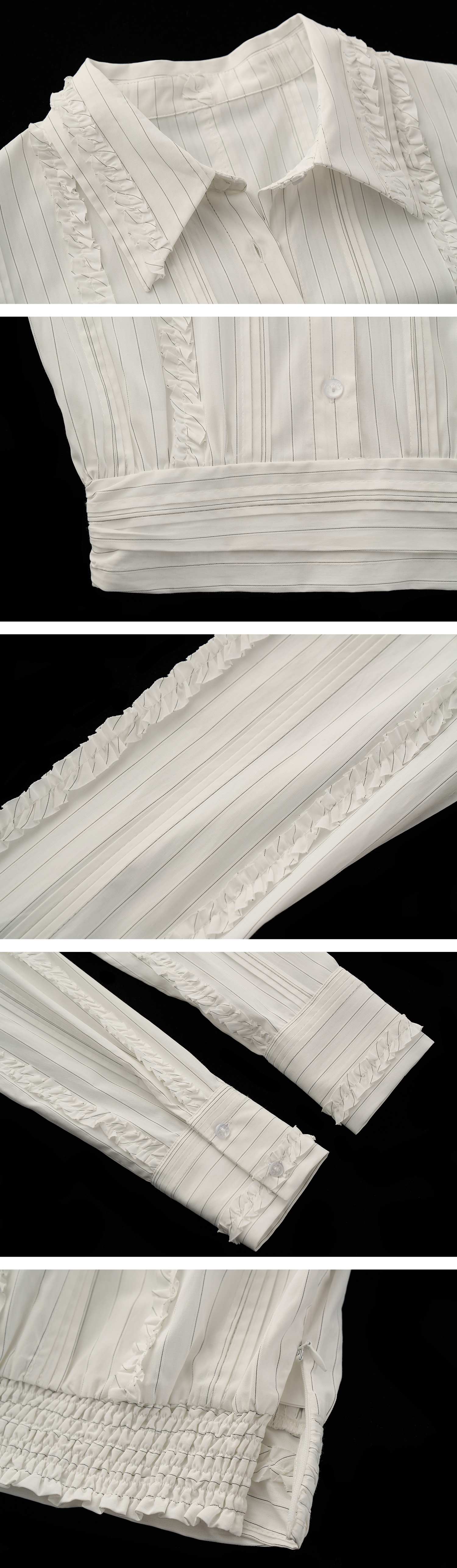 섬세한 스트라이프 위에 프릴 라인을 더해 완성한 크롭 셔츠로, 클래식한 셔츠 실루엣에 로맨틱한 디테일을 가미한 아이템입니다.