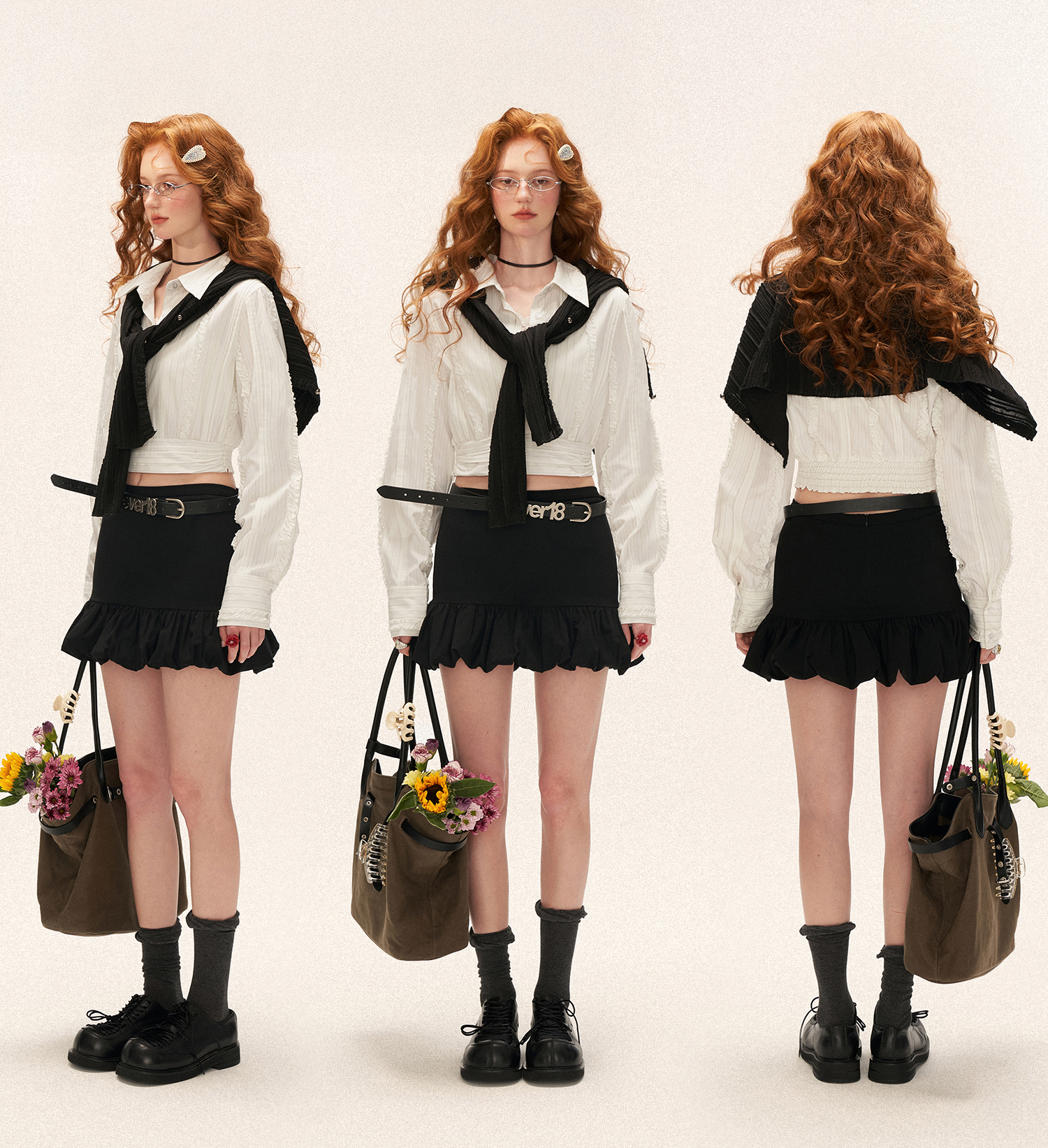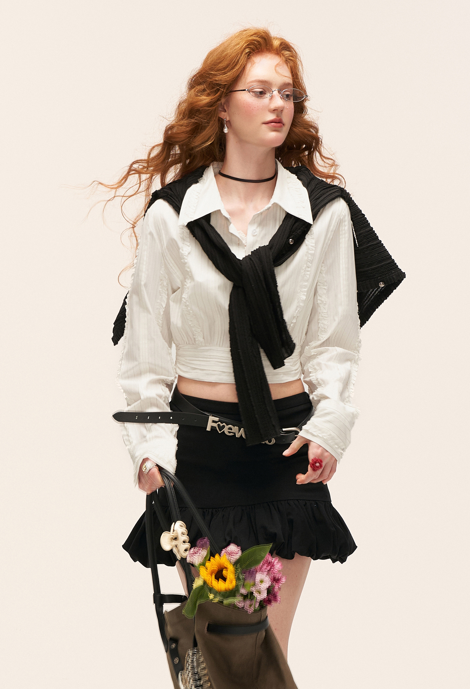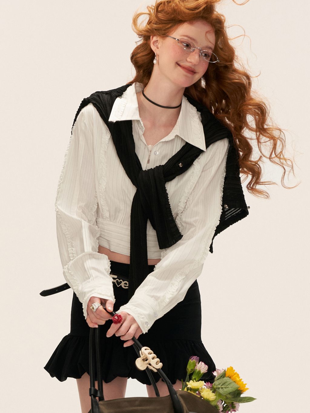 섬세한 스트라이프 위에 프릴 라인을 더해 완성한 크롭 셔츠로, 클래식한 셔츠 실루엣에 로맨틱한 디테일을 가미한 아이템입니다.