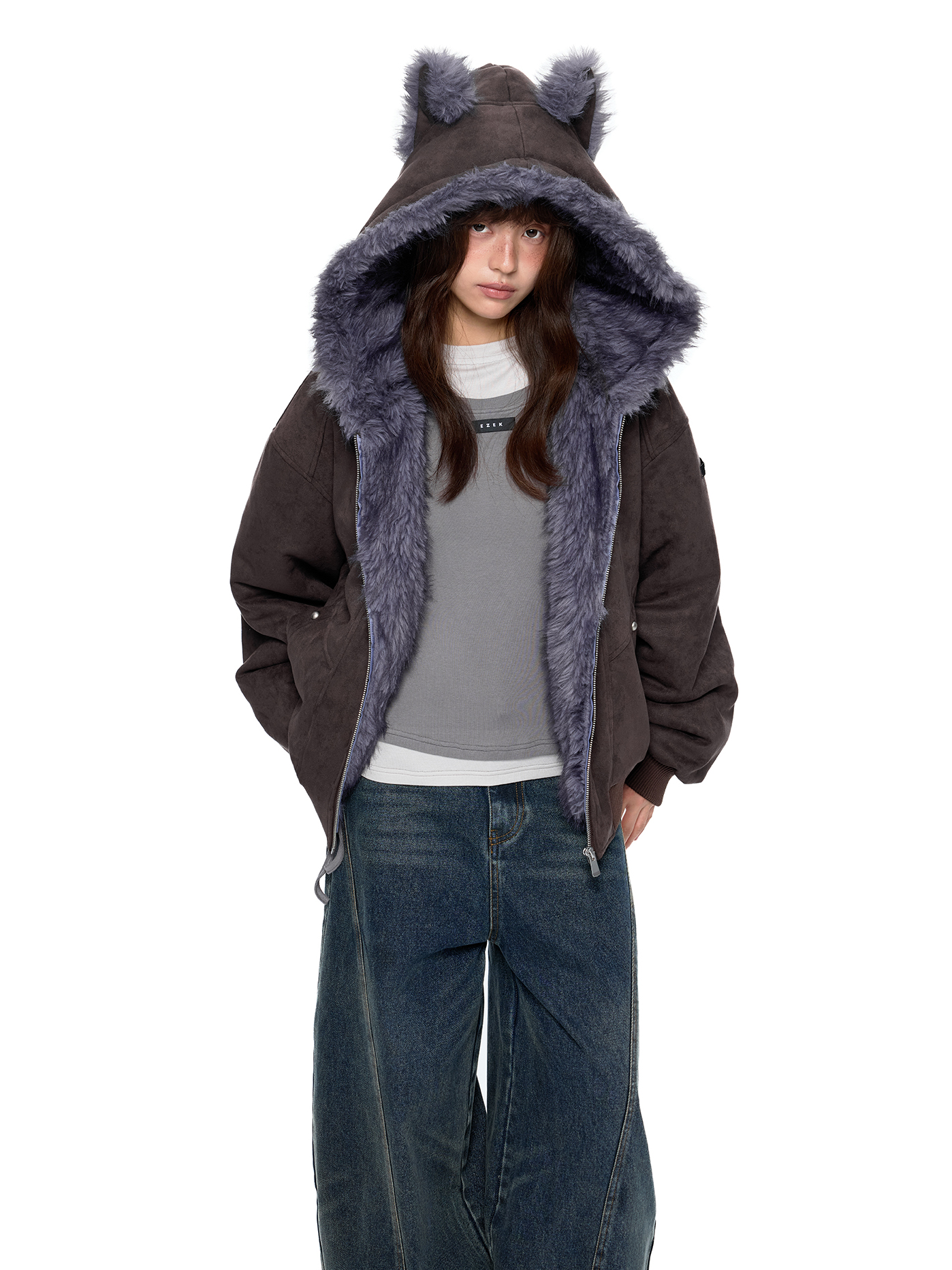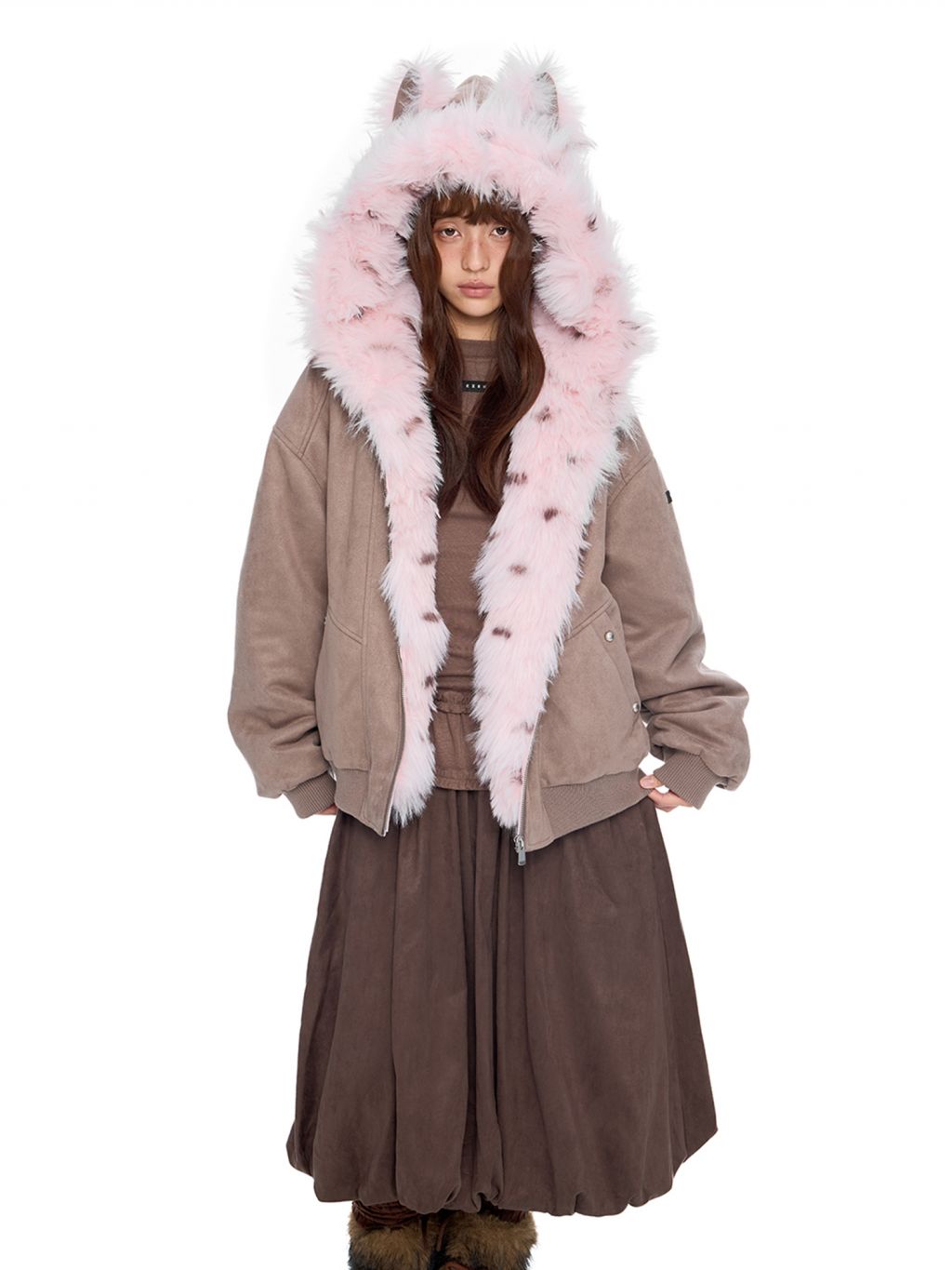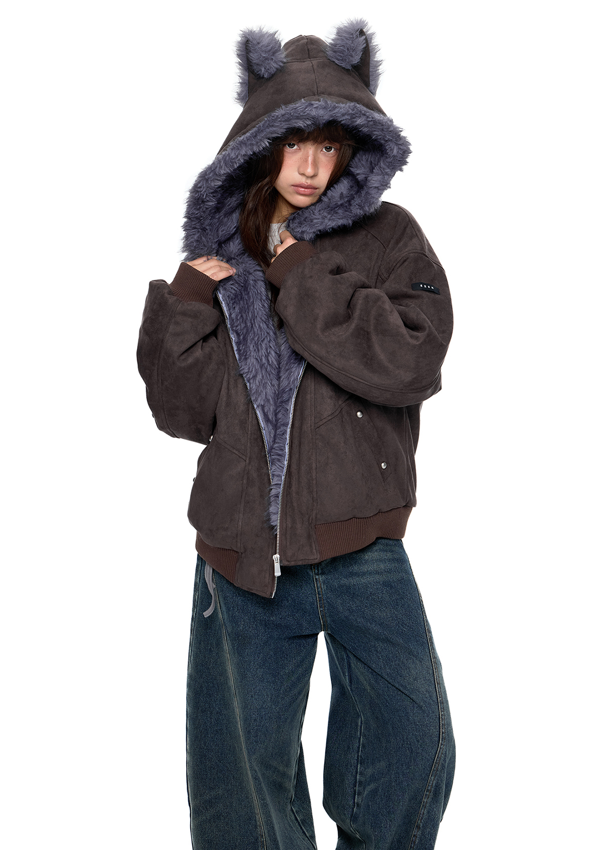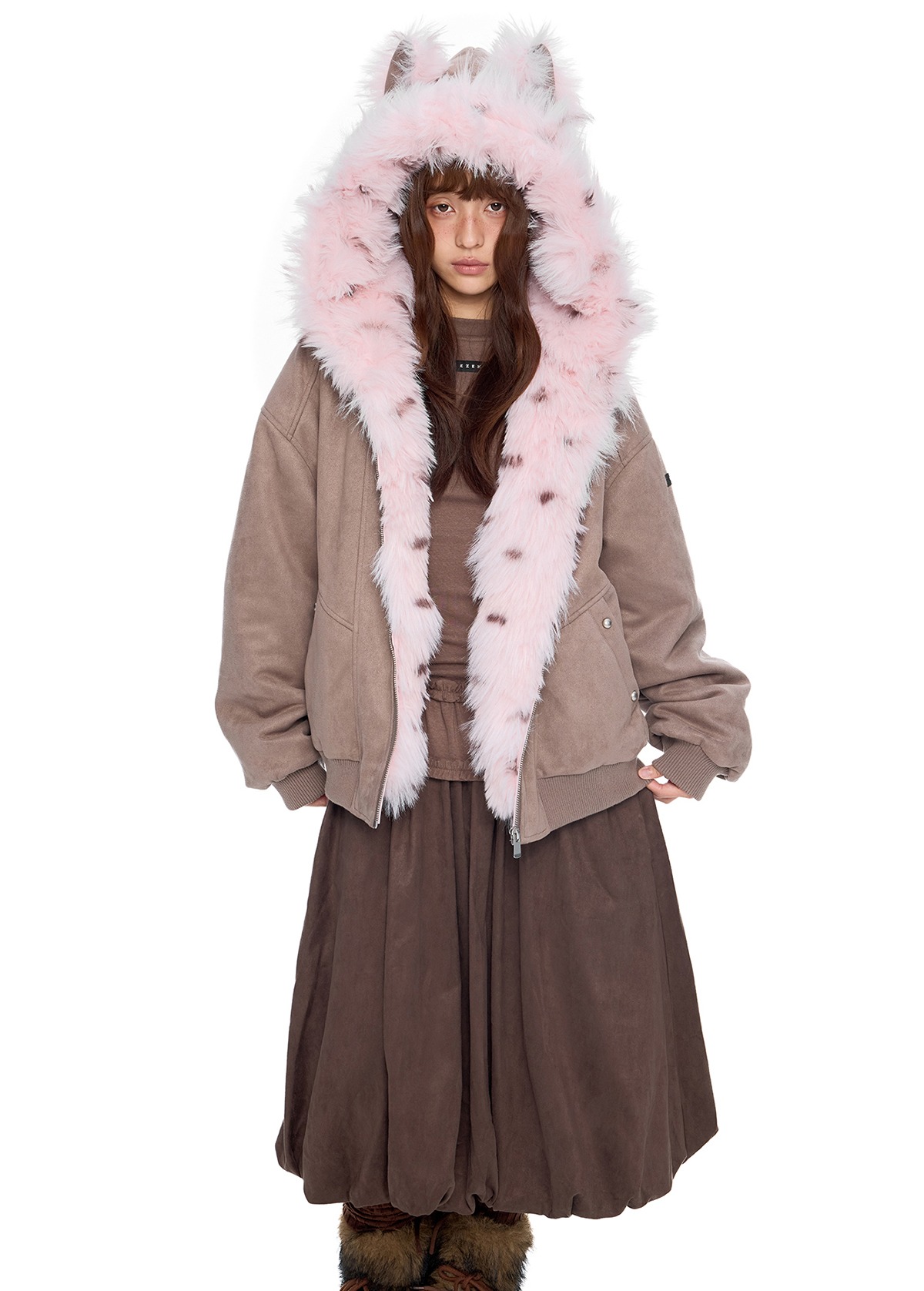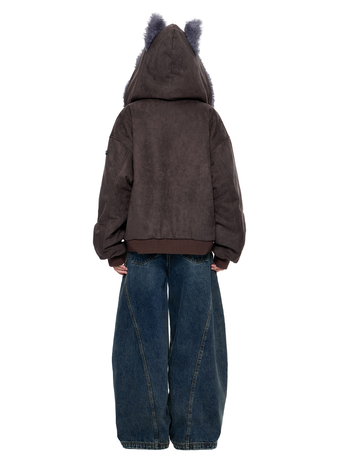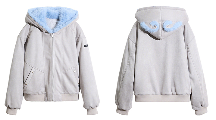 - 후드에 장식된 테디 이어 디테일로 완성된 키치한 실루엣