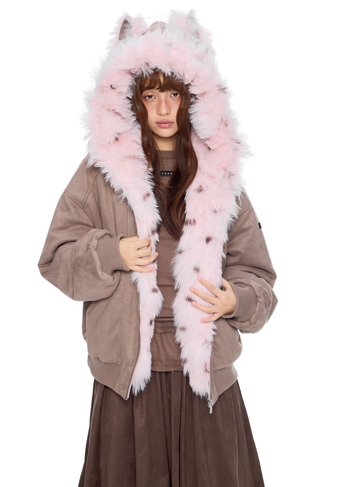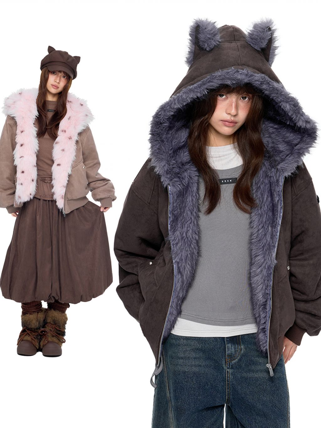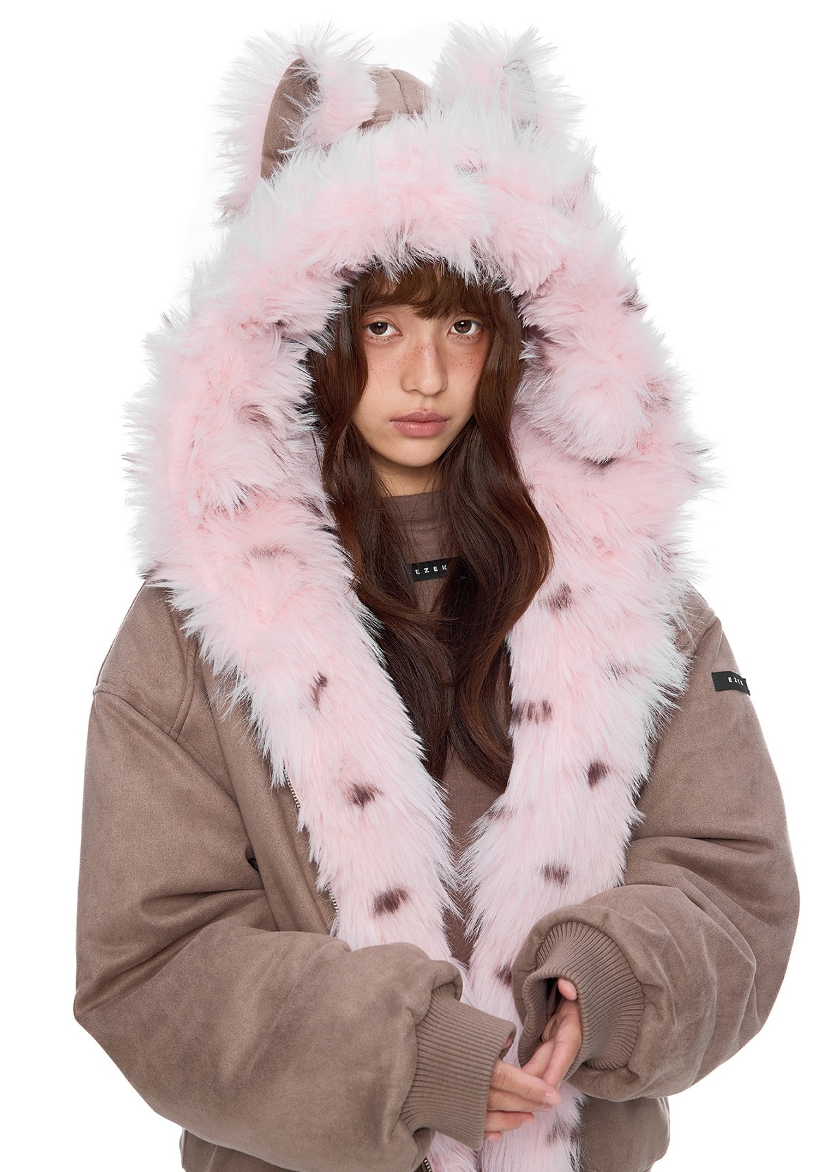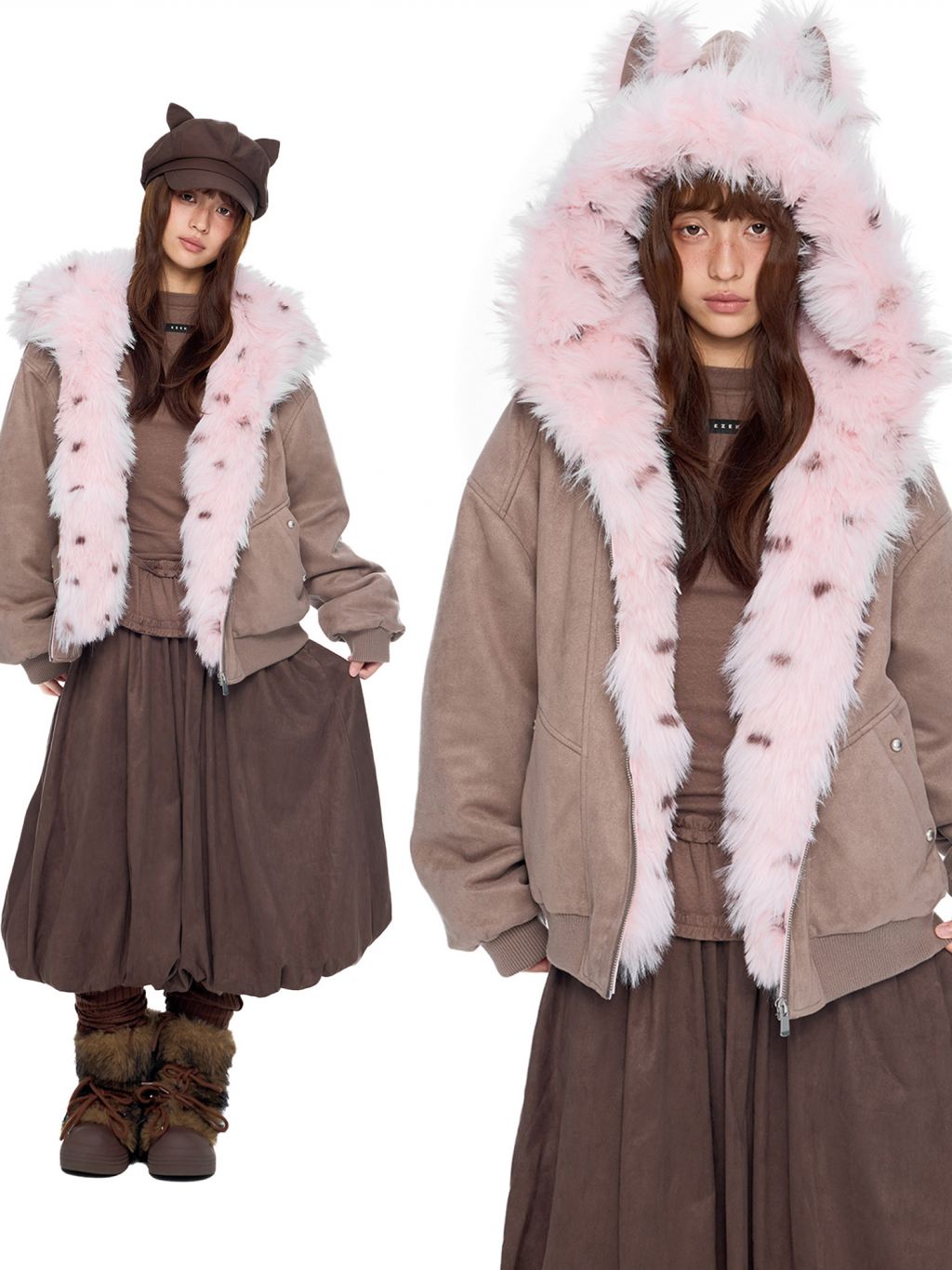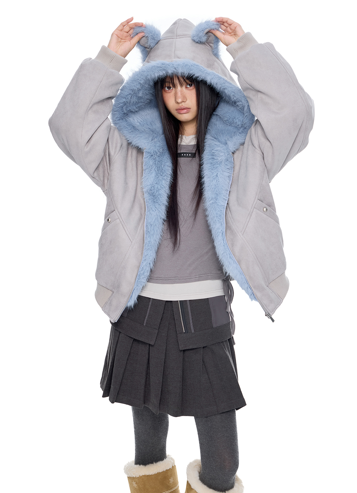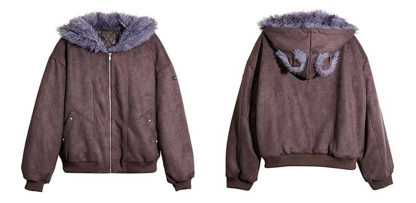 - 후드에 장식된 테디 이어 디테일로 완성된 키치한 실루엣