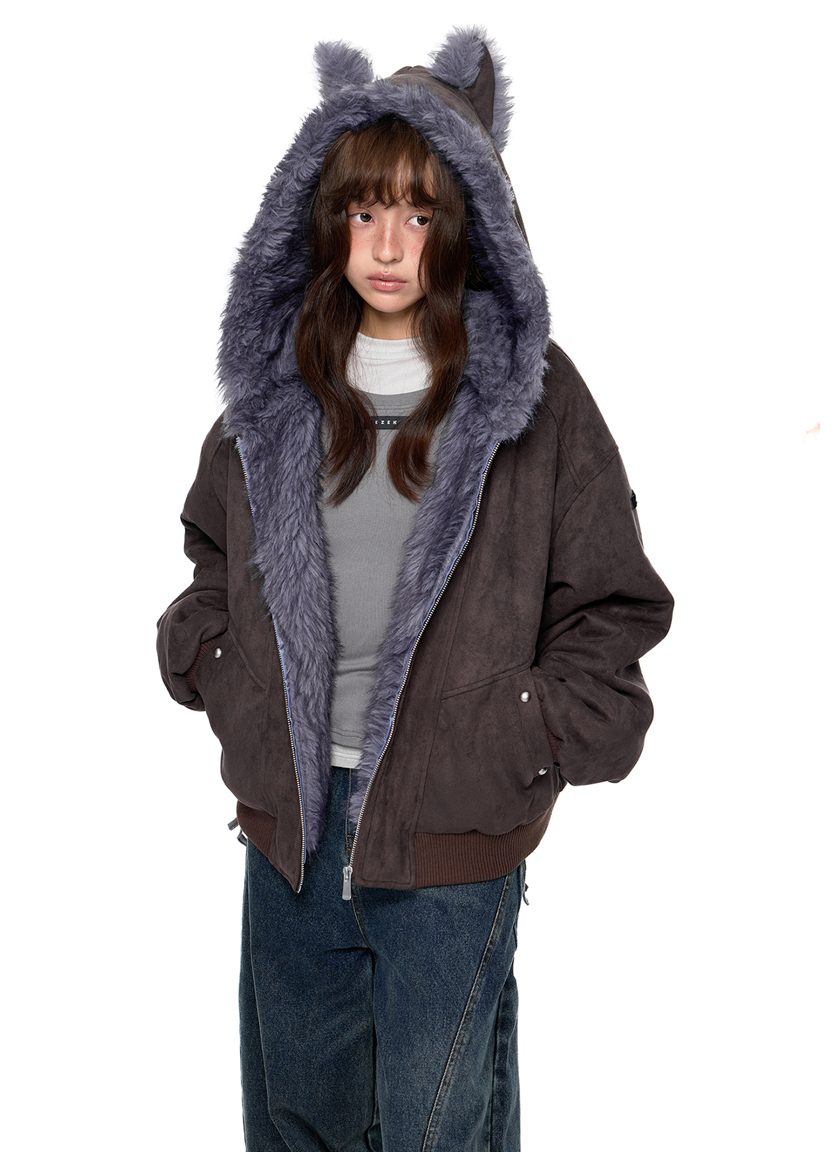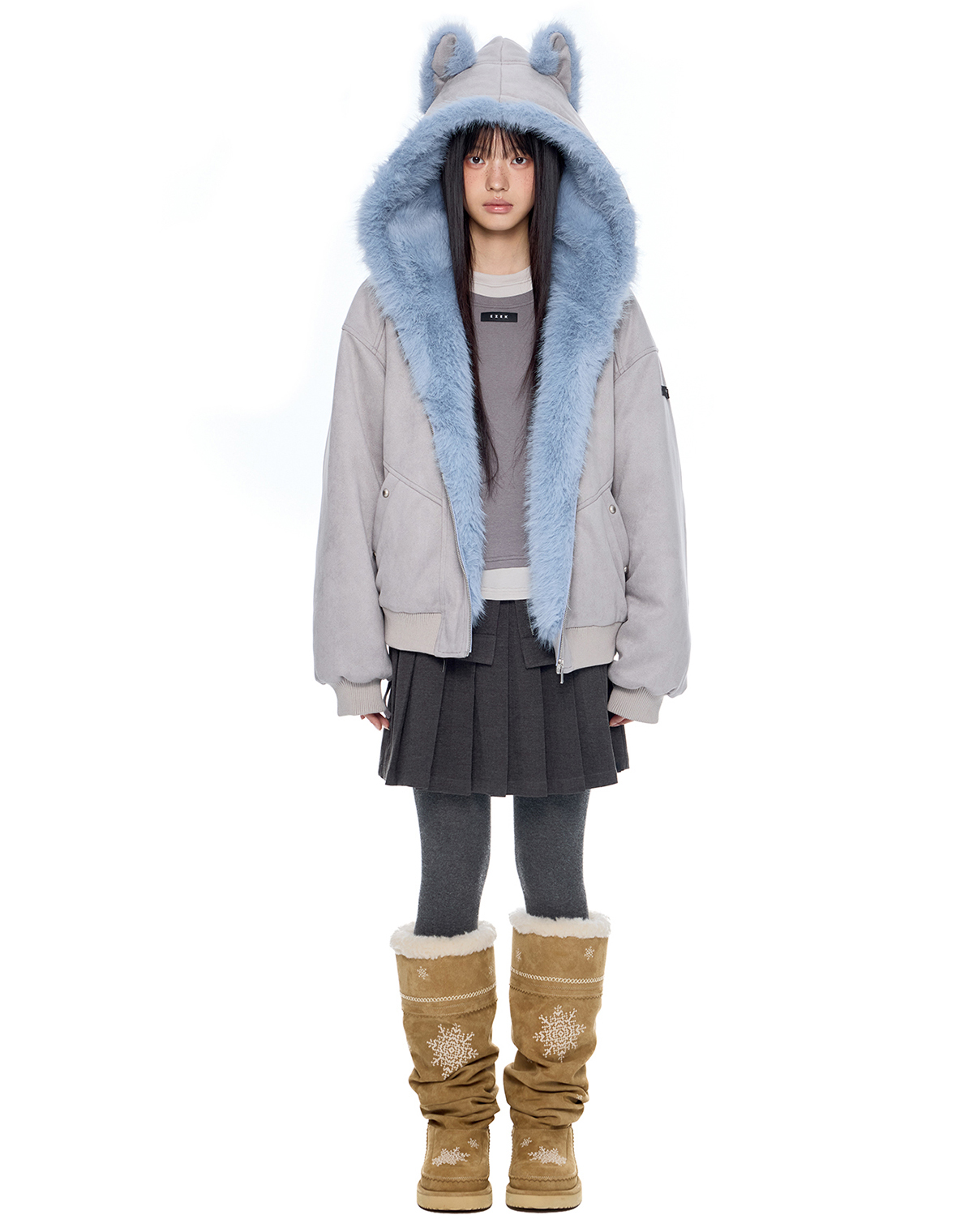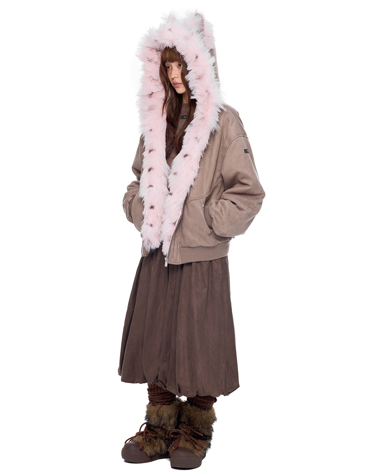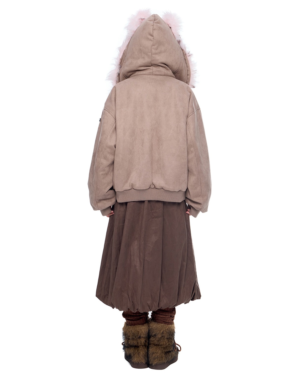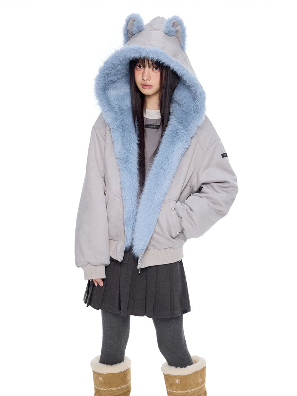 - 후드에 장식된 테디 이어 디테일로 완성된 키치한 실루엣