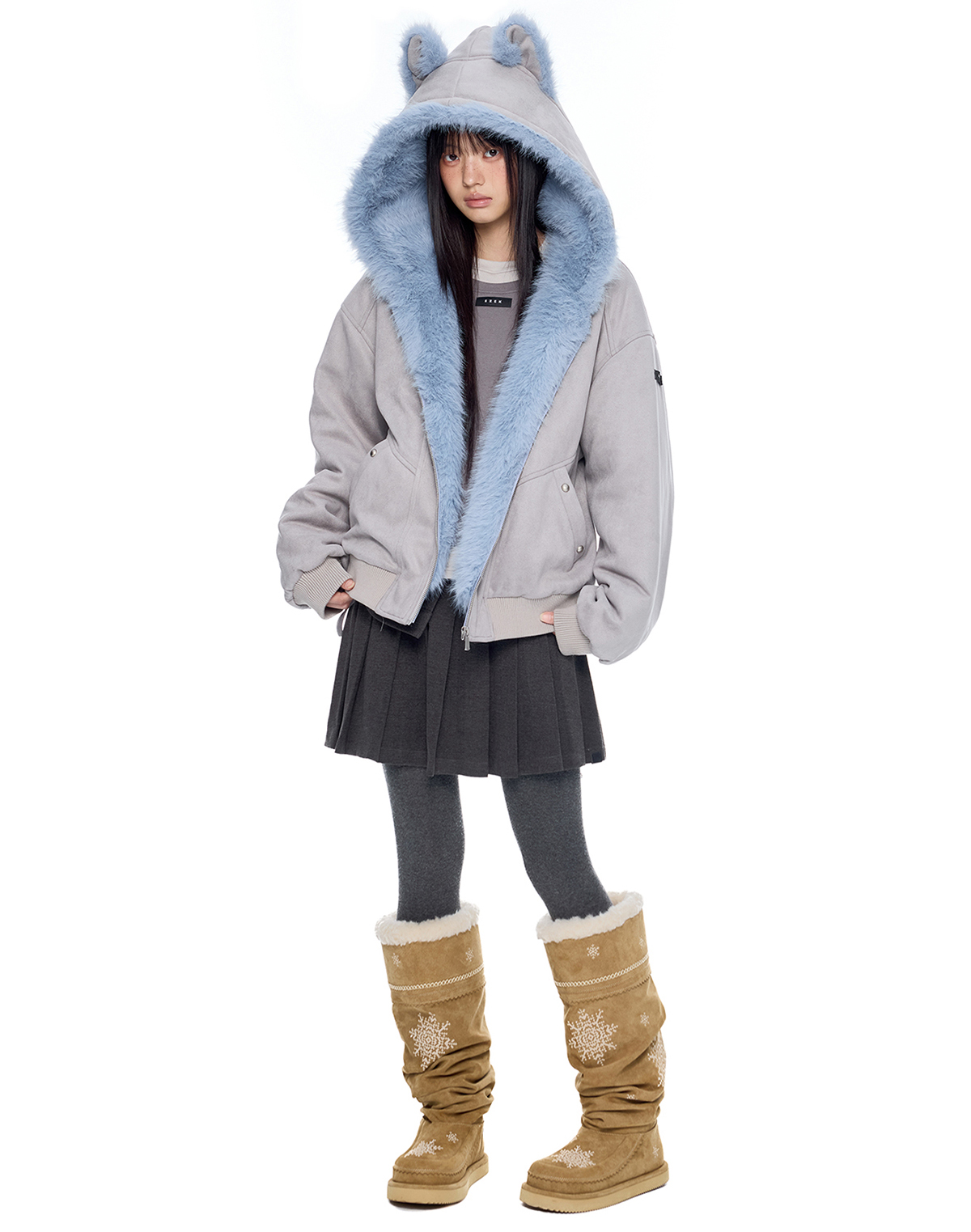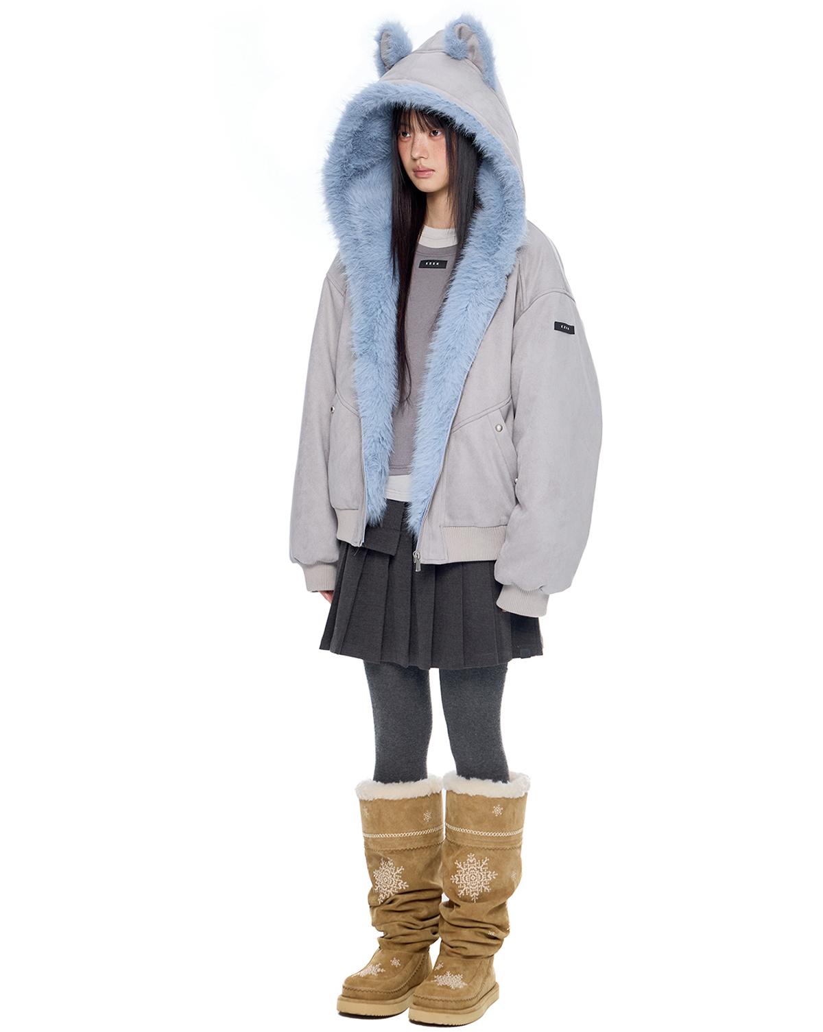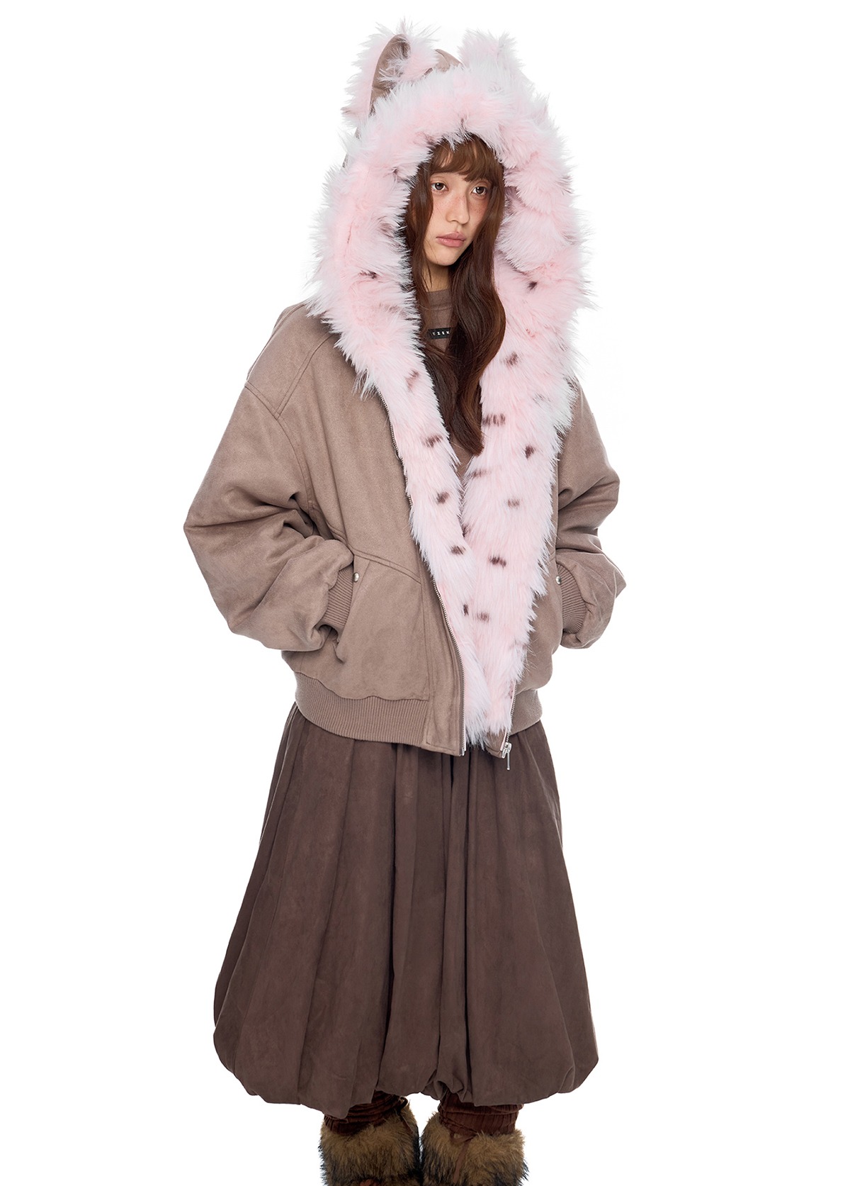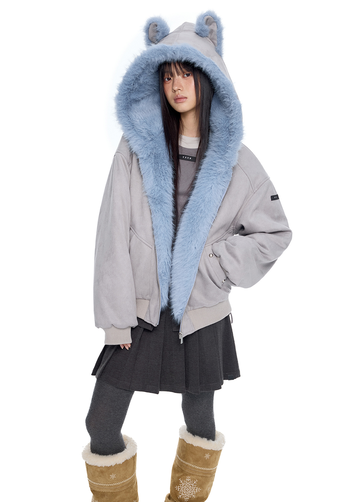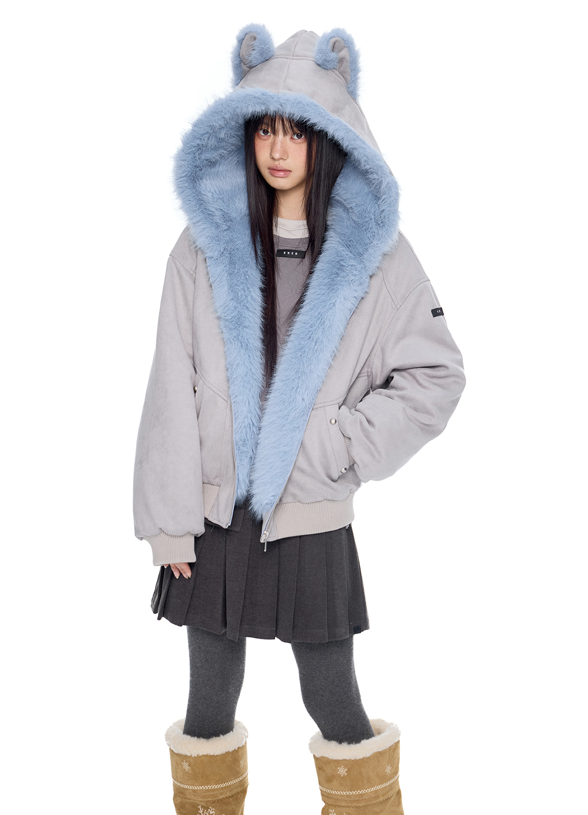 - 후드에 장식된 테디 이어 디테일로 완성된 키치한 실루엣