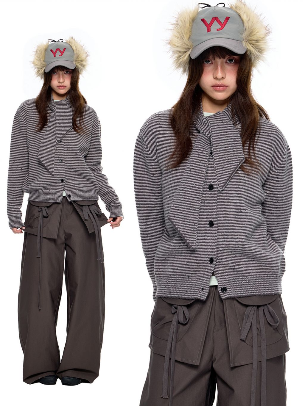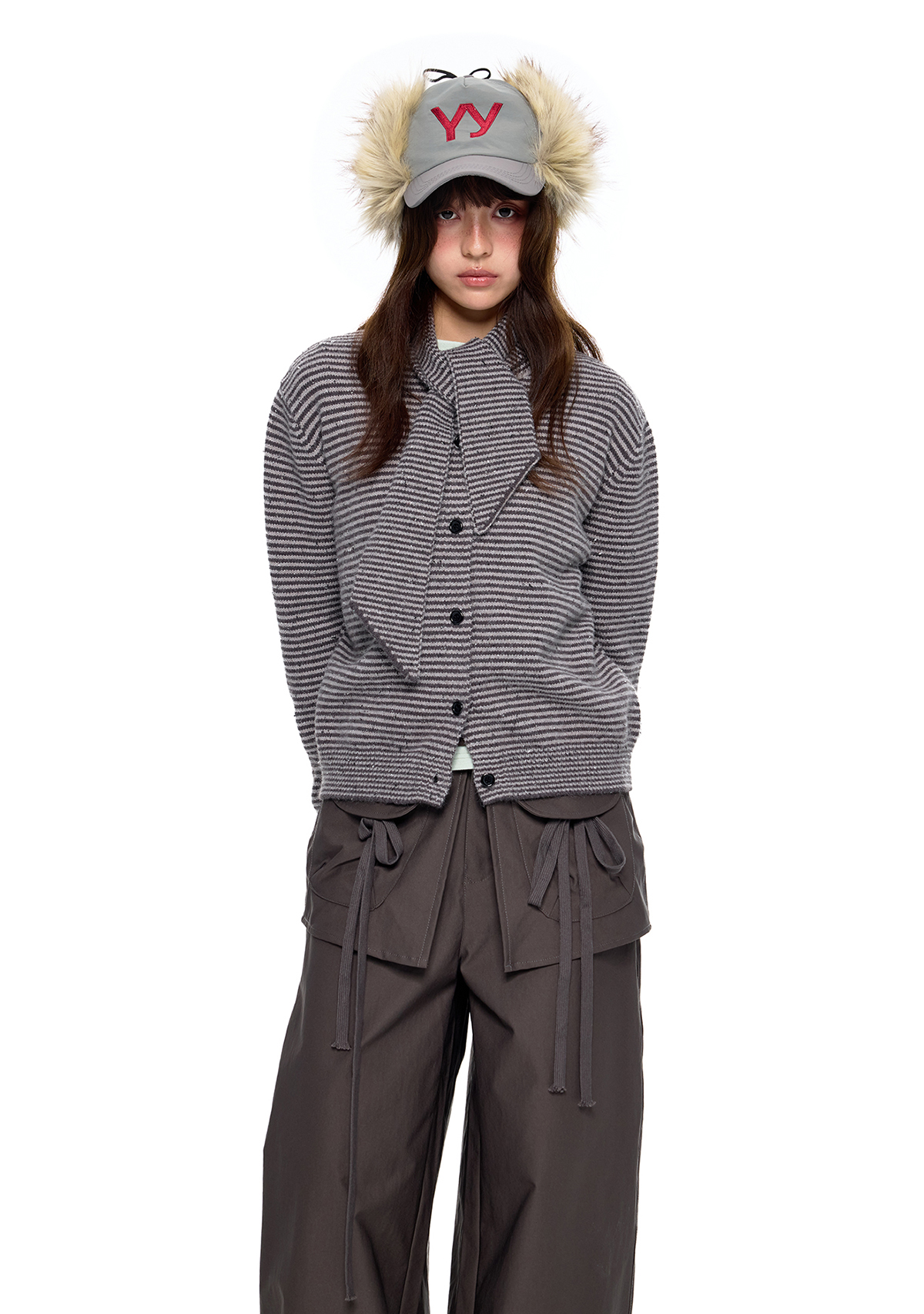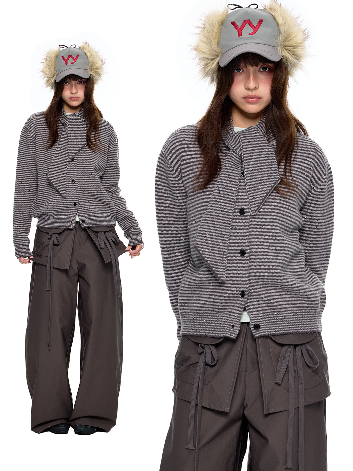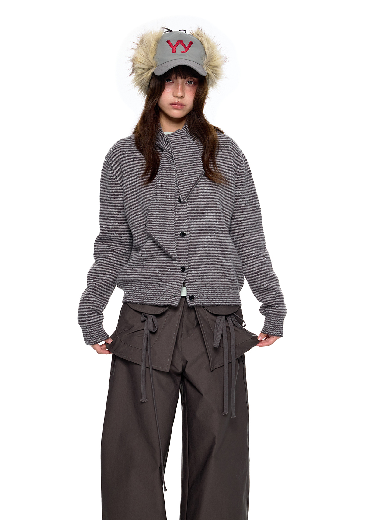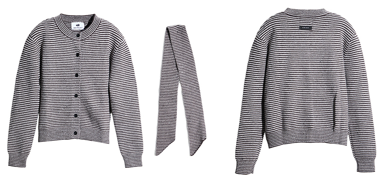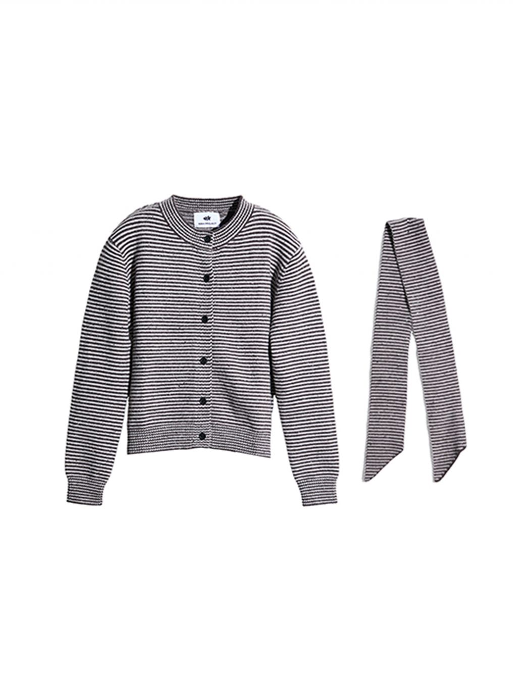 잔잔한 스트라이프 패턴과 부드러운 니트 텍스처로 클래식한 감성과 여유로운 실루엣을 동시에 담아낸 스카프 세트 가디건입니다.