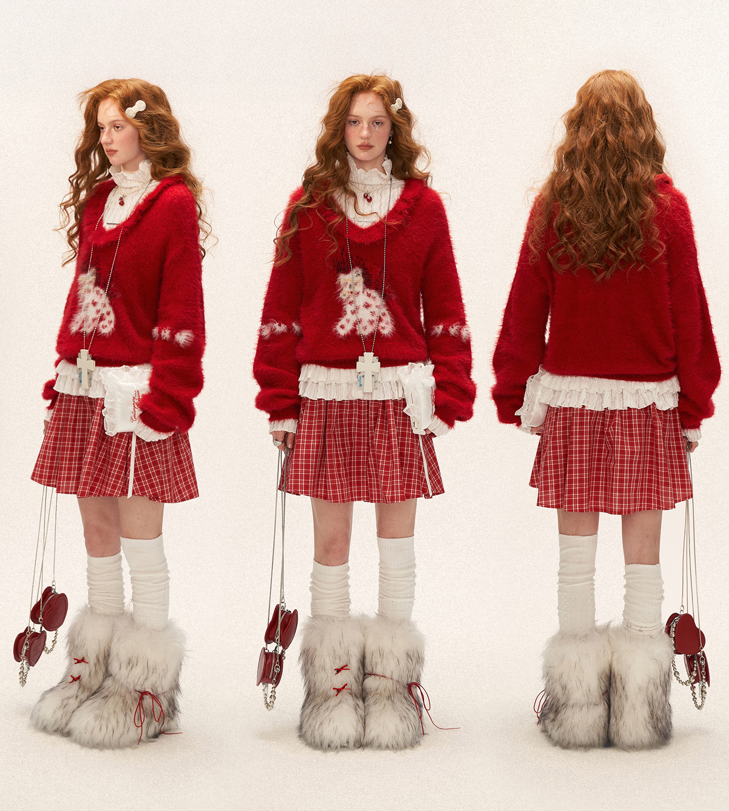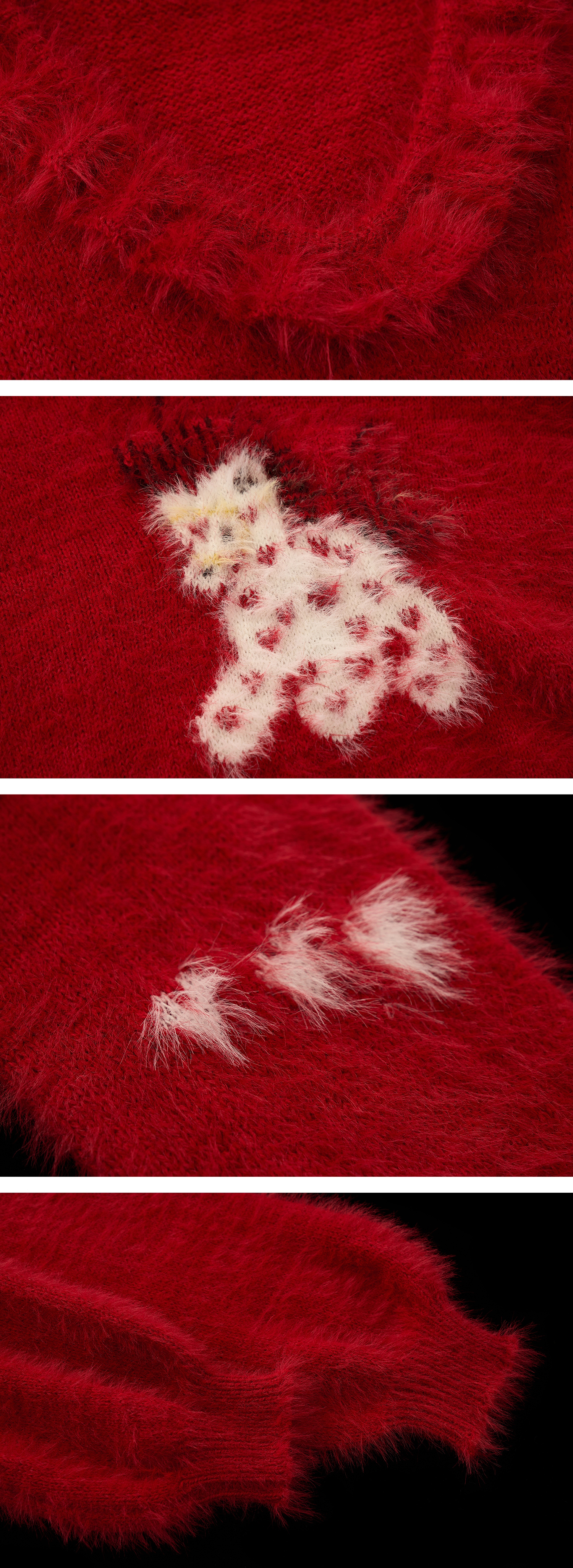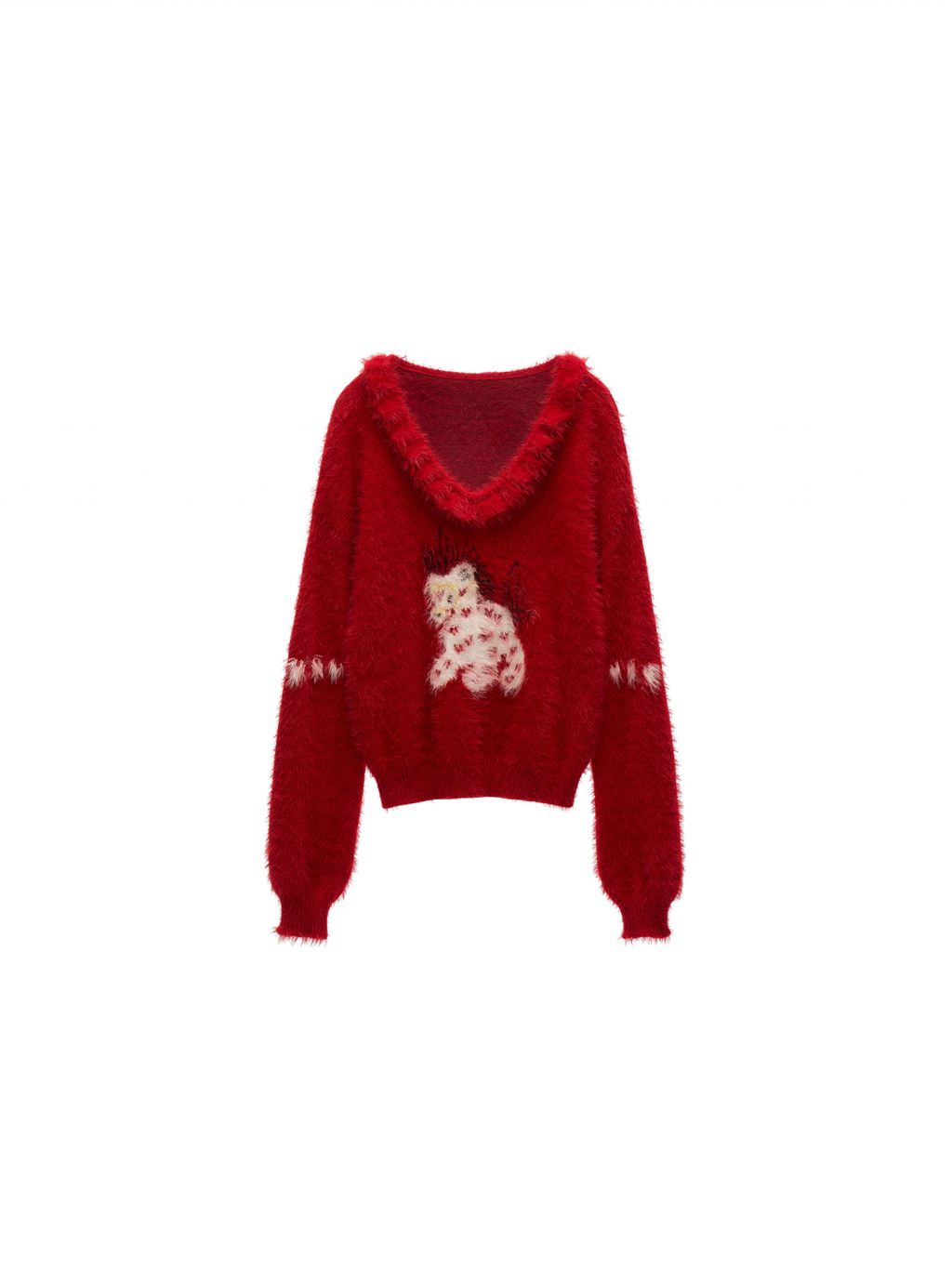 사랑스러운 포니 패턴과 풍성한 헤어리 텍스처로 포근한 무드를 완성한 하트 포니 퍼지 니트 입니다.