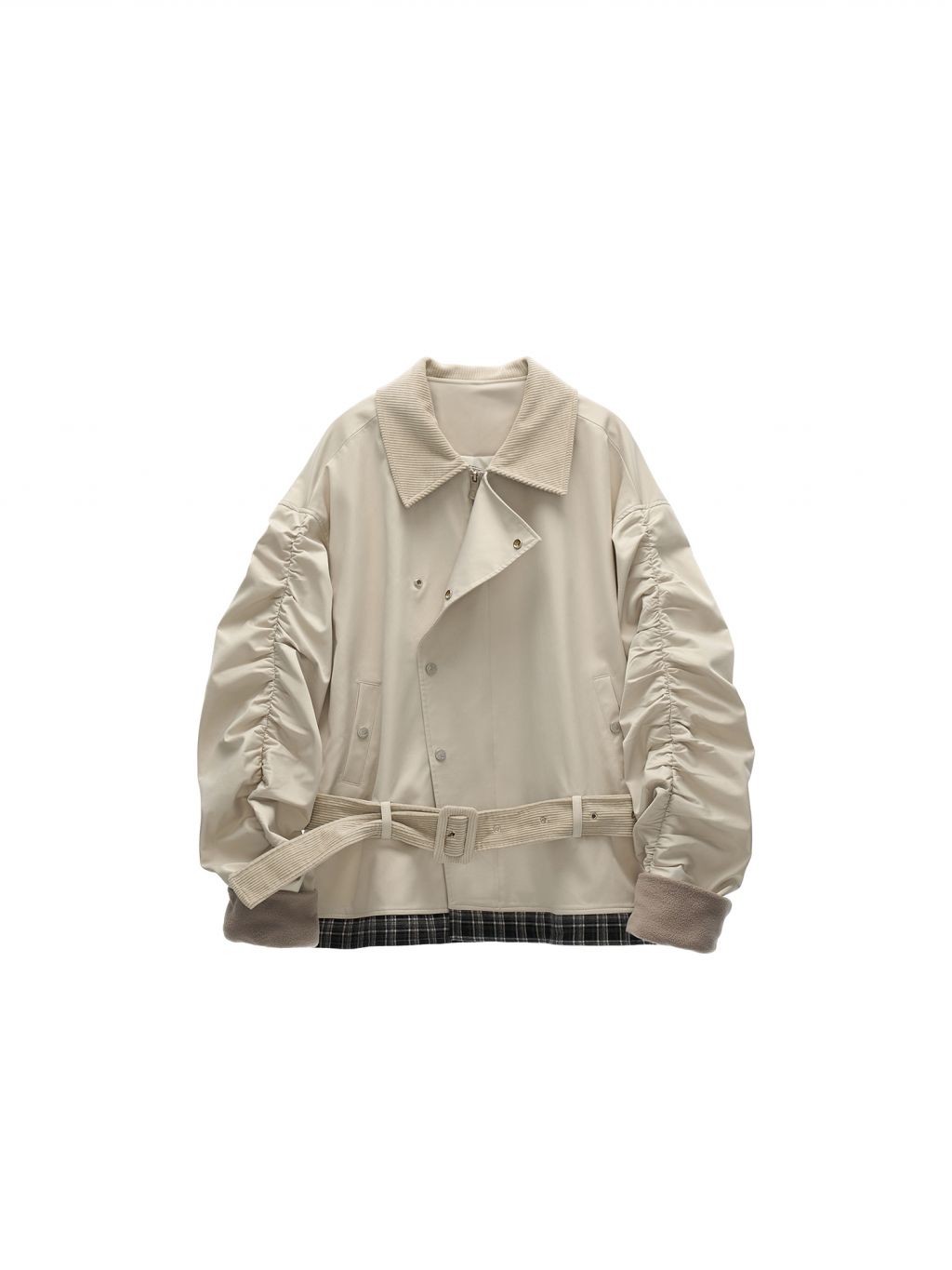 코듀로이 카라와 셔링 슬리브 디테일로 완성된 모던한 실루엣의 코트 자켓입니다.