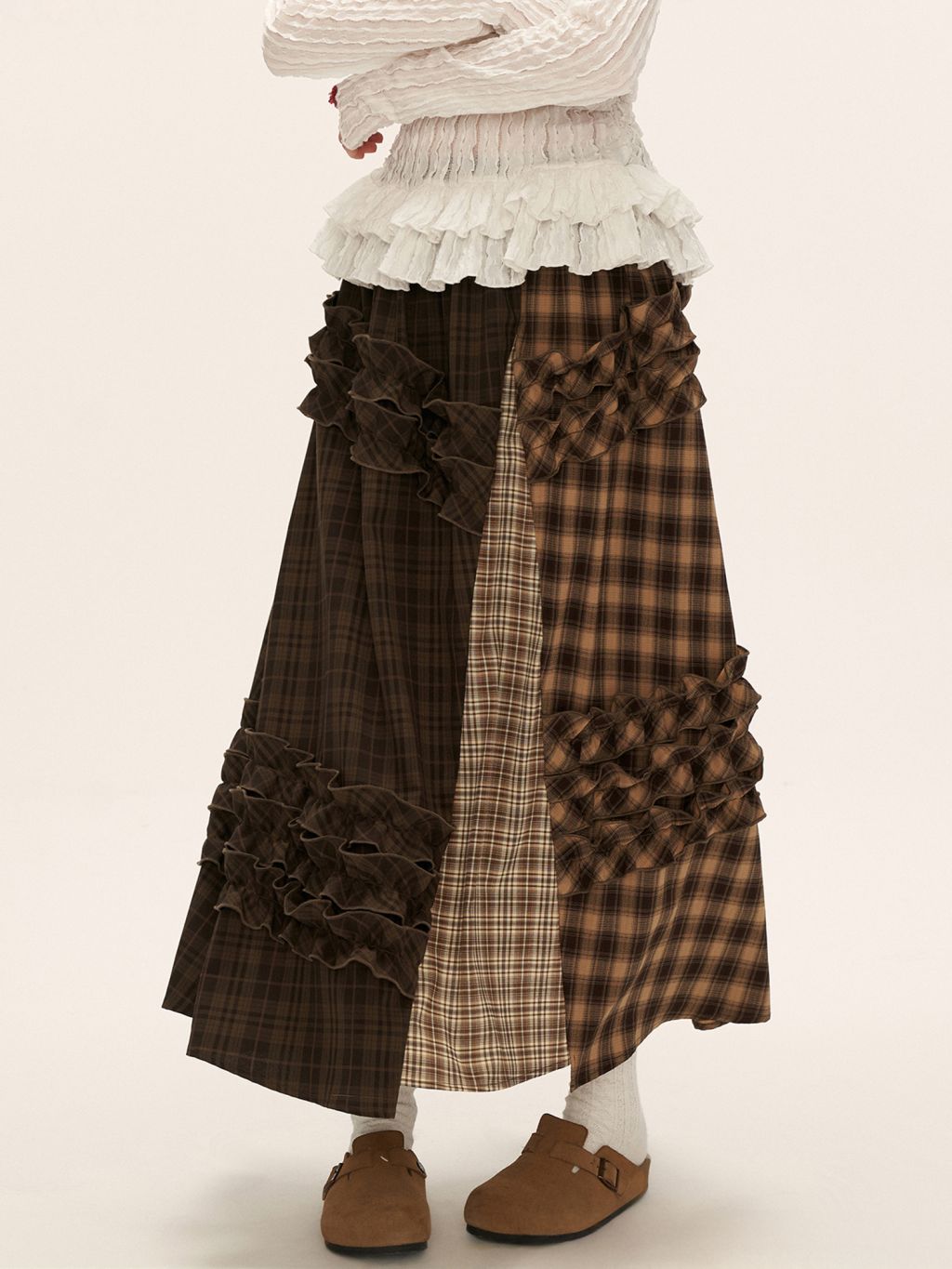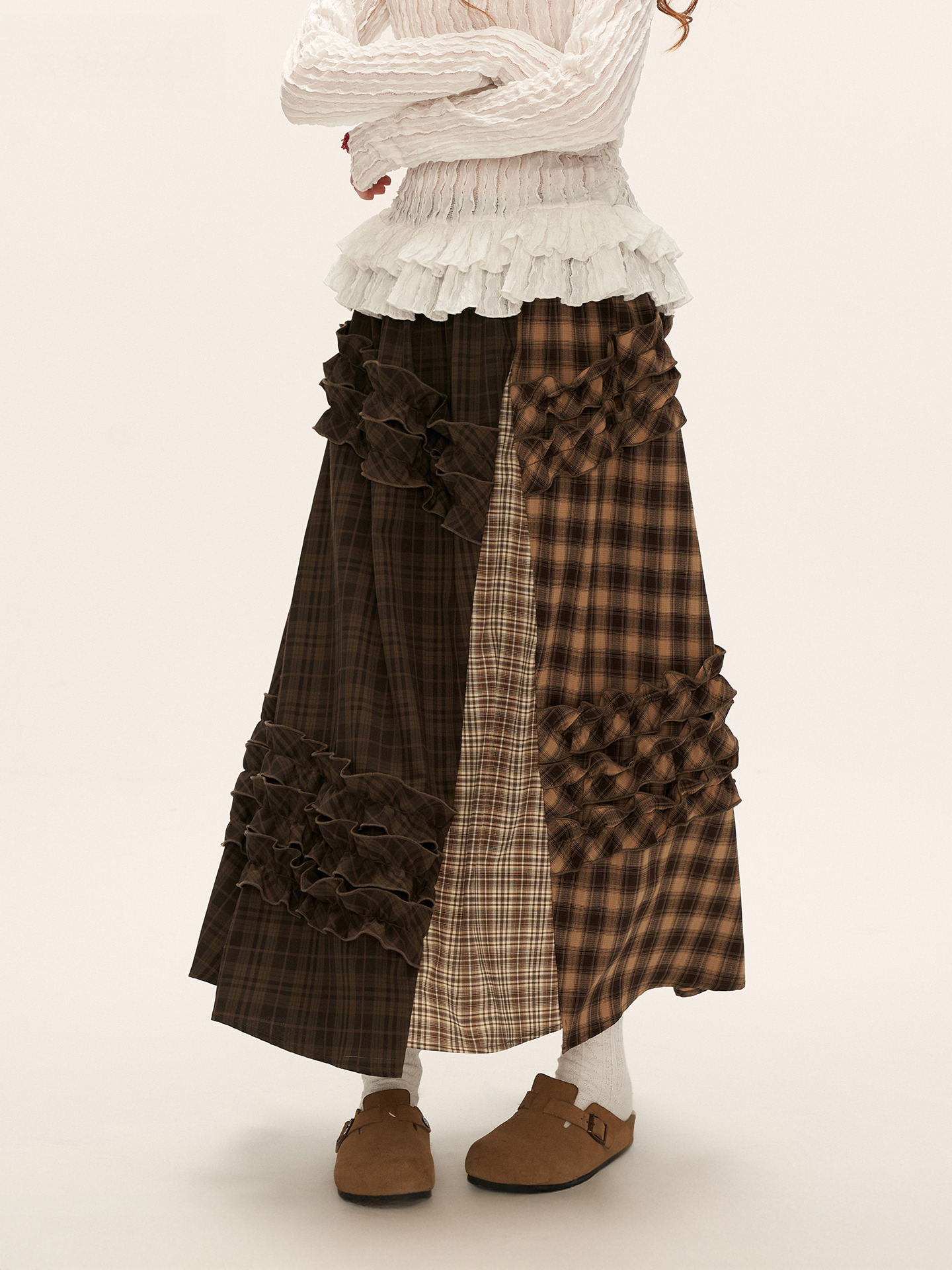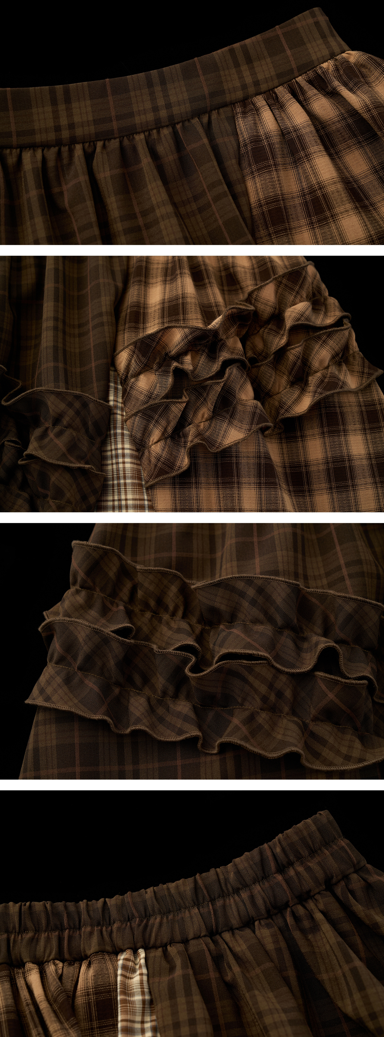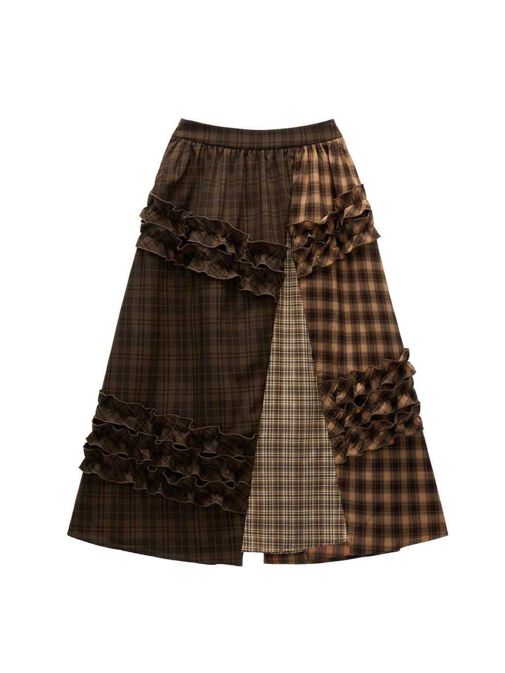 톤이 다른 브라운 체크 원단을 믹스해 입체적인 컬러 밸런스와 풍성한 러플 디테일을 완성한 모카 러플 체크 스커트입니다.