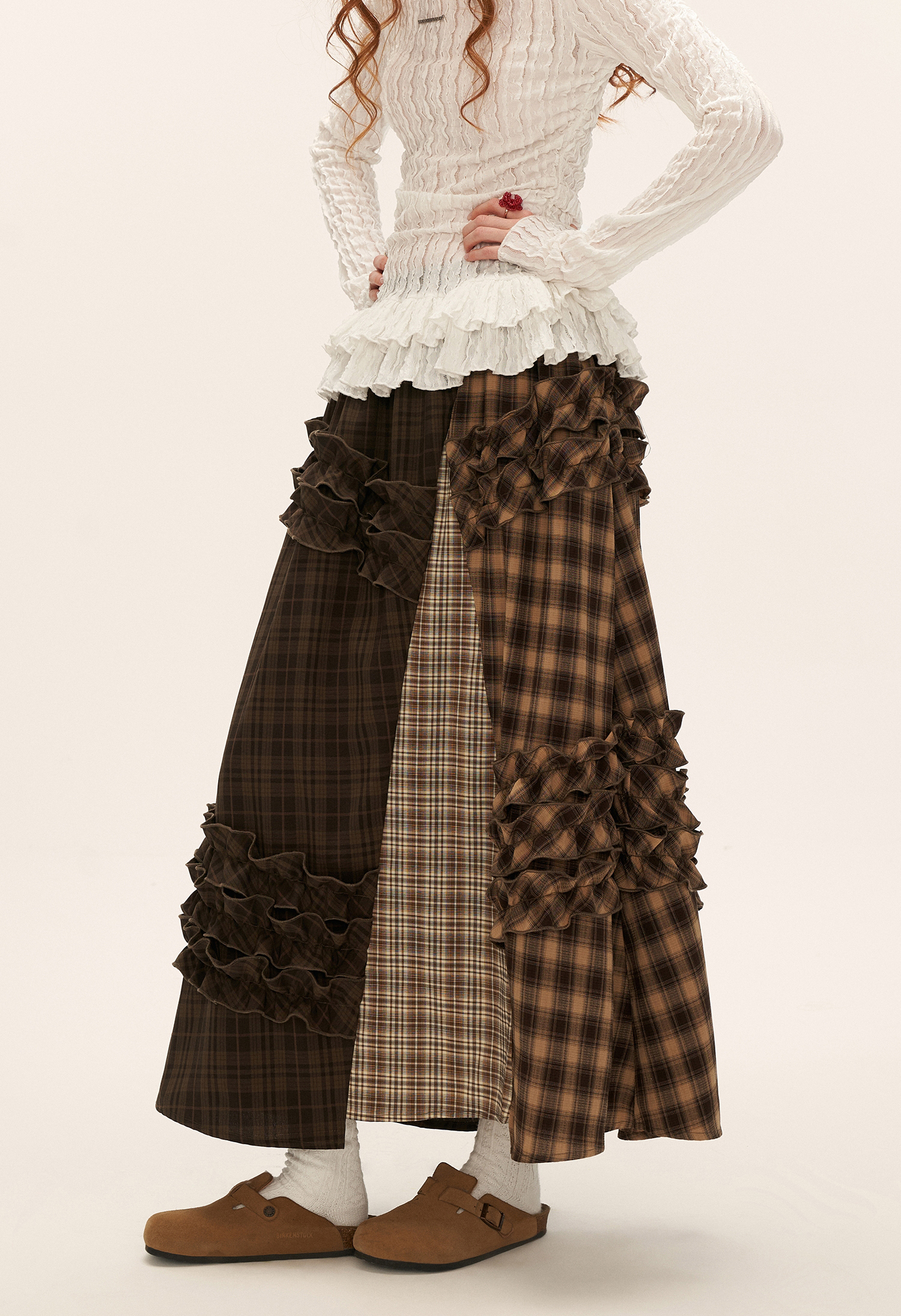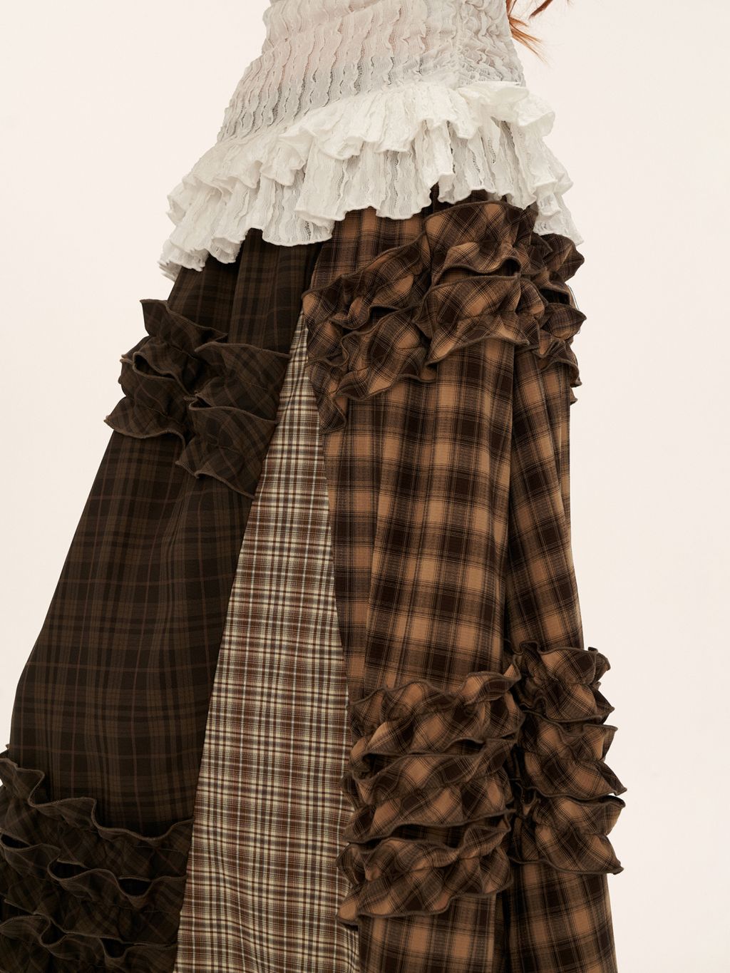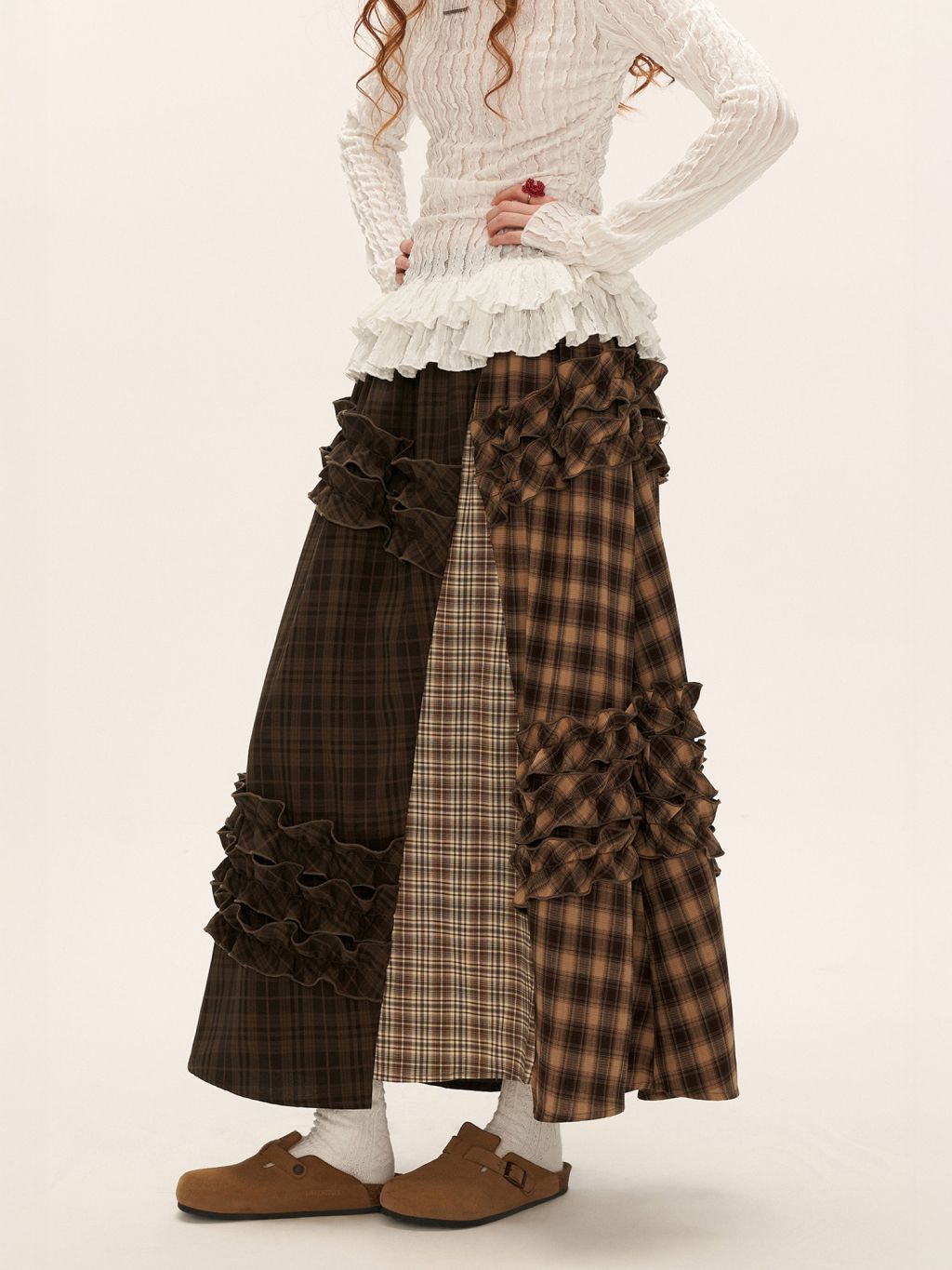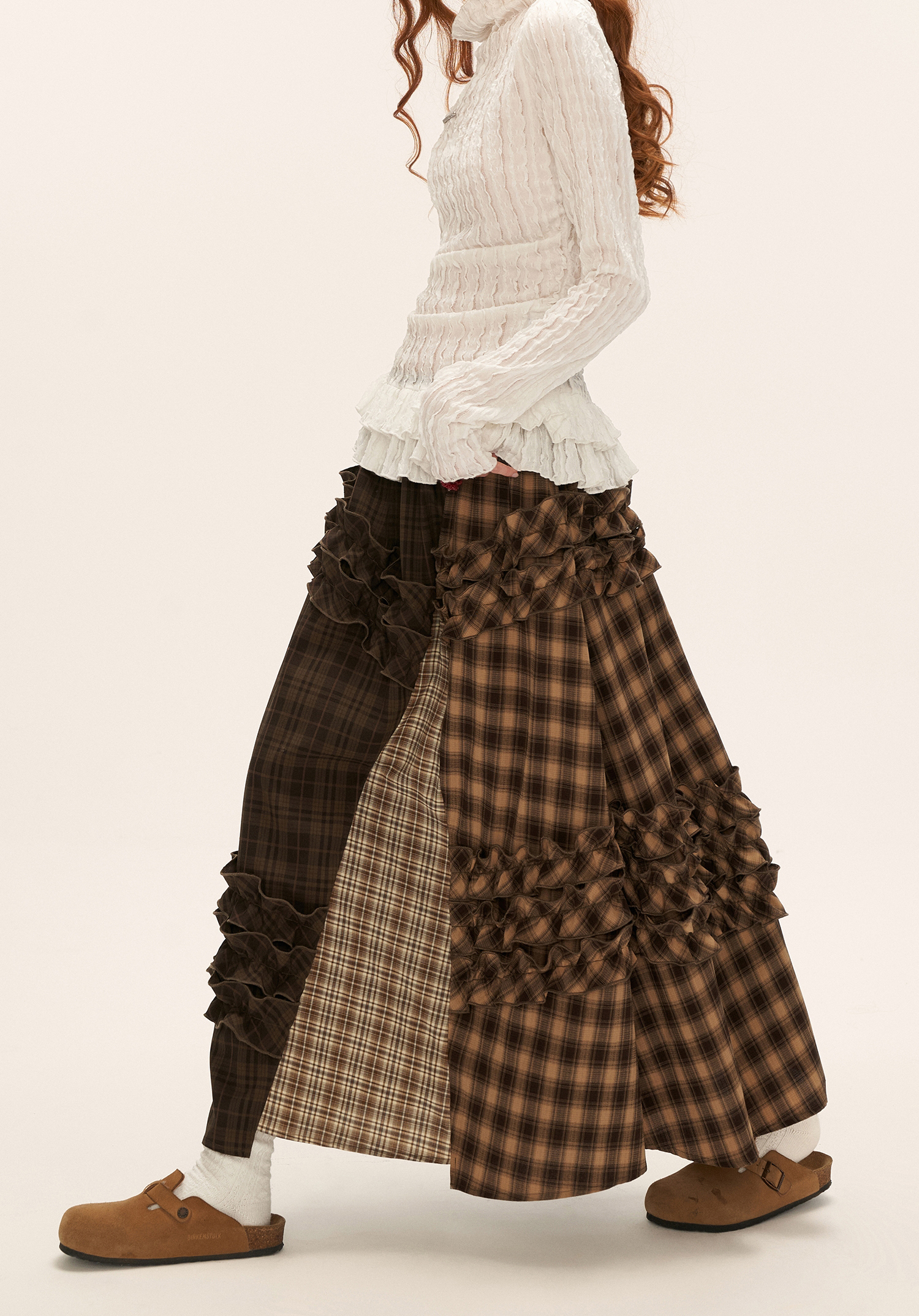 톤이 다른 브라운 체크 원단을 믹스해 입체적인 컬러 밸런스와 풍성한 러플 디테일을 완성한 모카 러플 체크 스커트입니다.