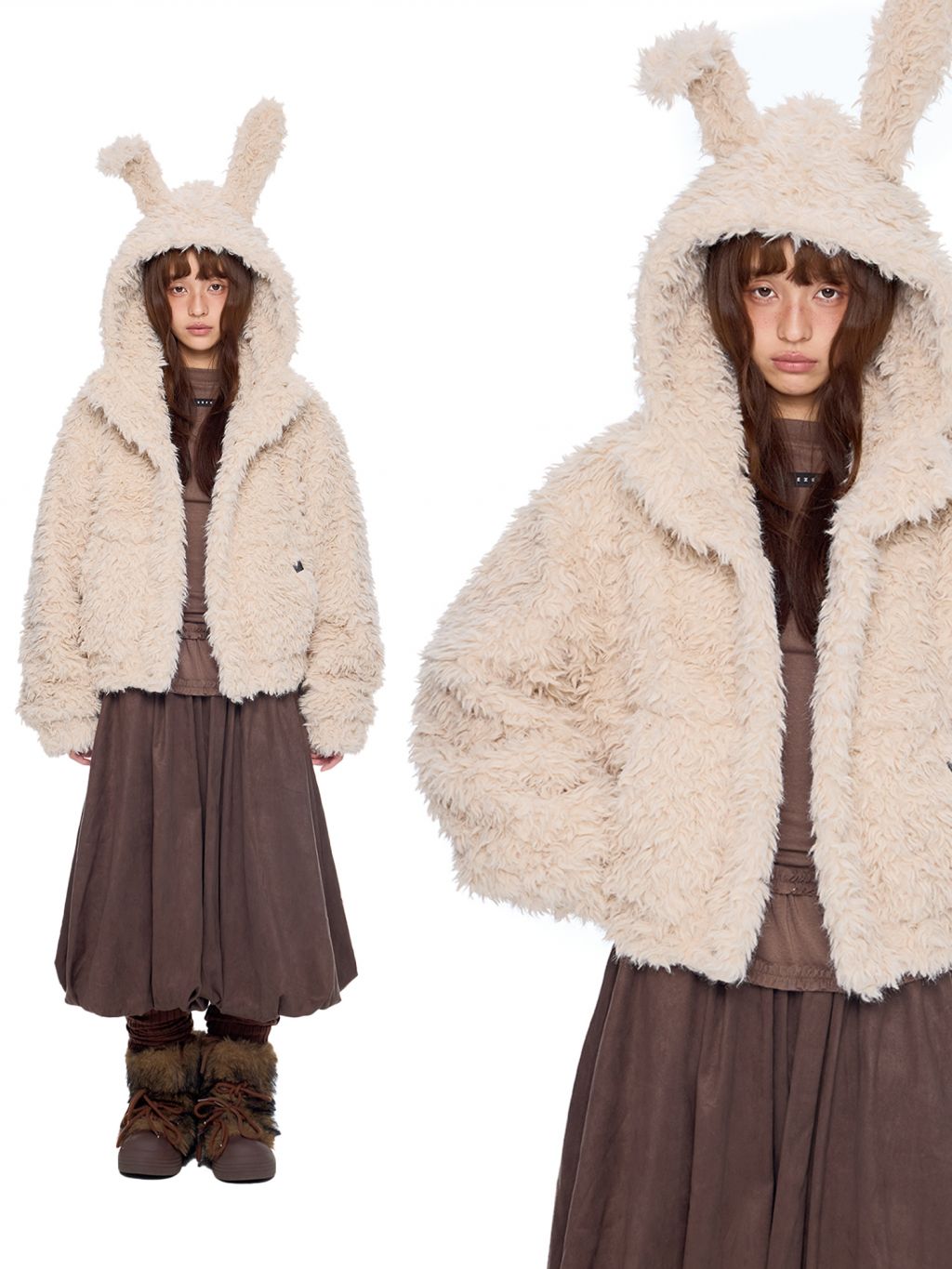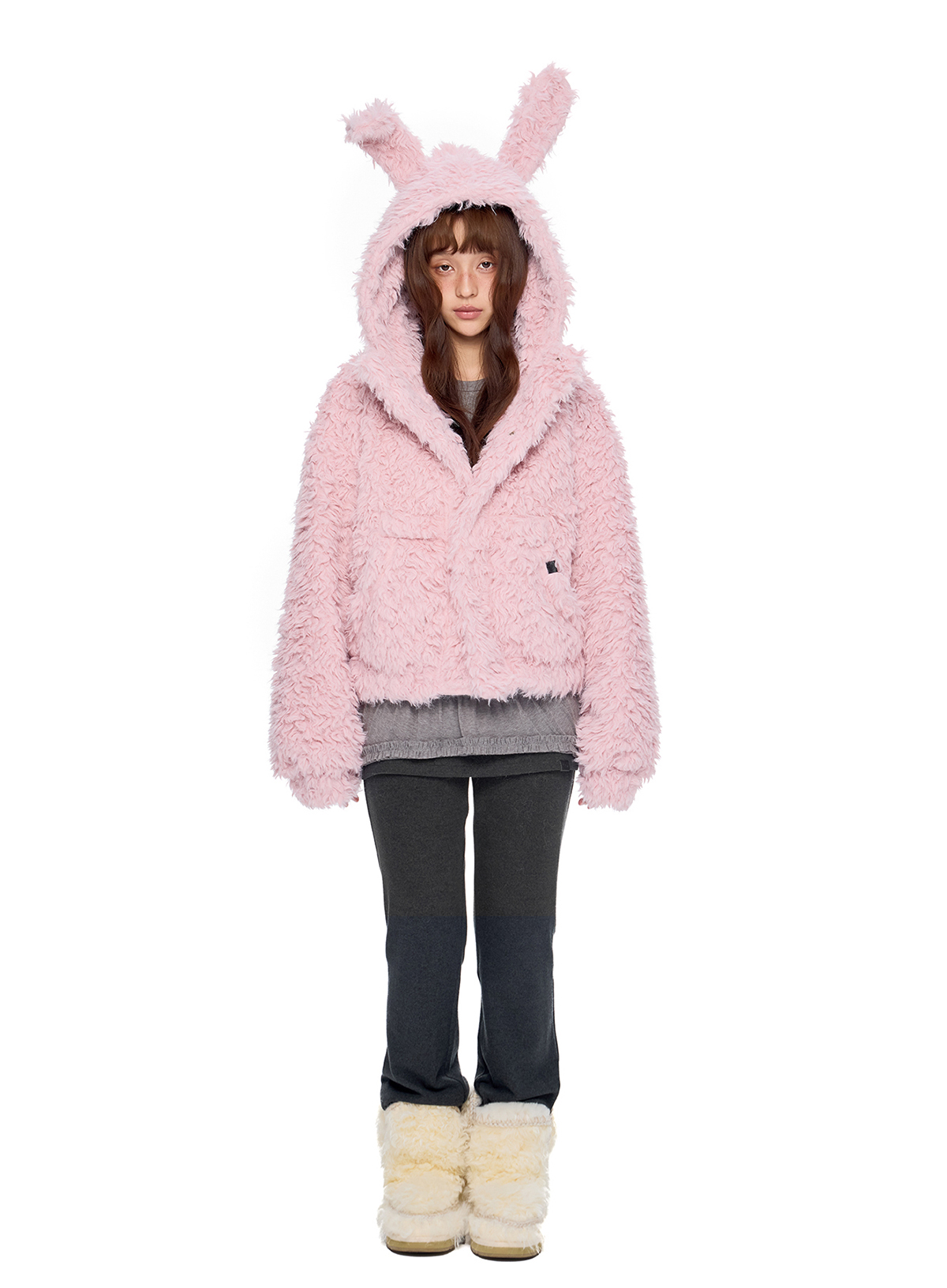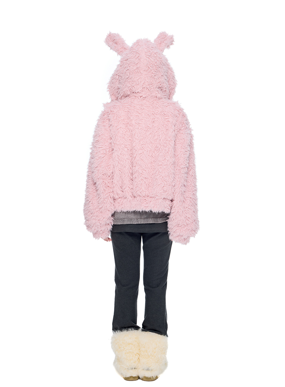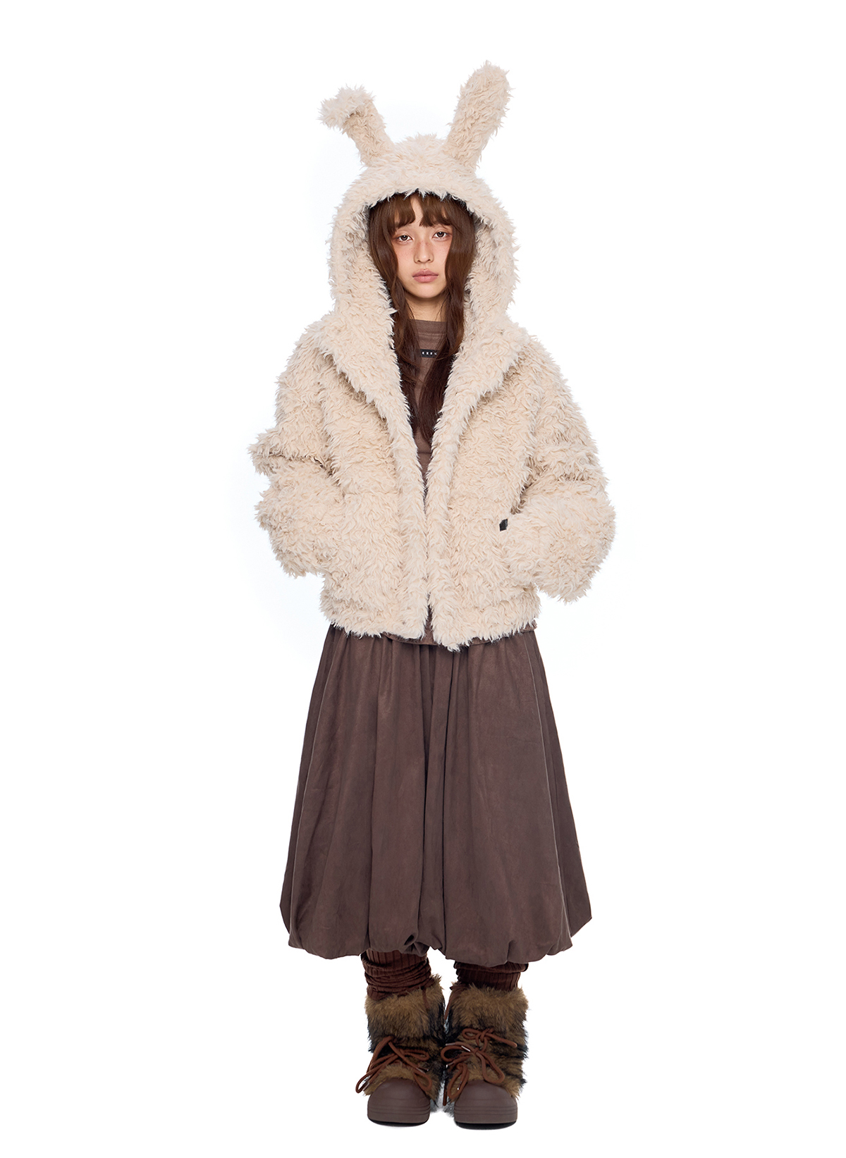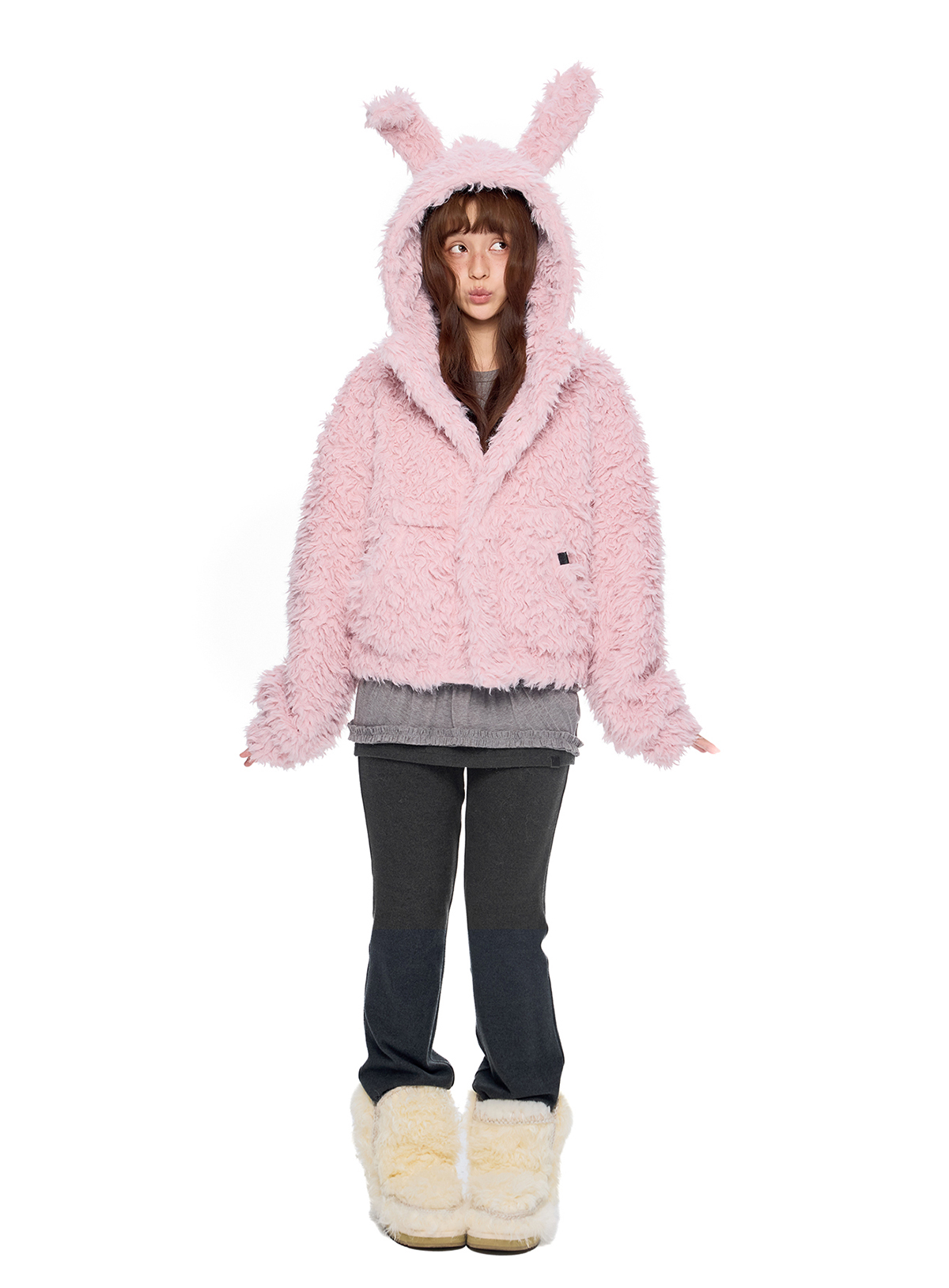 폭신한 퍼 텍스처와 귀여운 버니 후드로 사랑스러운 겨울 무드를 완성한 버니 플러프 퍼 자켓입니다.