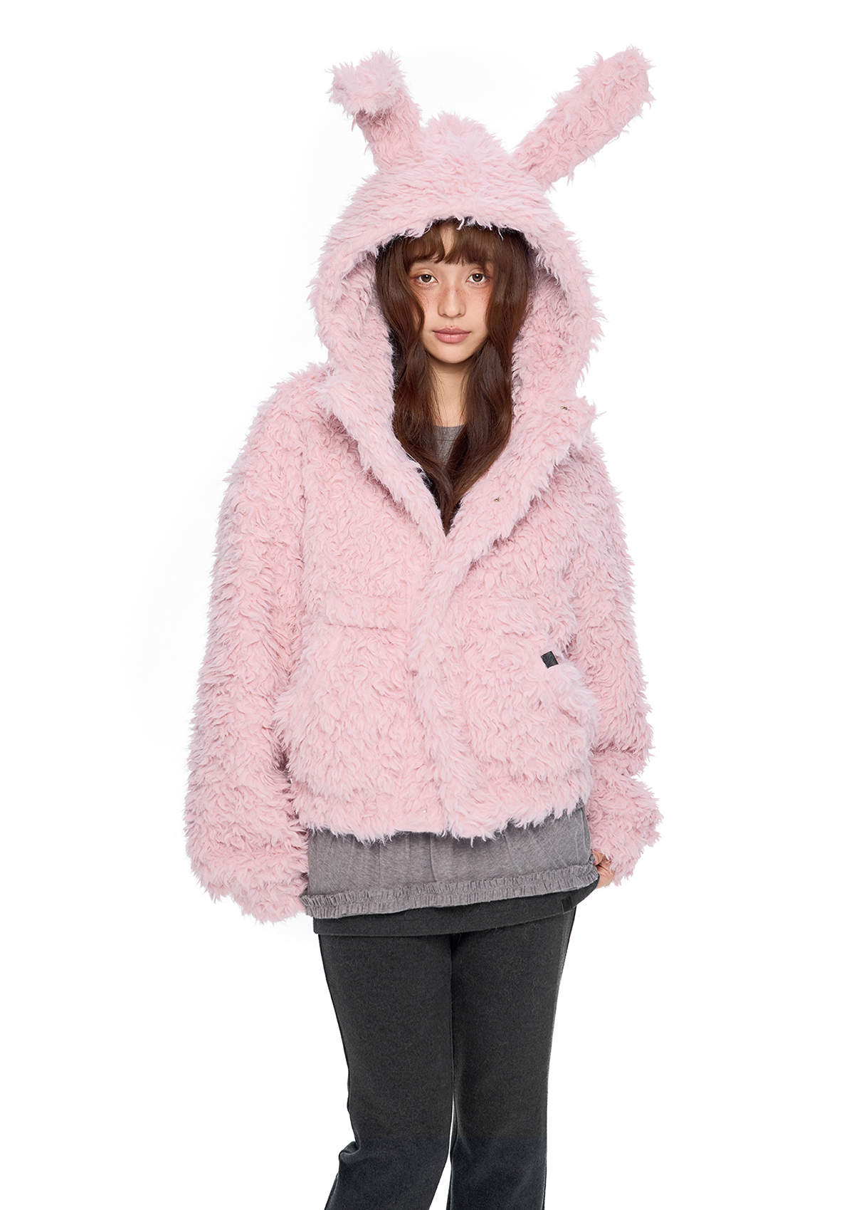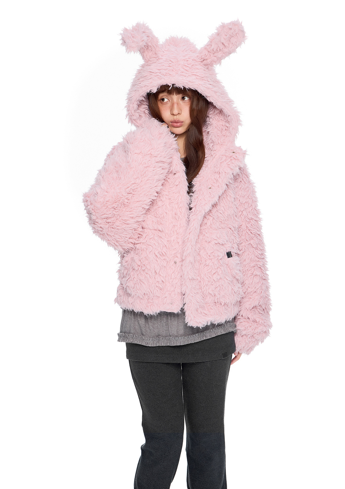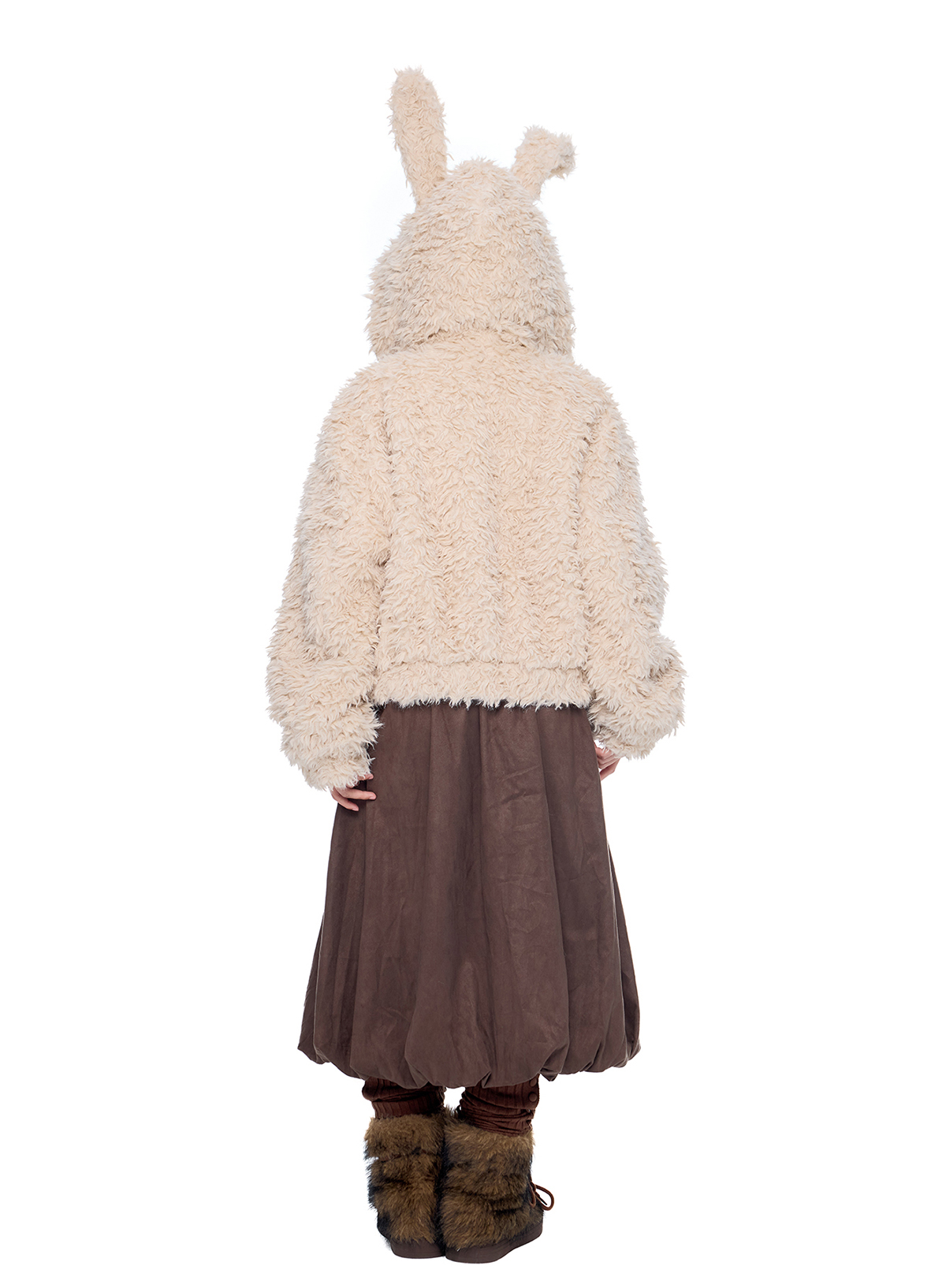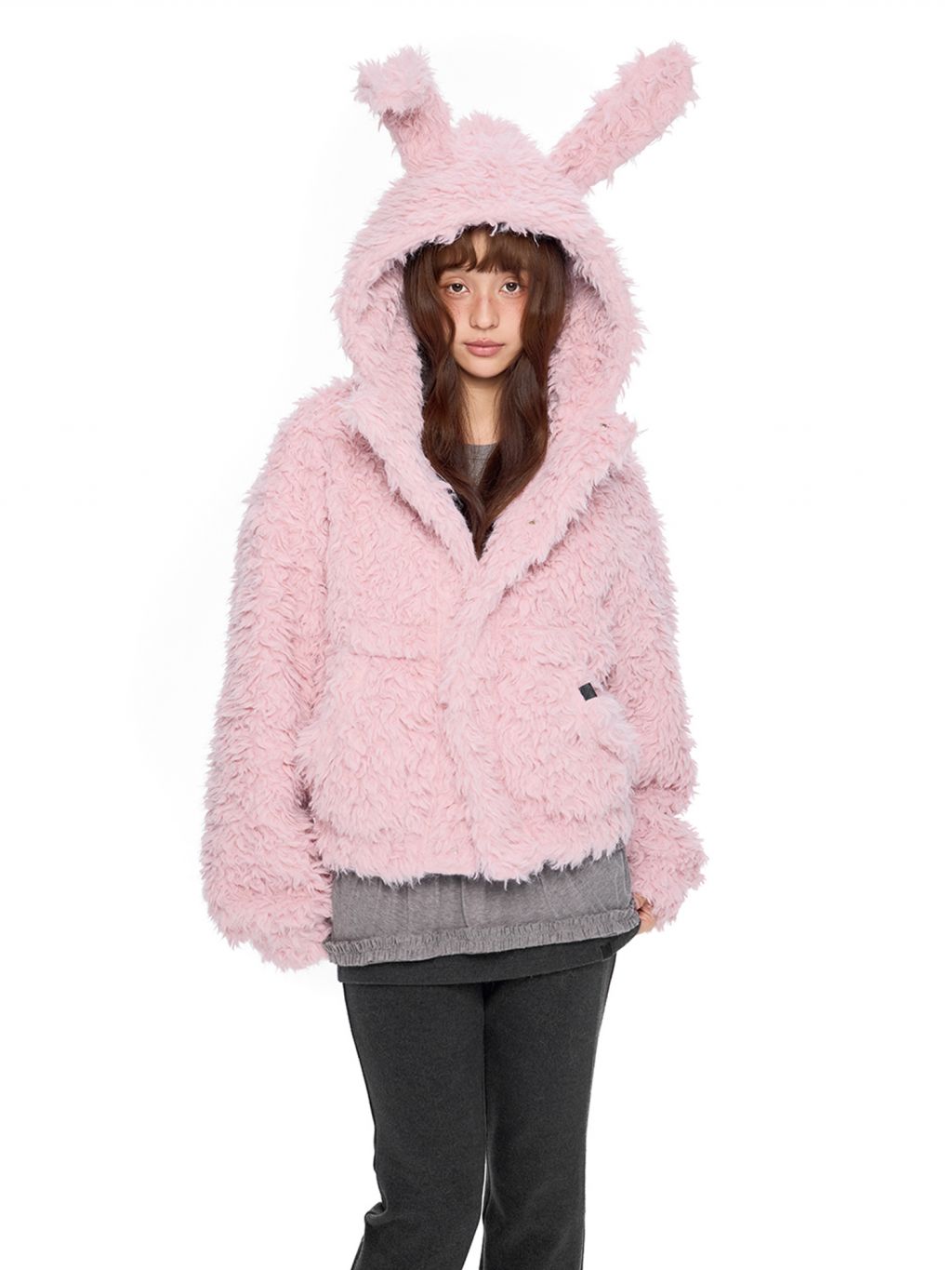 폭신한 퍼 텍스처와 귀여운 버니 후드로 사랑스러운 겨울 무드를 완성한 버니 플러프 퍼 자켓입니다.