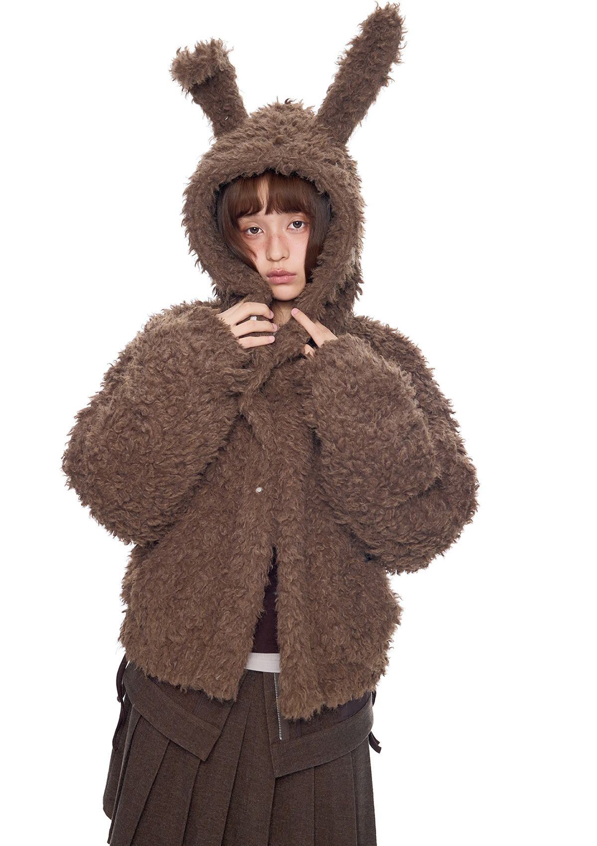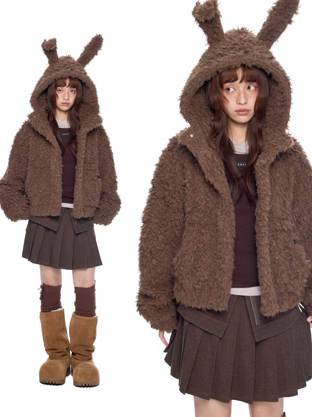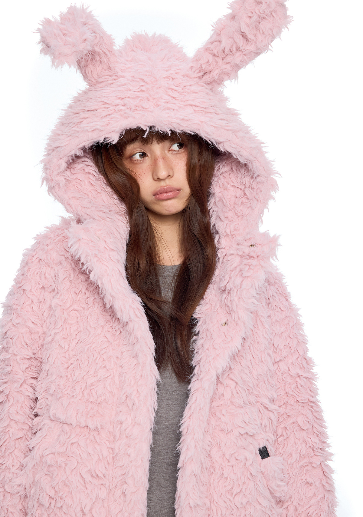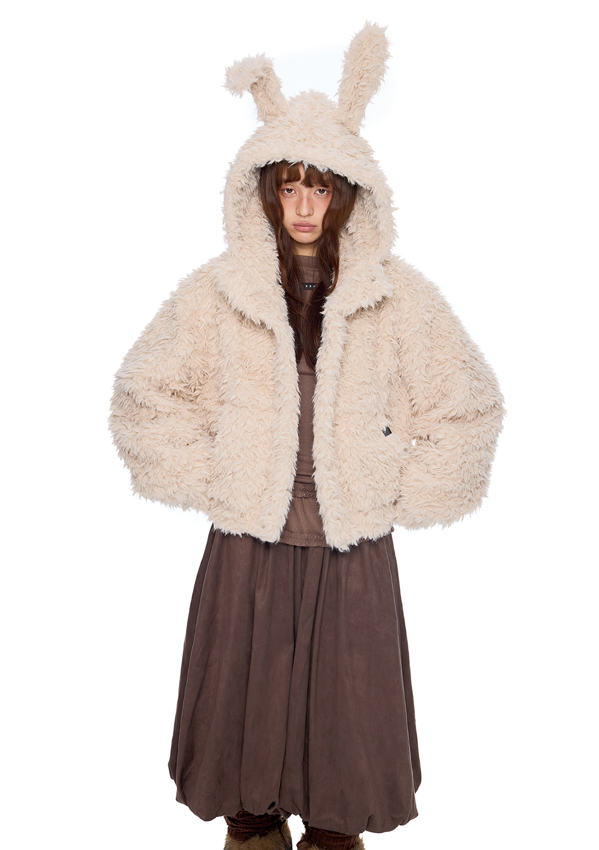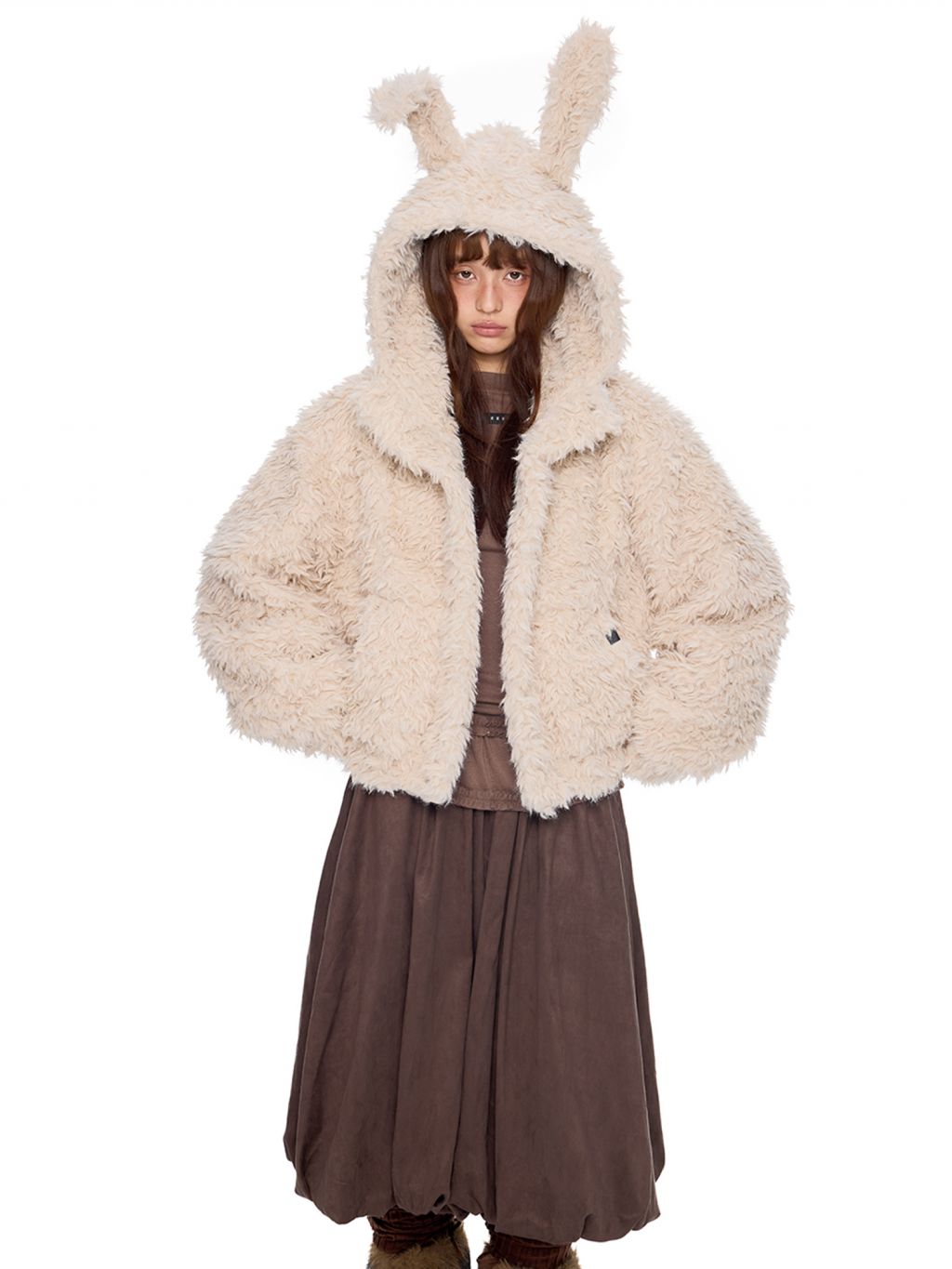 폭신한 퍼 텍스처와 귀여운 버니 후드로 사랑스러운 겨울 무드를 완성한 버니 플러프 퍼 자켓입니다.