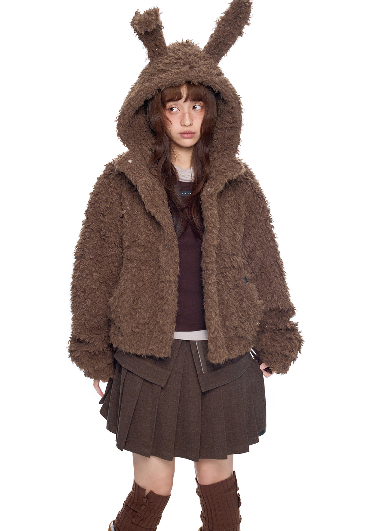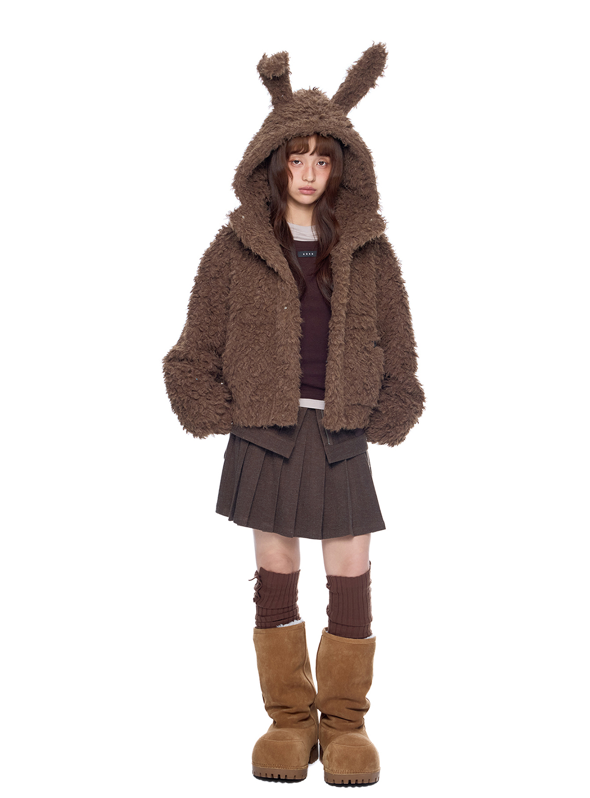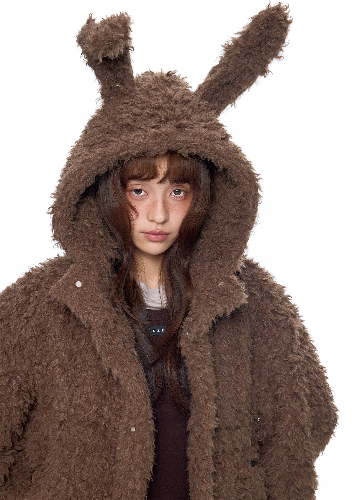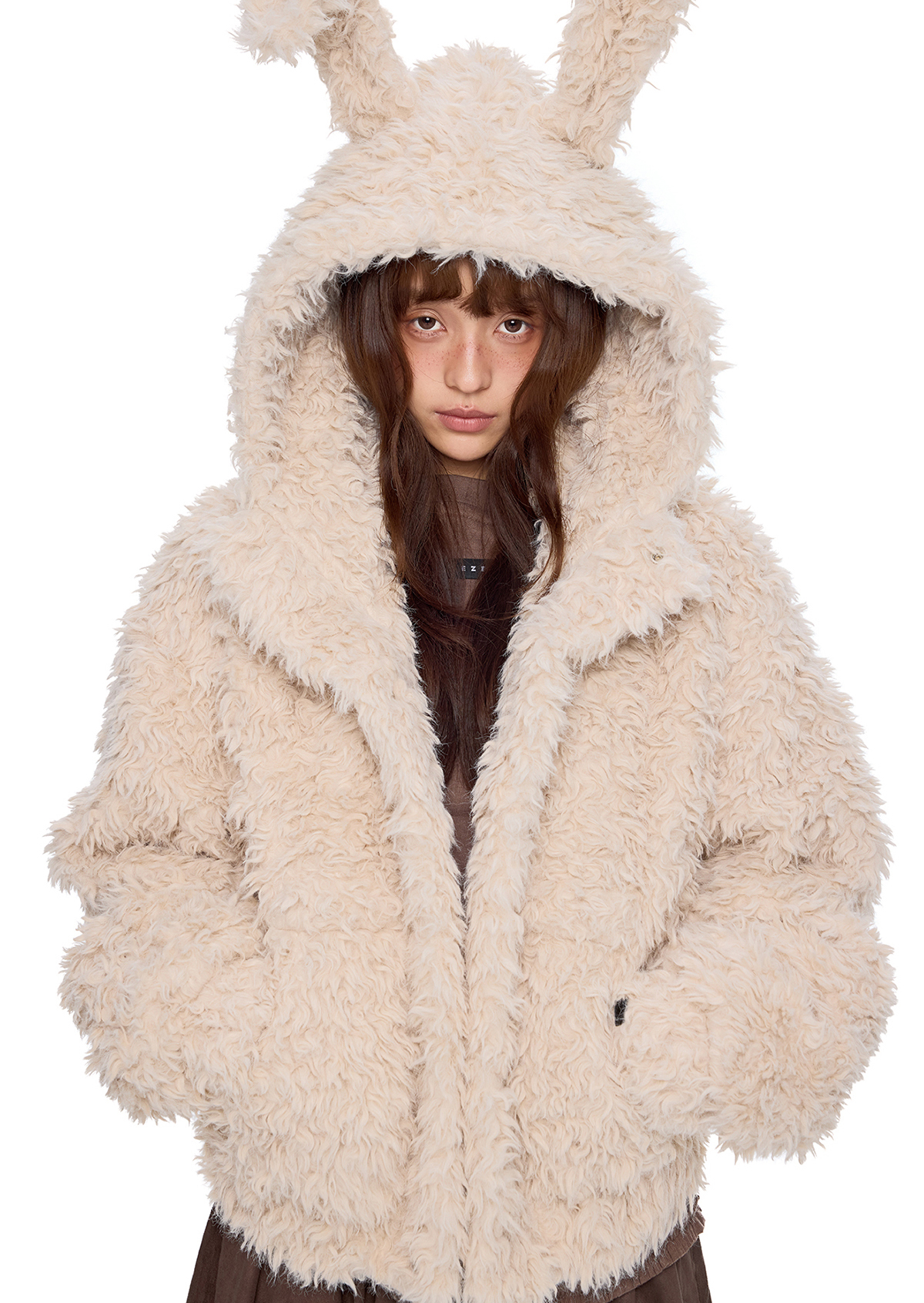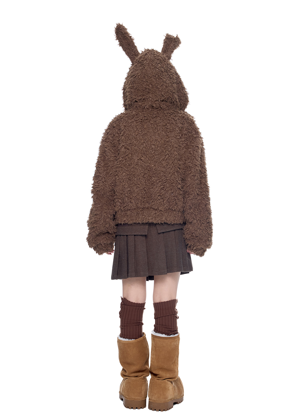 폭신한 퍼 텍스처와 귀여운 버니 후드로 사랑스러운 겨울 무드를 완성한 버니 플러프 퍼 자켓입니다.