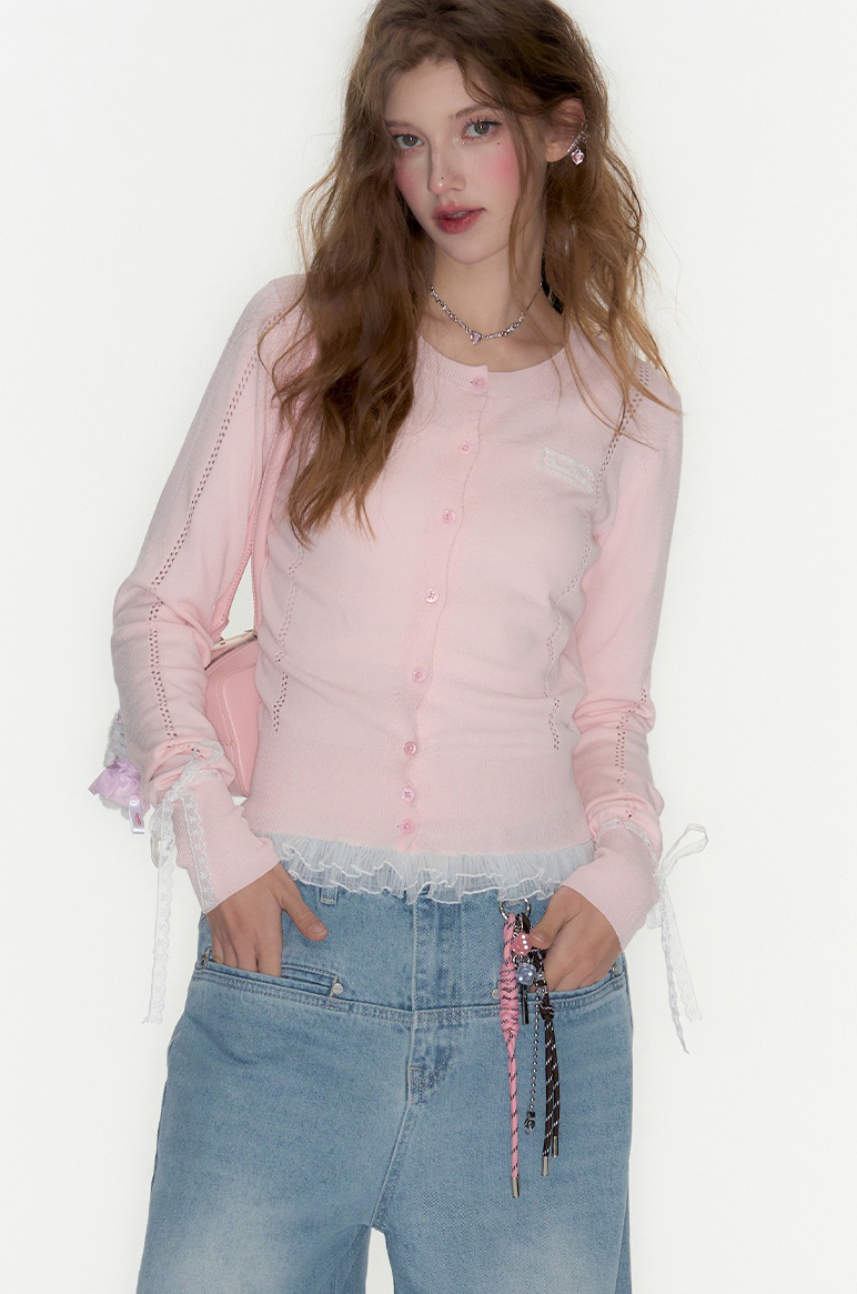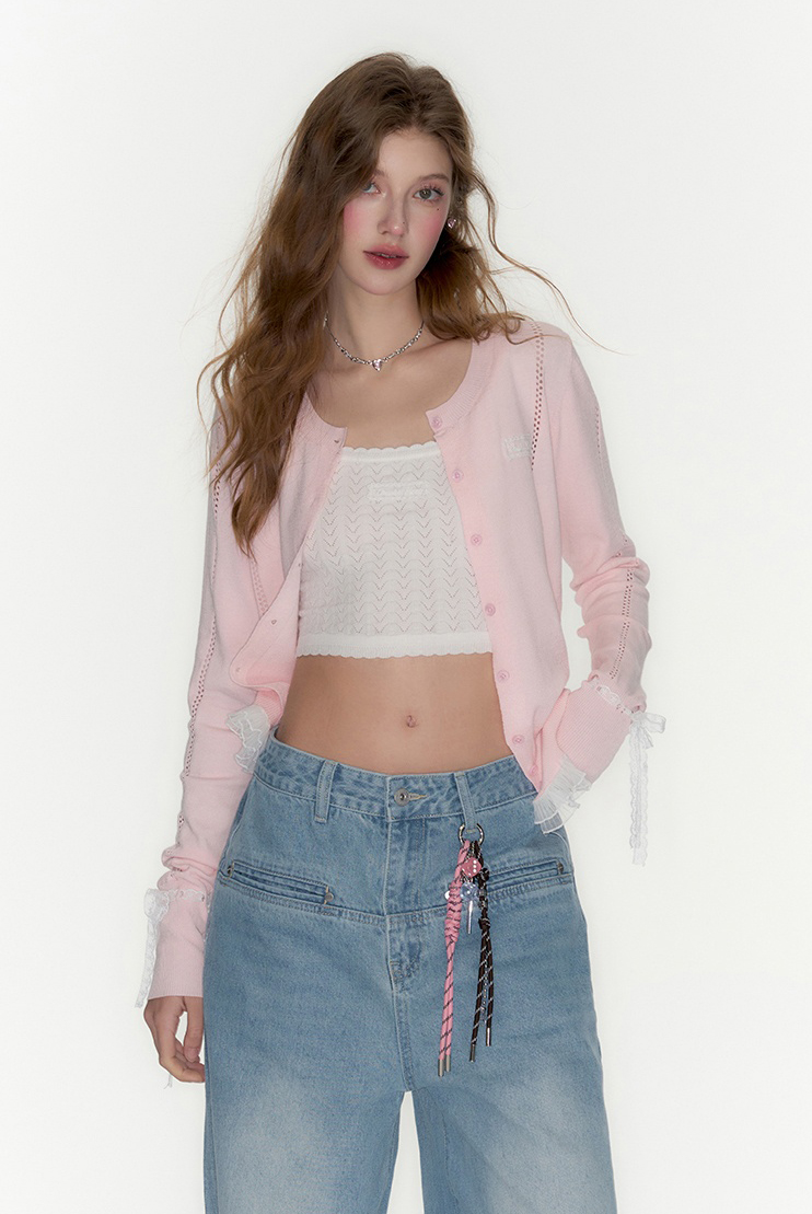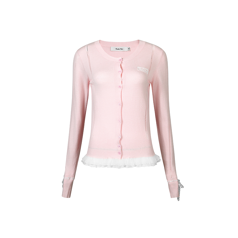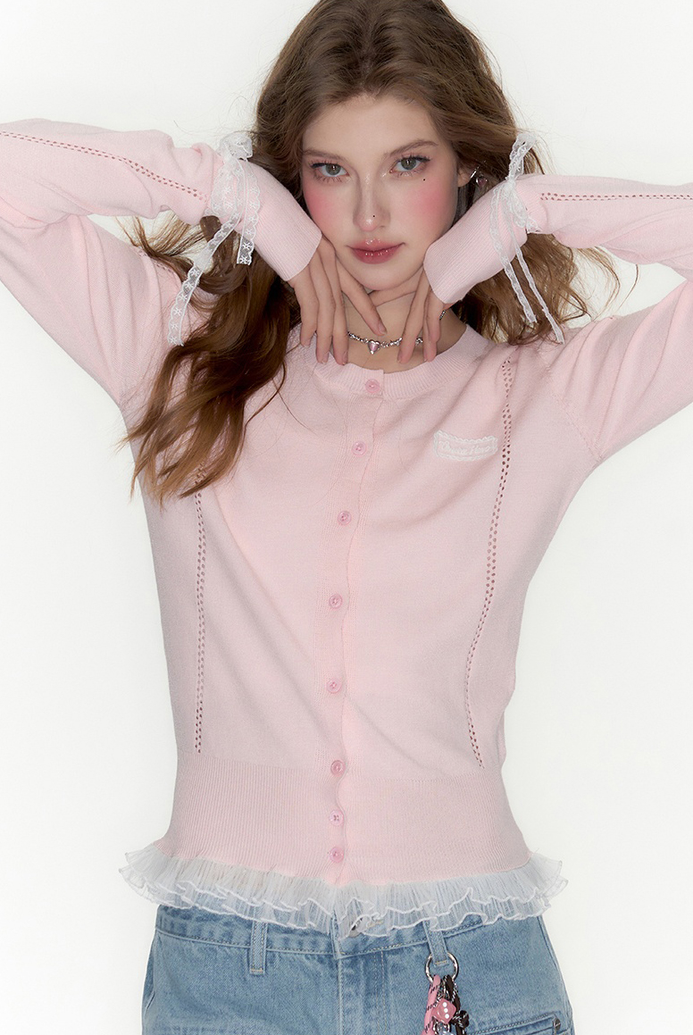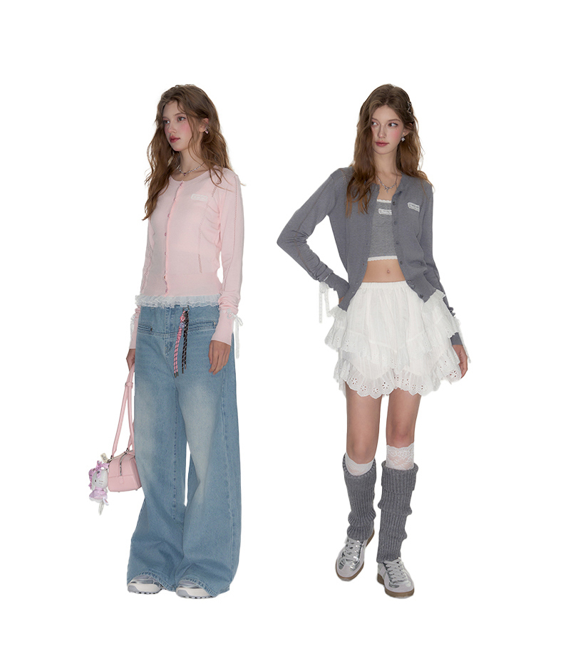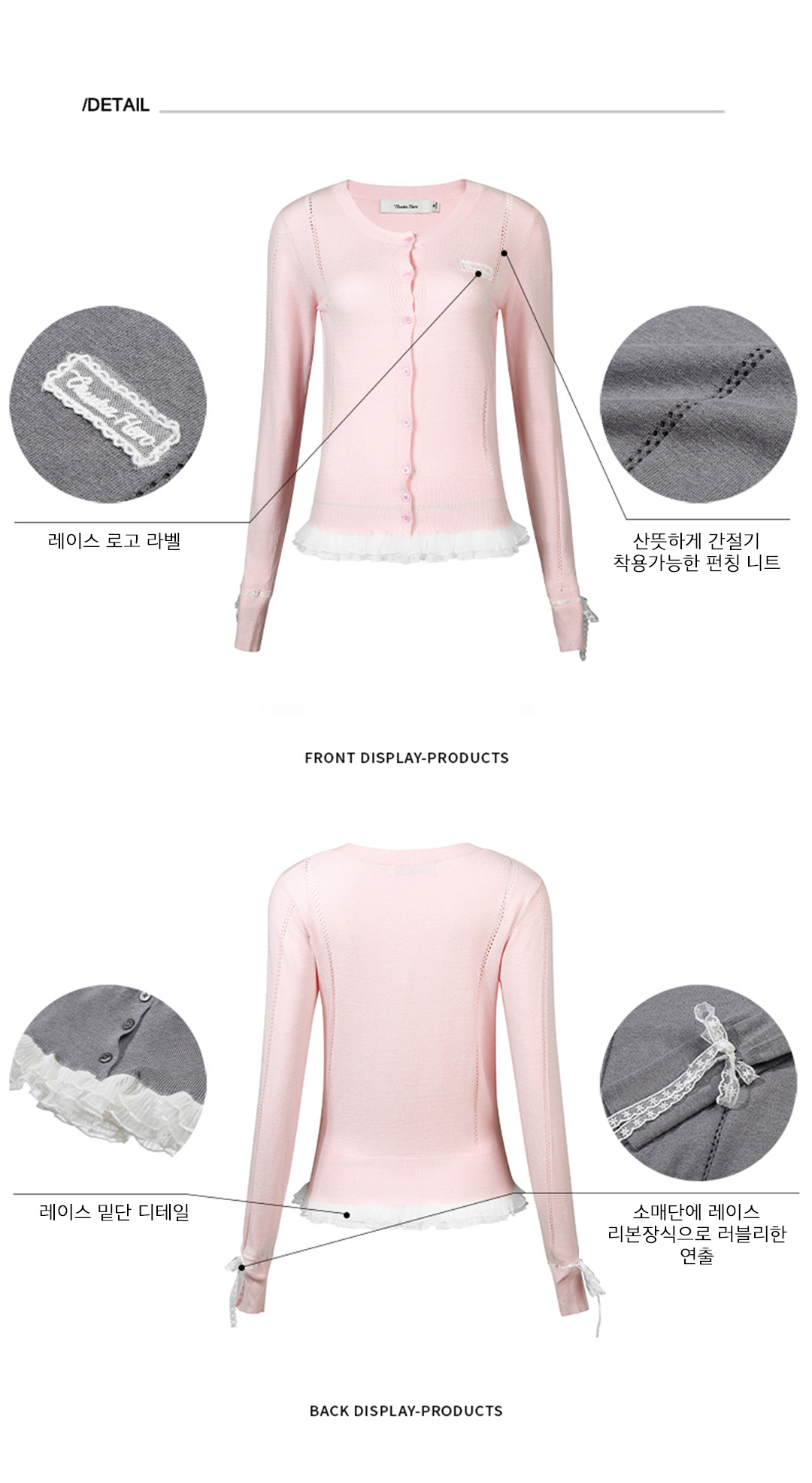 밑단과 소매의 레이스 디테일로 러블리한 무드를 연출하는 가디건