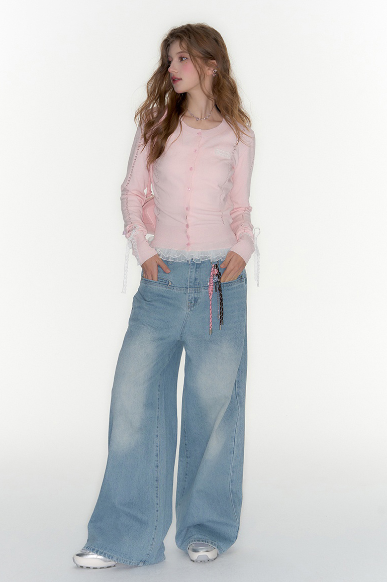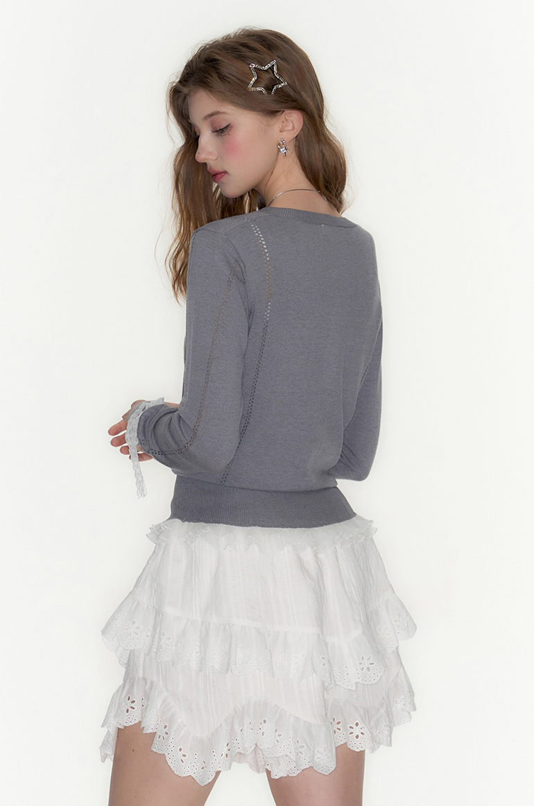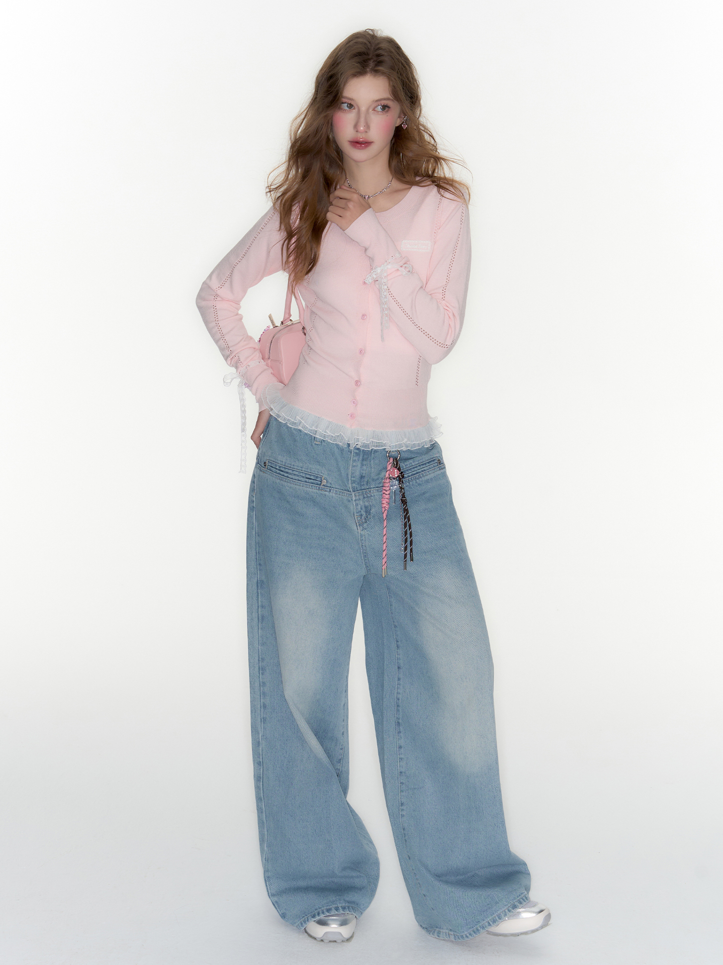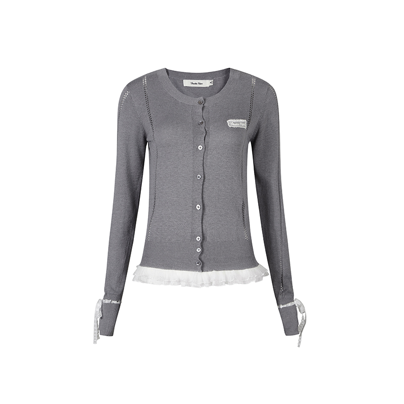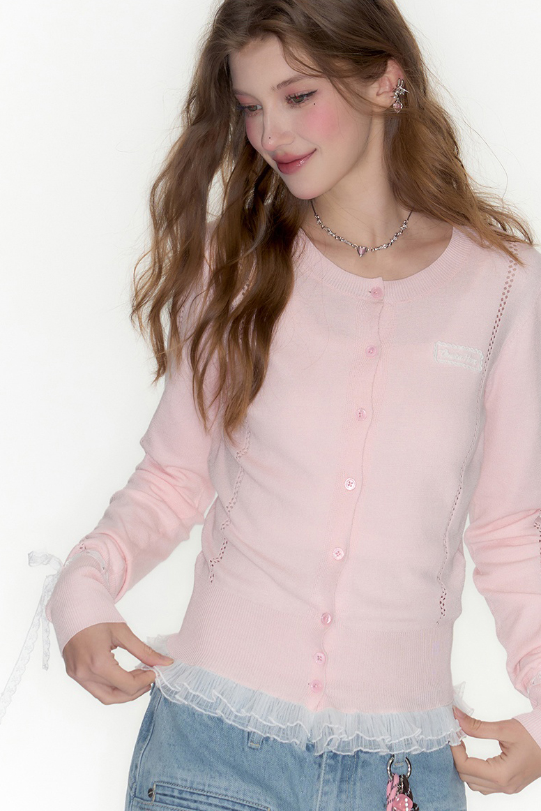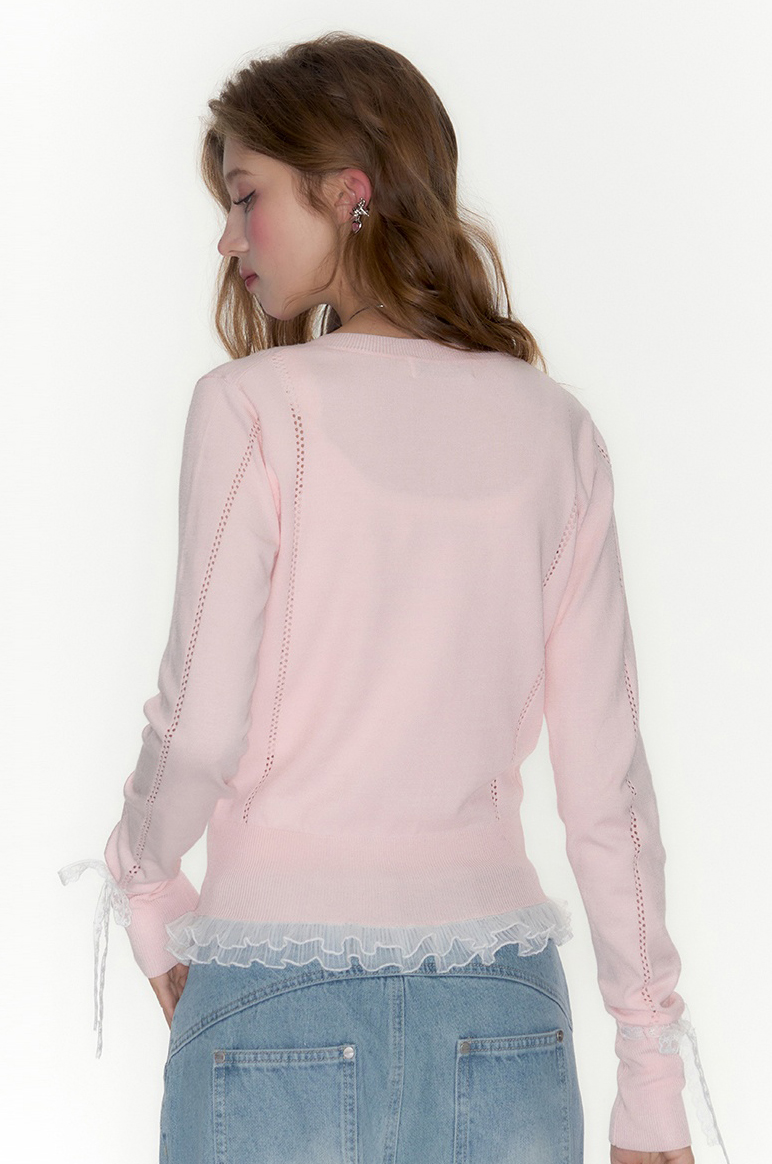 밑단과 소매의 레이스 디테일로 러블리한 무드를 연출하는 가디건