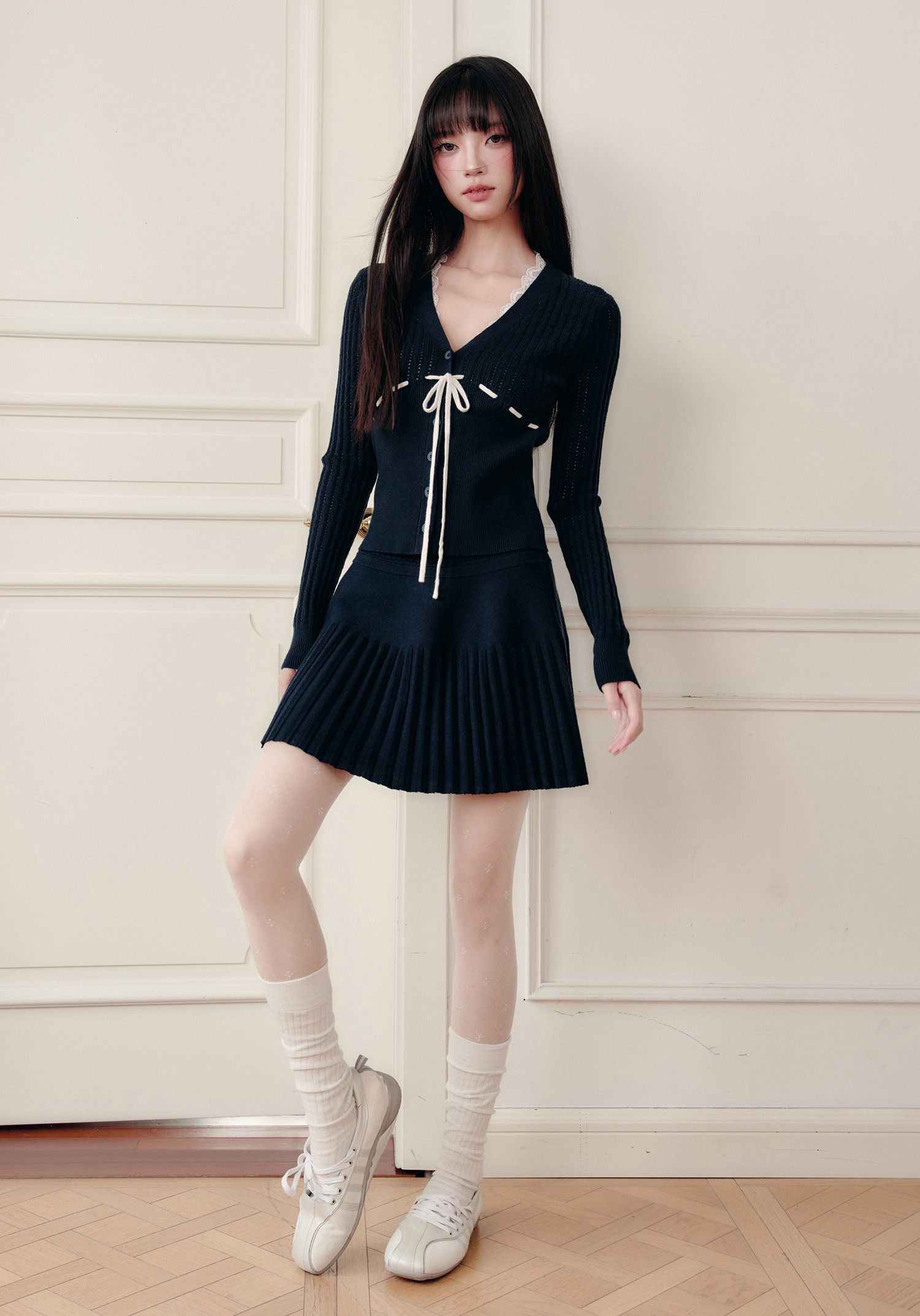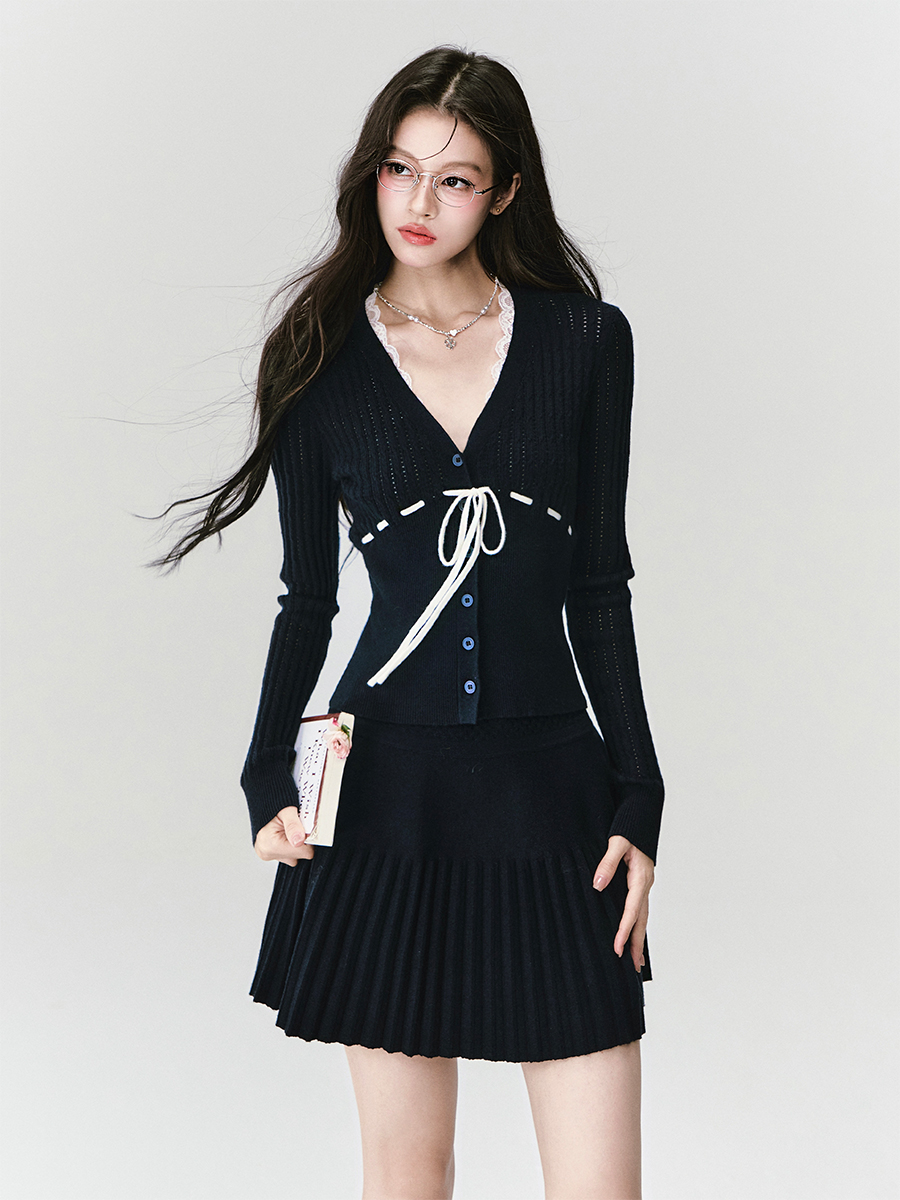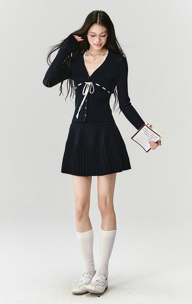 네이비 컬러의 클래식 무드와 리본 디테일이 어우러져, 단정하면서도 사랑스러운 무드를 완성하는 니트 셋업입니다.