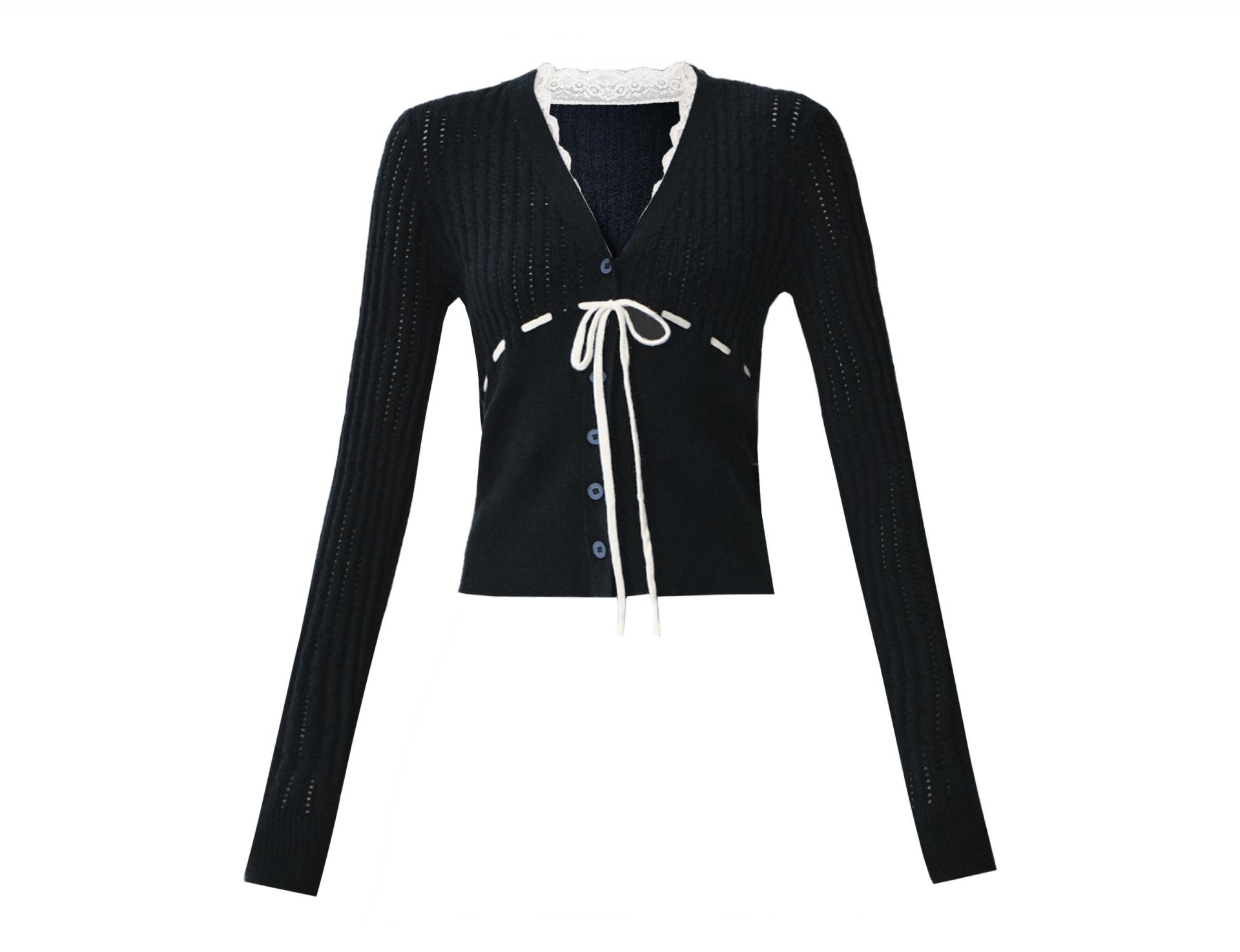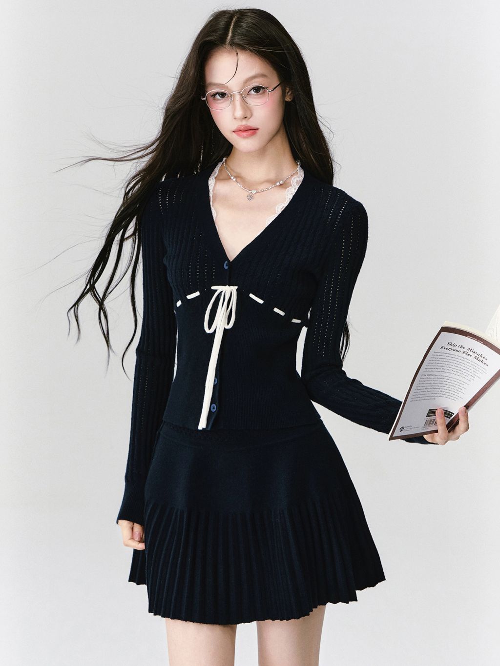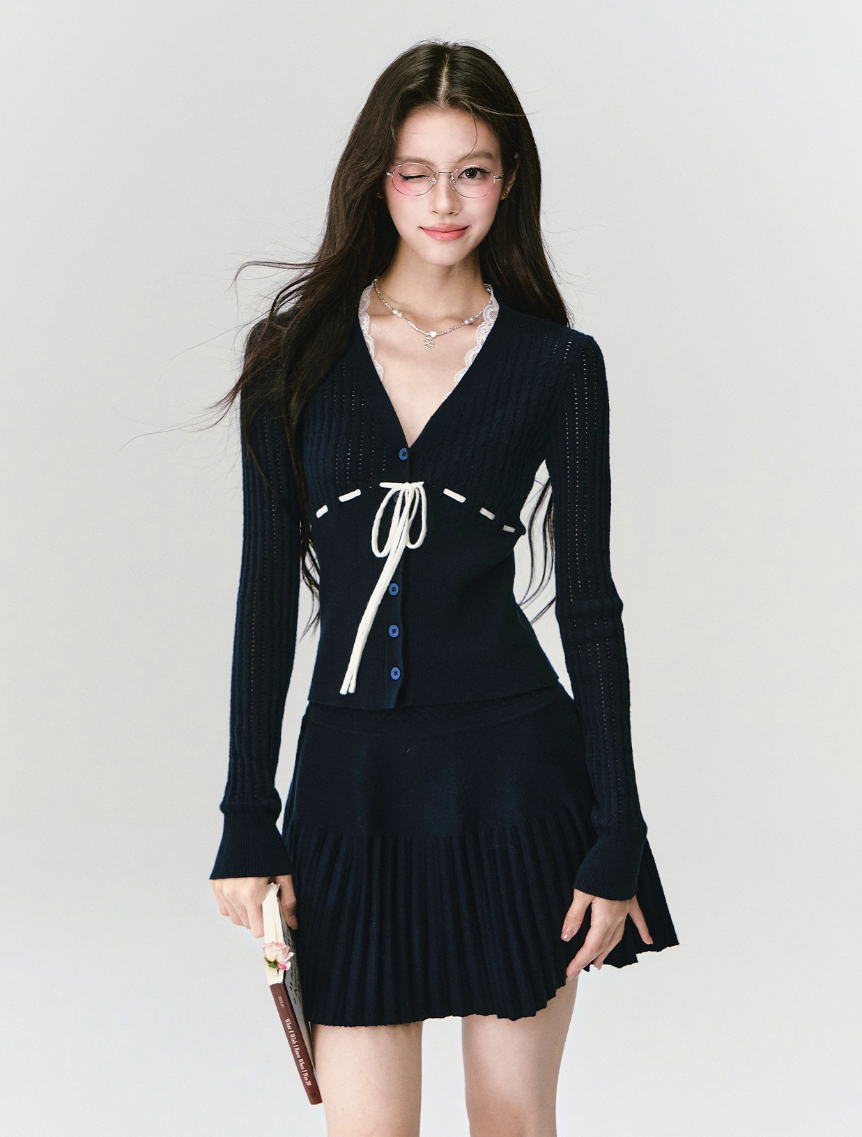 네이비 컬러의 클래식 무드와 리본 디테일이 어우러져, 단정하면서도 사랑스러운 무드를 완성하는 니트 셋업입니다.