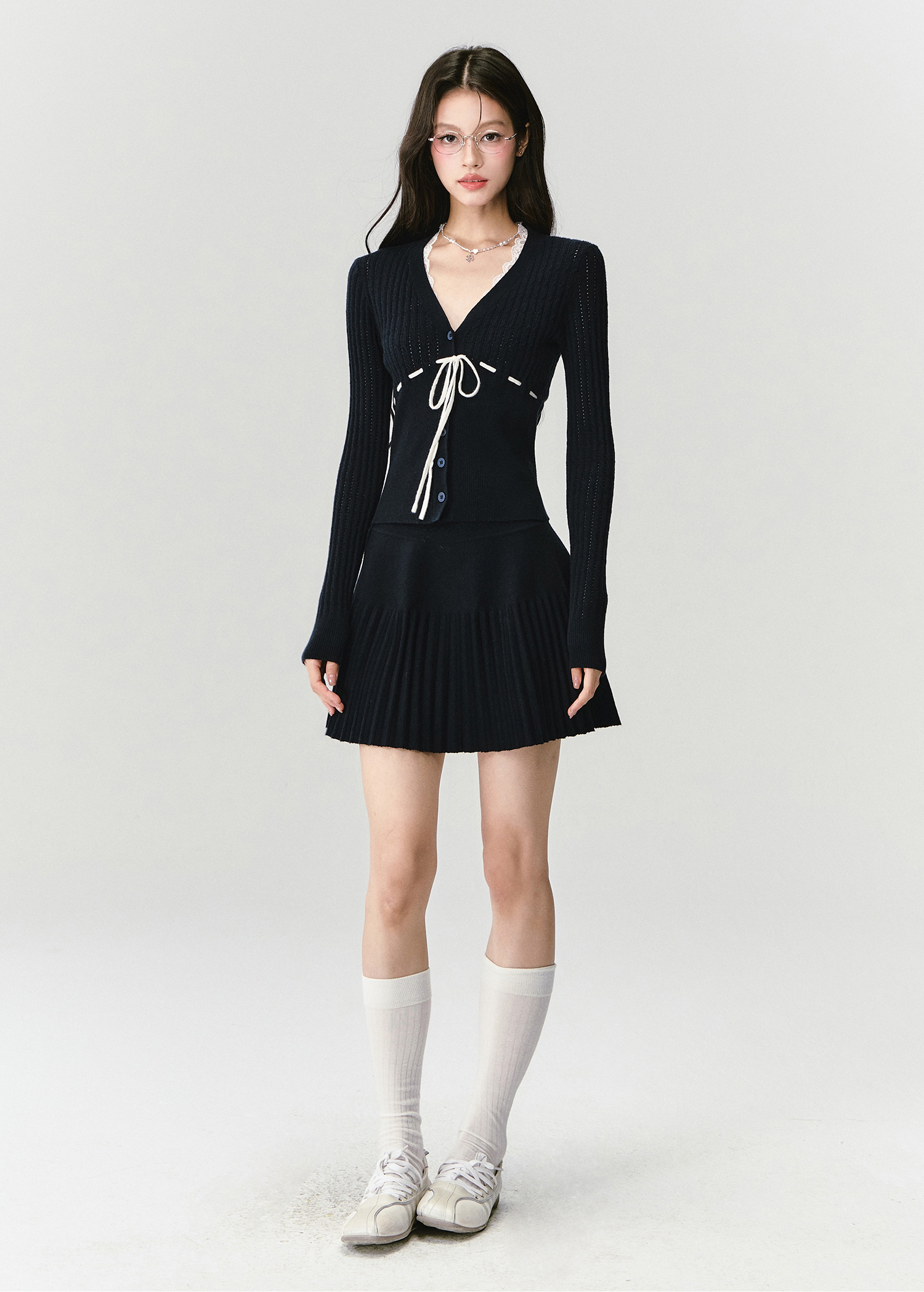 - 풍성한 플리츠 니트 스커트로 클래식한 실루엣 완성