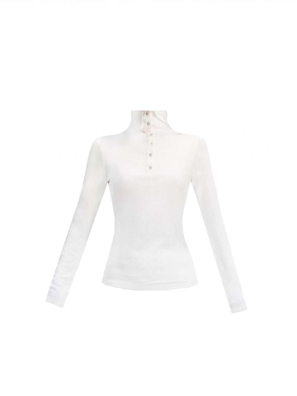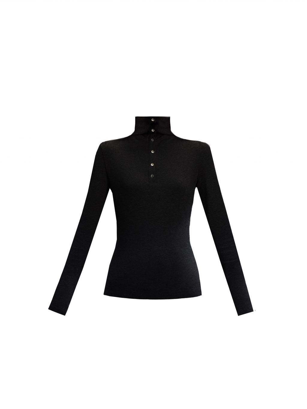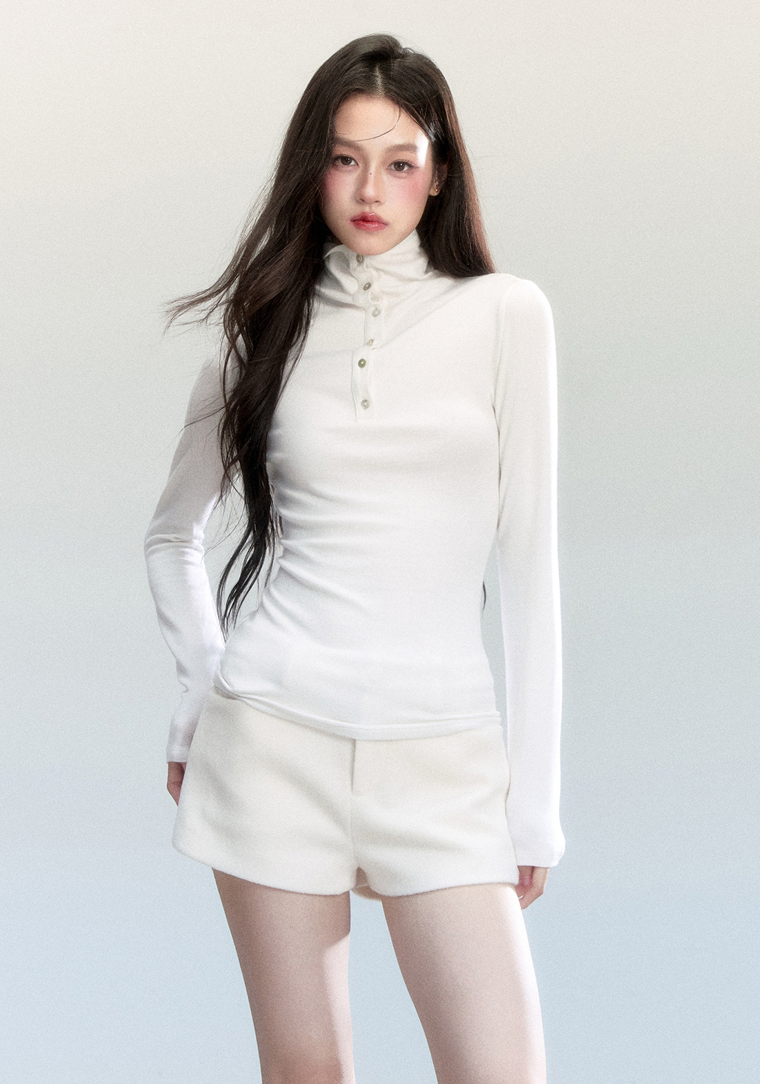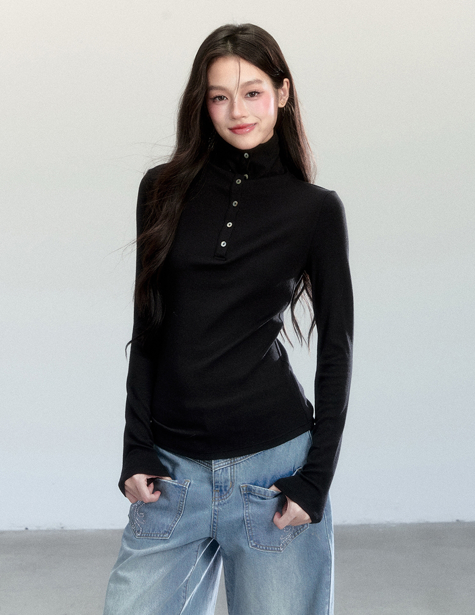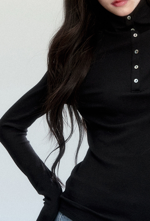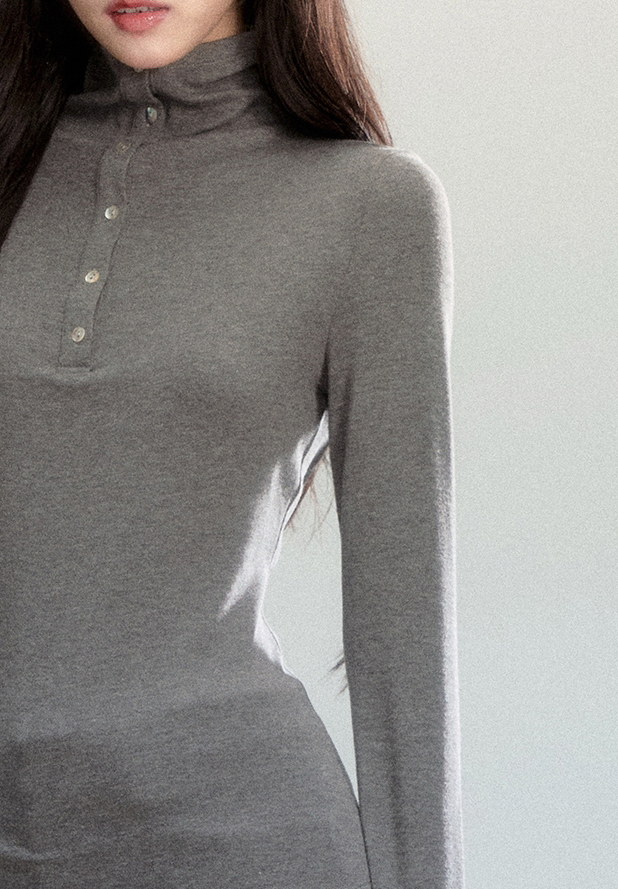 부드럽게 밀착되는 실루엣과 버튼 하이넥 디테일이 조화를 이루어, 간결하고 세련된 라인을 완성하는 터틀넥 탑입니다.