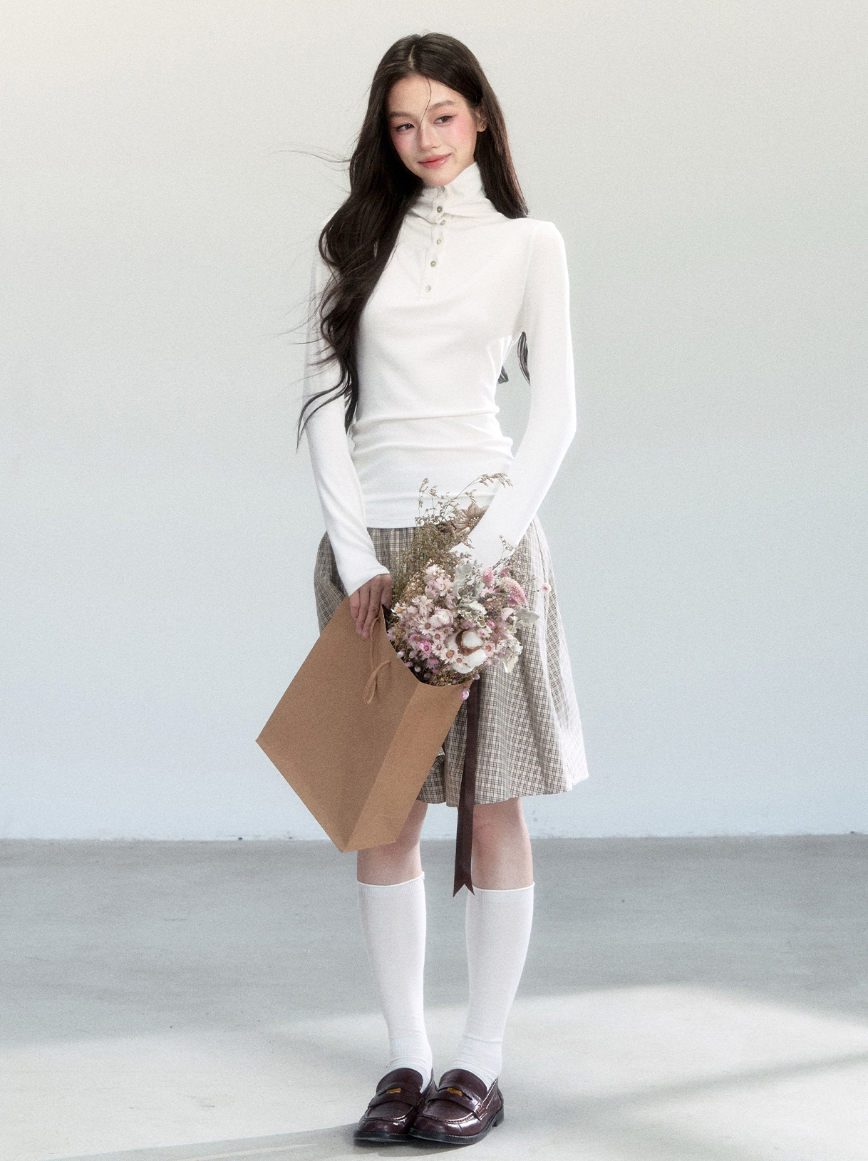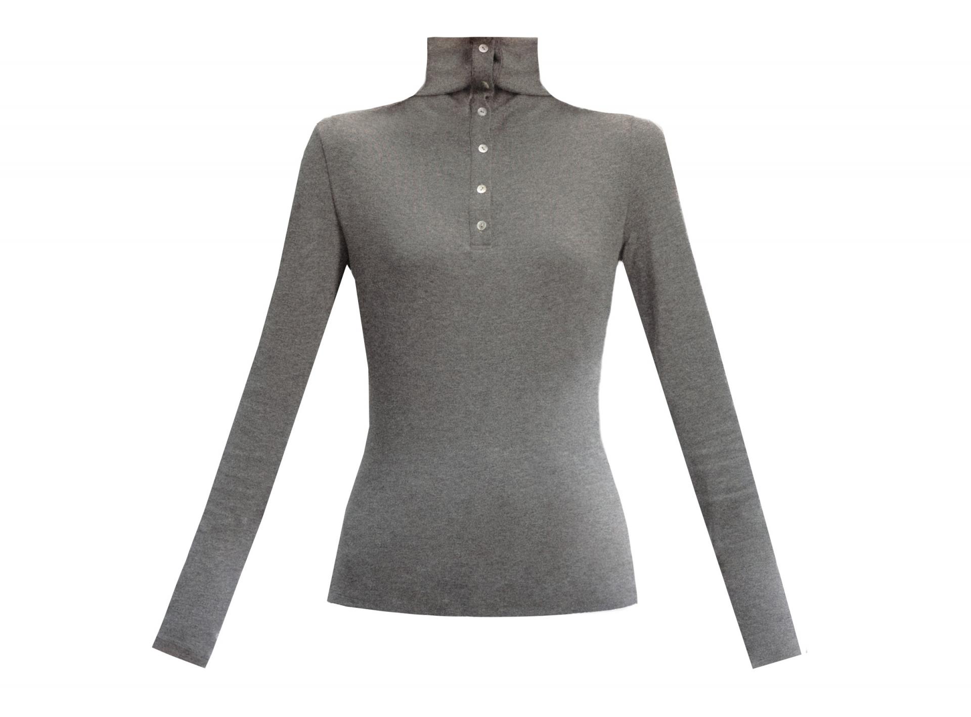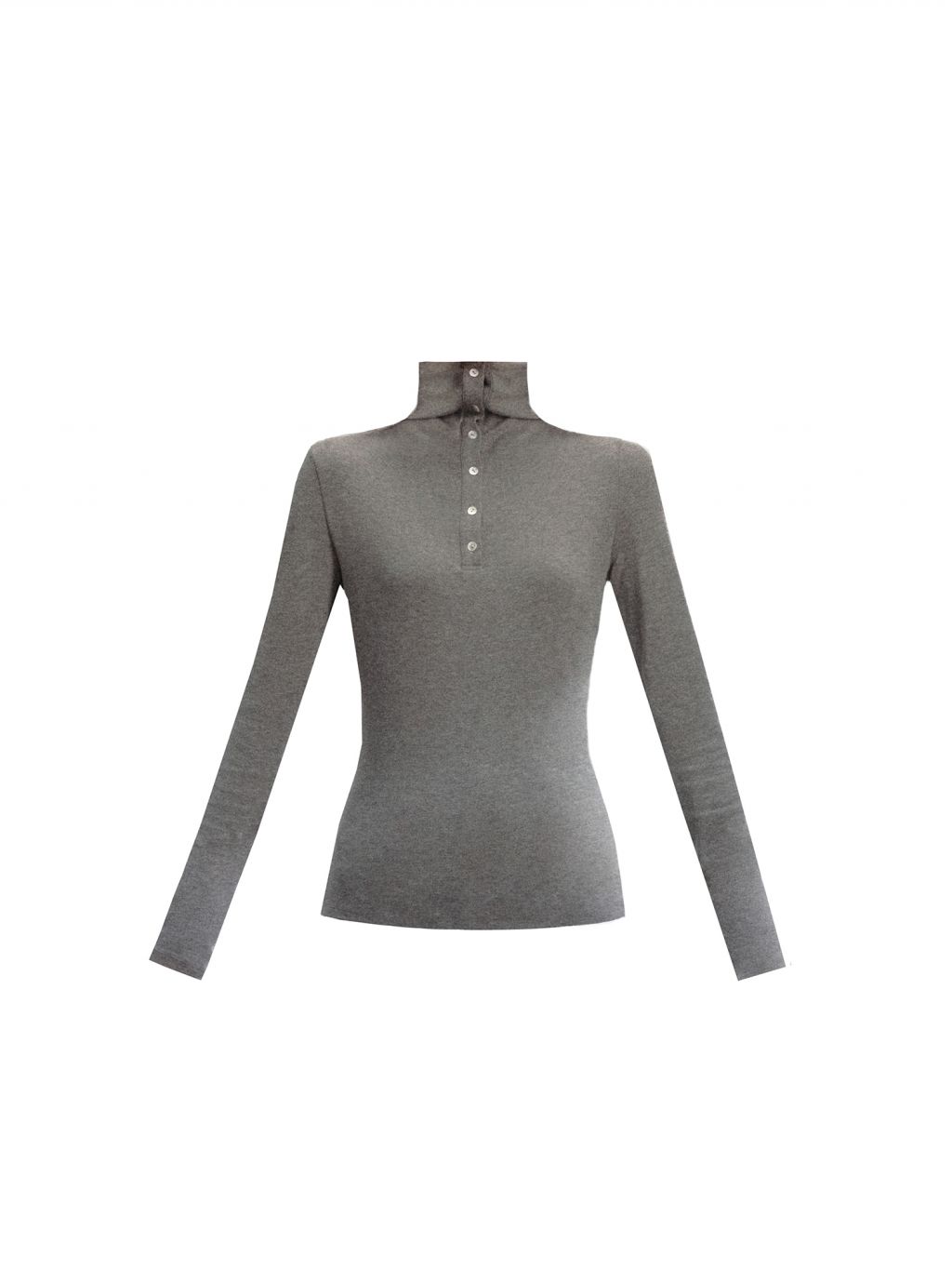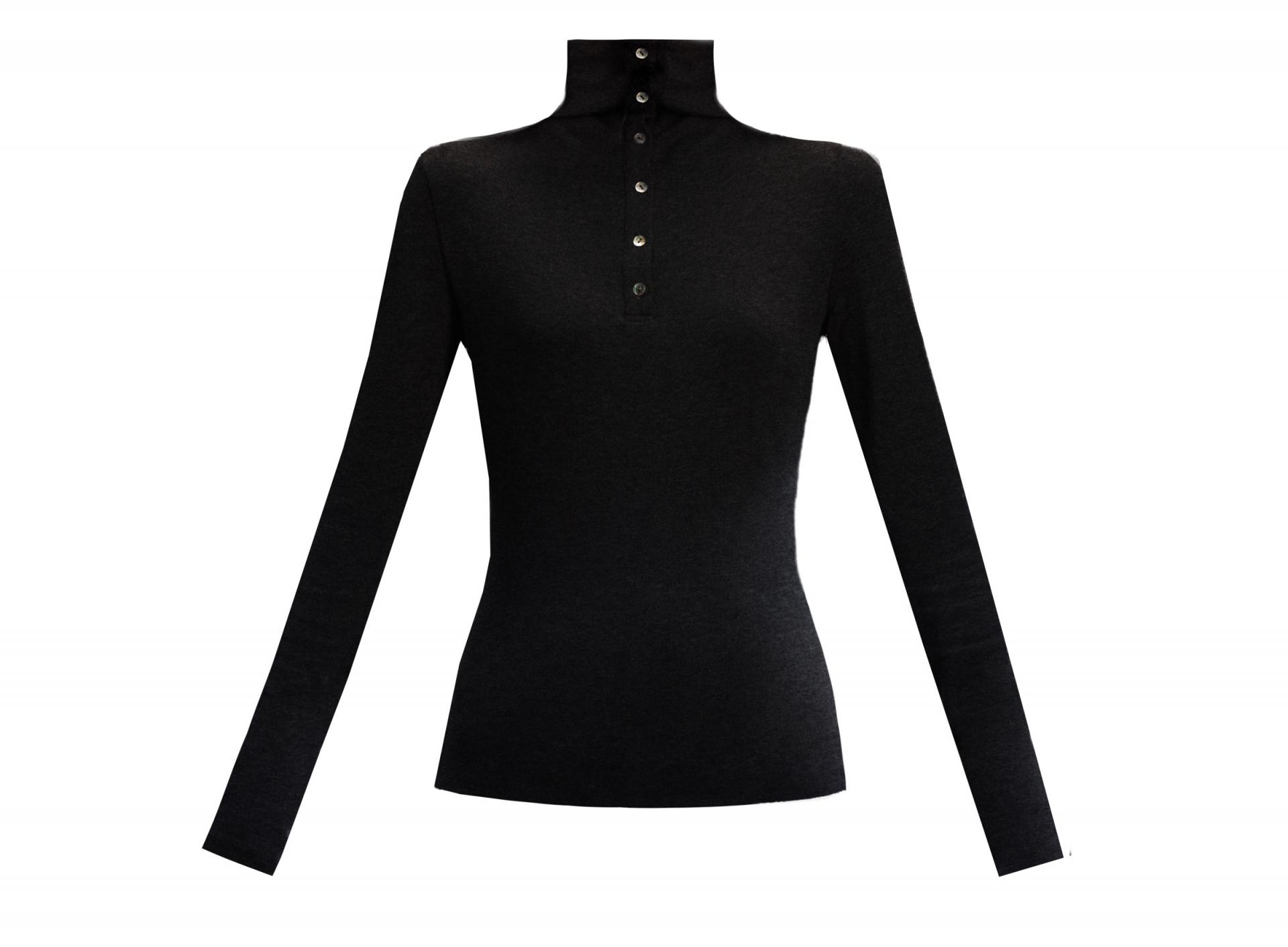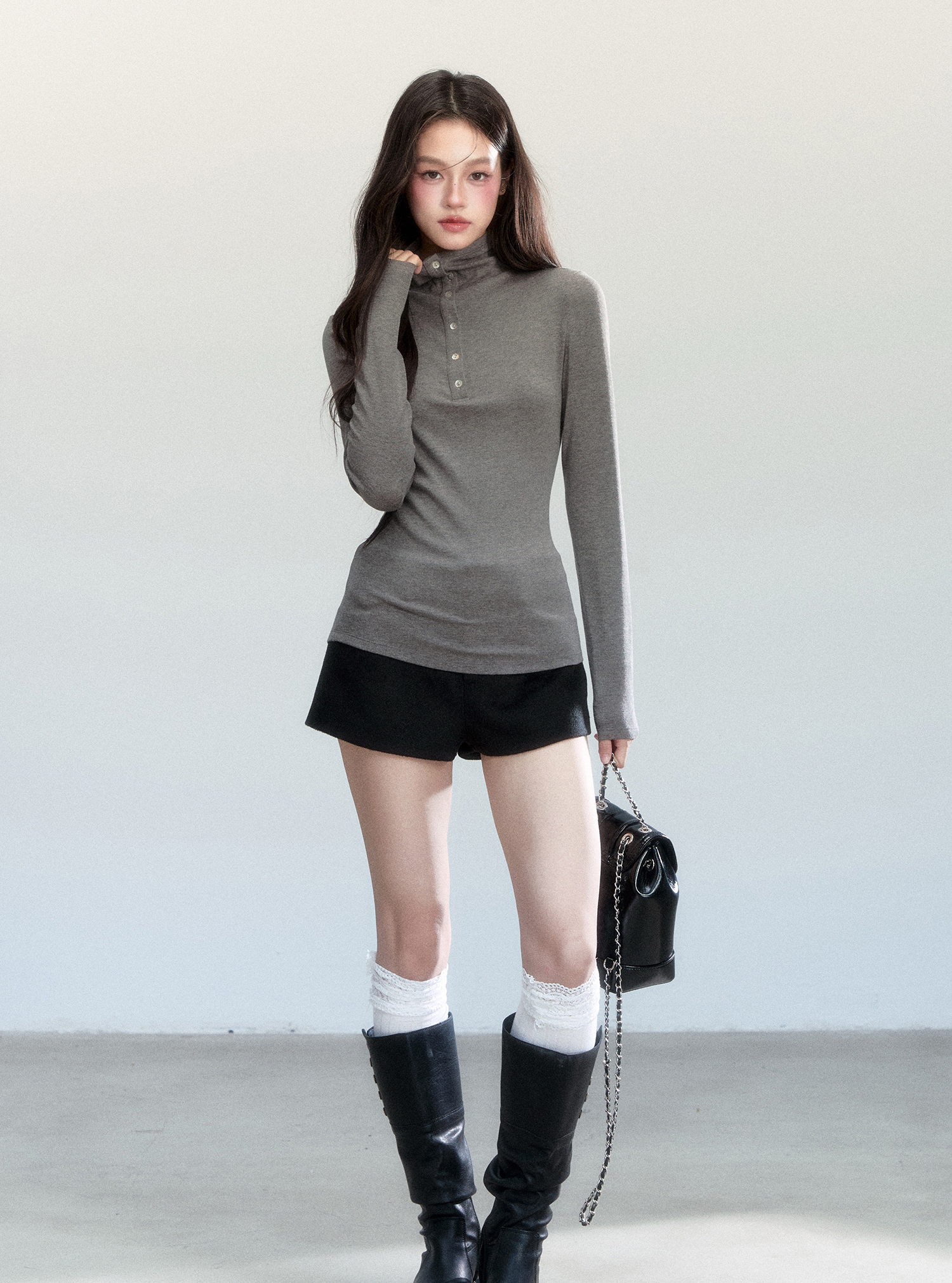 부드럽게 밀착되는 실루엣과 버튼 하이넥 디테일이 조화를 이루어, 간결하고 세련된 라인을 완성하는 터틀넥 탑입니다.