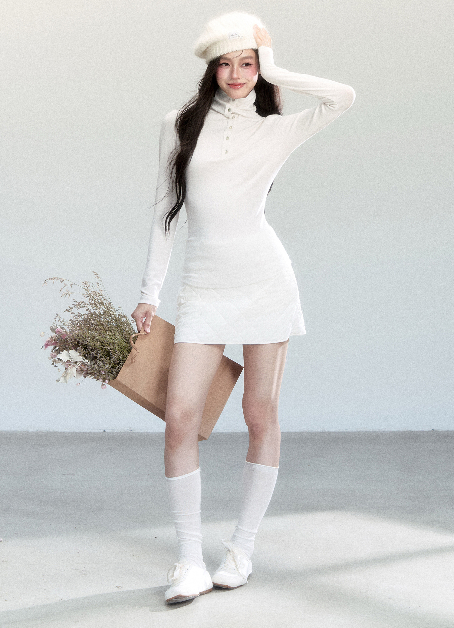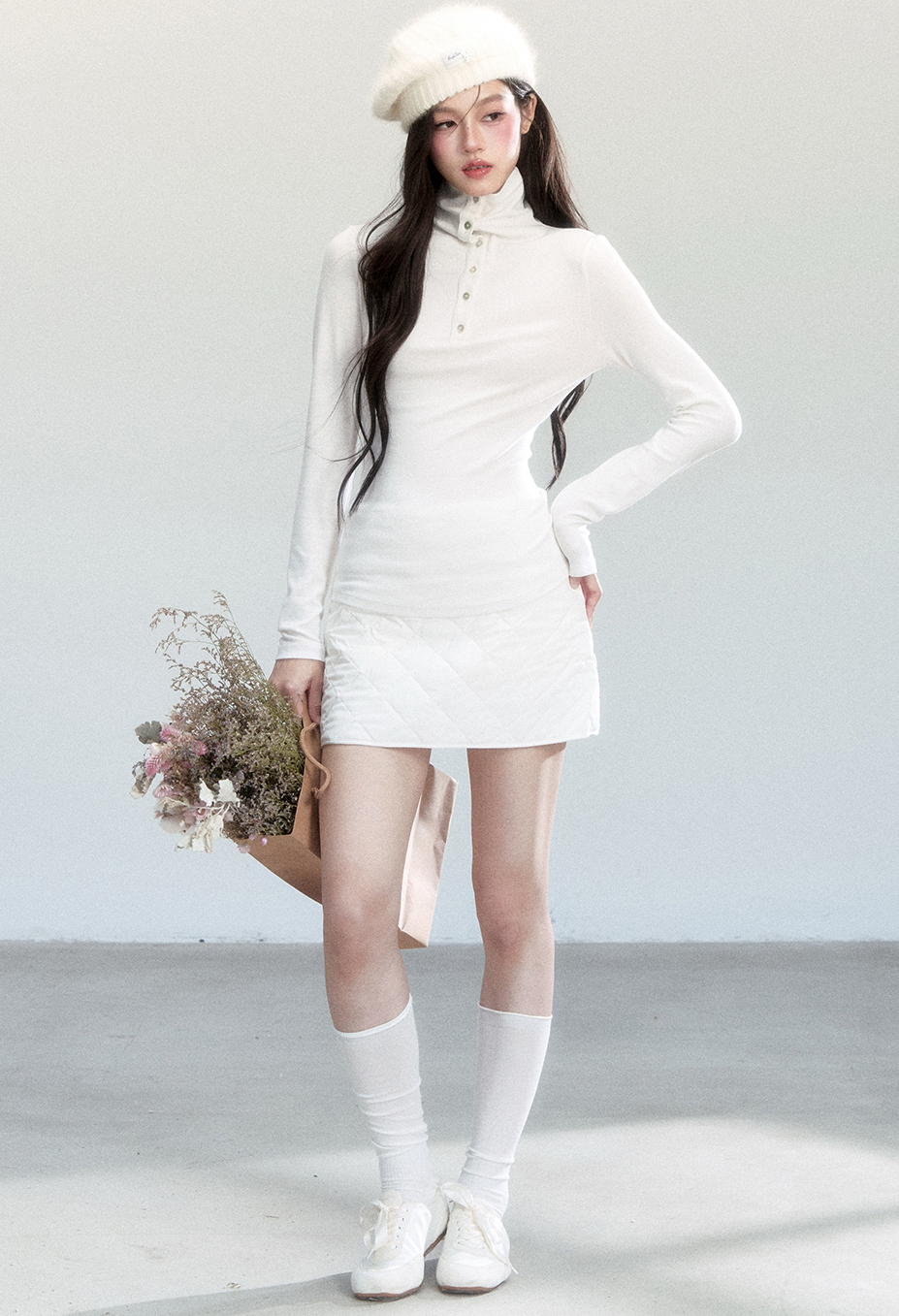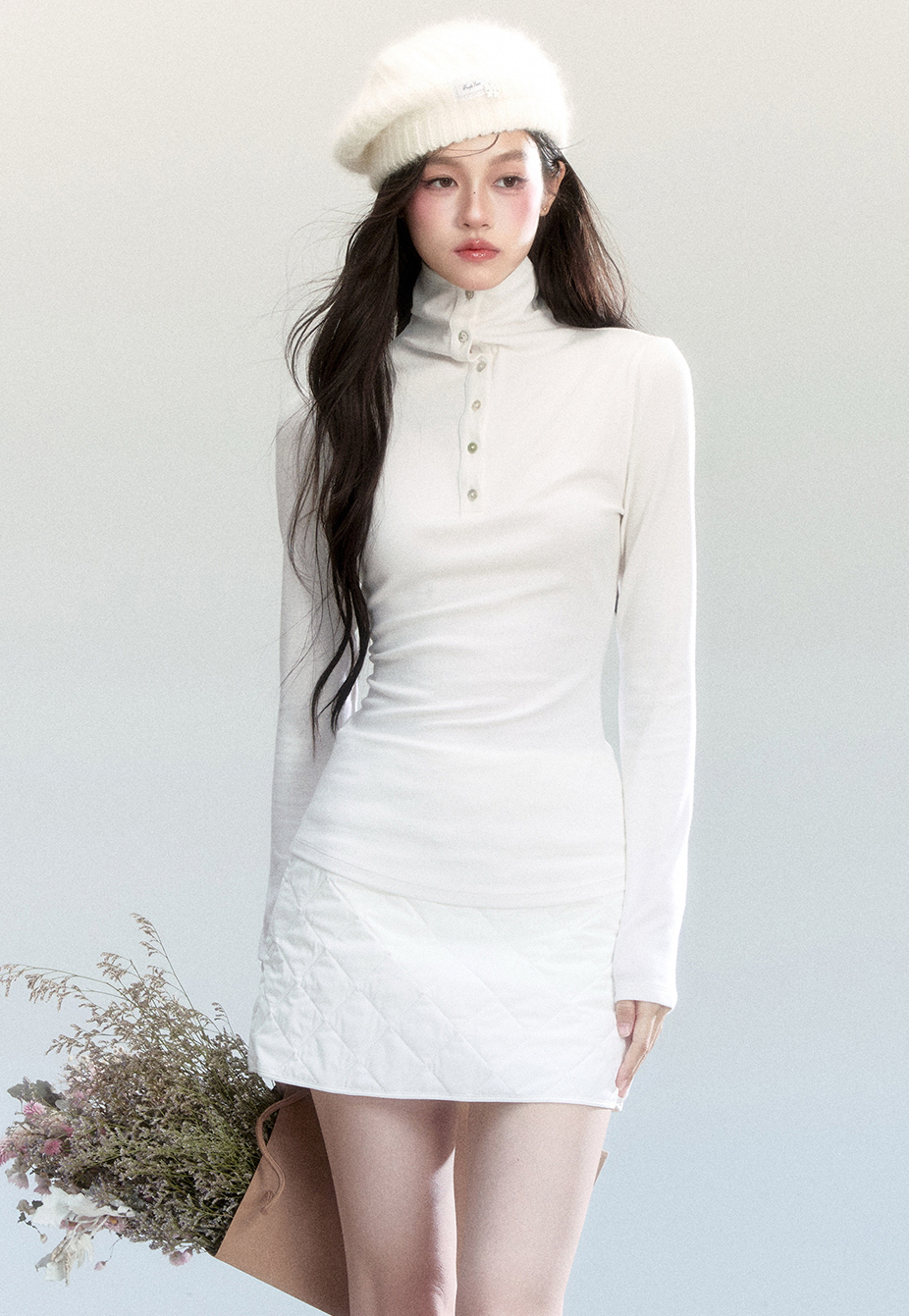 - 자연스러운 주름이 생기는 하이넥 실루엣으로 세련된 무드