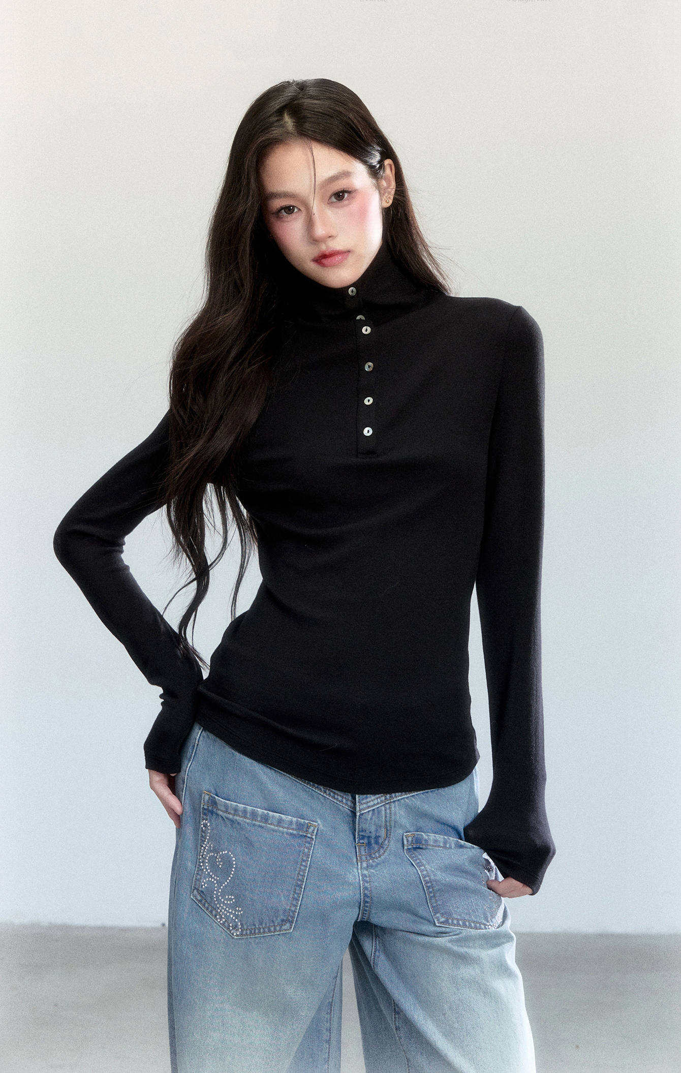 - 버튼 클로징이 더해진 헨리넥 디자인으로 포인트 연출